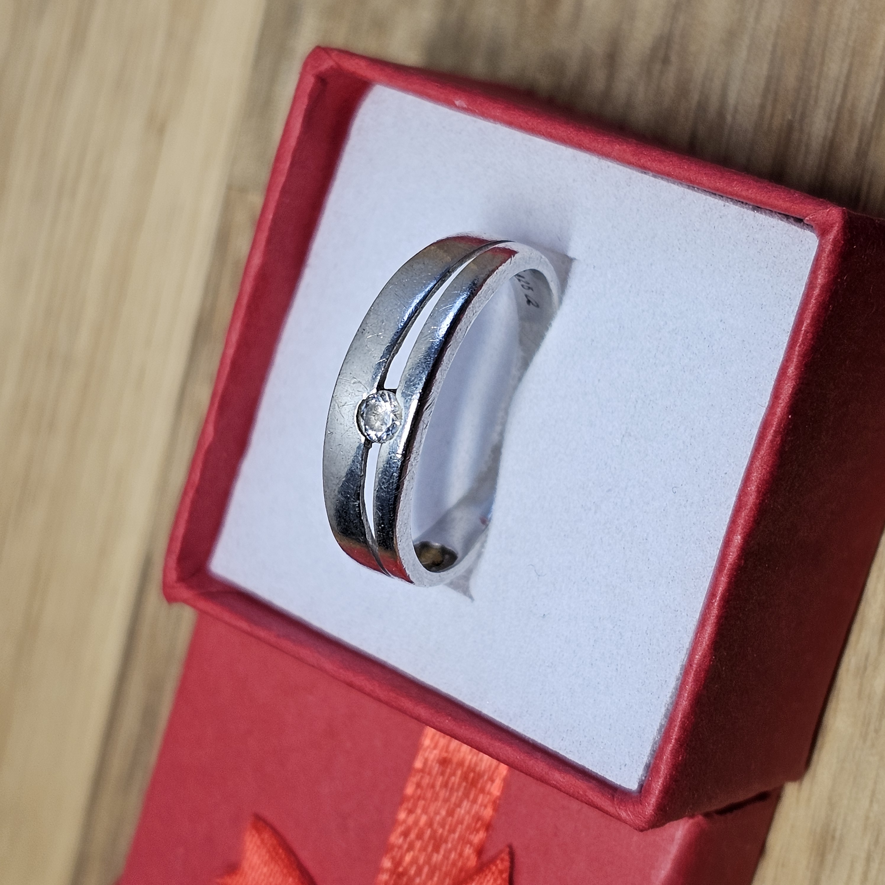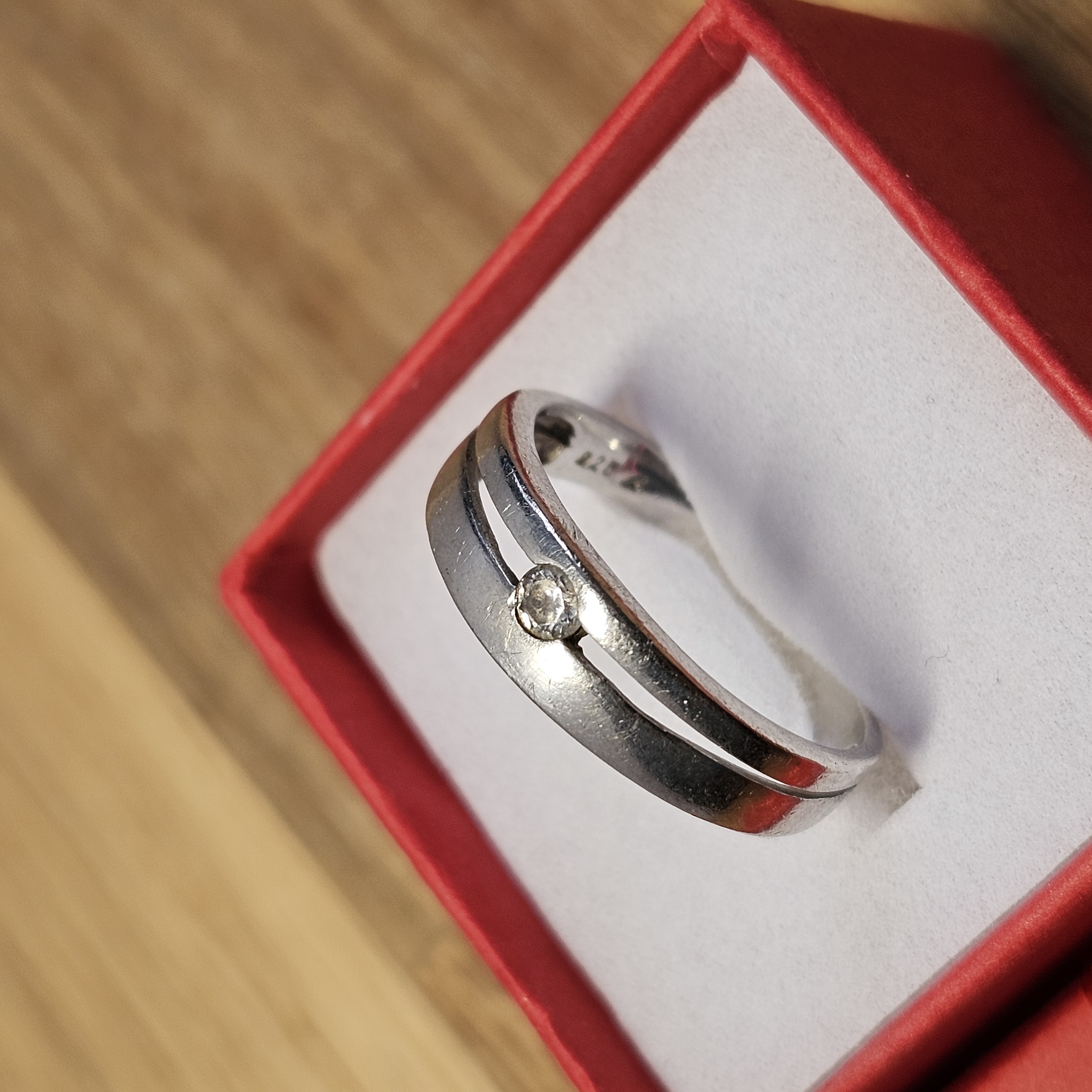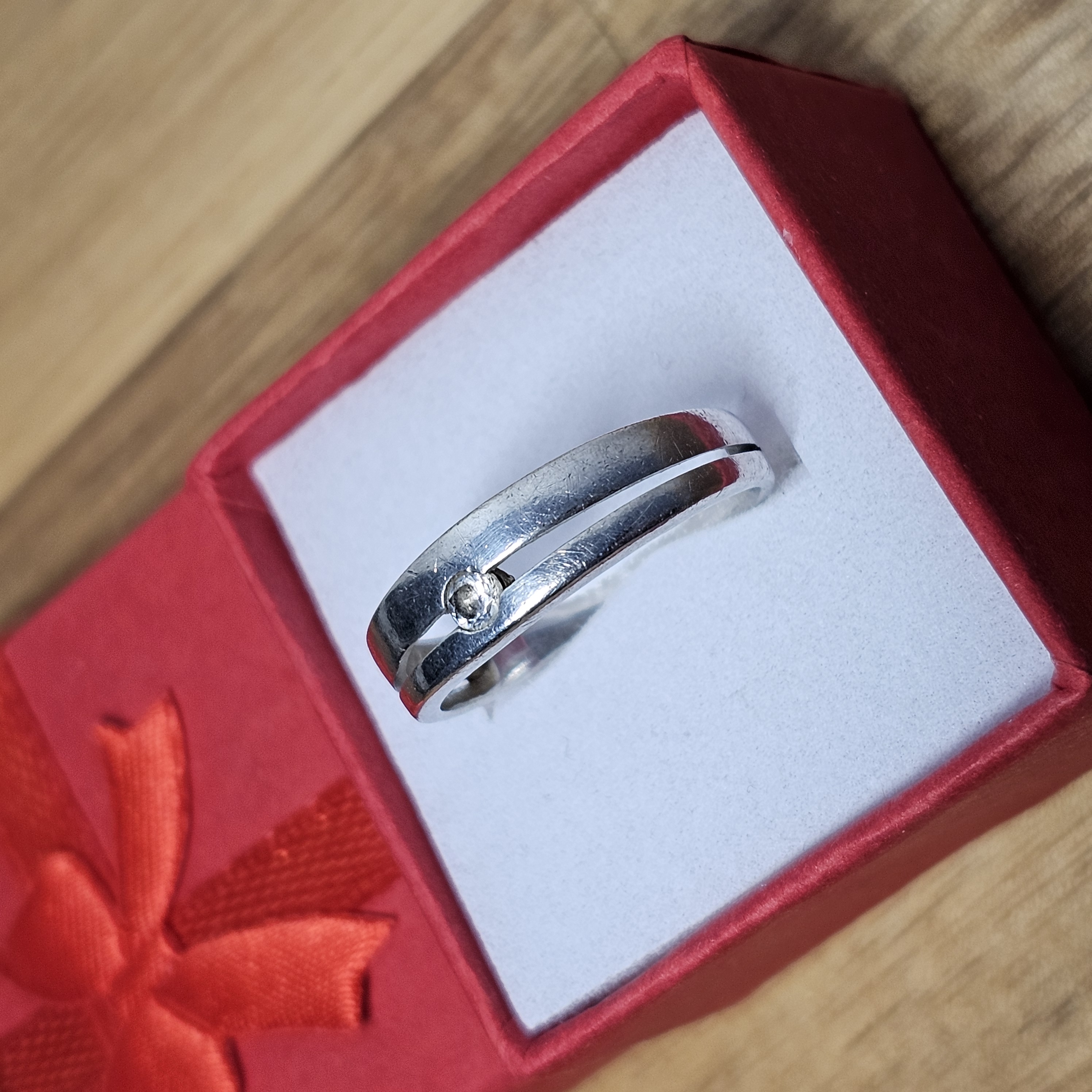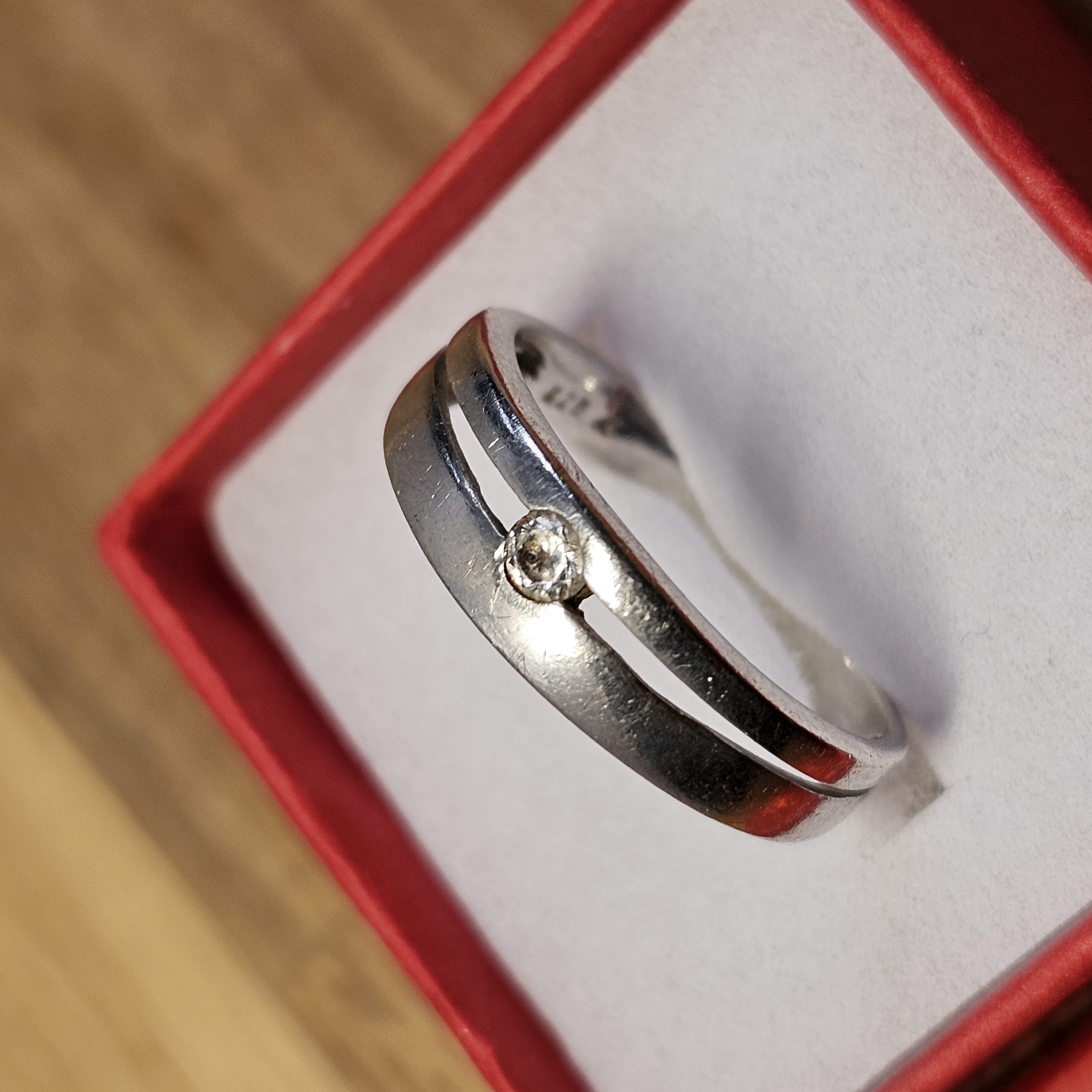 Hübscher Silberring 925 mit einem durchbrochen gestalteten Ringkopfdesign. Ein klares Kristallsteinchen schmückt das schöne Schmuckstück.