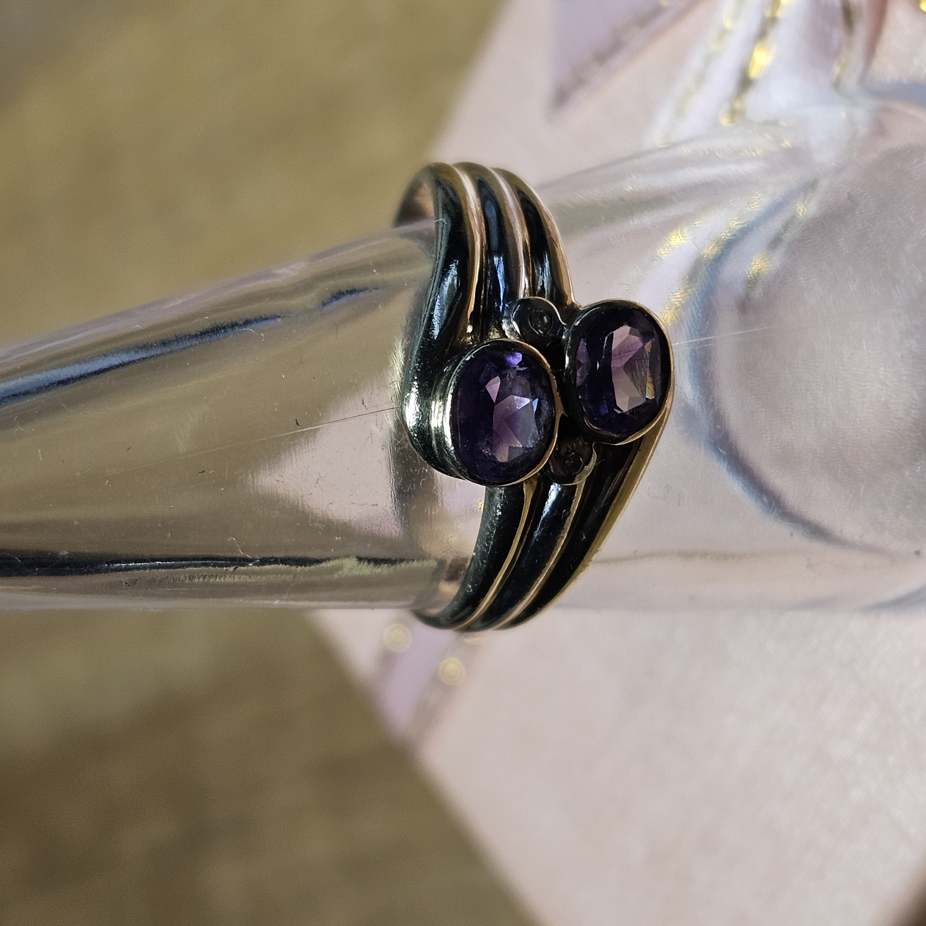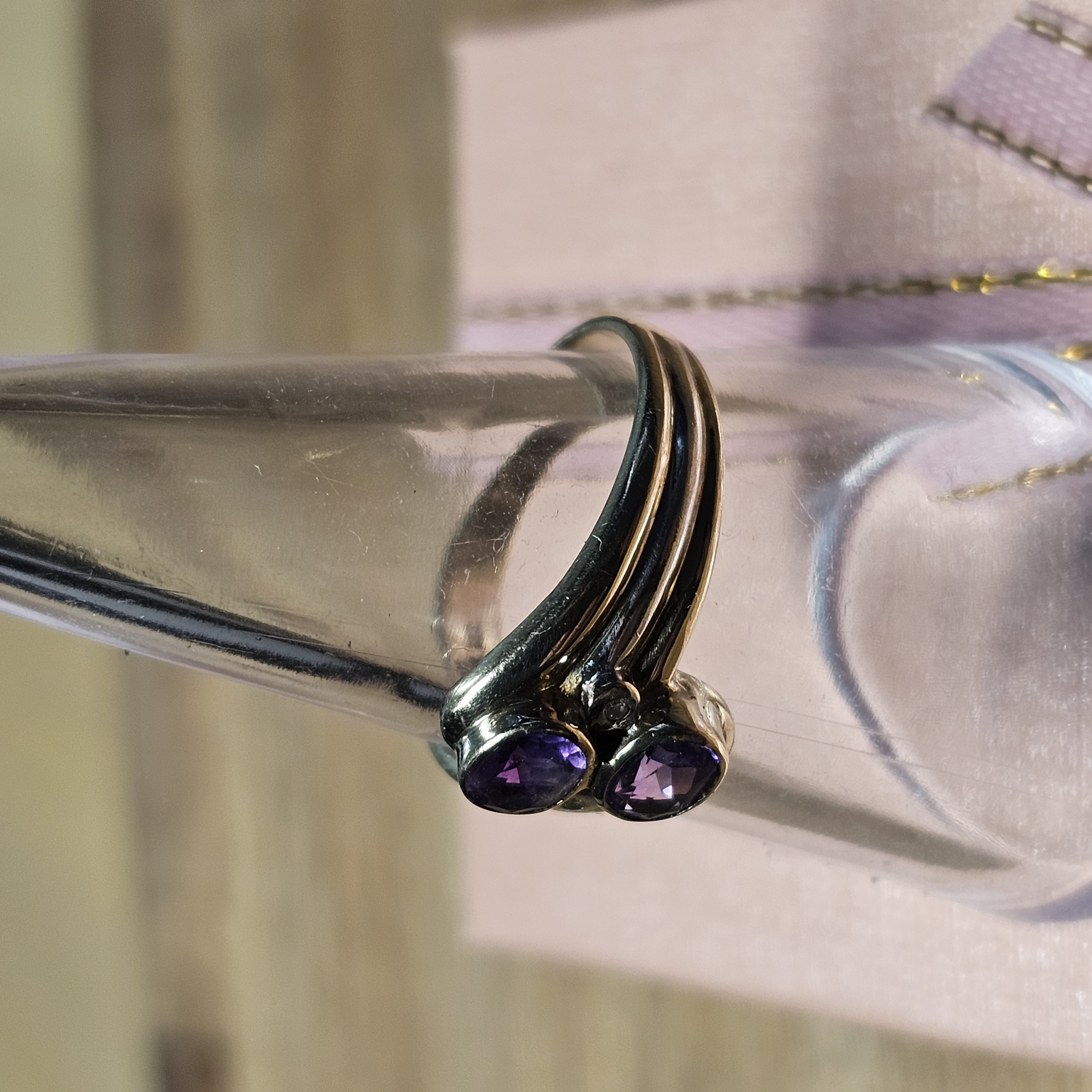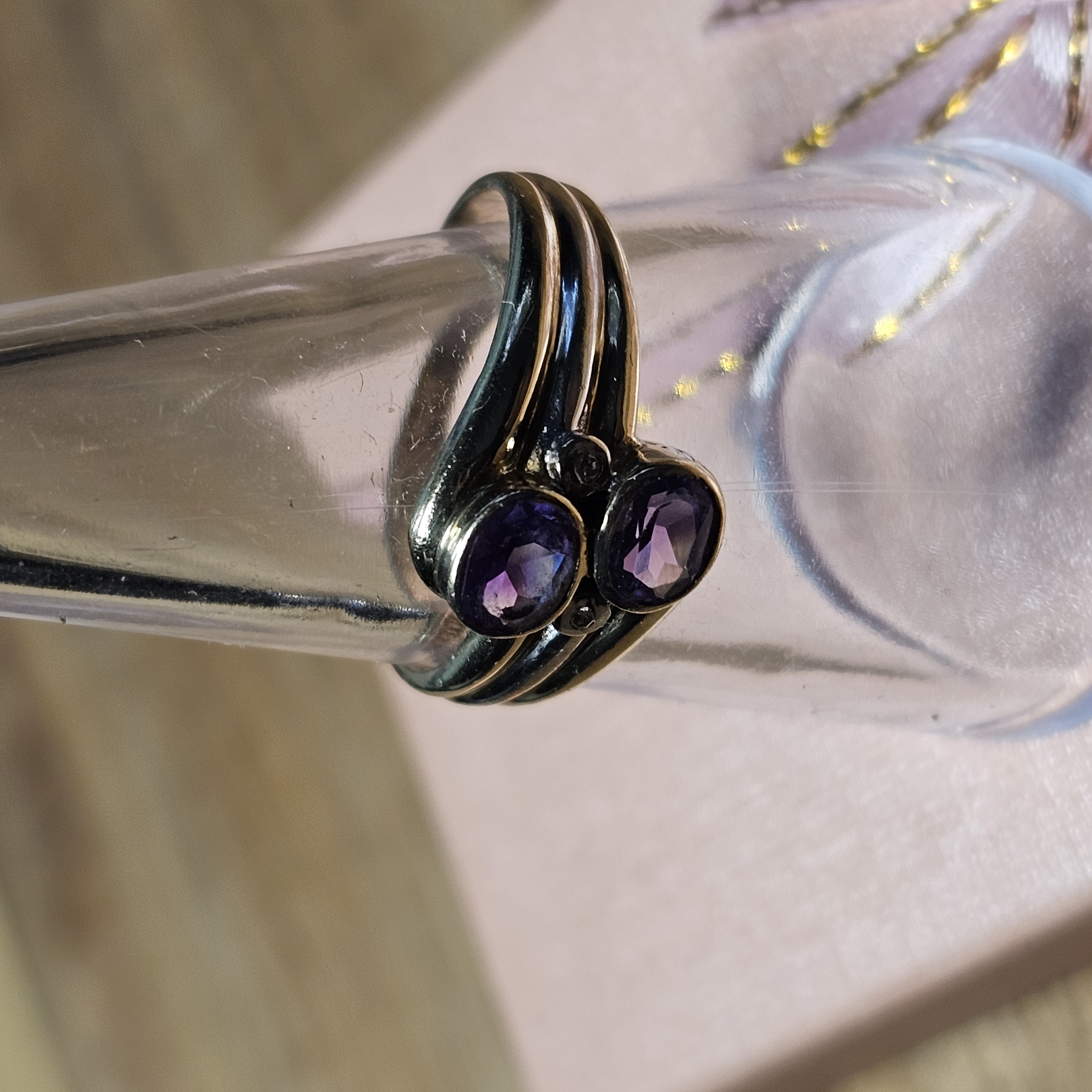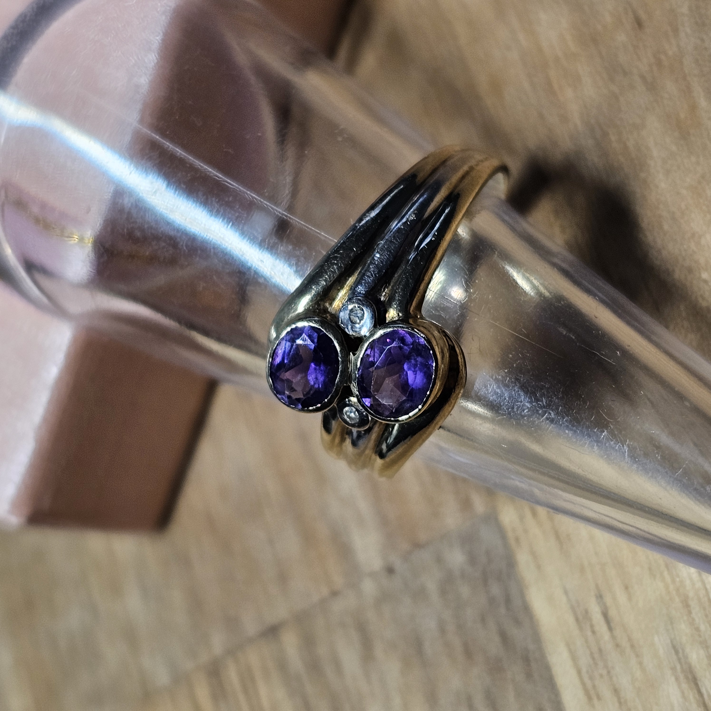 Nostalgischer Ring Gold 333. Edle Verarbeitung, mit 2 Stück schönen Amethyst-Steinen und 2 Stück kleinsten Diamantsteinchen in die Ringkopfgestaltung integriert. Ein sehr schönes Vintage-Stück.
