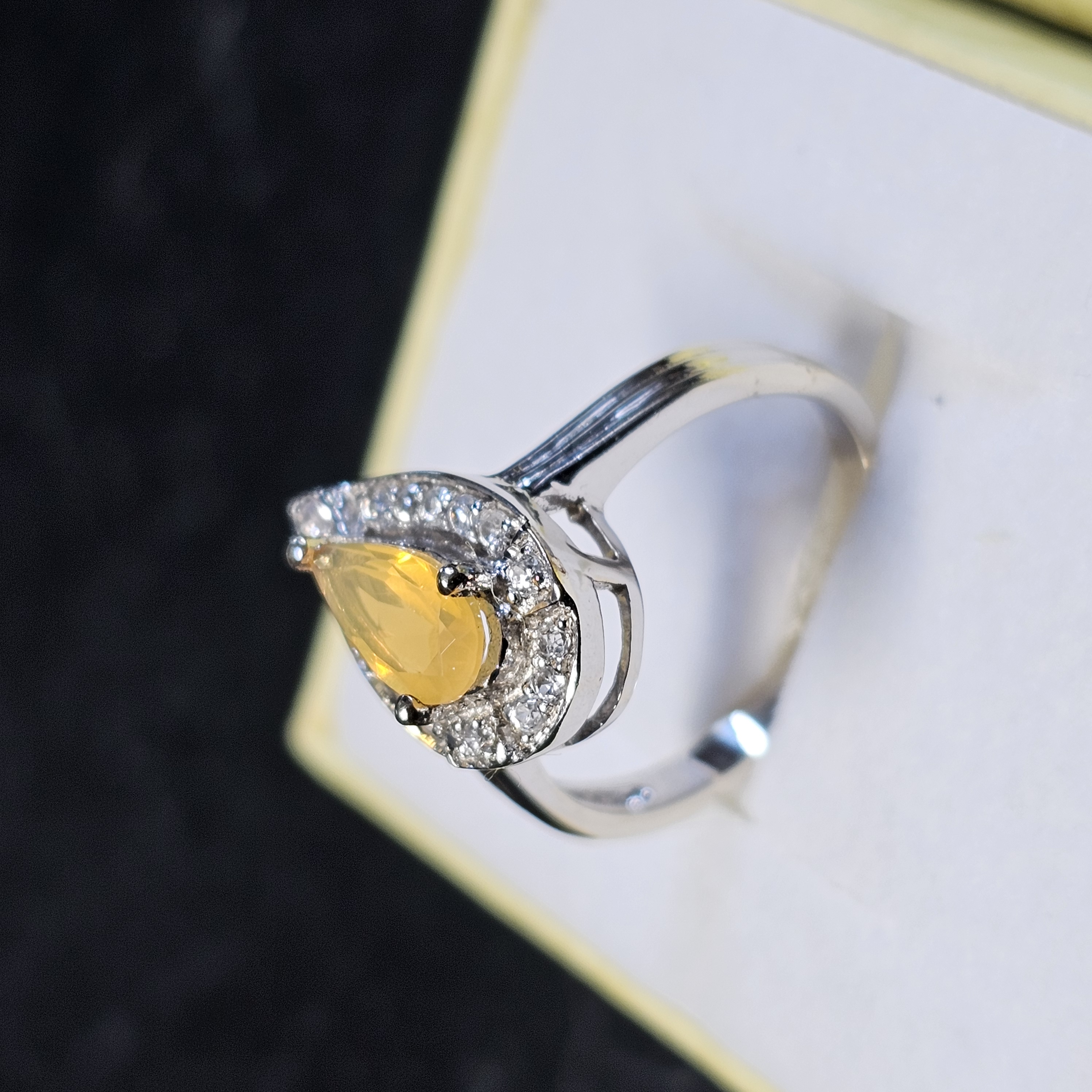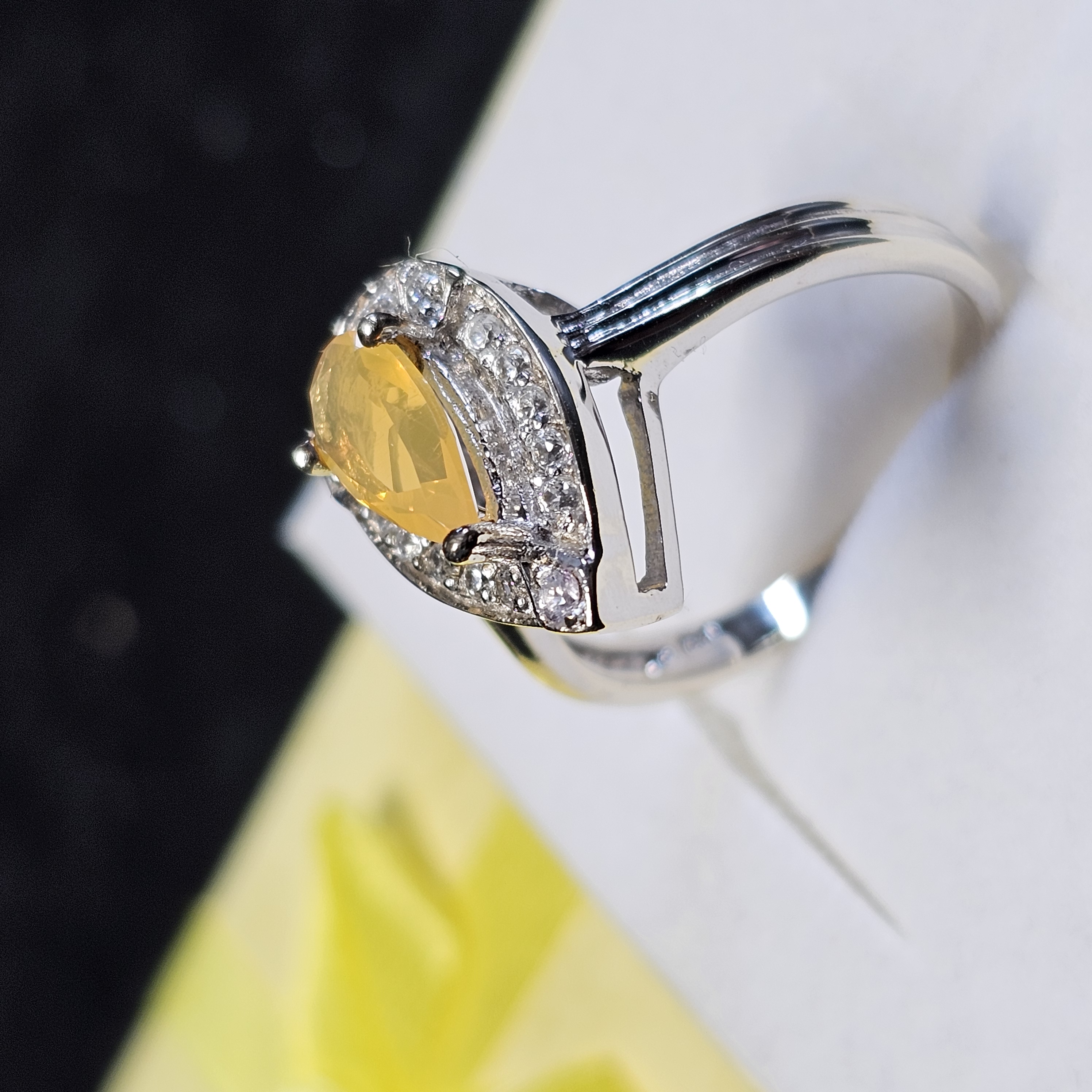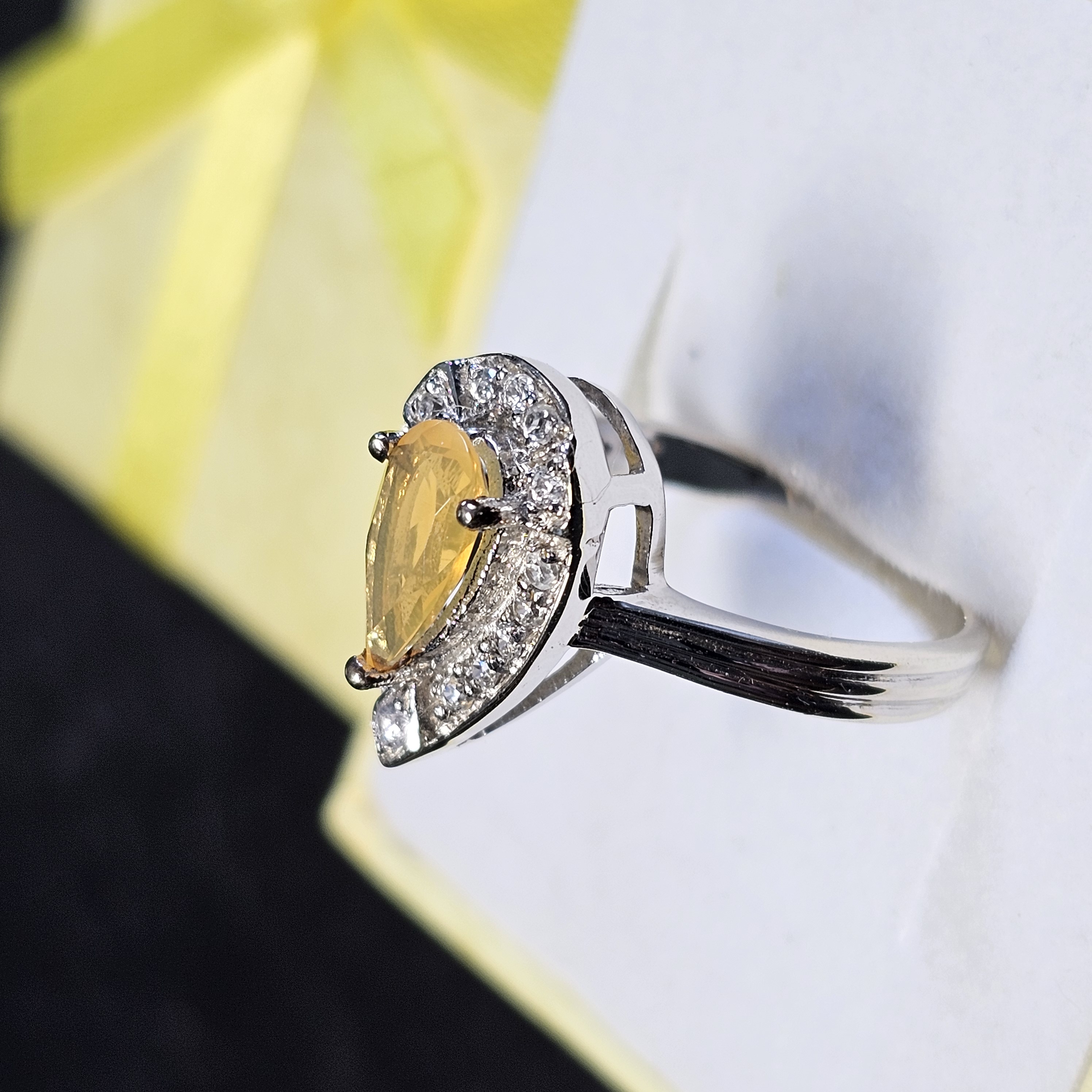Toller Weißgoldring mit einem tropfenförmigen Ringkopfdesign. Mittig sitzt ein Citrin im Farbton Orange, umrandet von klaren runden Kristallsteinchen.