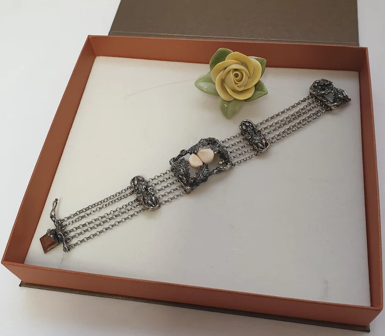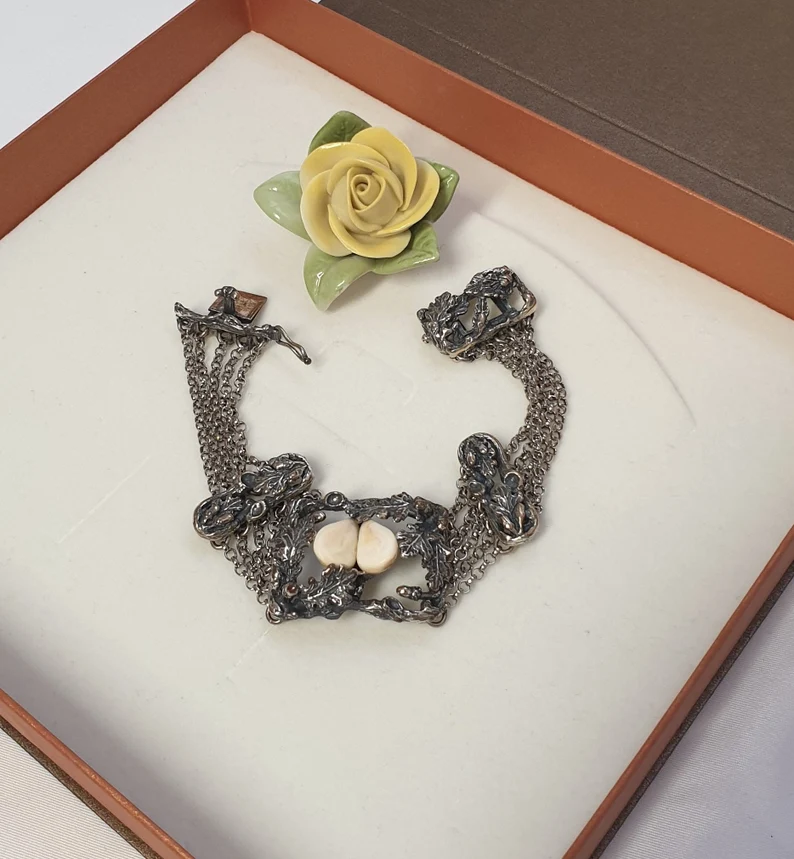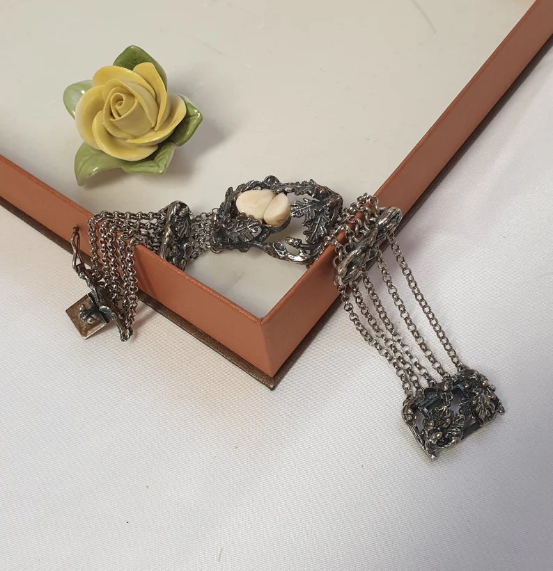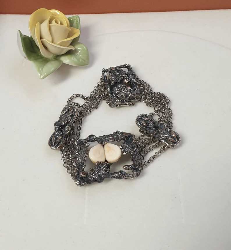 Aufwendig gearbeitetes Silber 925 Trachtenarmband . Das Mittelstück des Armbandes ist mit einem Grandel-Pärchen in Eichenlaub besetzt. Es verfügt über eine ebenso schön gearbeitet Steckschließe mit Sicherheitsverschluss. Die Eichenlaubglieder sind mit 5er Reihen Erbskettchen verbunden. Ein wunderbares Schmuckstück, eine tolle Rarität. Tolle Silberschmiedekunst!