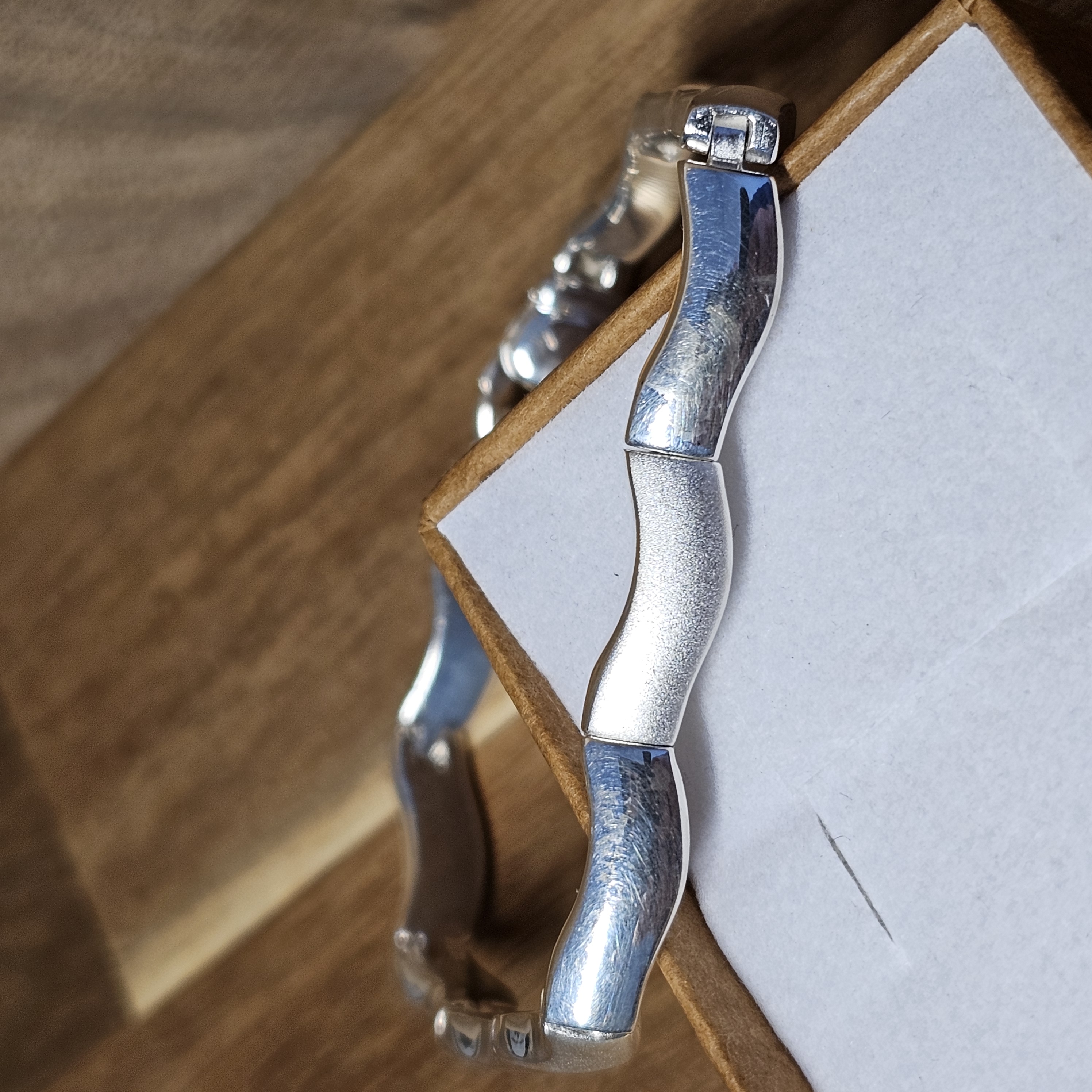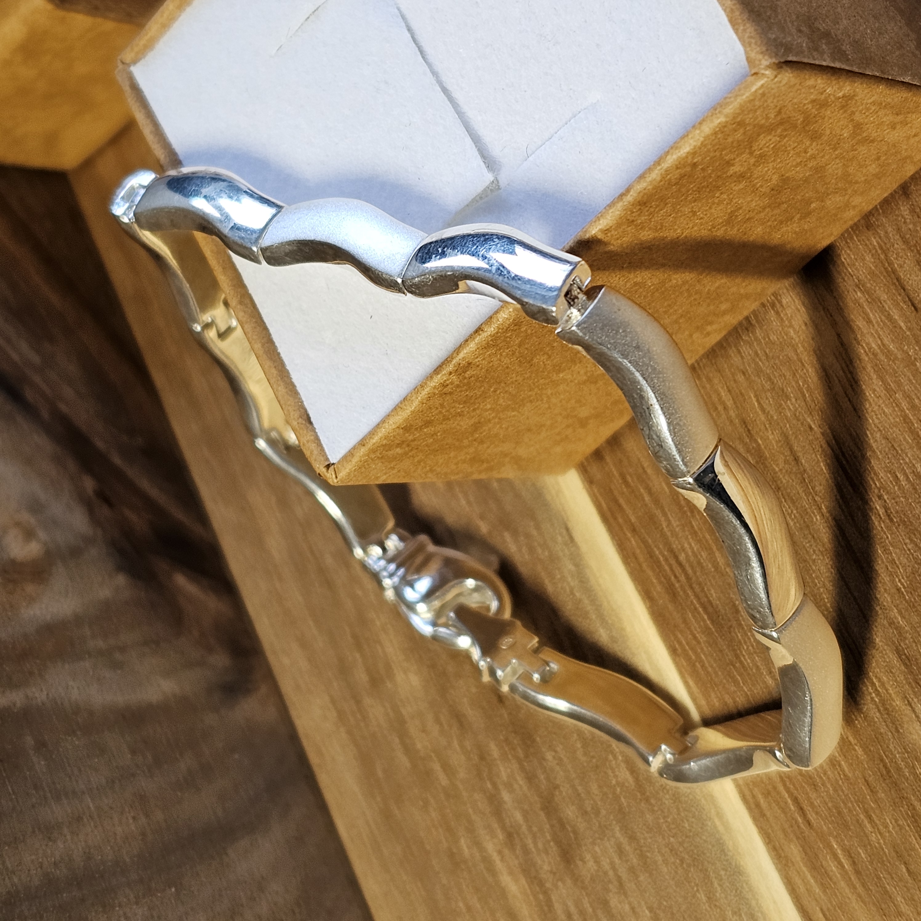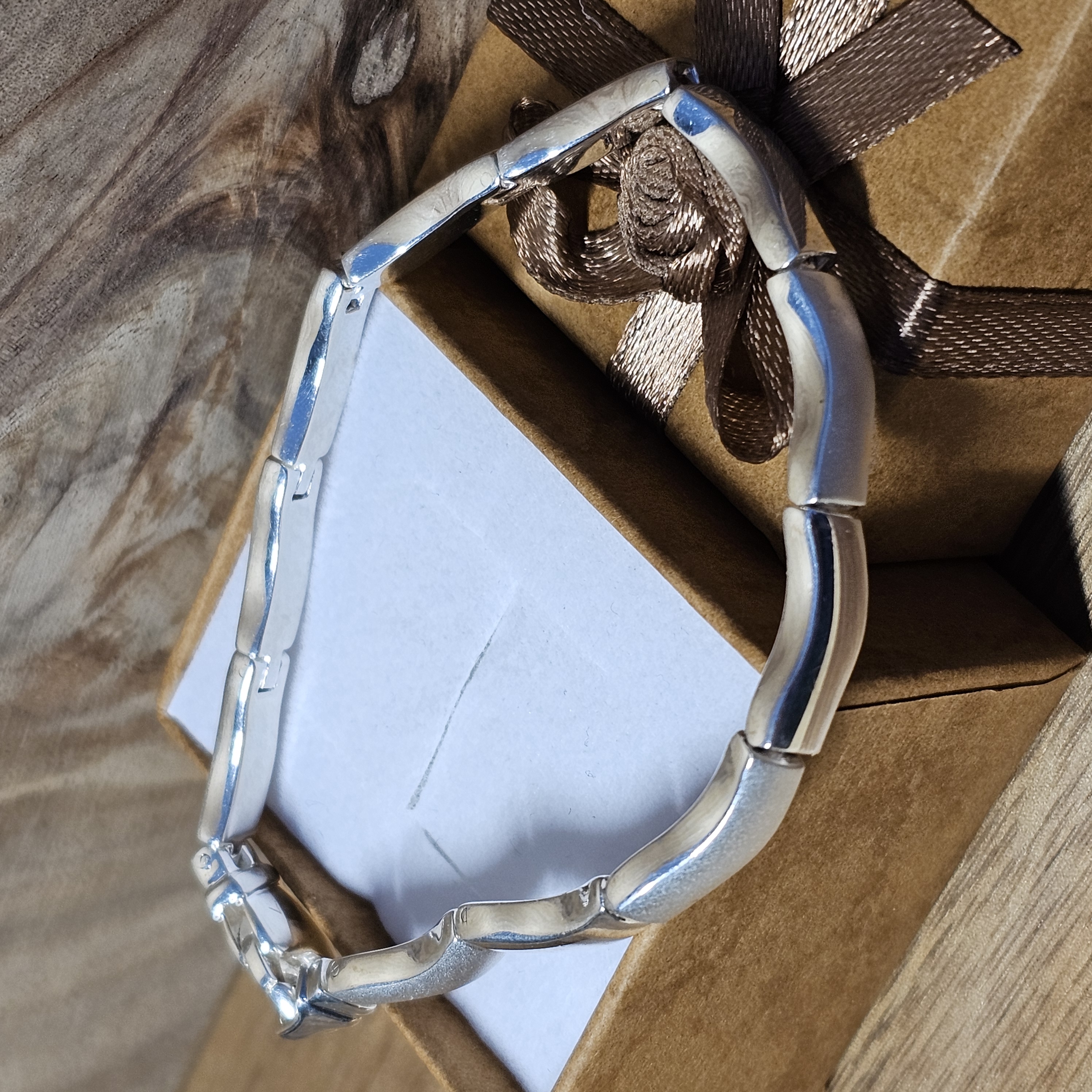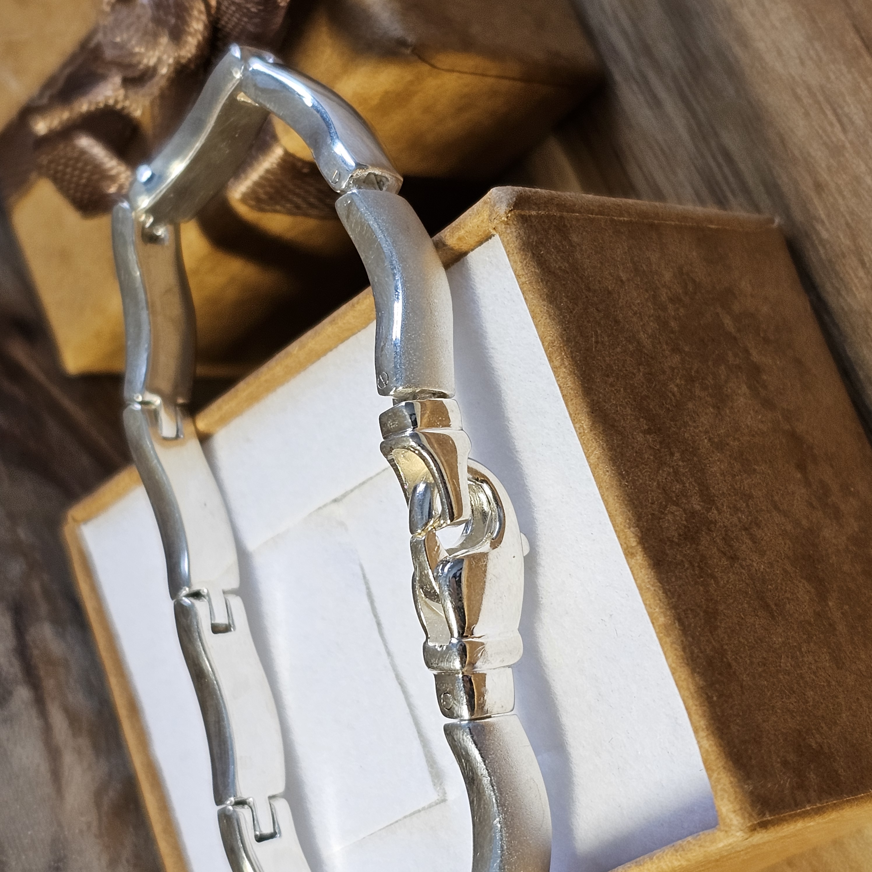 Sehr schönes Gliederarmband aus Silber 925 gefertigt. Die leicht geschwungenen Glieder/Elemente sind im Design teils matt und teils glänzend gestaltet.