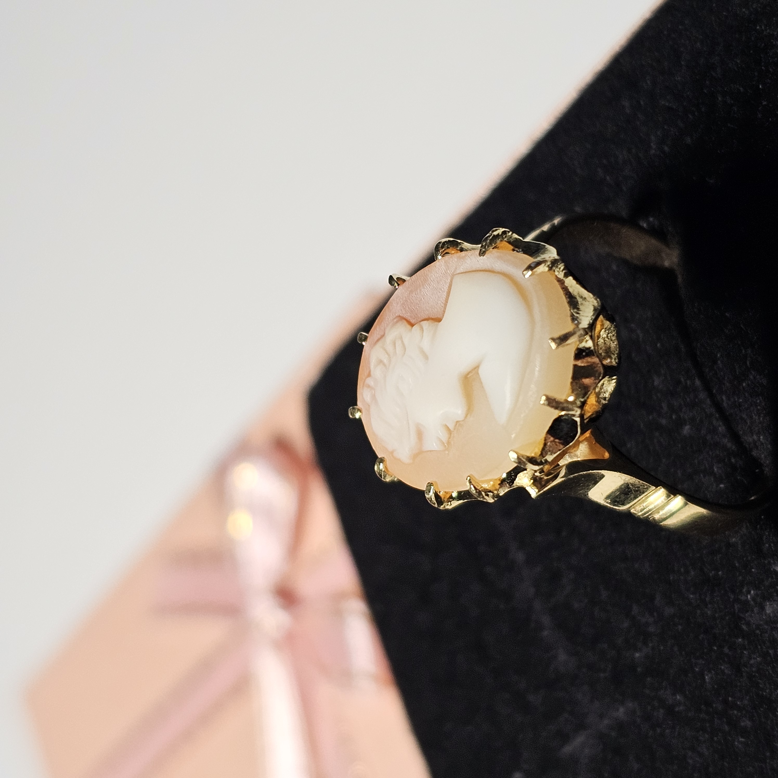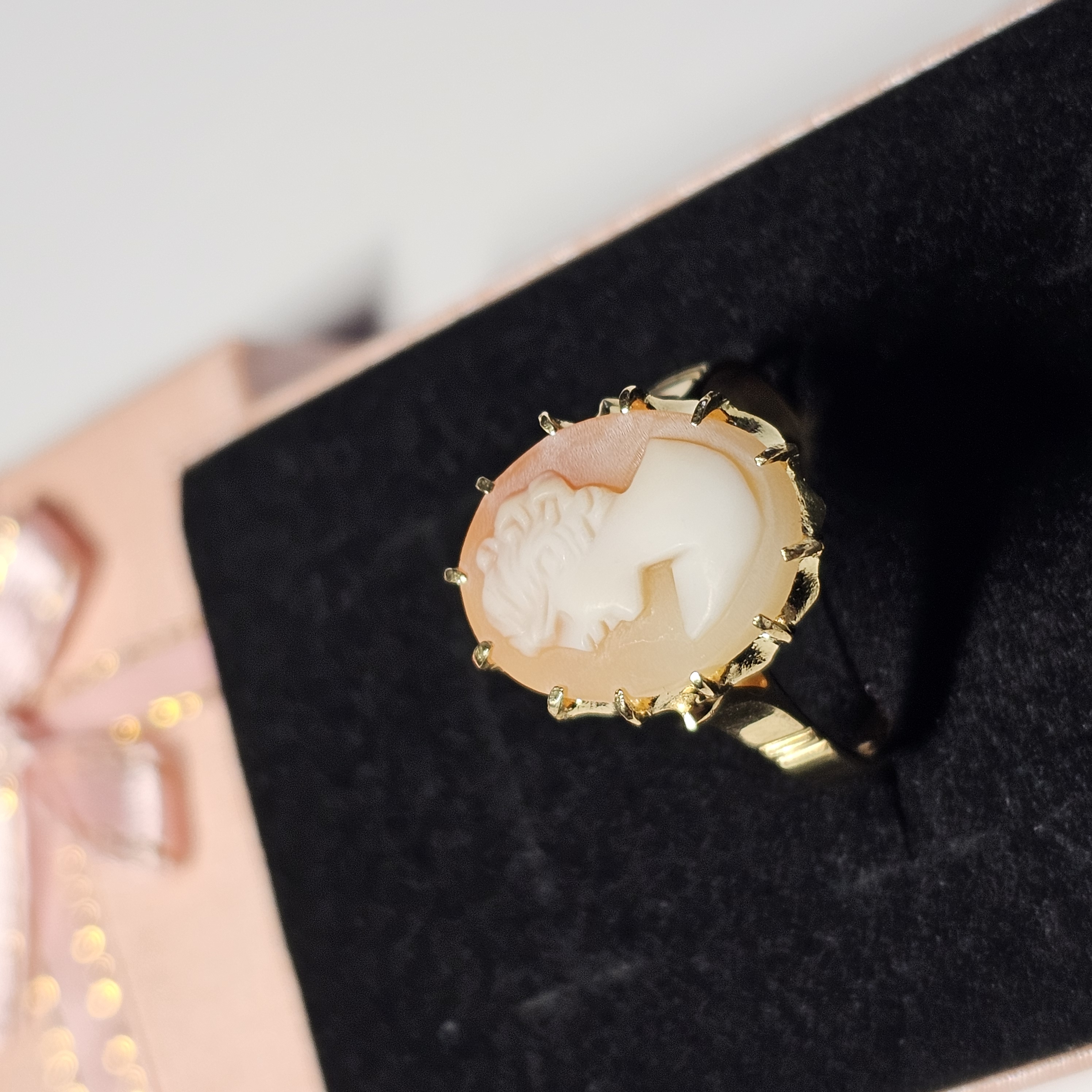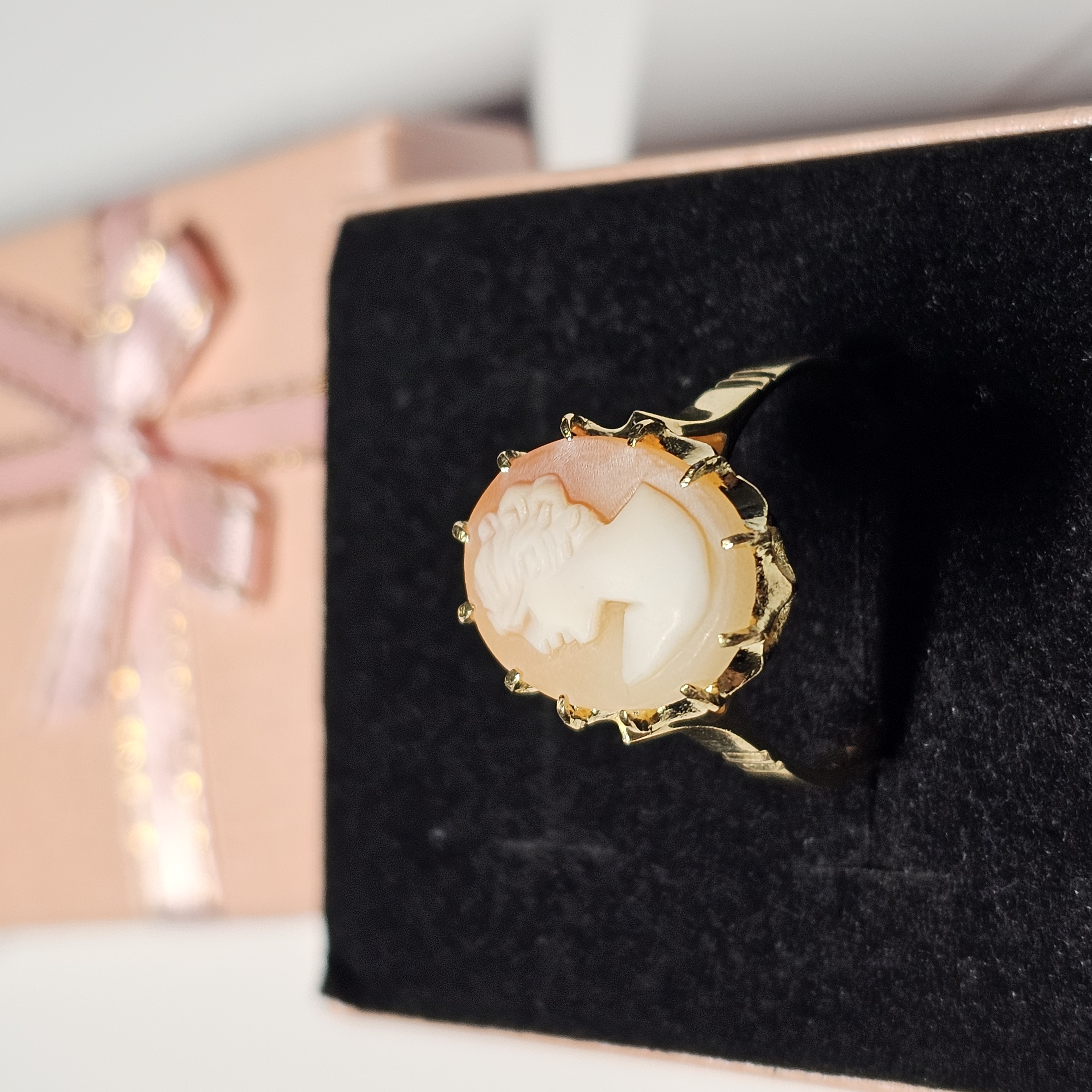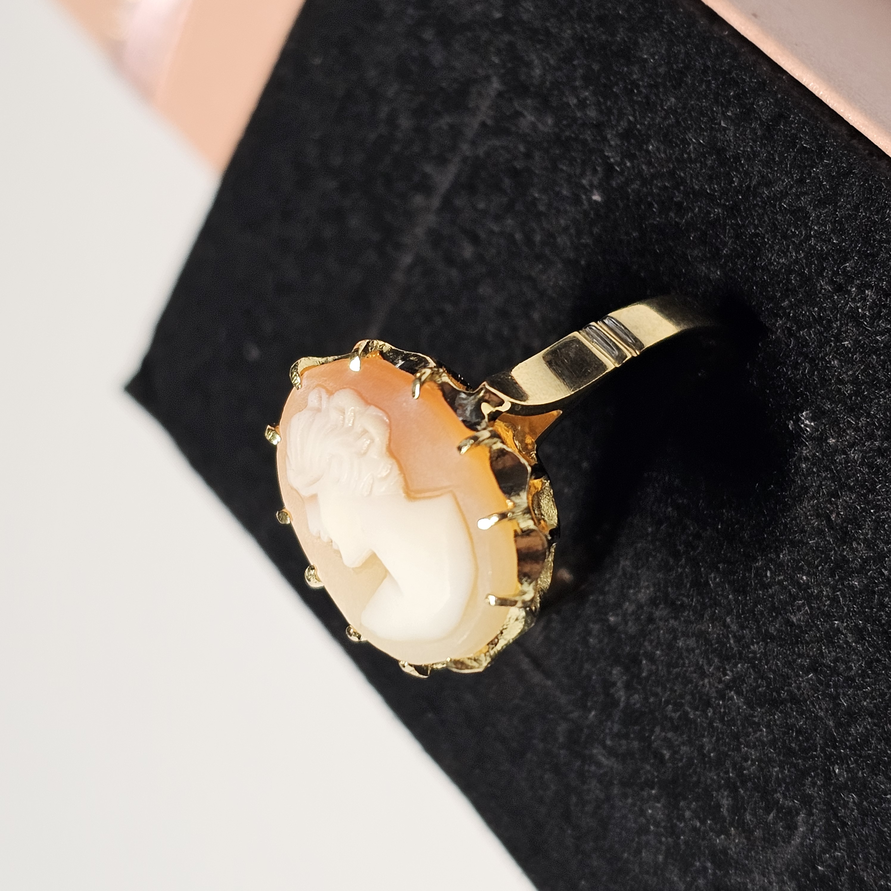Eleganter nostalgischer Shabby Vintage Goldring 750 mit einer Frauenkopf Muschel Kamee / Gemme.