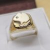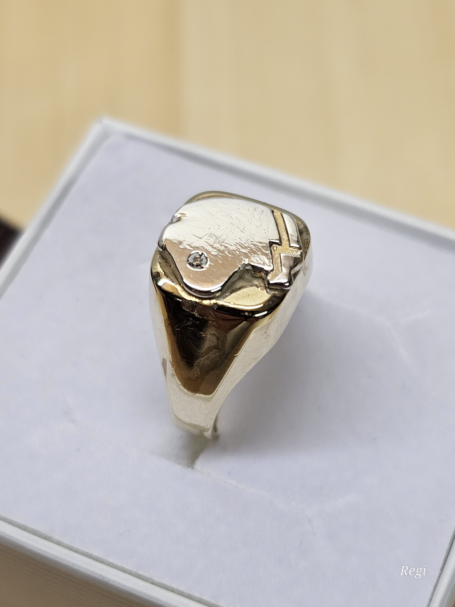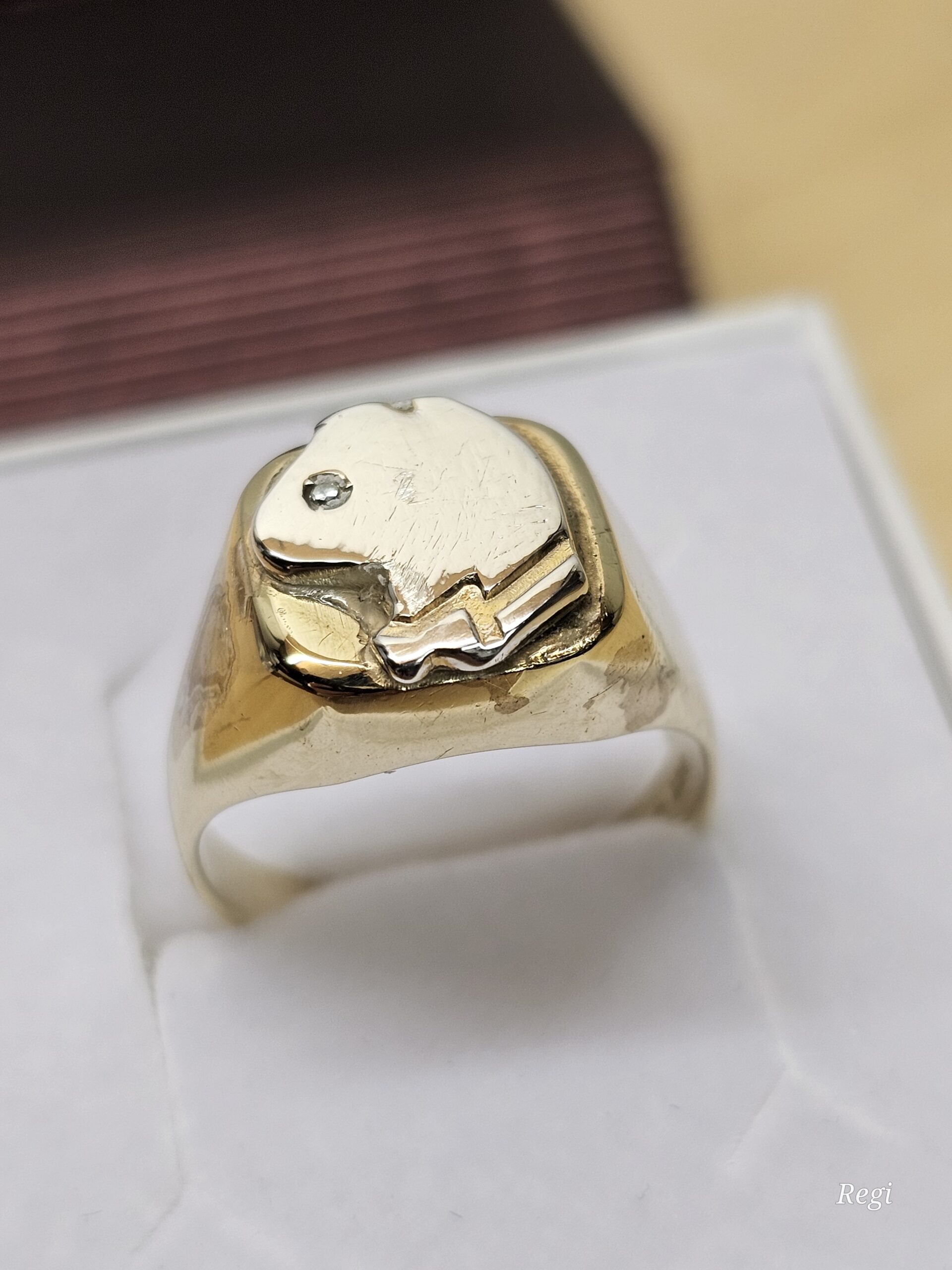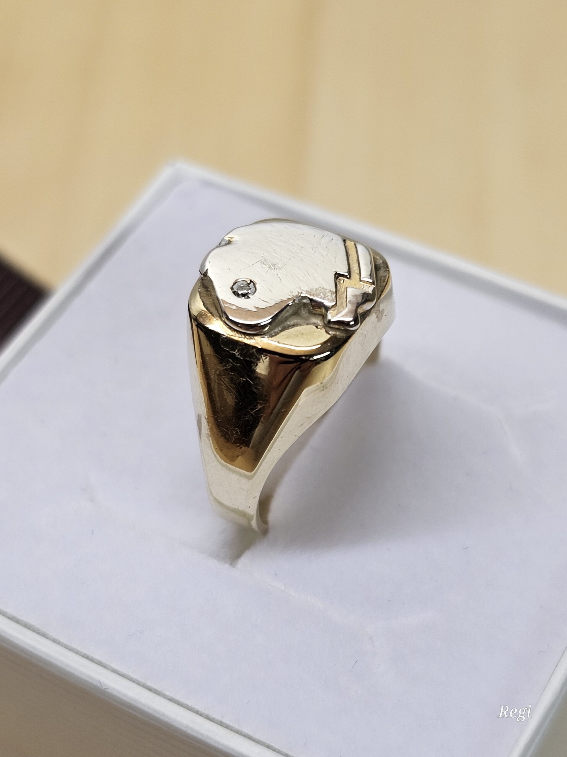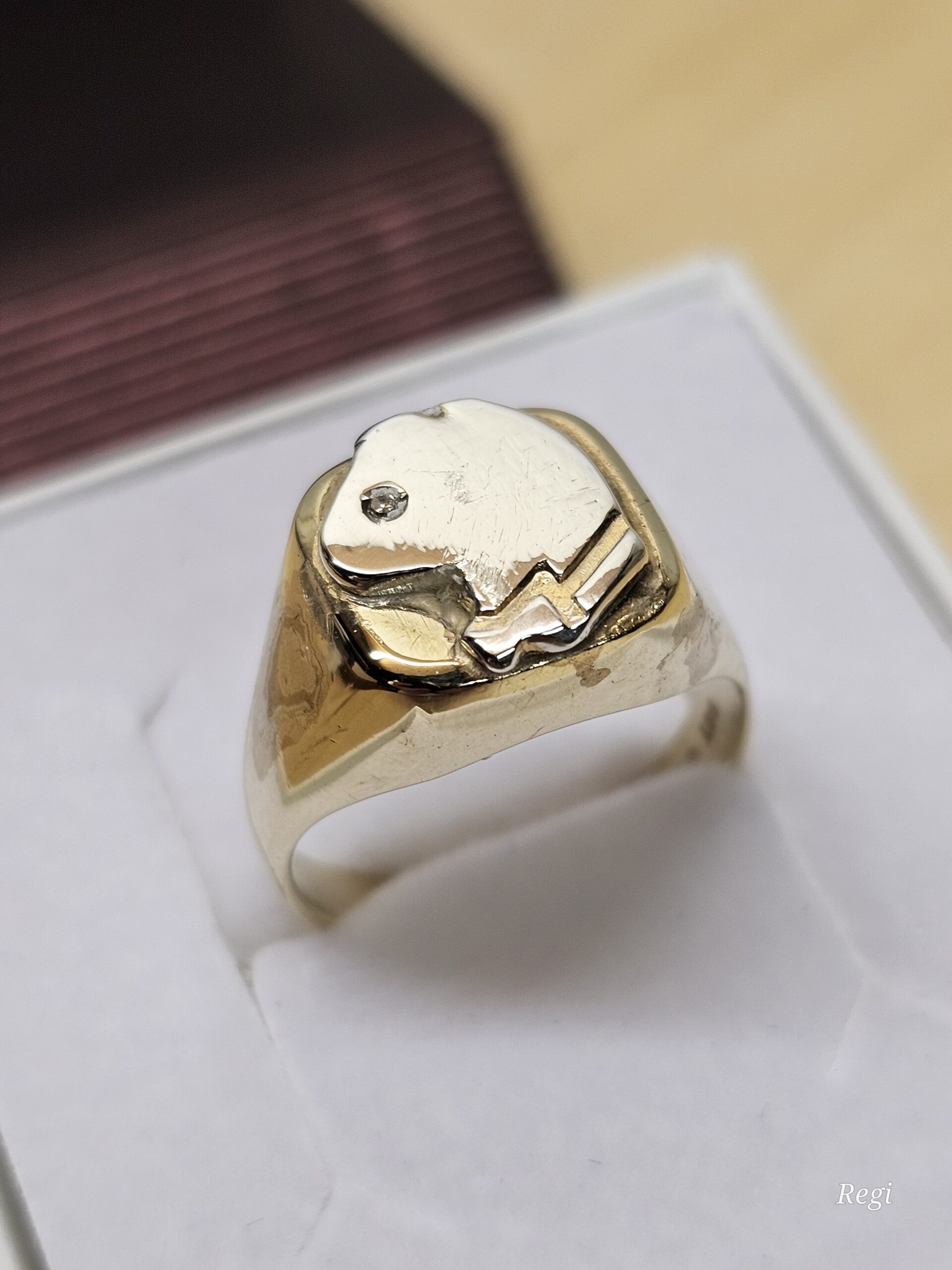 Edler Goldring aus Gold 333. Auf die Ringplatte ist der Kopf einer Figur aus Weißgold gesetzt. Das Auge ist ein Moissanit. Außergewöhnlich schön mit leichter Patina.