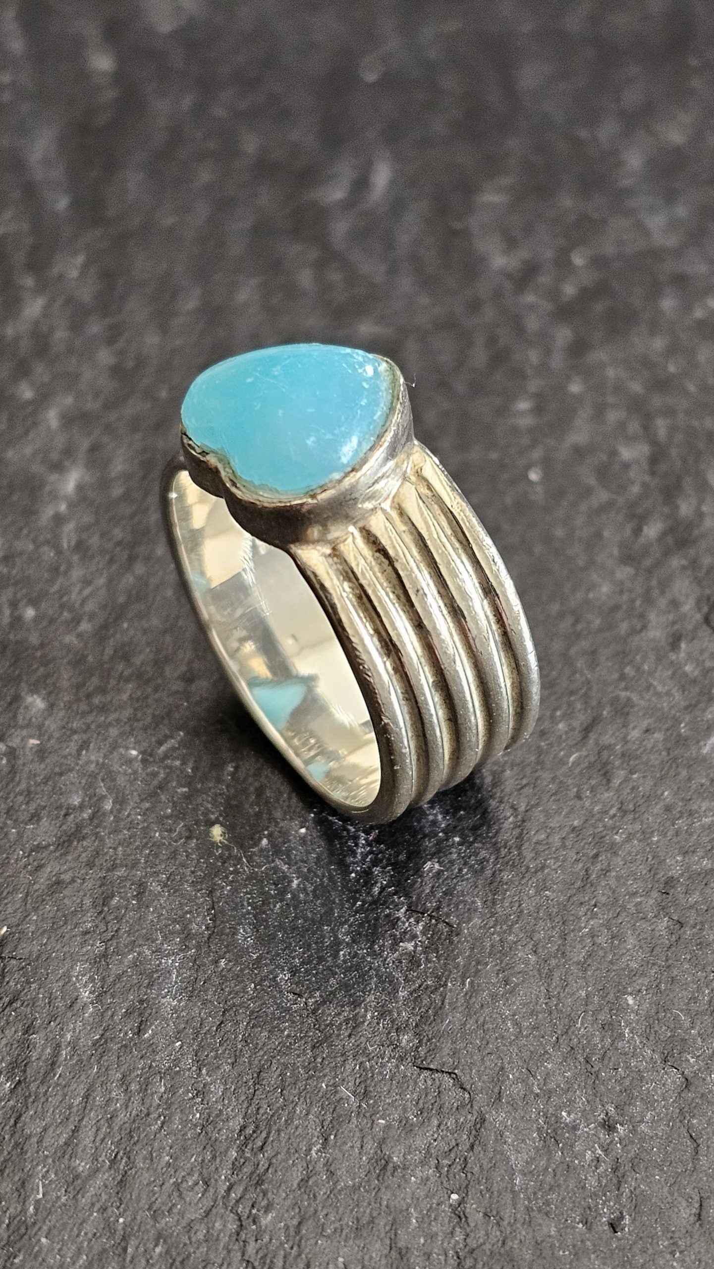 Schön gestalteter Design Ring Silber 925. Der Ringkopf ist mit einem blauen Chalcedon Herz geschmückt.