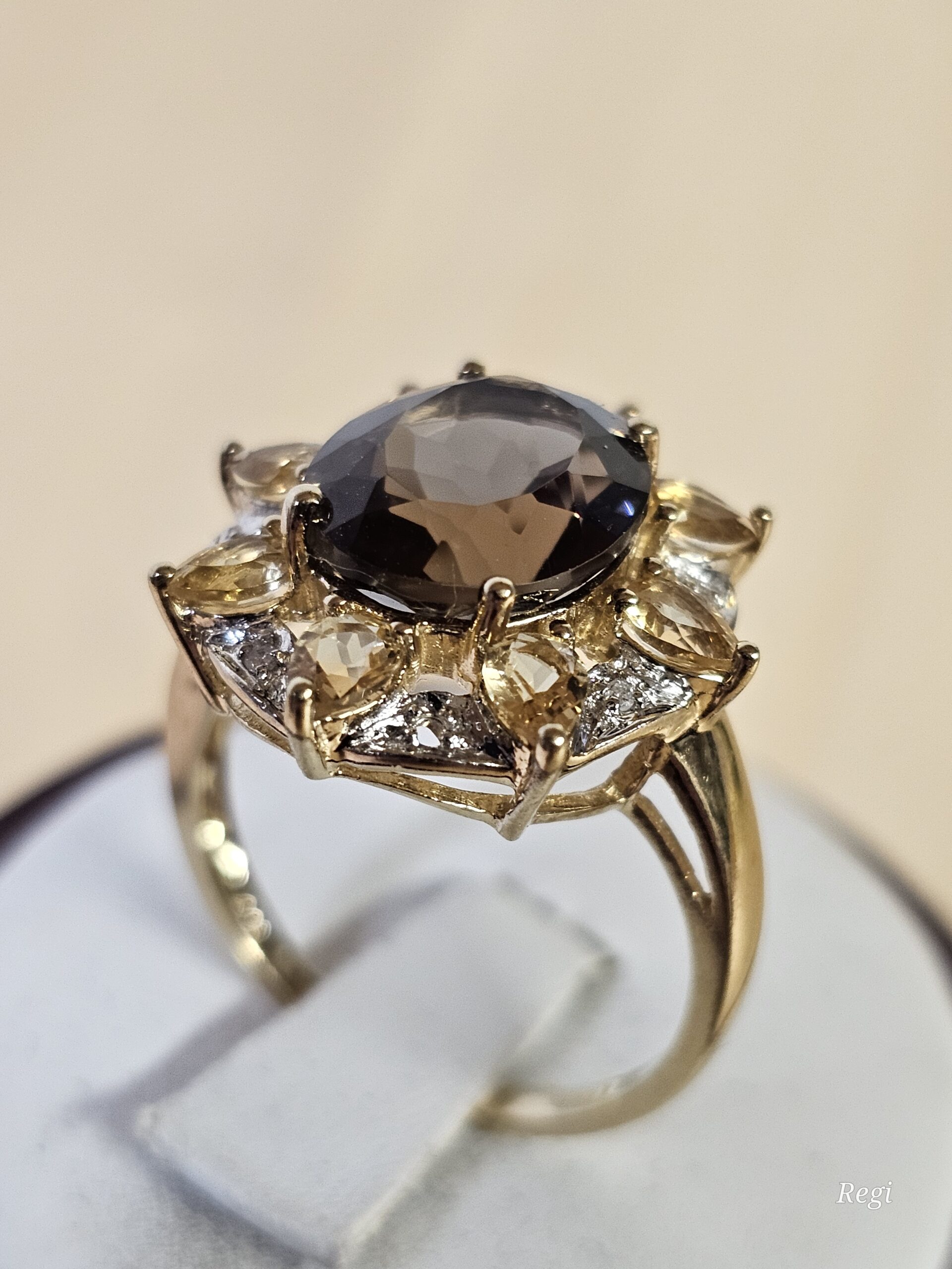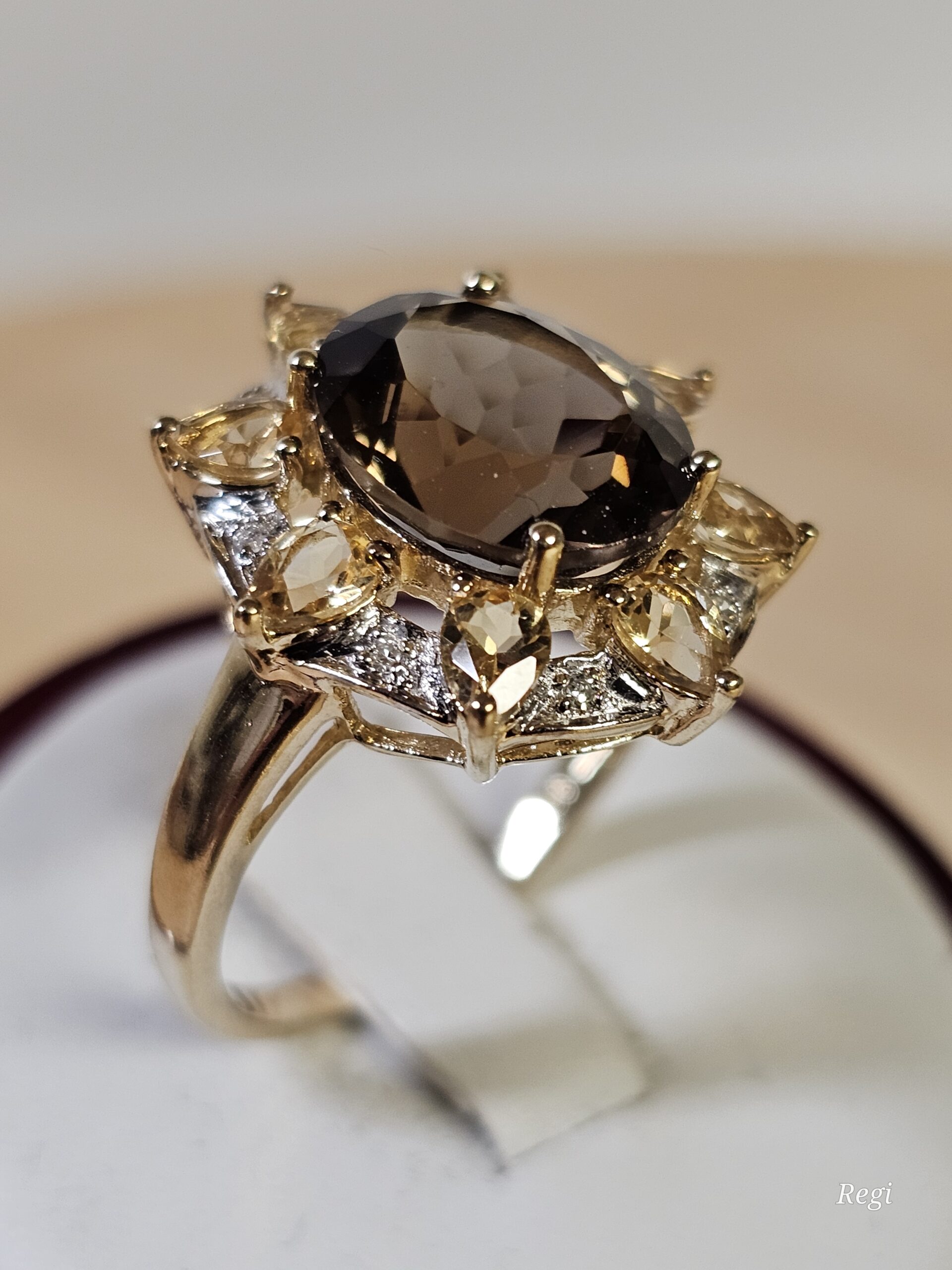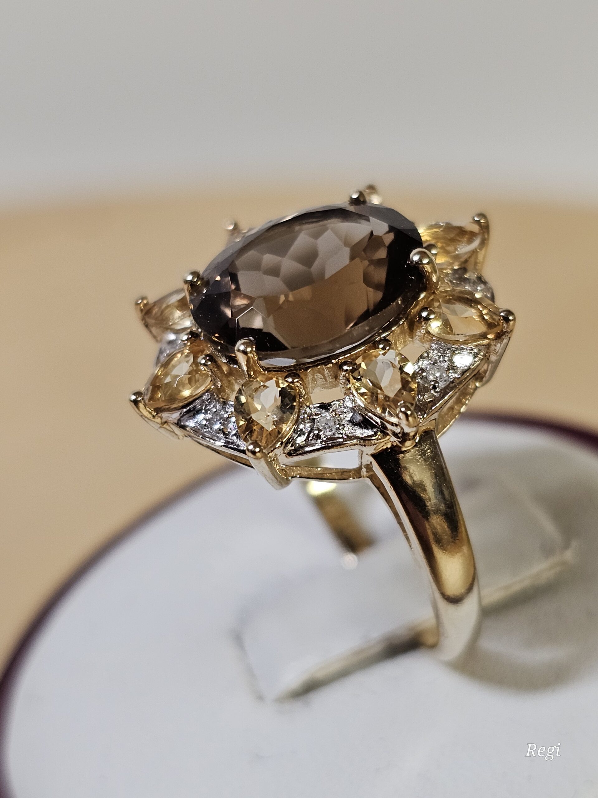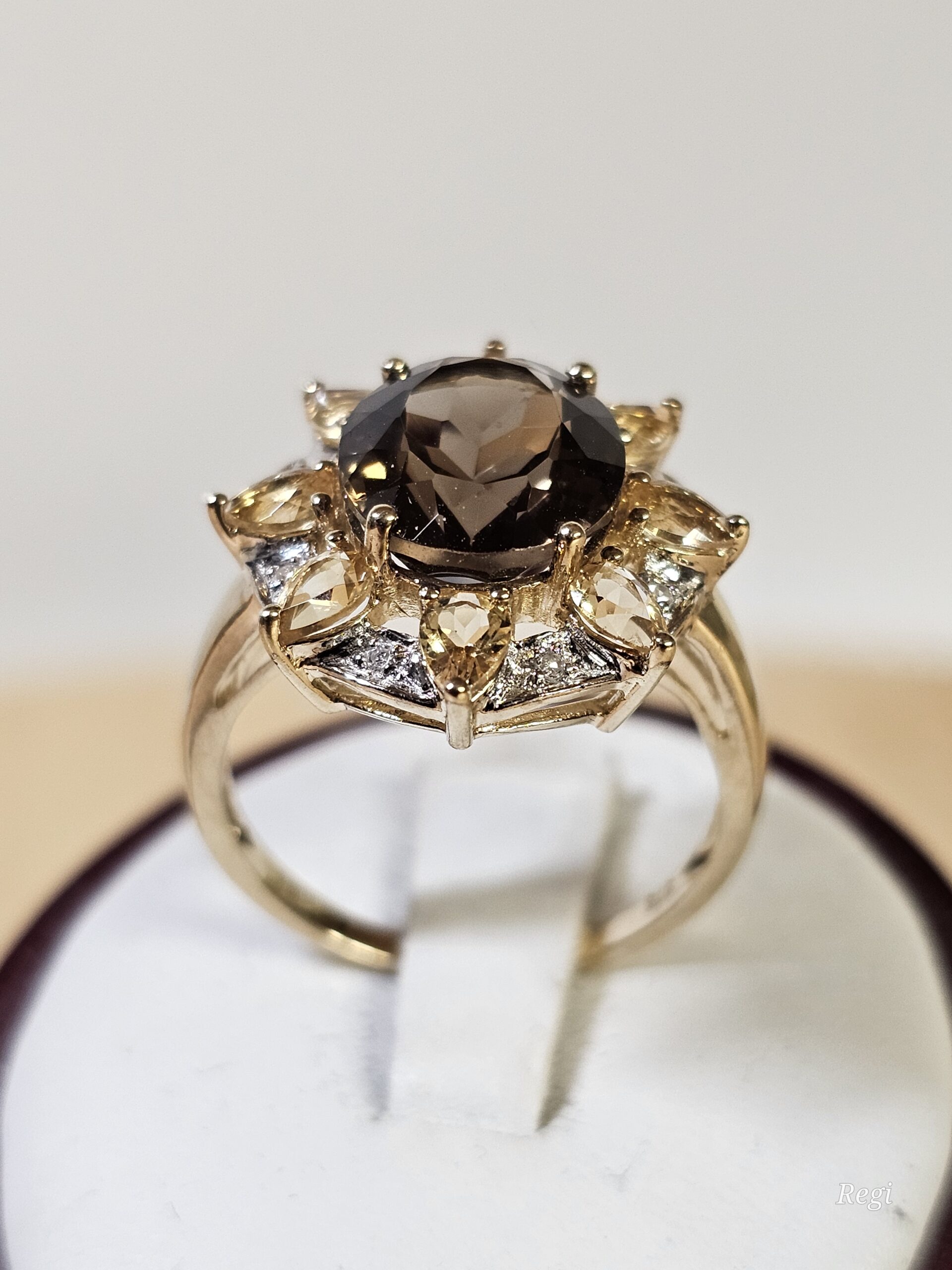 Hübscher Ring aus Gold 375. Ein toller Rauchquarz umrandet mit tropfenförmigen Citrinsteinchen und kleinesten Diamantsteinchen auf platiniertem Untergrund schmücken das schöne Stück.