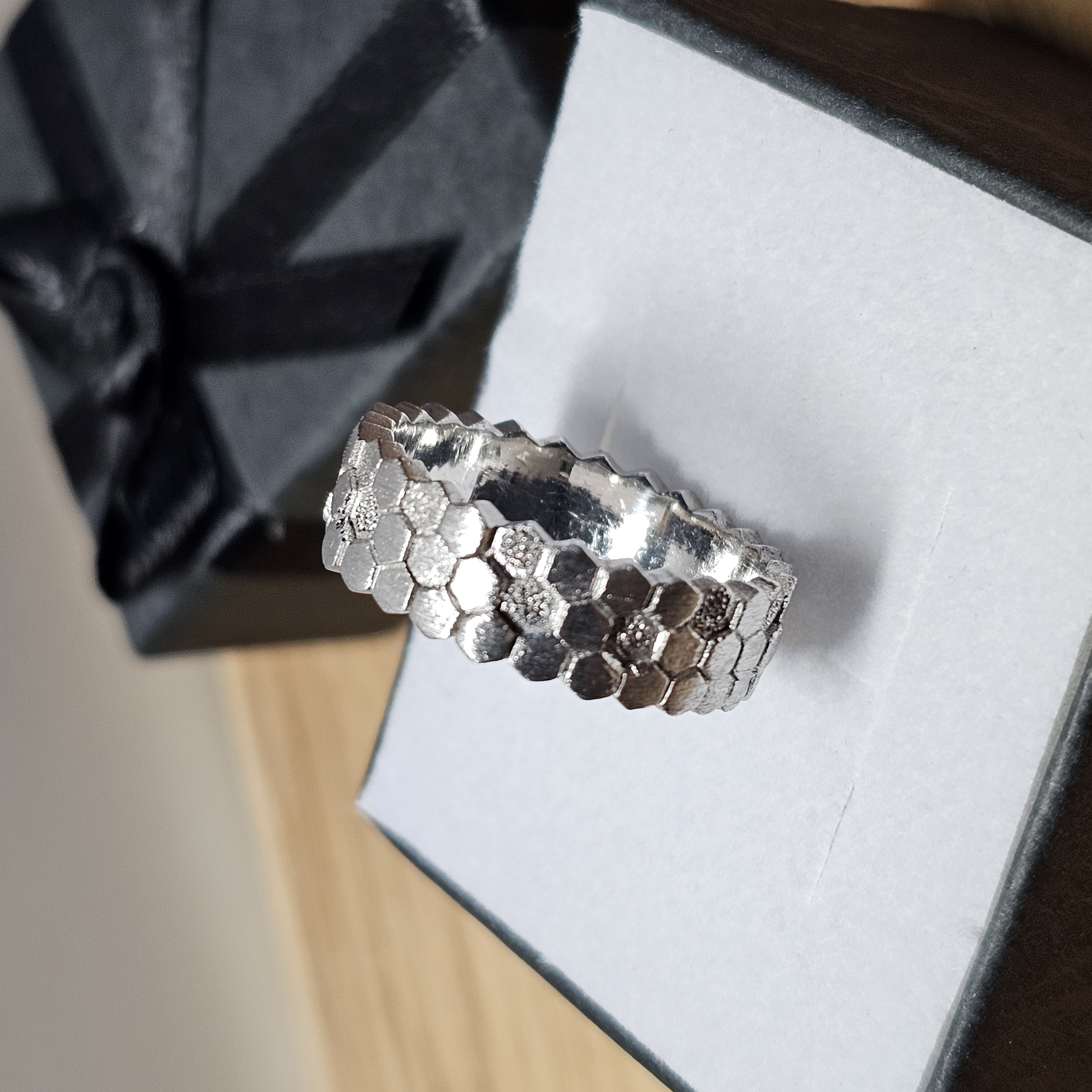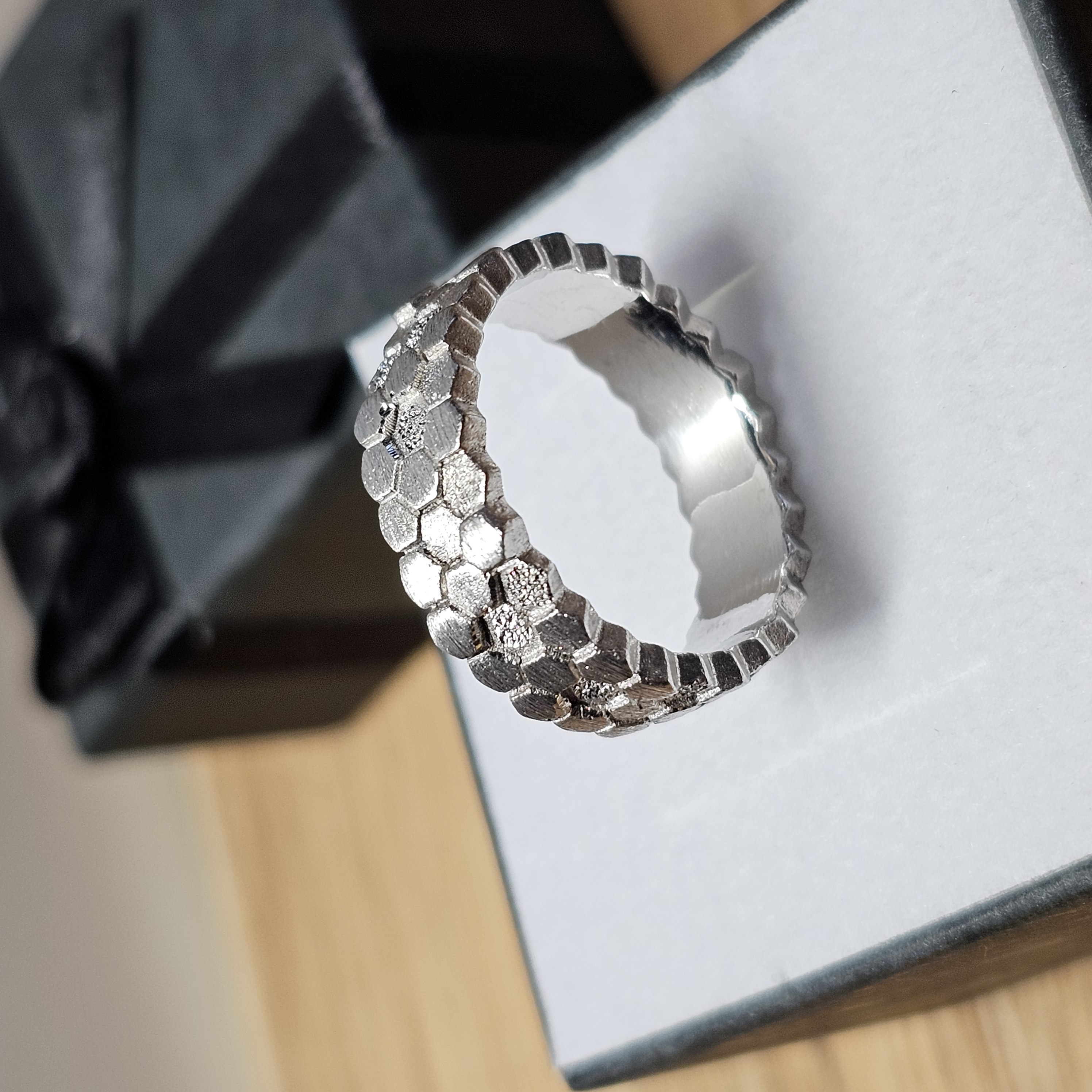 Eleganter Ring mit einer besonderen Ringbandgestaltung. Er ist aus Silber 925 gefertigt und trägt in seiner Musterung punktuell diamantiert geschliffene Felder.