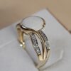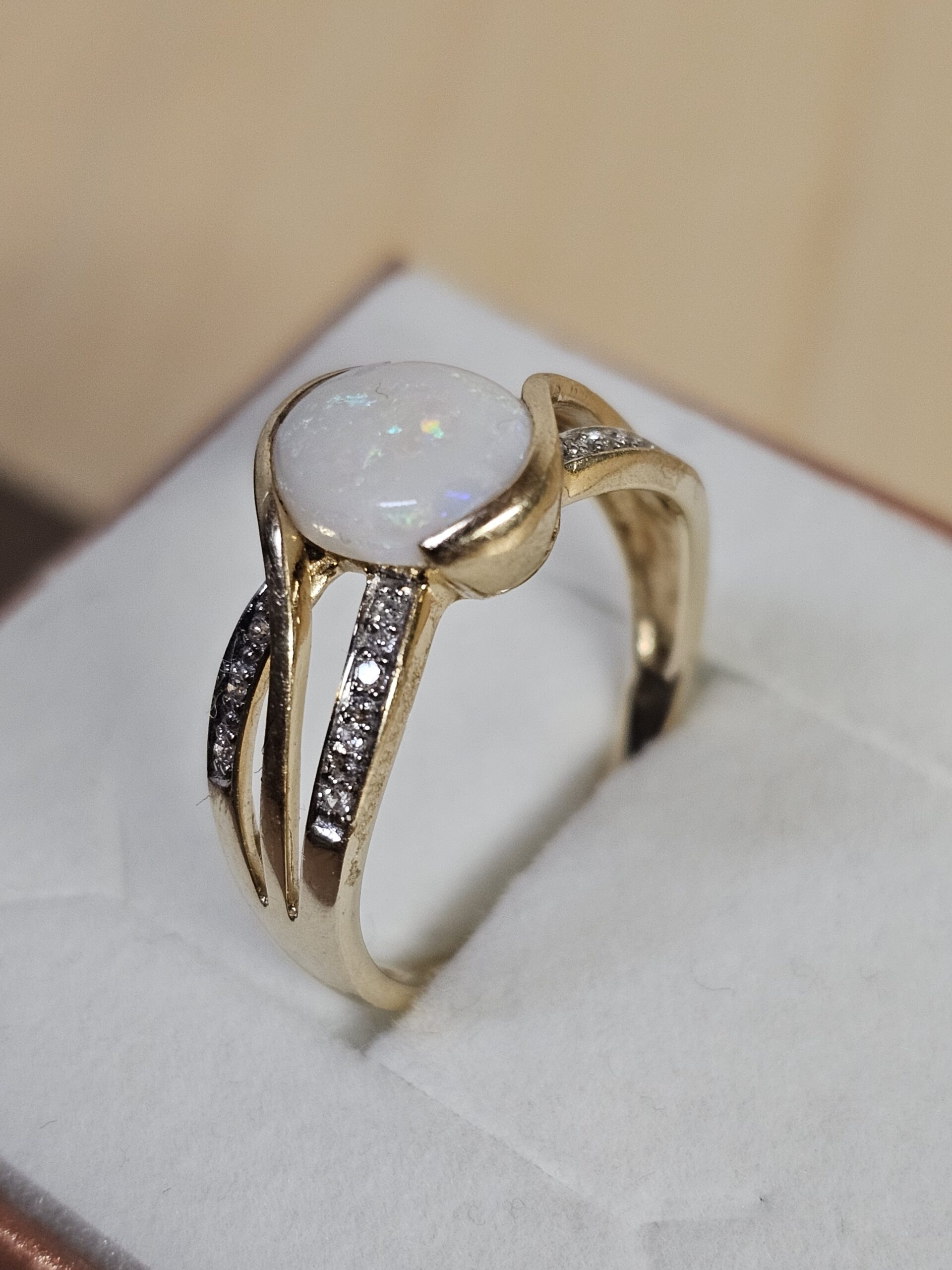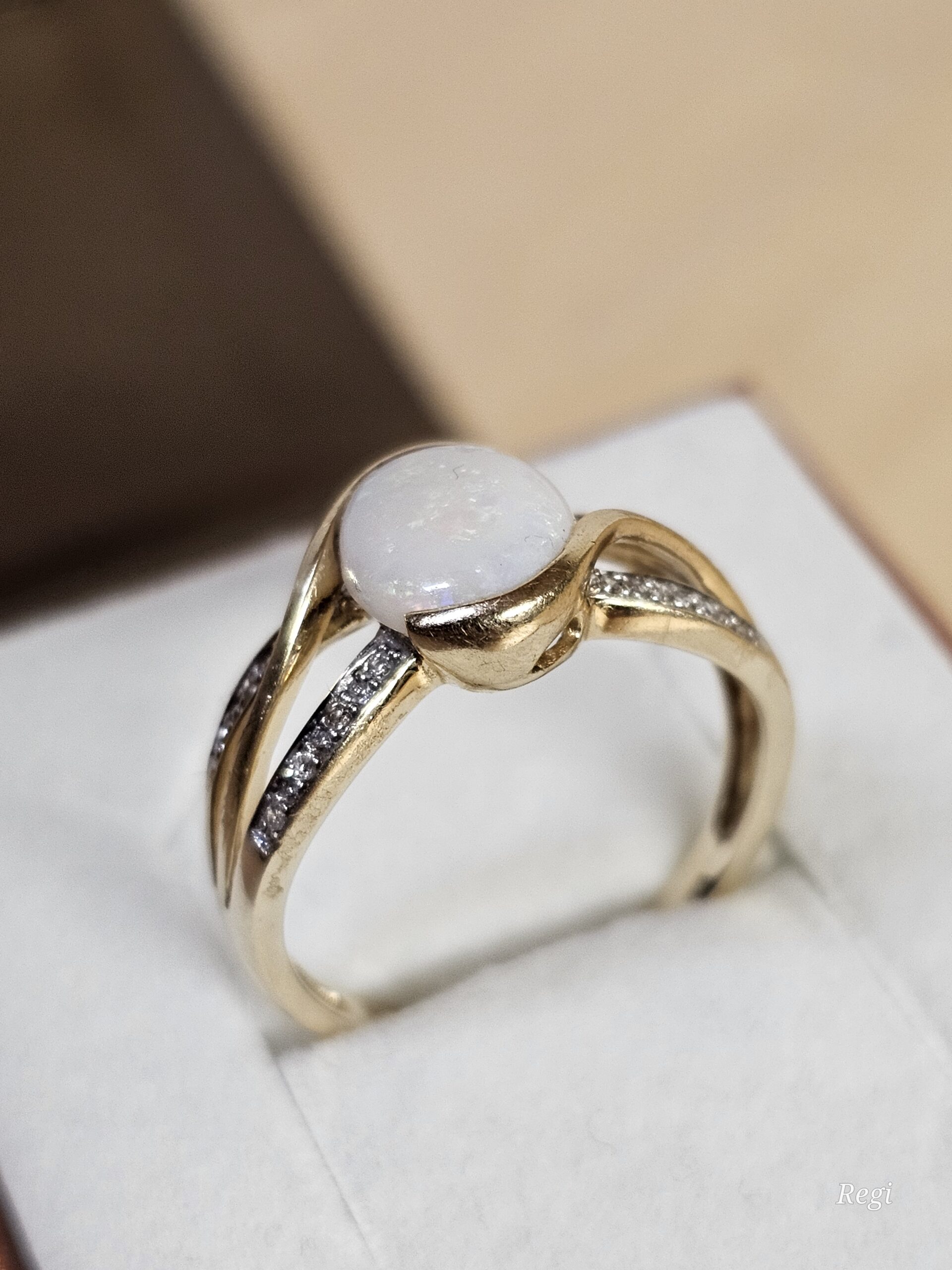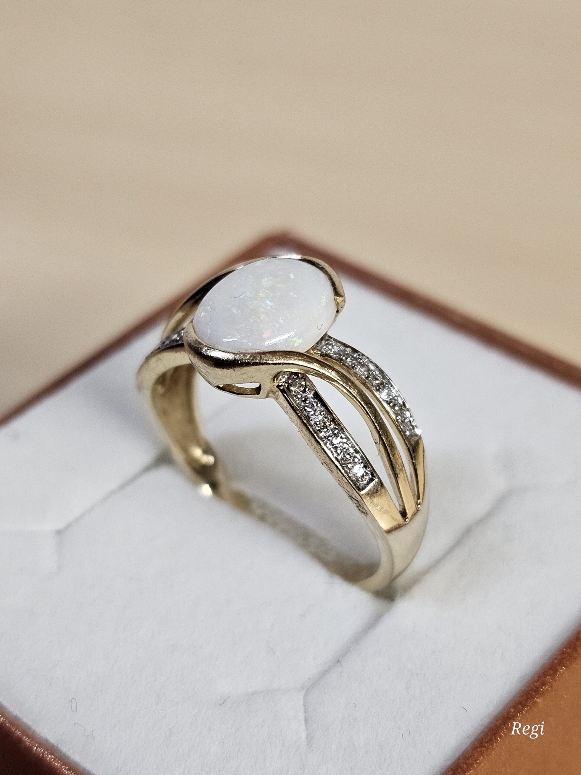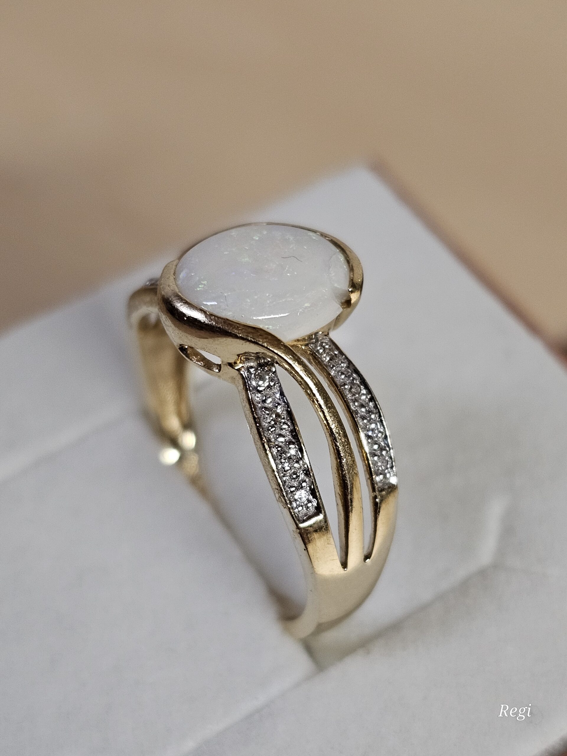 Vintage-Goldring 585 besetzt mit einem schönen weißen Opal. Der Ringkopf ist wunderschön gestaltet und zusätzlich mit kleinsten Diamantsteinchen auf teilplatiniertem Untergrund verziert.