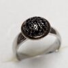 Eleganter Ring mit einer runden Ringkopfgestaltung. Er ist aus Silber 925 gefertigt und trägt schwarze Kristalle (in der Vergangenheit wurde irgendwann einmal ein Steinchen durch ein blaues ersetzt, was aber überhaupt nicht auffällt und nur mit der Lupe erkennbar ist). Der Ringkopf ist mit einer Teilvergoldung umrandet.