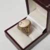 Der Ringkopf ist mit einer bezaubernden Malerei auf Knochen geschmückt. Die Malerei selbst ist zwar etwas abgerieben, der Vogel und die Blümchen sind noch erkennbar, vielleicht gibt es jemanden aus dem künstlerischen Bereich, der dieses schöne Kunstwerk restaurieren kann.