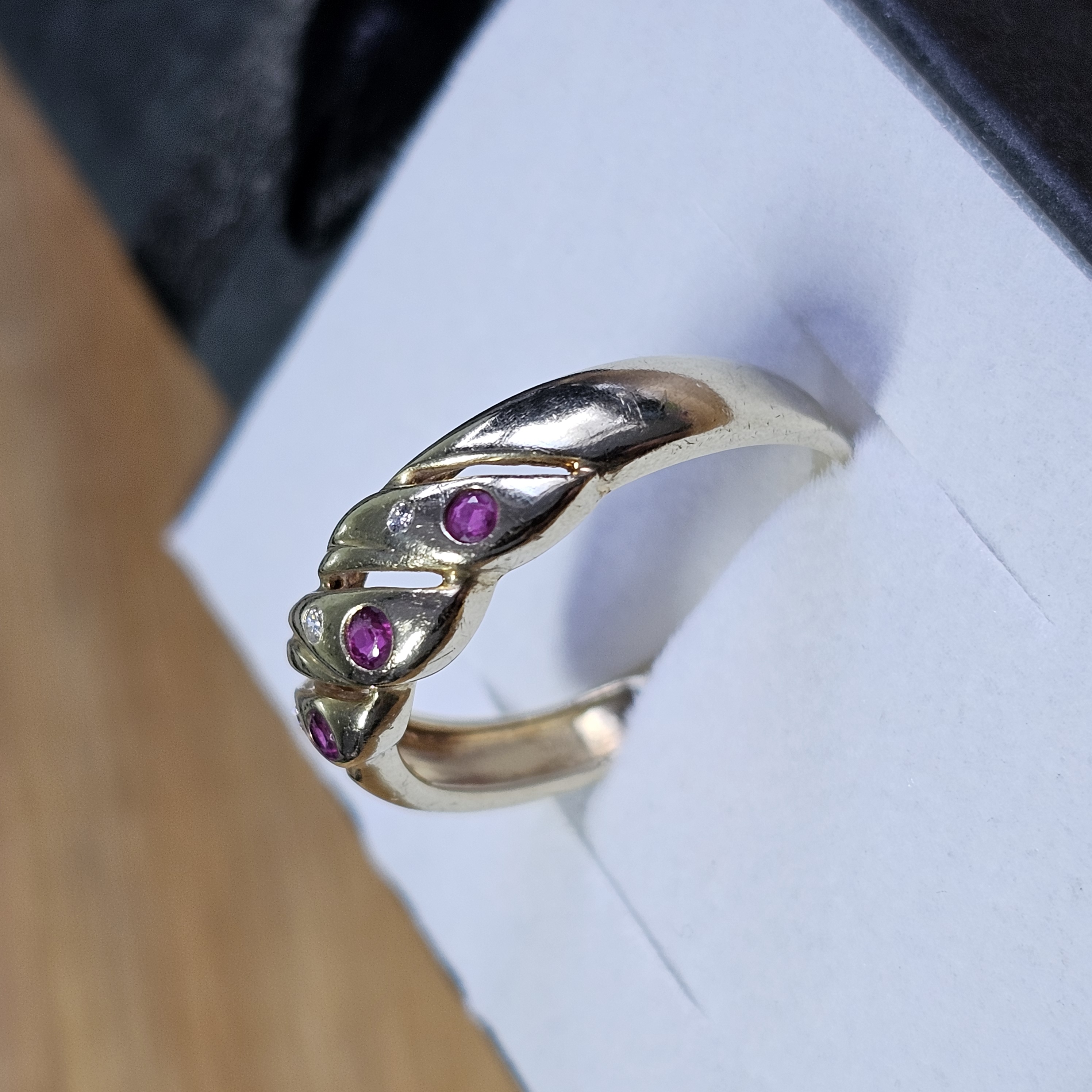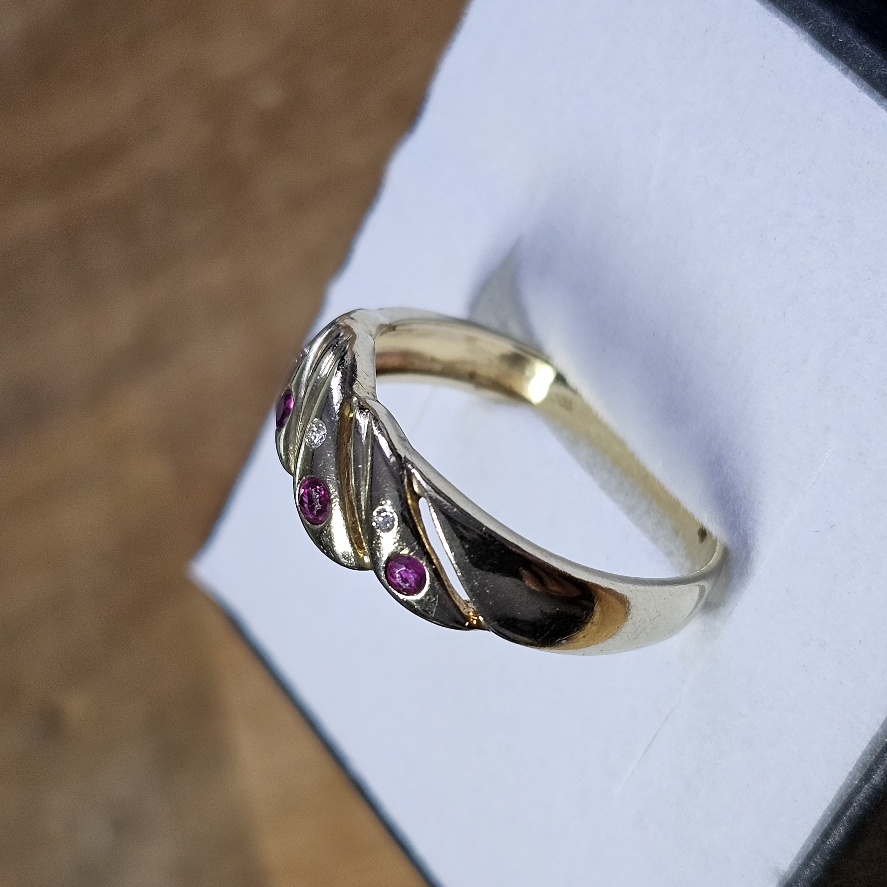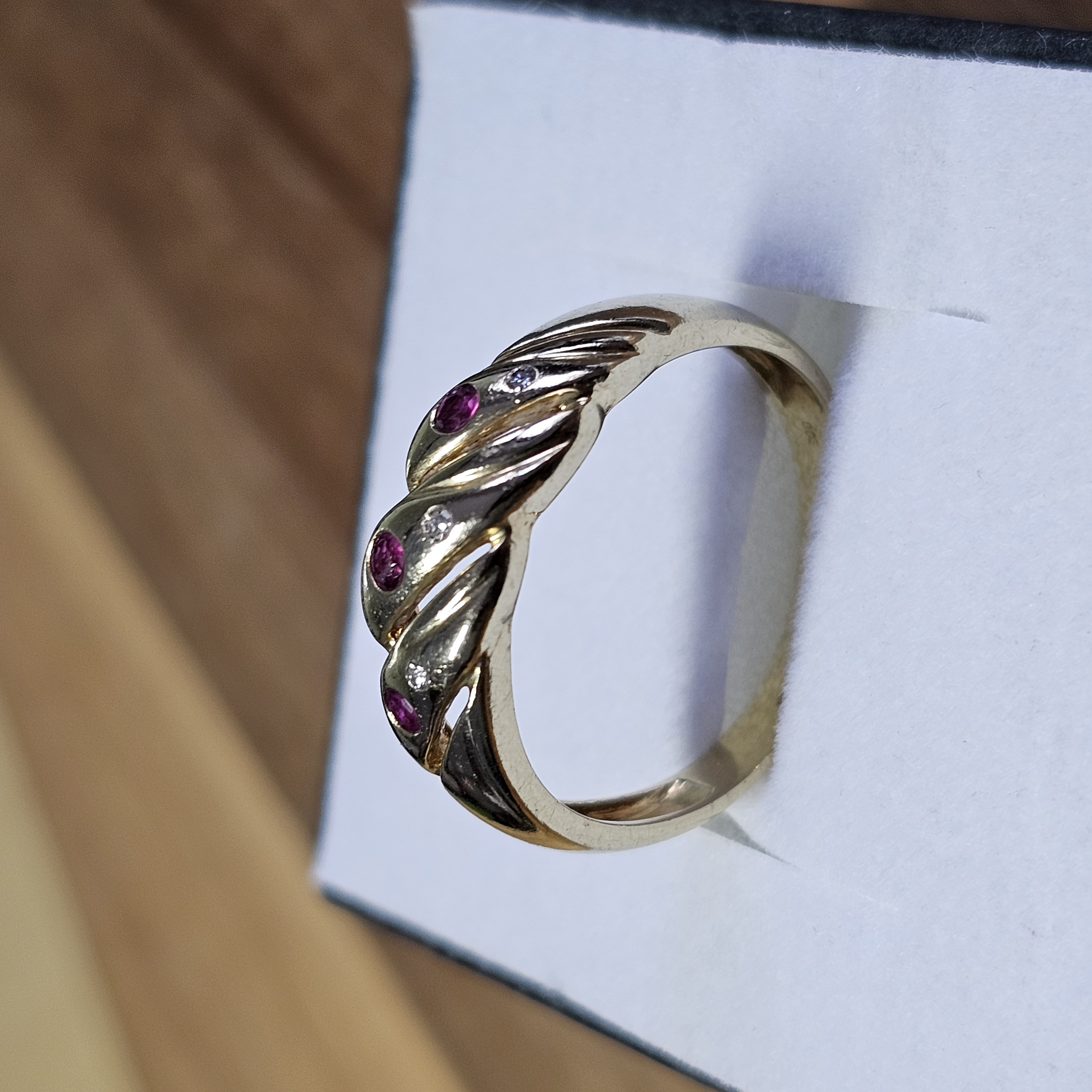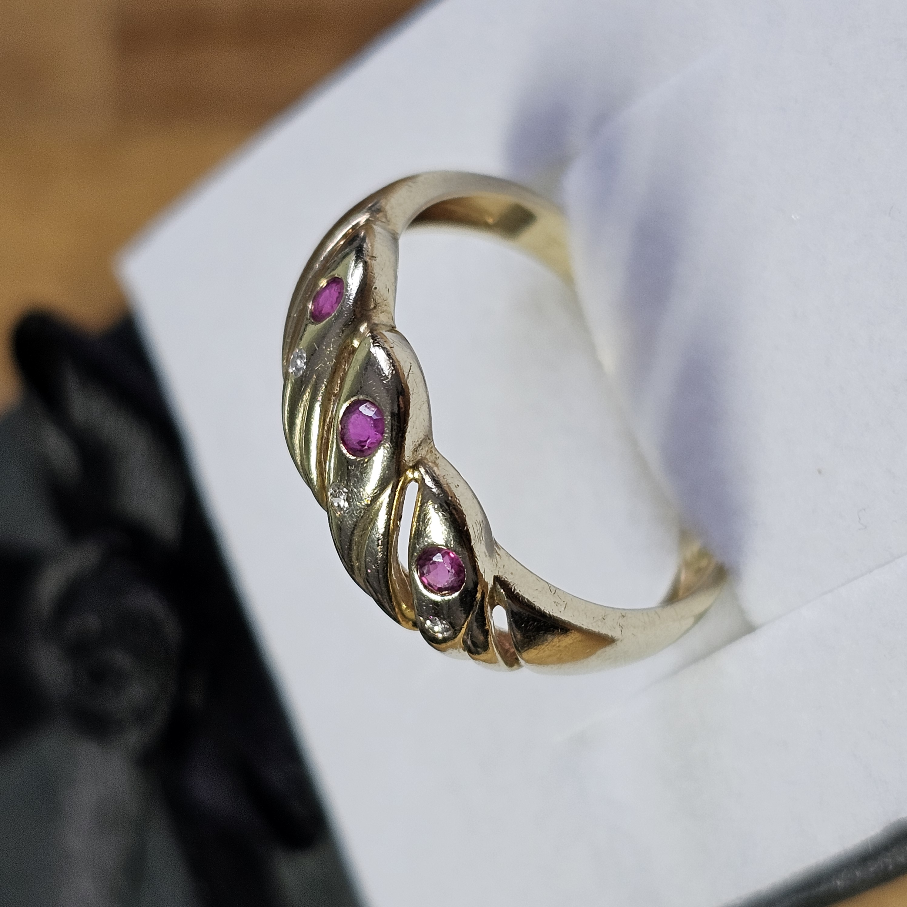 Schöner nostalgischer Ring Gold 585. Er ist mit einem hübschen, teils durchbrochen gestalteten Design gearbeitet. 3 Stck. kleine Rubinsteinchen und 3 Stck. kleine Diamantsteinchen schmücken das Ringkopfdesign.