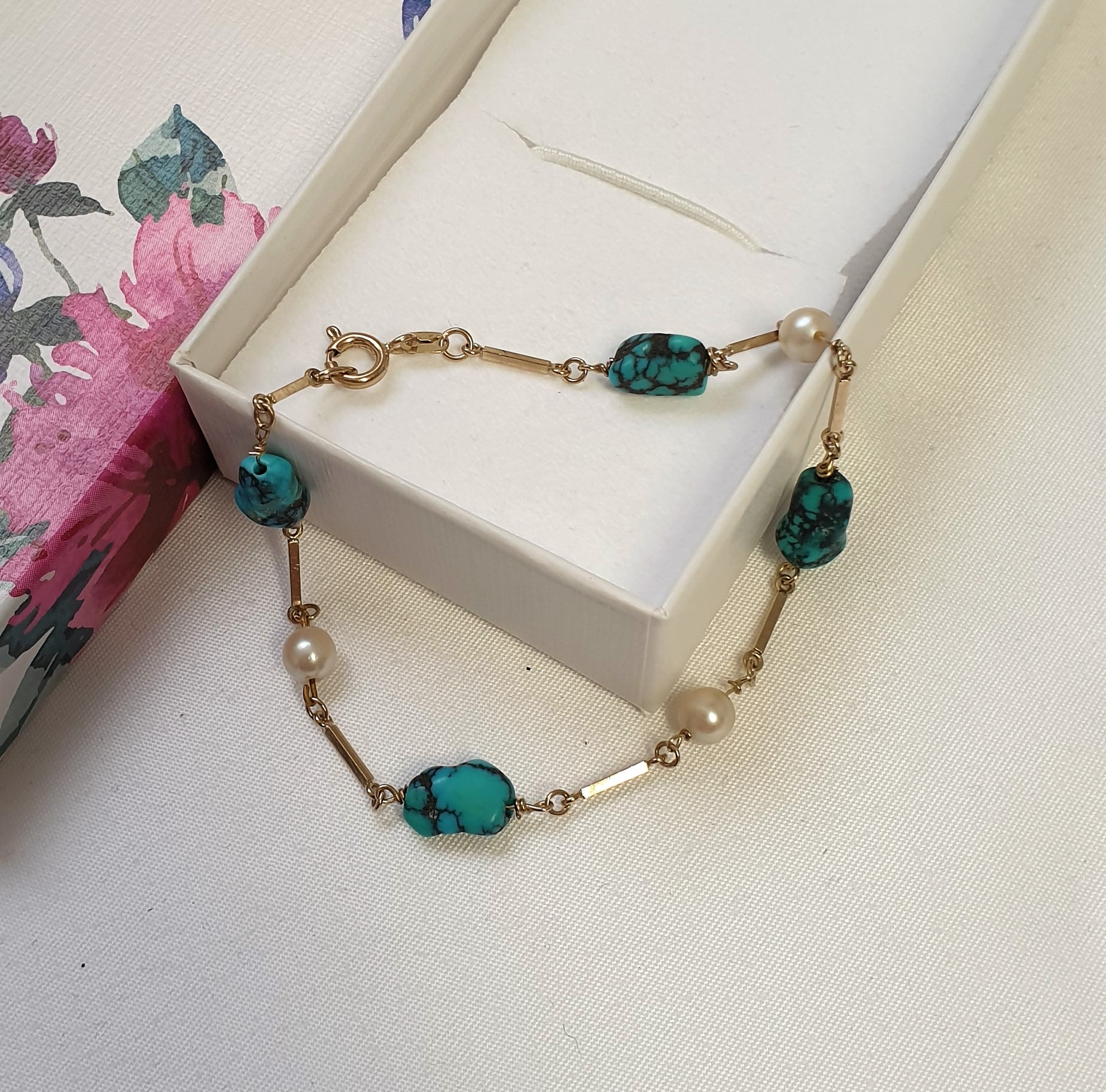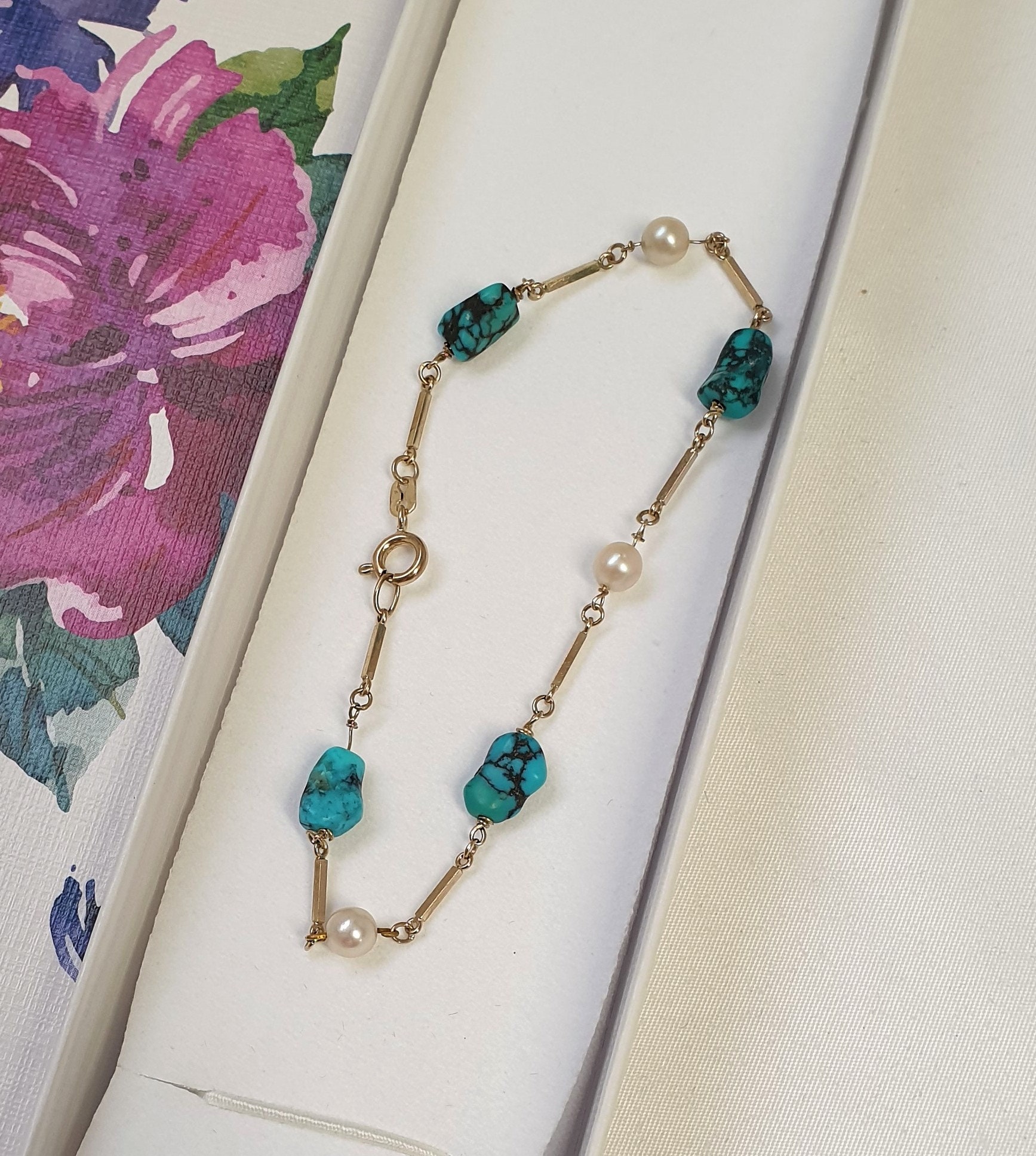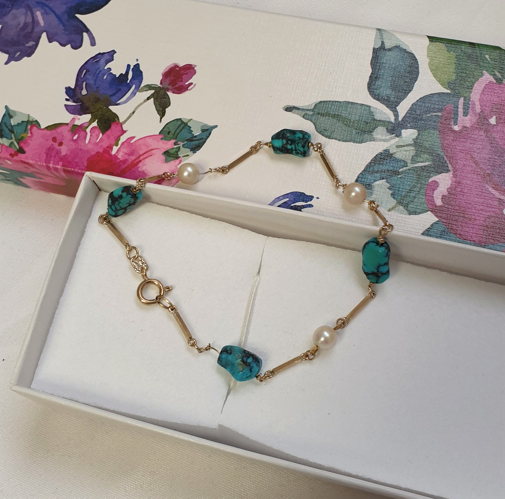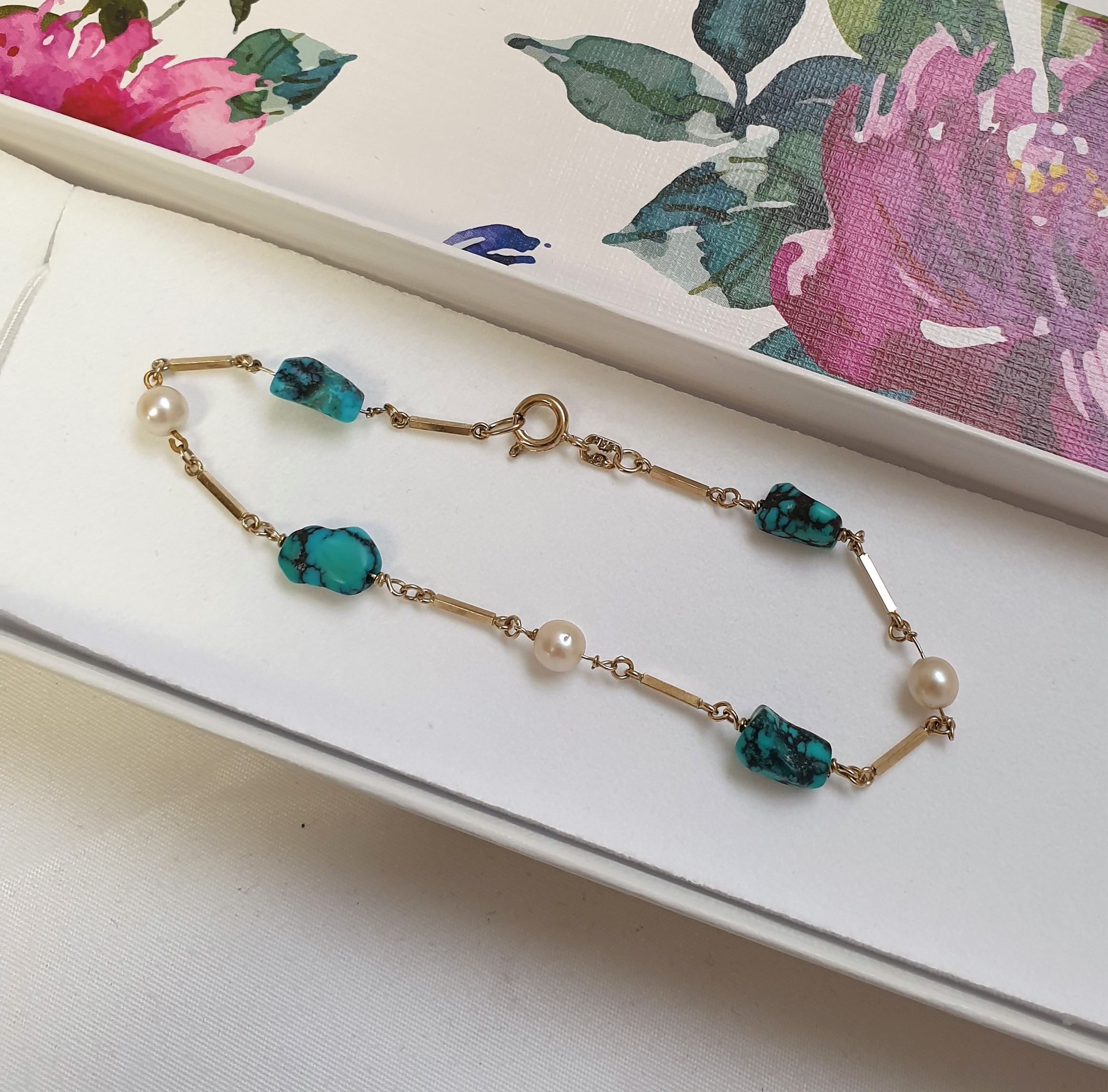 Schönes Shabby Vintage Gliederarmband aus Gold 333, sehr schönes Design. Das Gliederdesign ist abwechselnd mit Perlen und Türkissteinen abgesetzt.