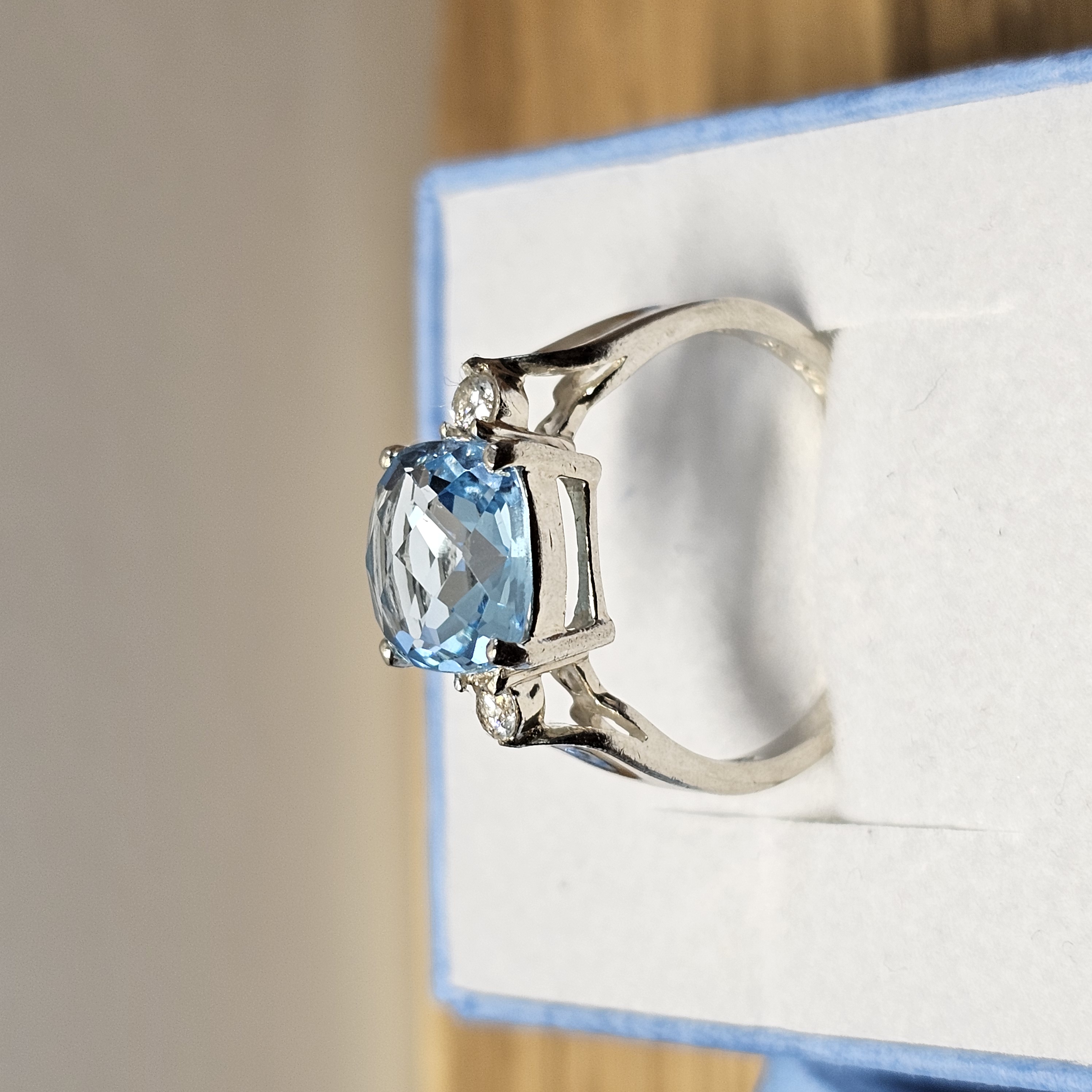 Eleganter Ring aus Silber 925. Der Blautopas mittig verfügt über einen tollen Fassettenschliff, links und rechts daneben sitzt je eine kleiner runder klarer Kristallstein.