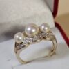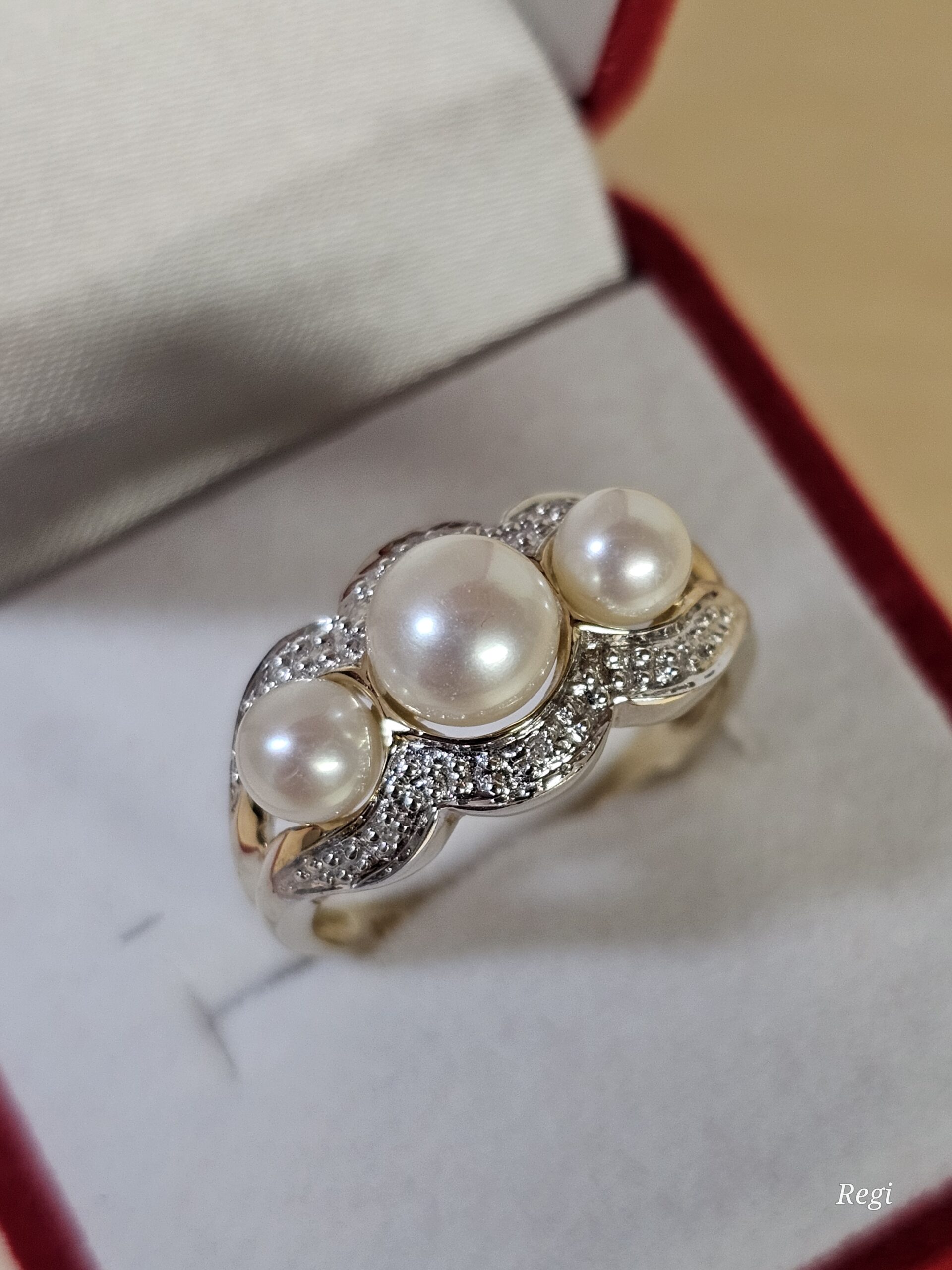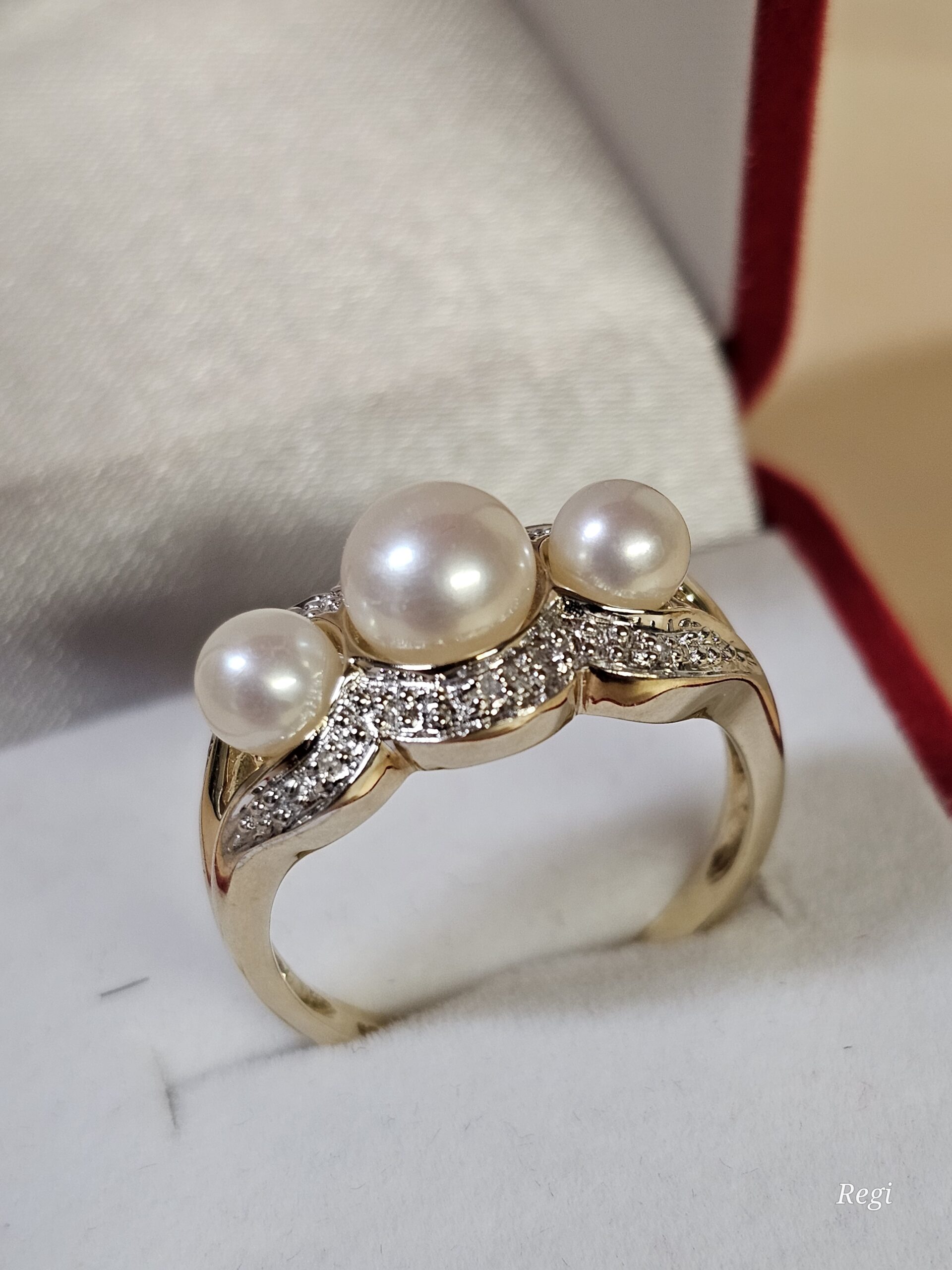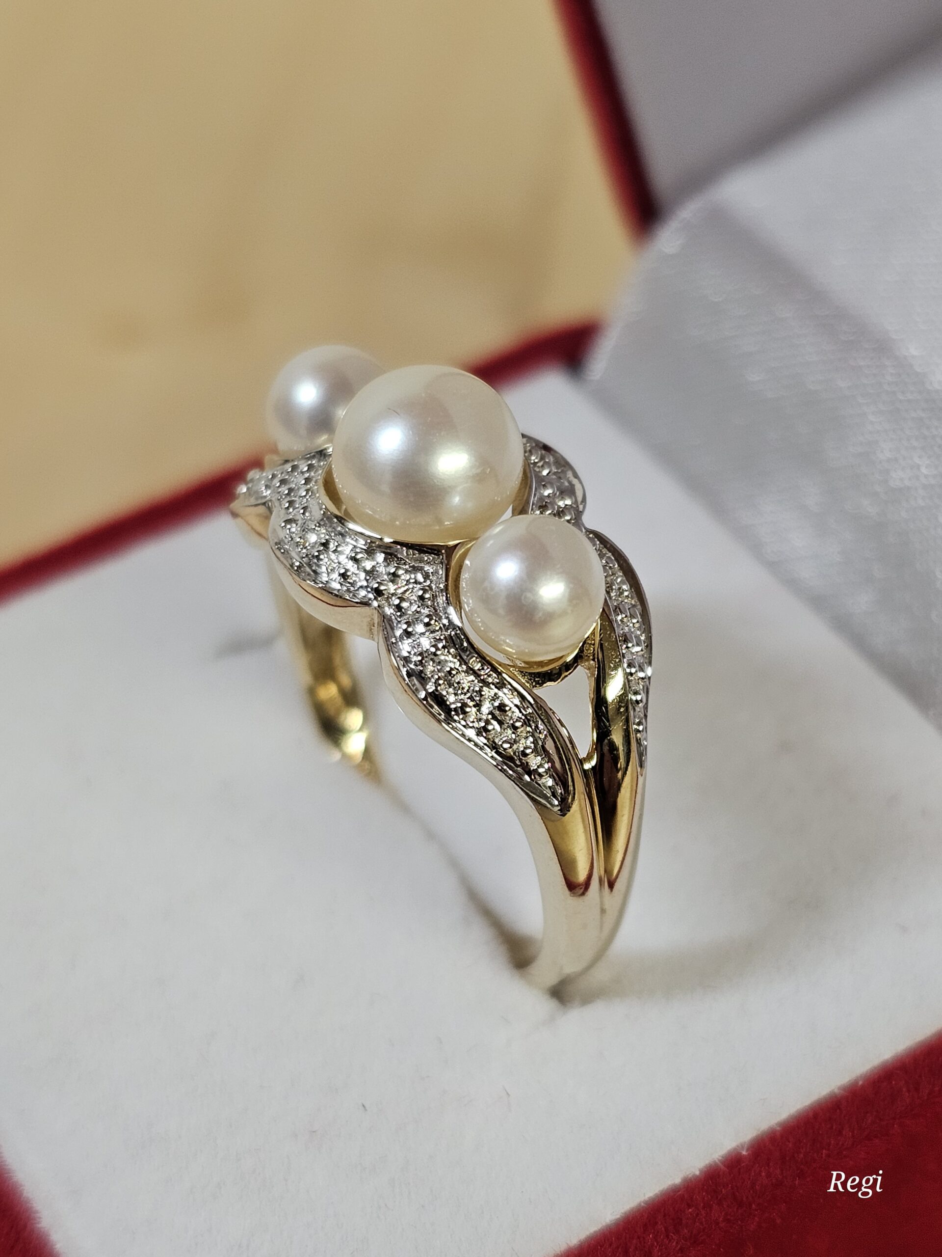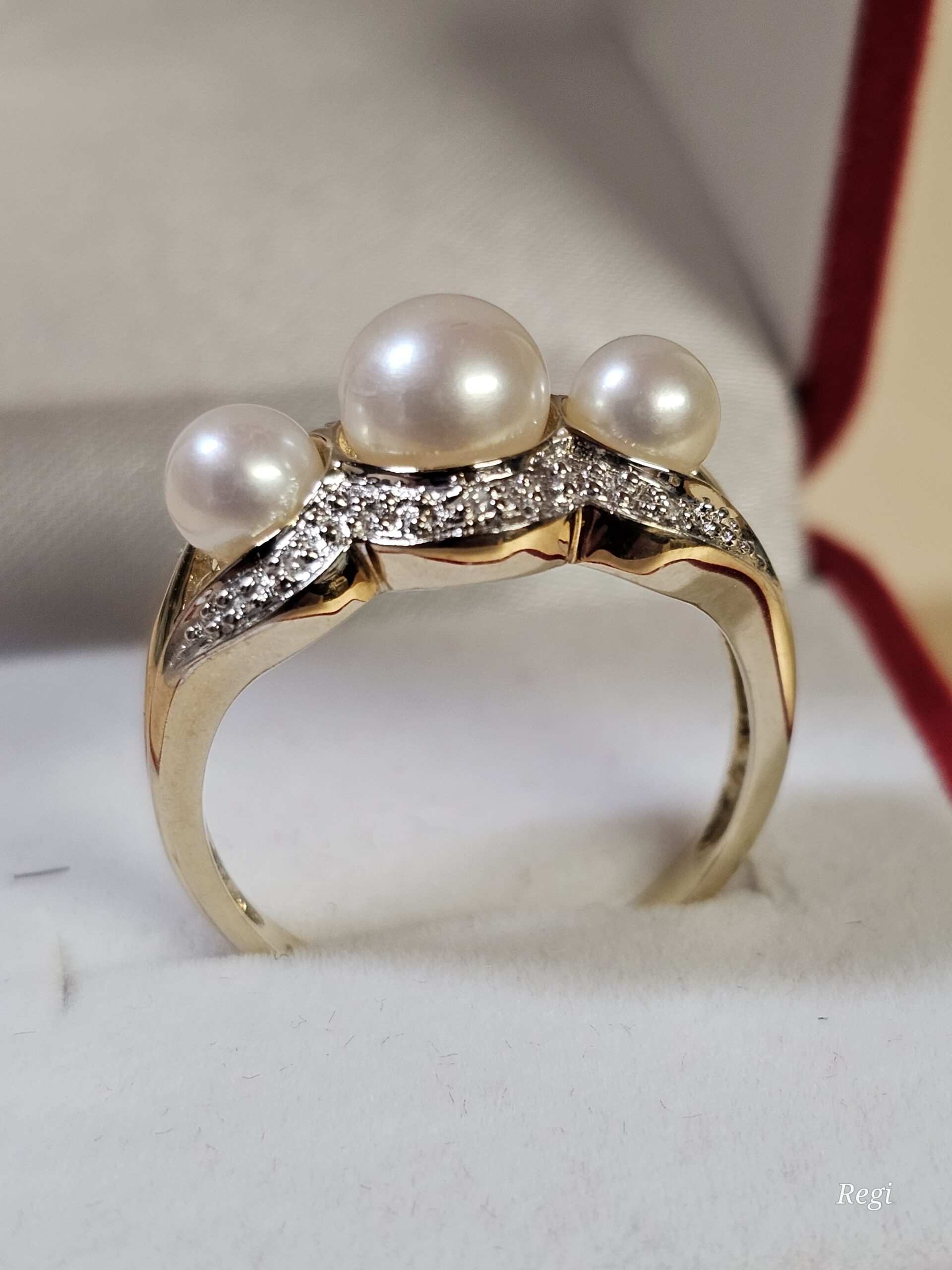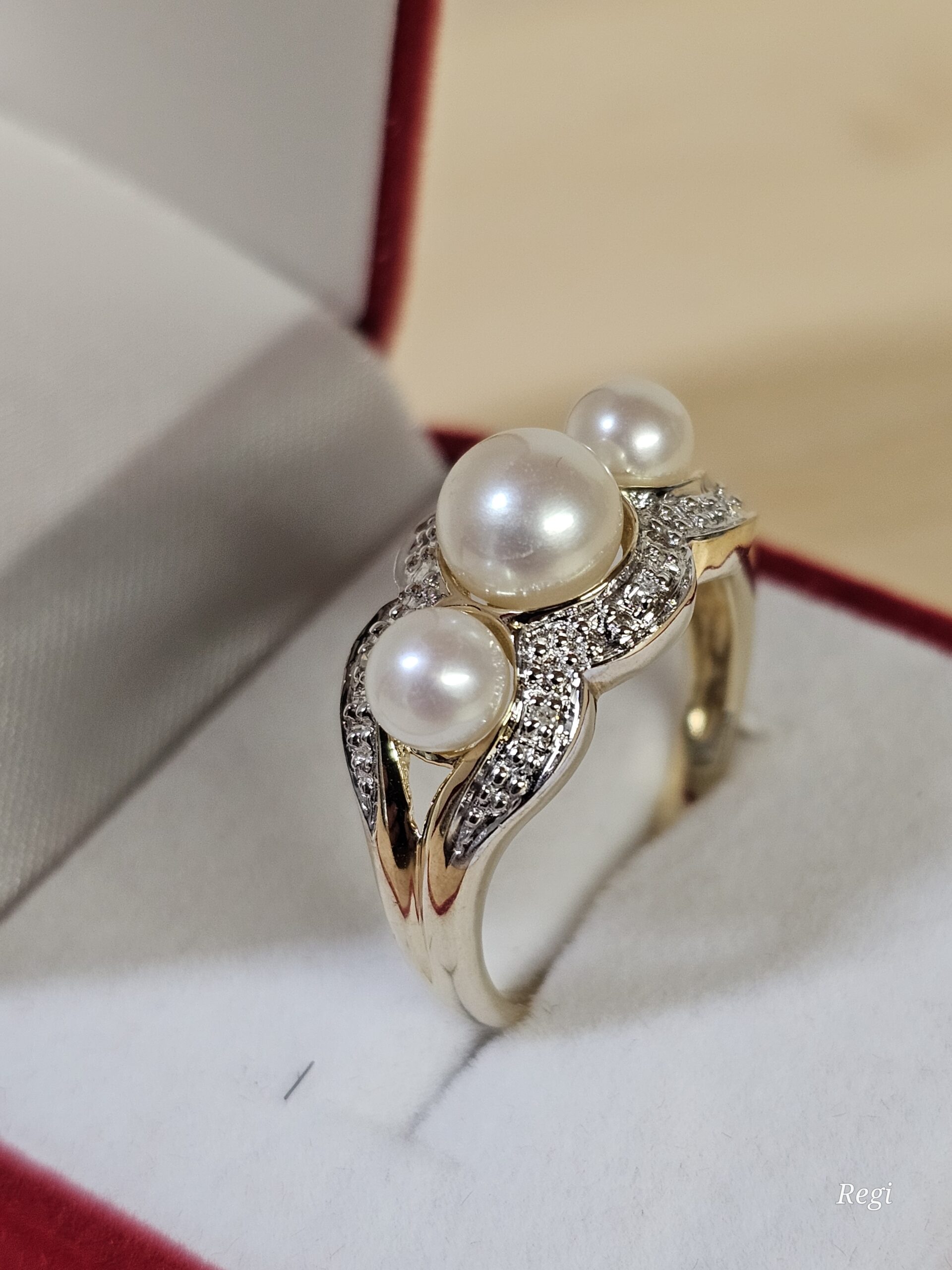 Edler Vintage-Ring aus Gold 333. Besetzt ist das schöne Stück mit 3 Stck. weiße Perlen und 6 Stck. kleinste Diamantsteinchen auf einem platinierten Untergrund.