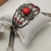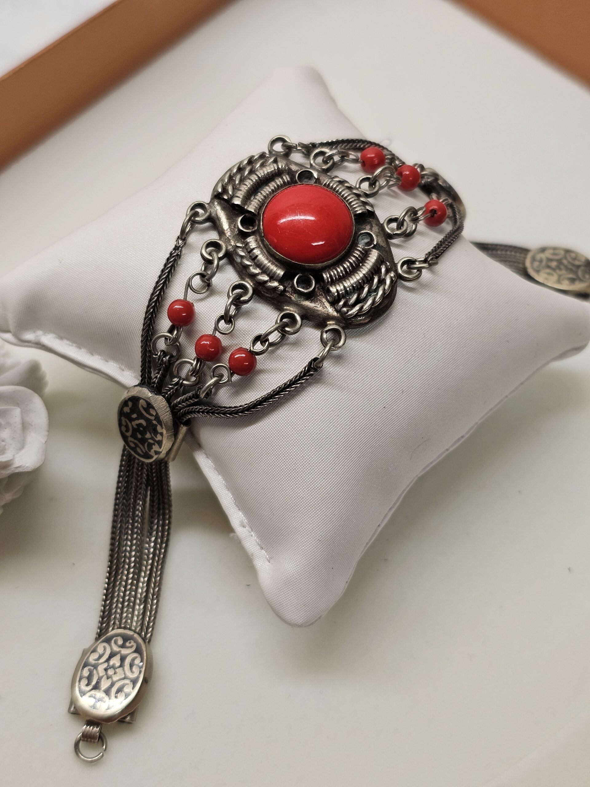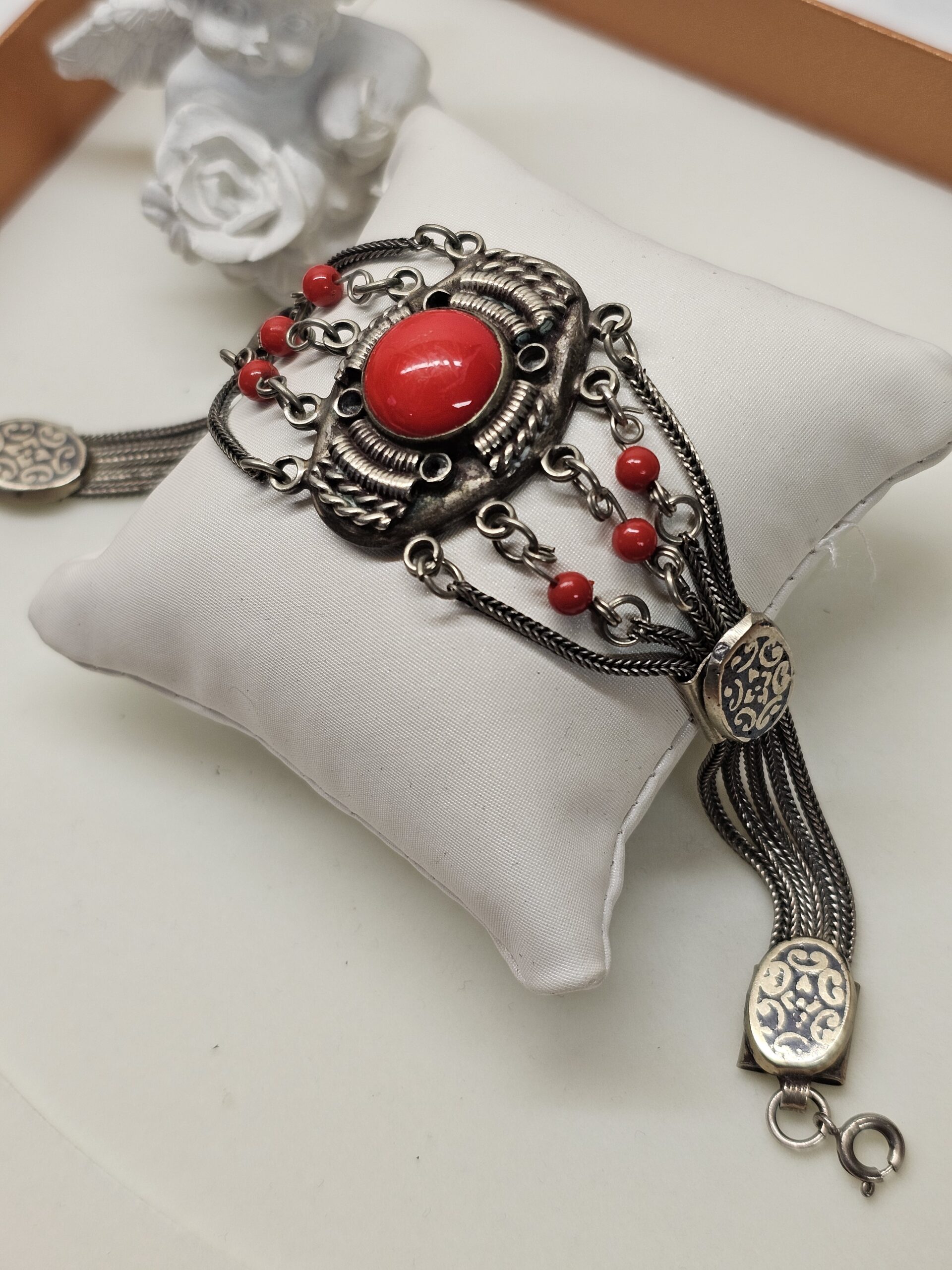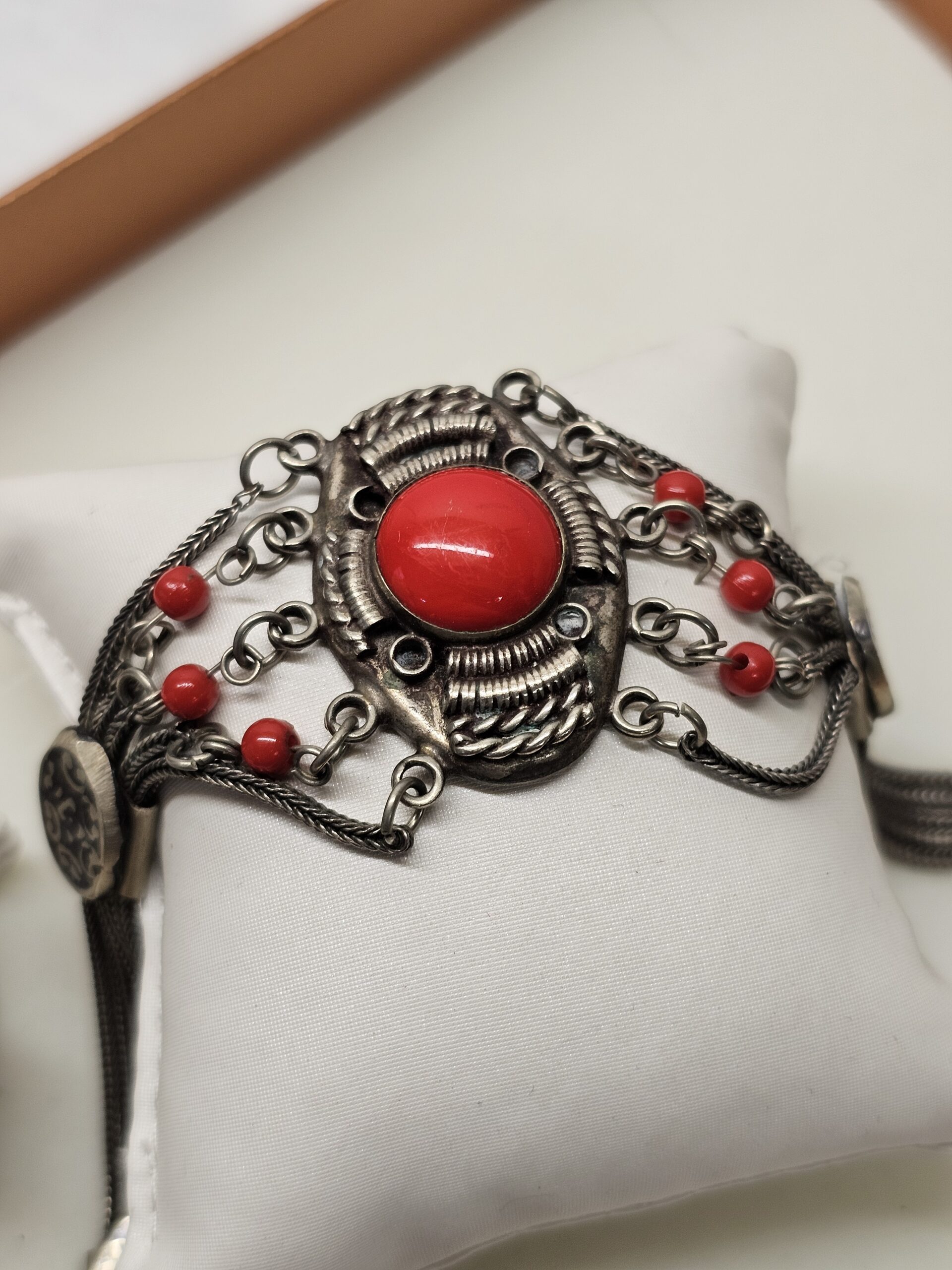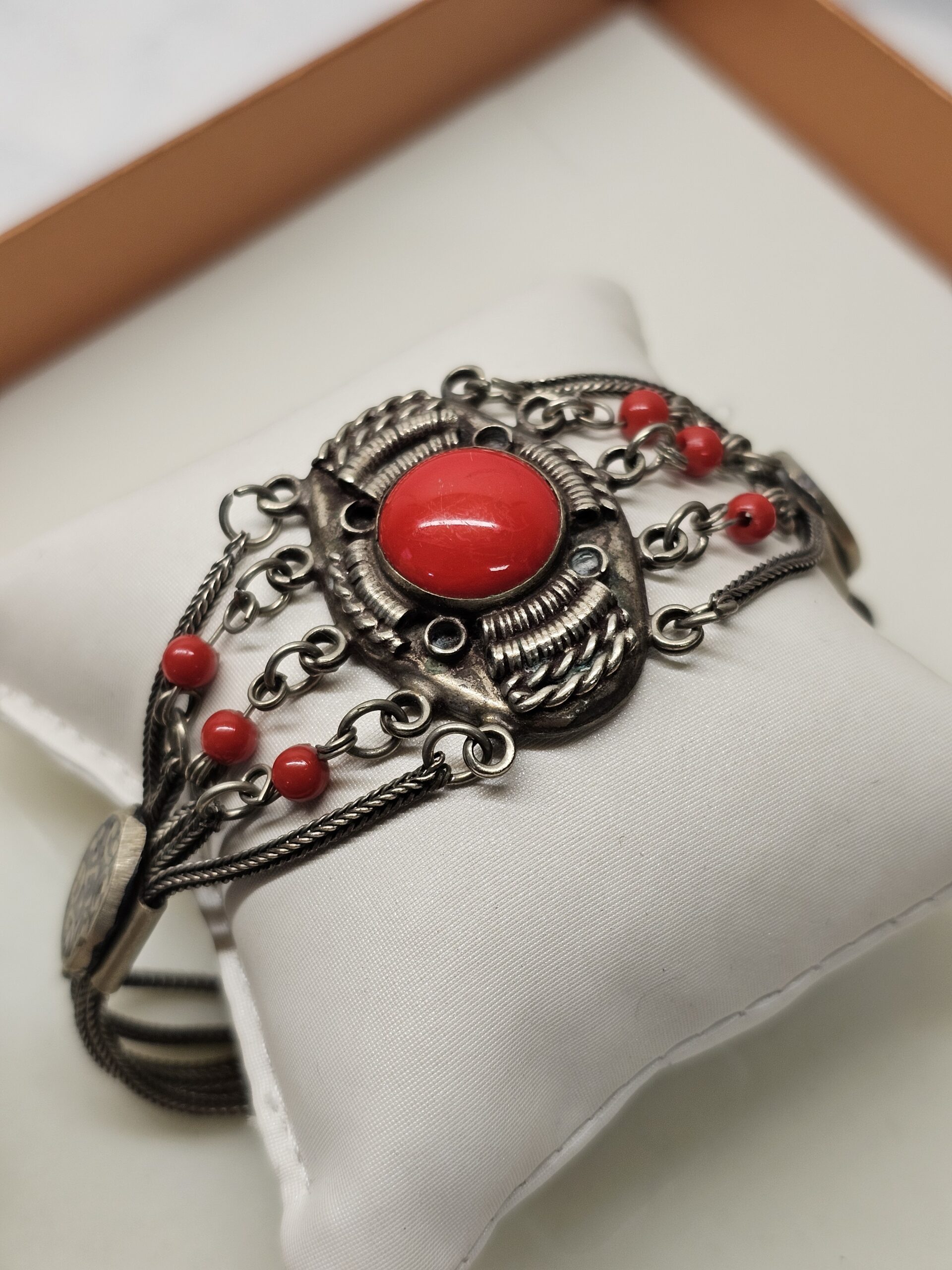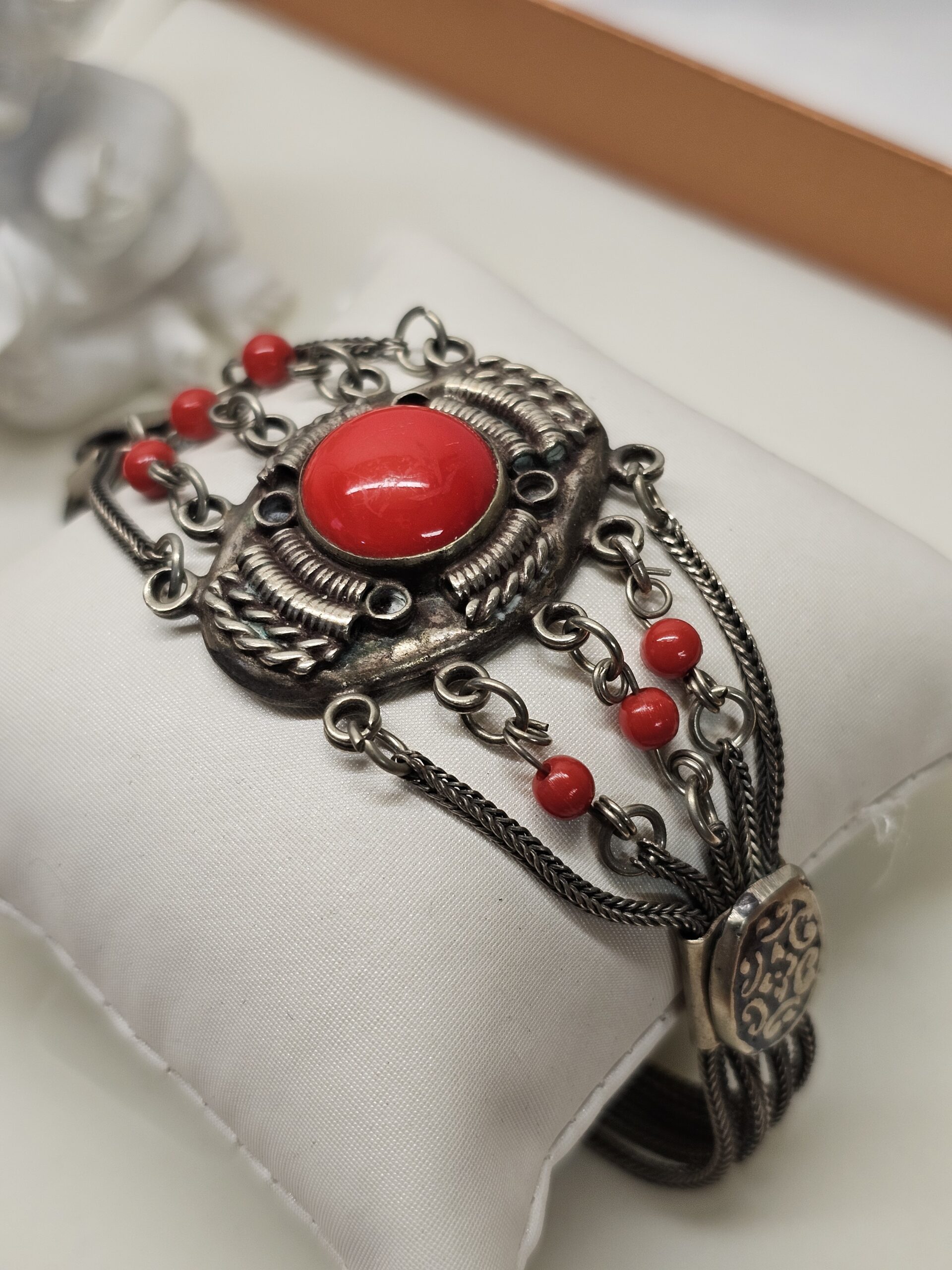 Ein schönes Armband / Gliederarmband aus Silber 800 gefertigt. Mittig ist das Armband aufwendig gestaltet und es ist mit einem schönen roten Stein geschmückt. Die 5er Reihe Schlangenketten sind mit Zwischenelemente verziert mit Niello Emaille abgesetzt und laufen zum Mittelstück hin zusammen, 3 Stück der Kettchen sind mit roten Perlen verziert.