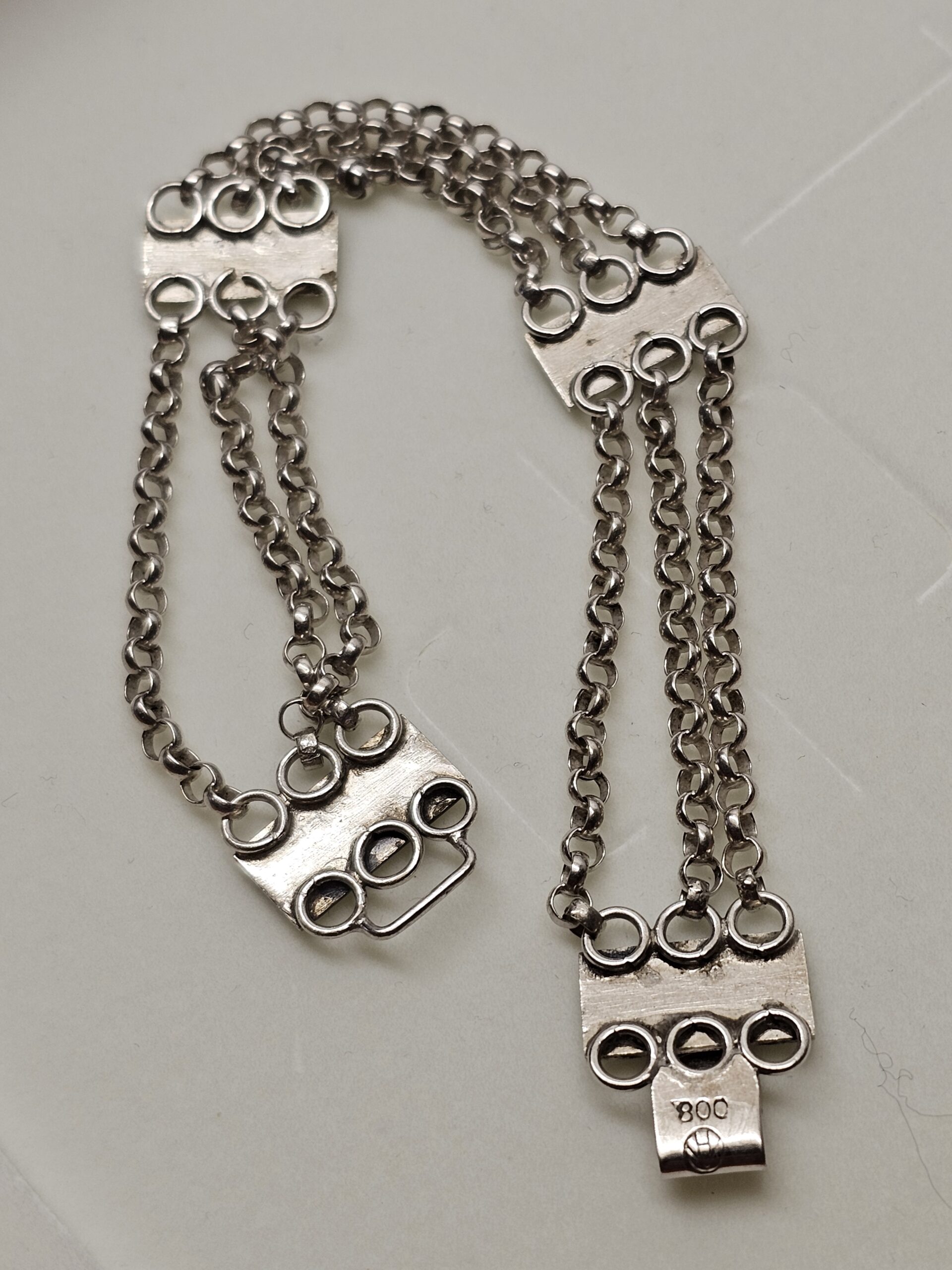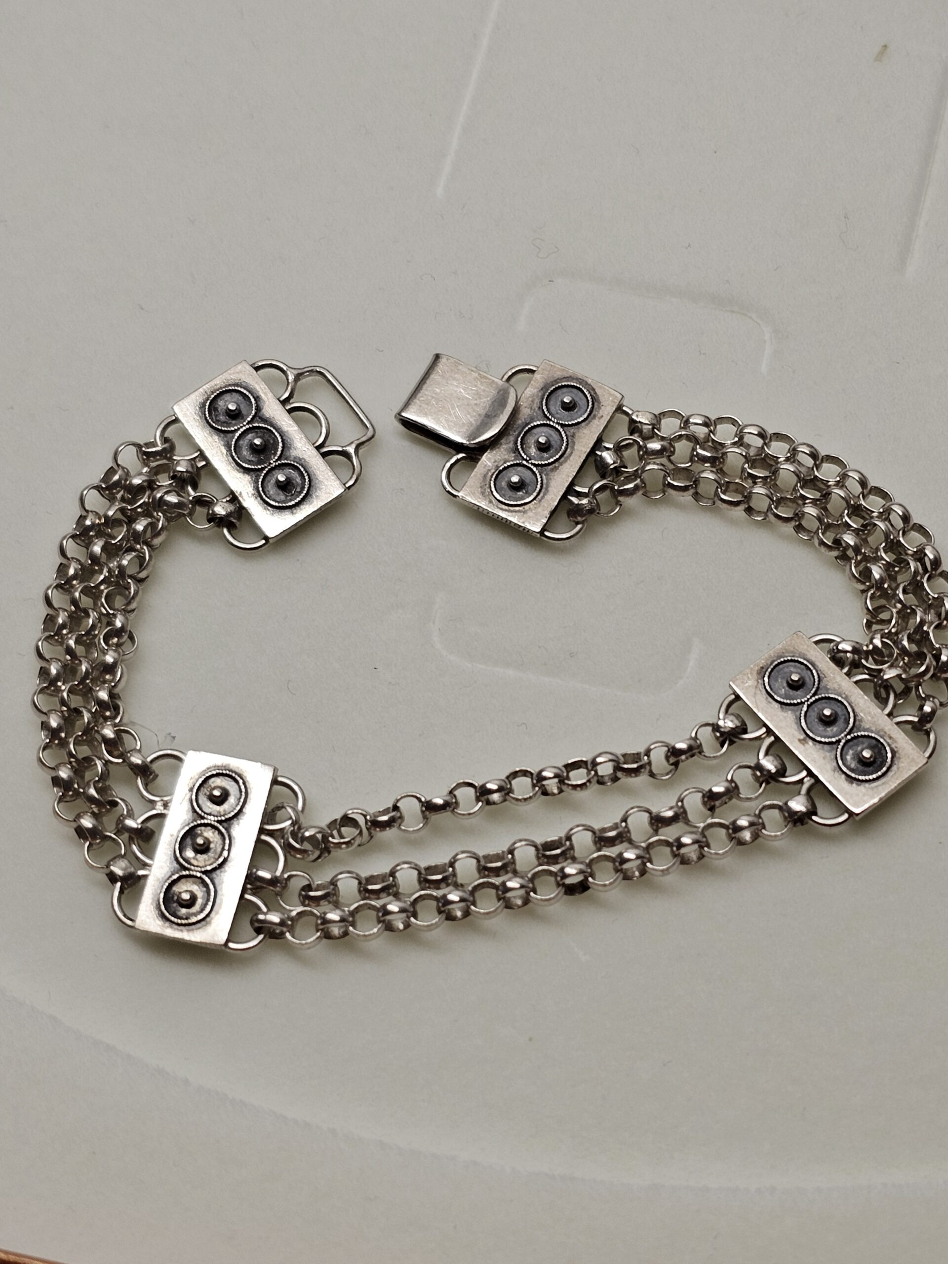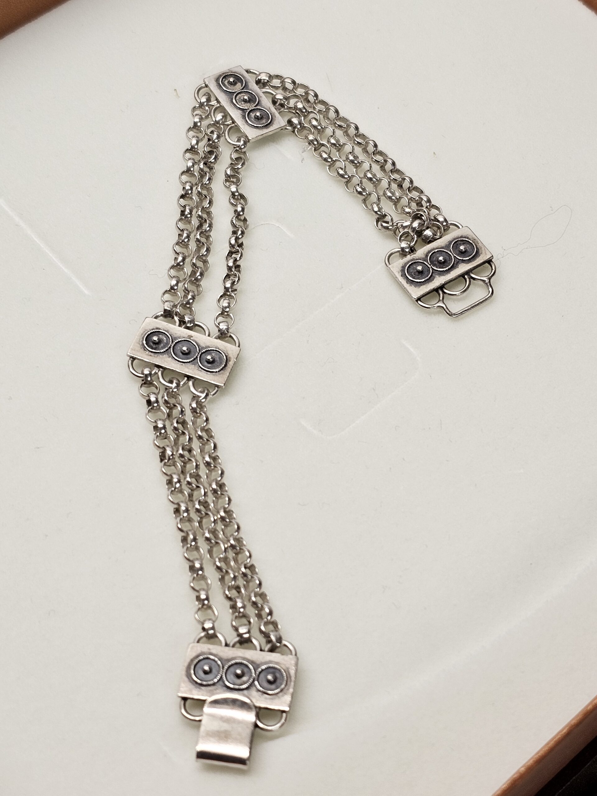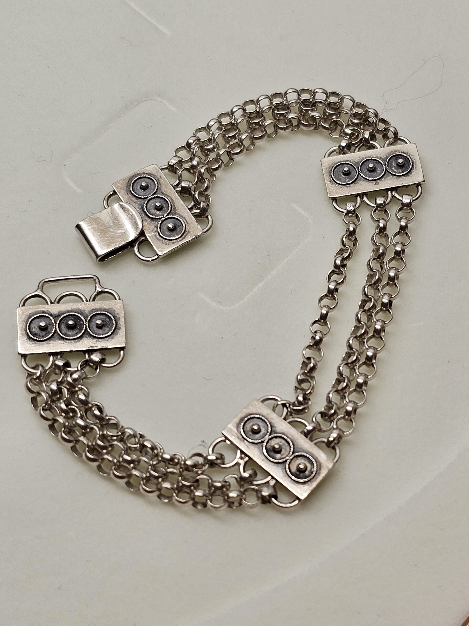 Nostalgisches Armband / Gliederarmband Modernist Silber 800. 3er Kette im Erbskettendesign. Die Zwischenglieder sind mit einem tollen Design ausgearbeitet. Das Armband verfügt über einen Verschluss zum Einhaken.
