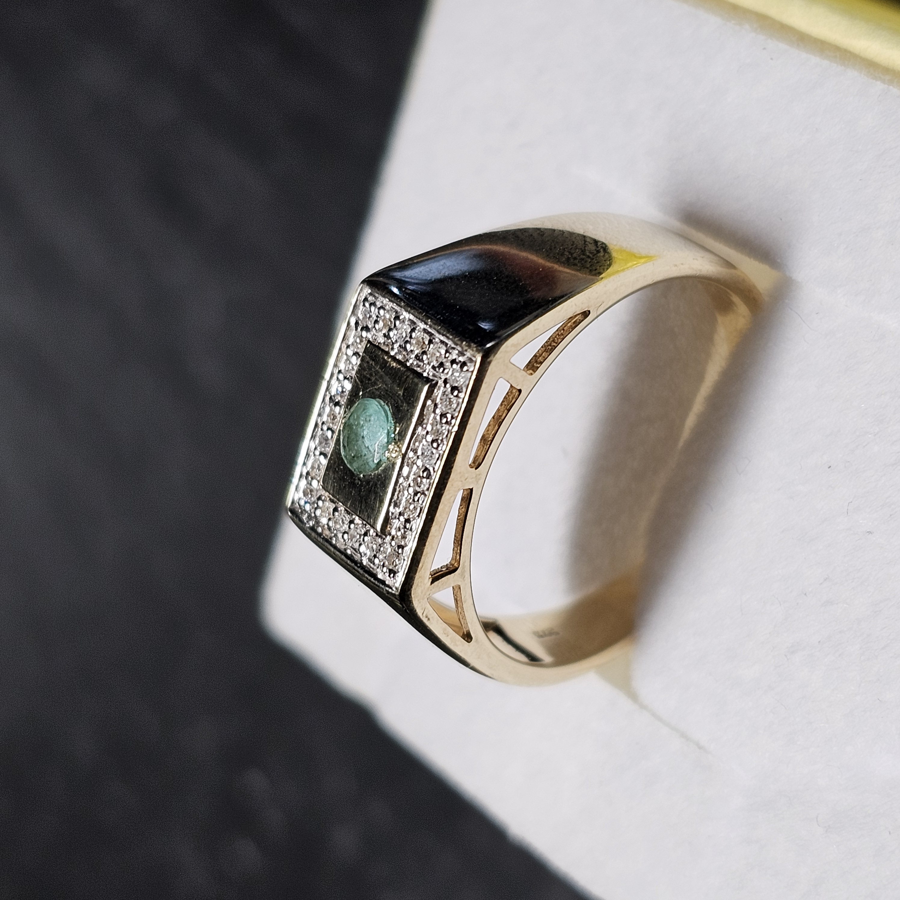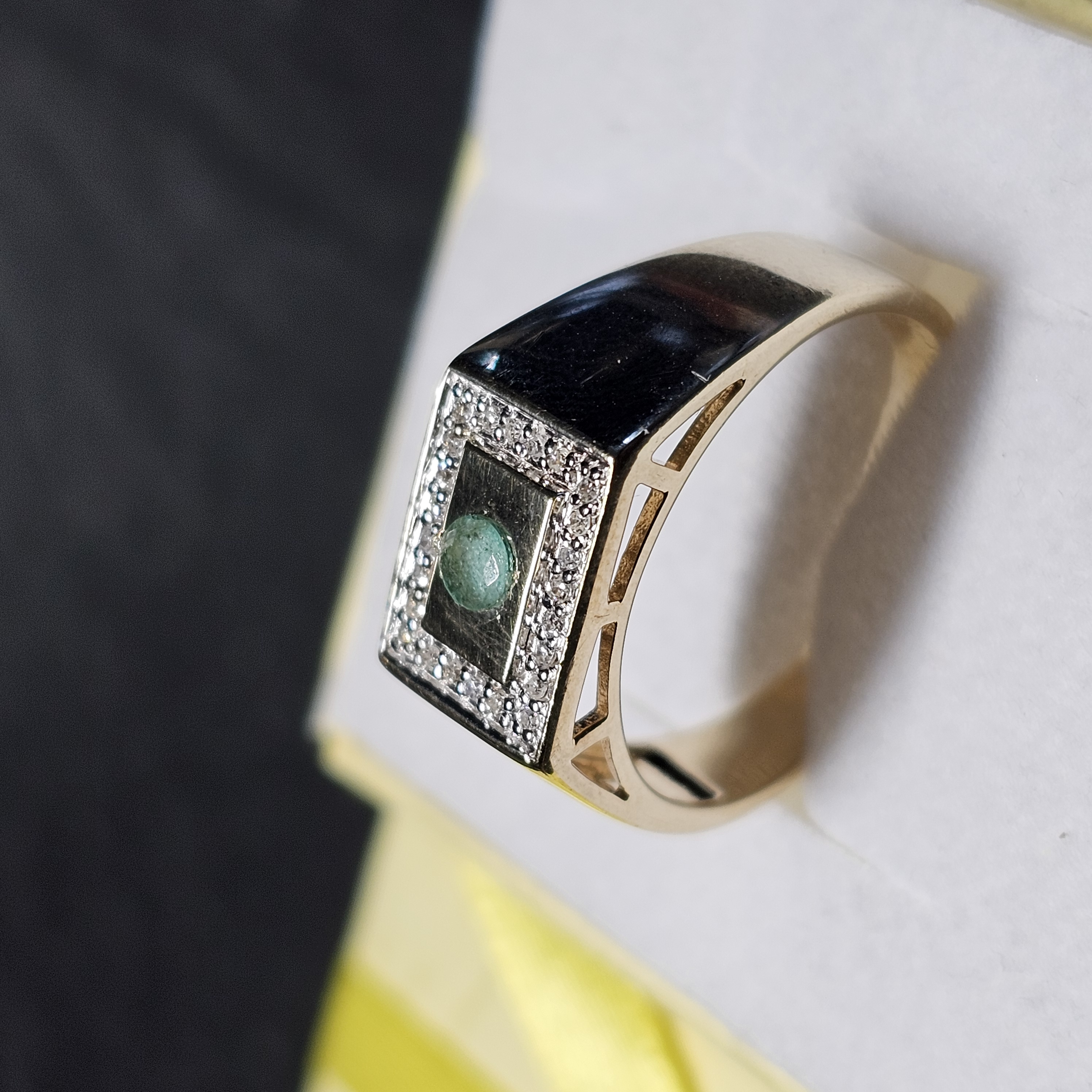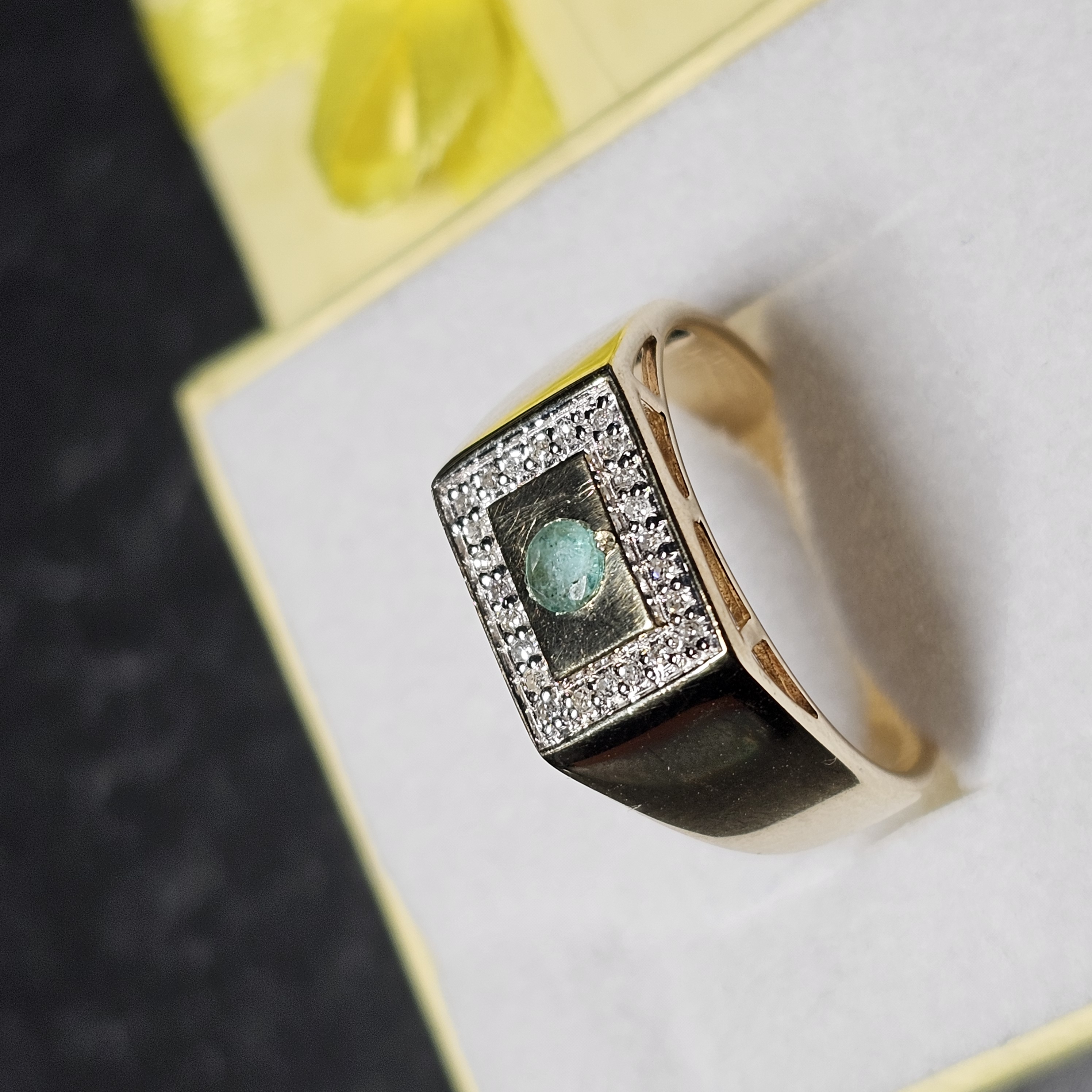 Toller Ring Gold 375, geschmückt mittig mit einem wunderschönen Smaragd-Steinchen. Rundherum sind auf platinierter Oberfläche kleinste Diamantsteinchen angebracht.