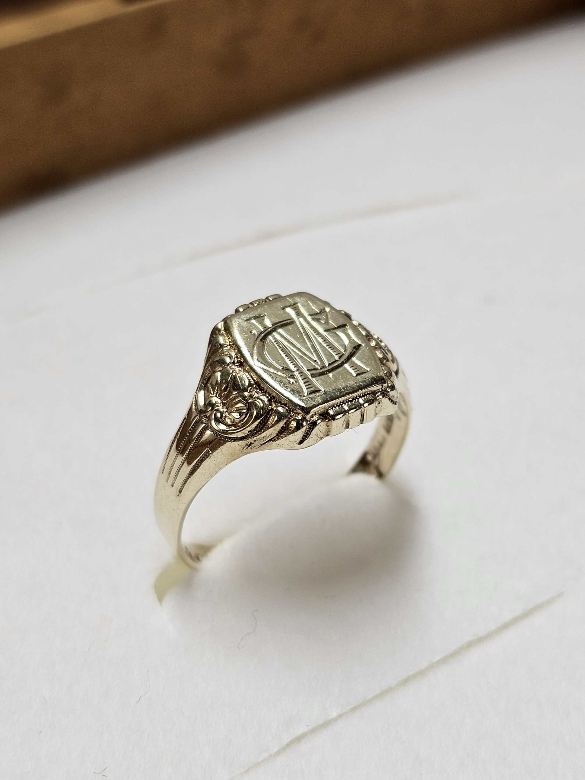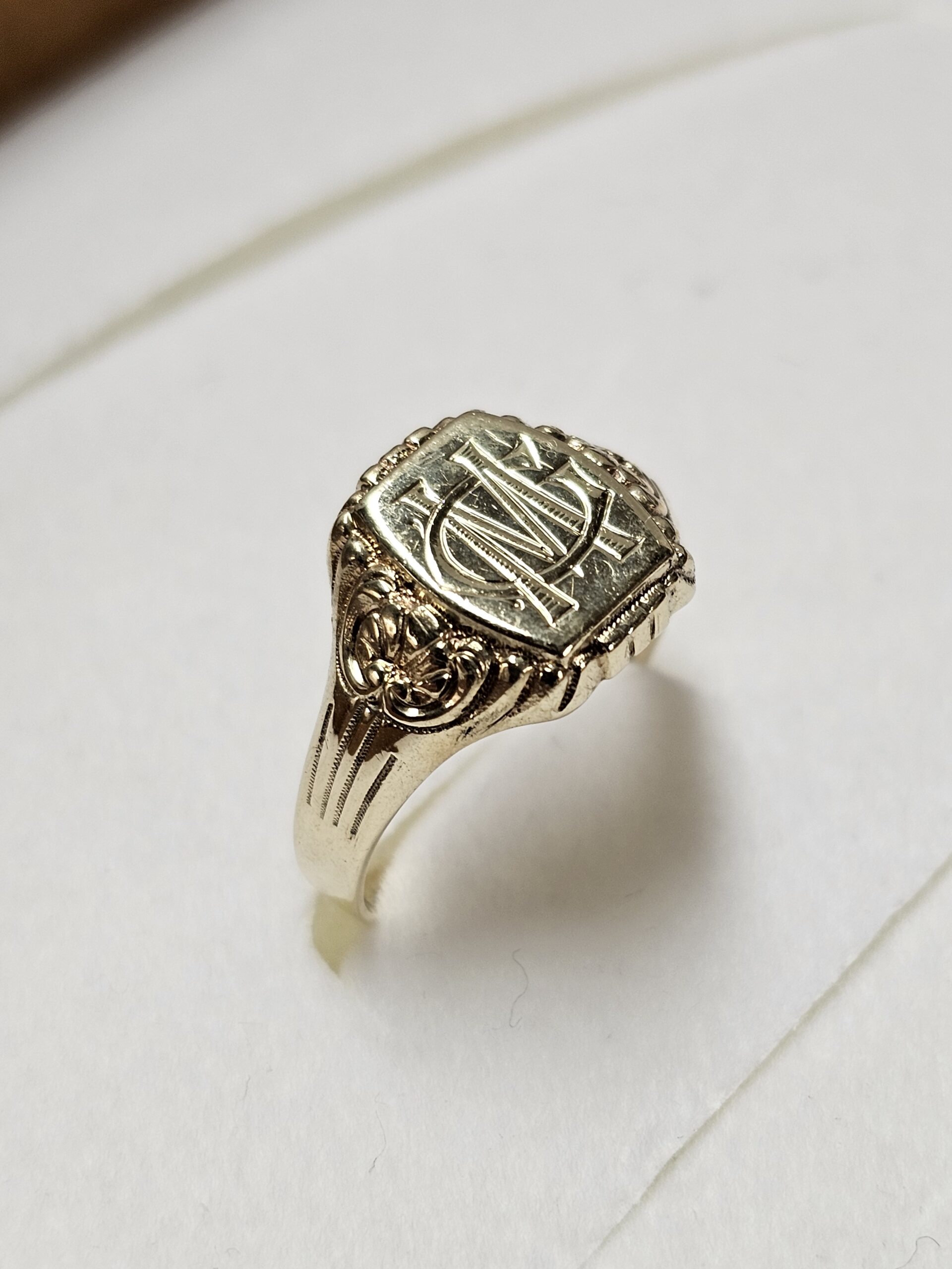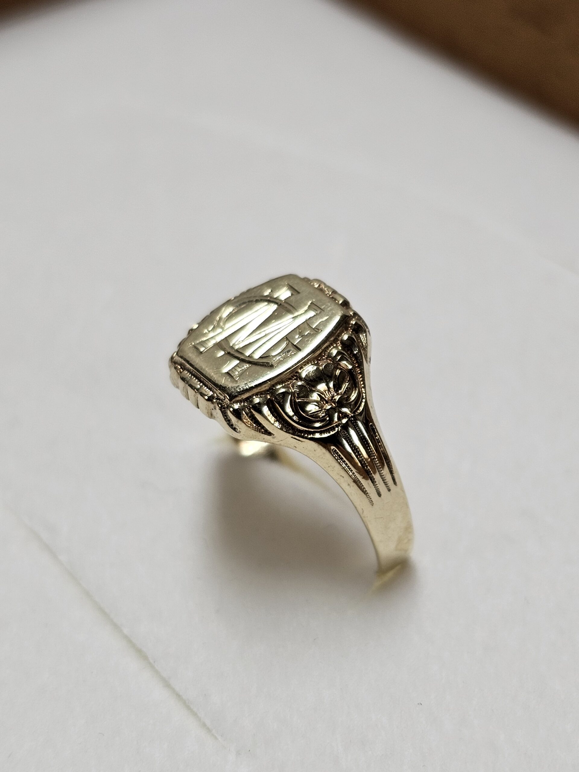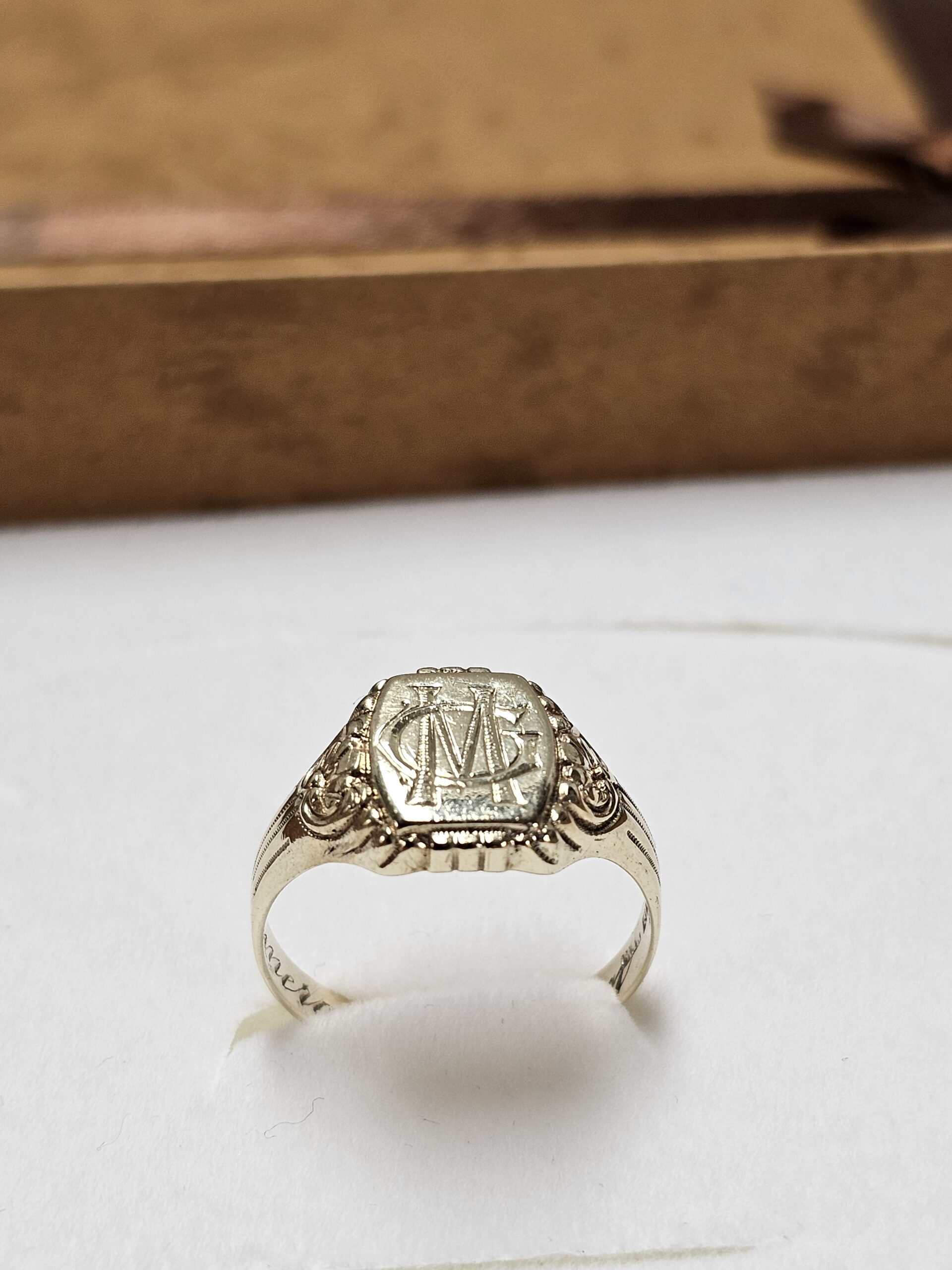 Schöner eleganter Siegelring Gold 375 mit den Buchstaben / Initialen „MG“ auf der Ringplatte. In der Ringschiene ist die Widmung „Männerchor Riehen 1912 -1932“ graviert.
