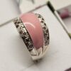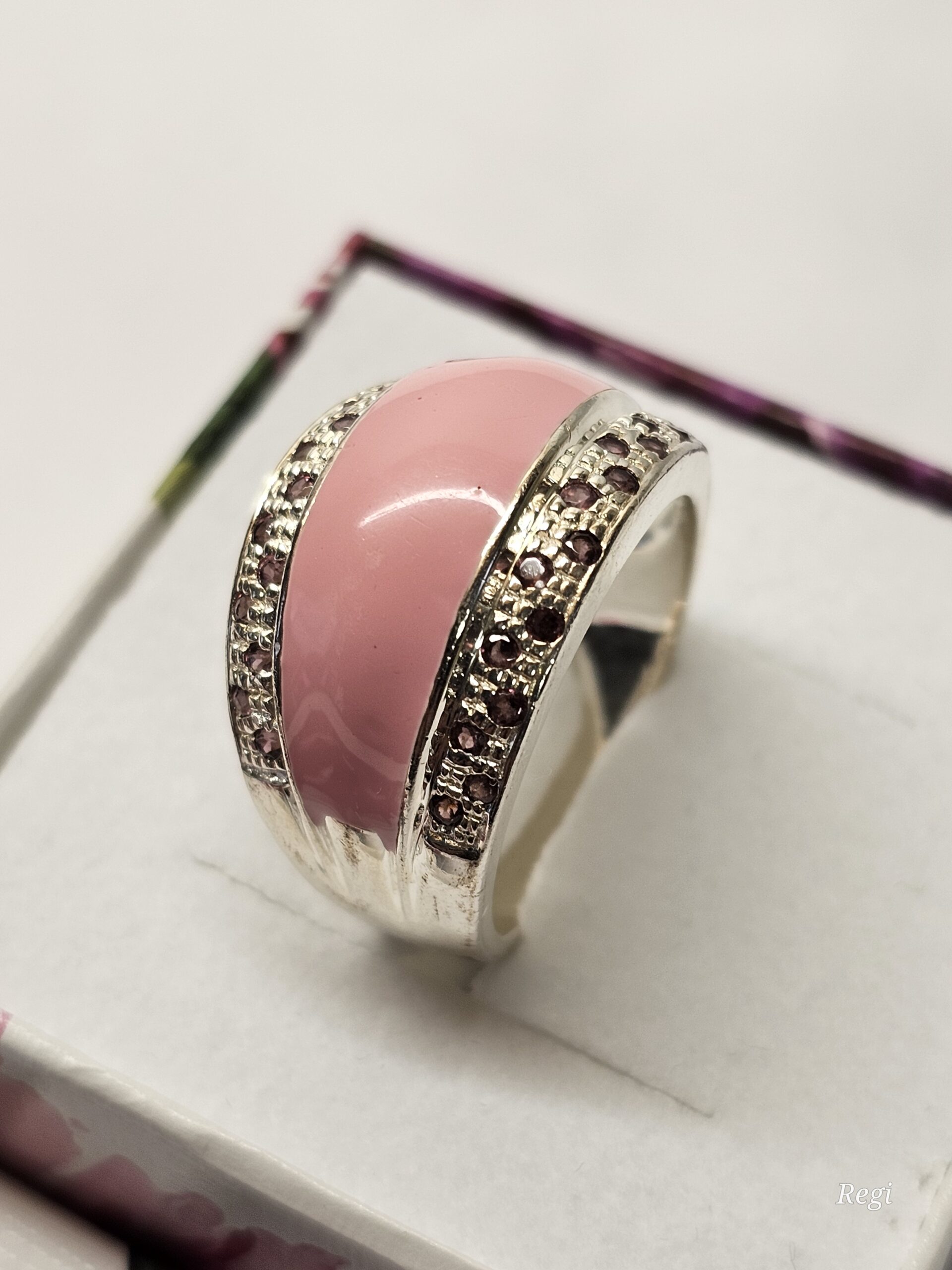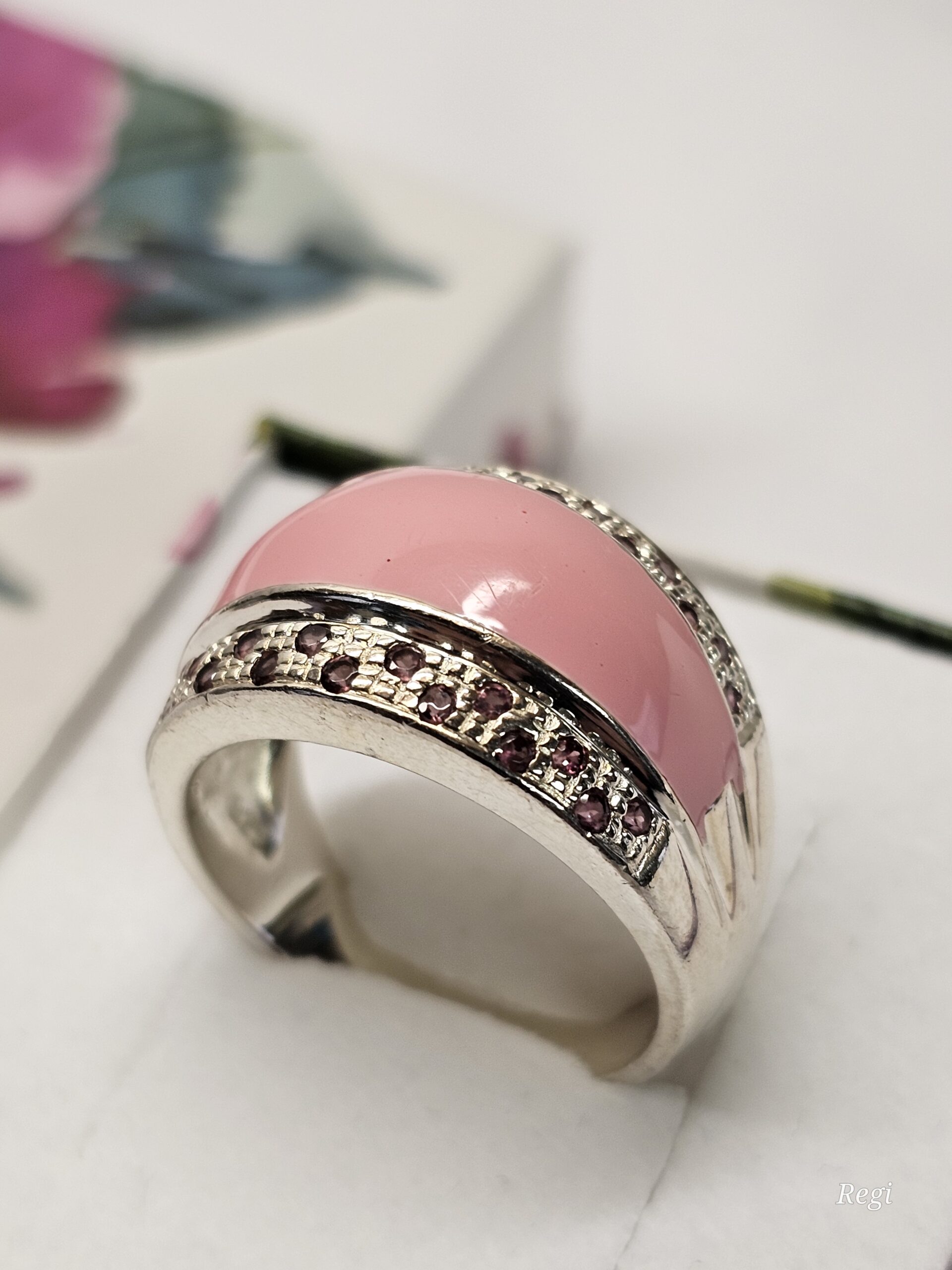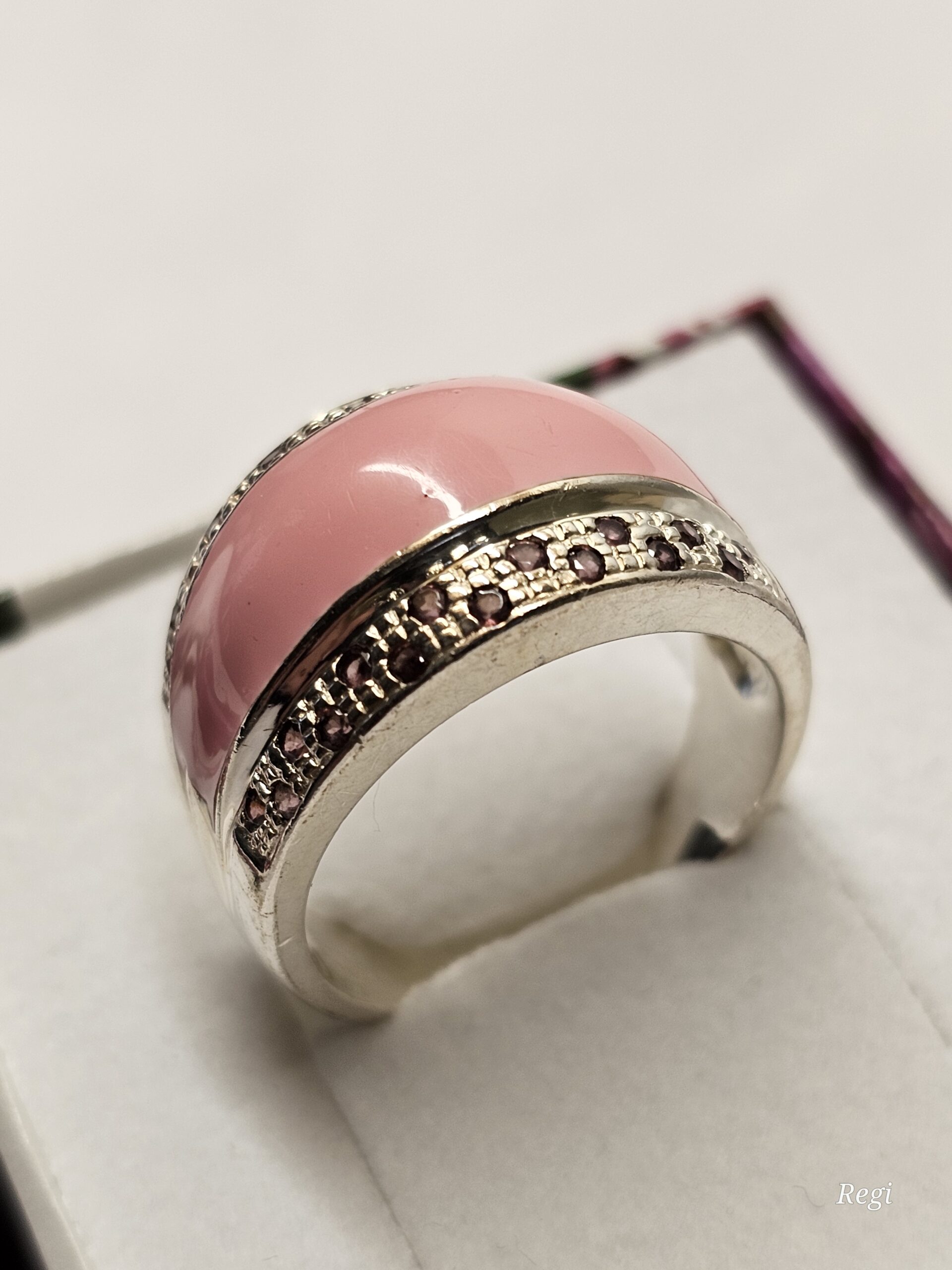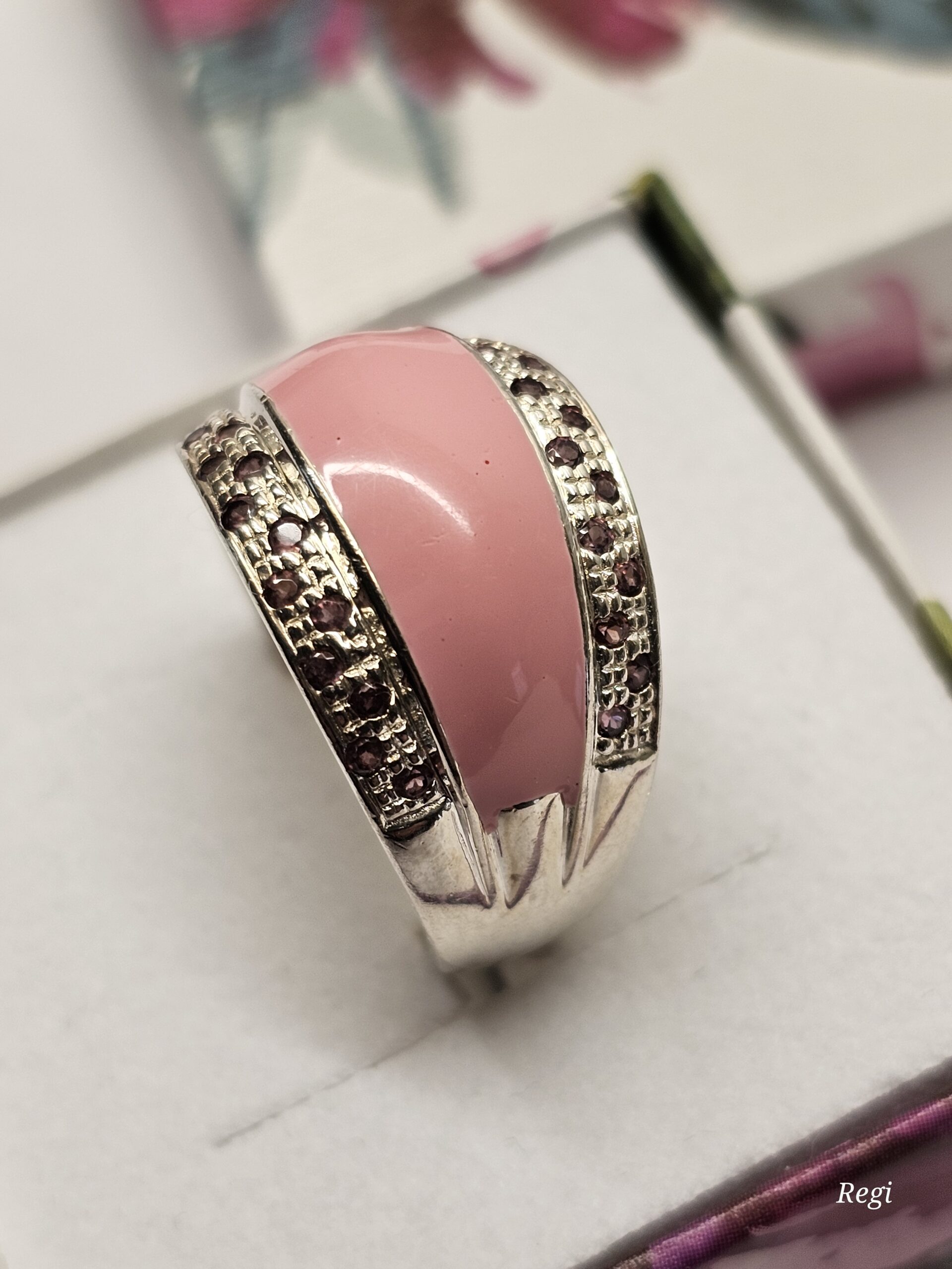 Eleganter Ring aus Silber 925. Toll gestalteter Ringkopf mit Emaille-Einlage im Farbton helles Rosa, das Design am Rand ist mit rosa Kristallsteinchen geschmückt.