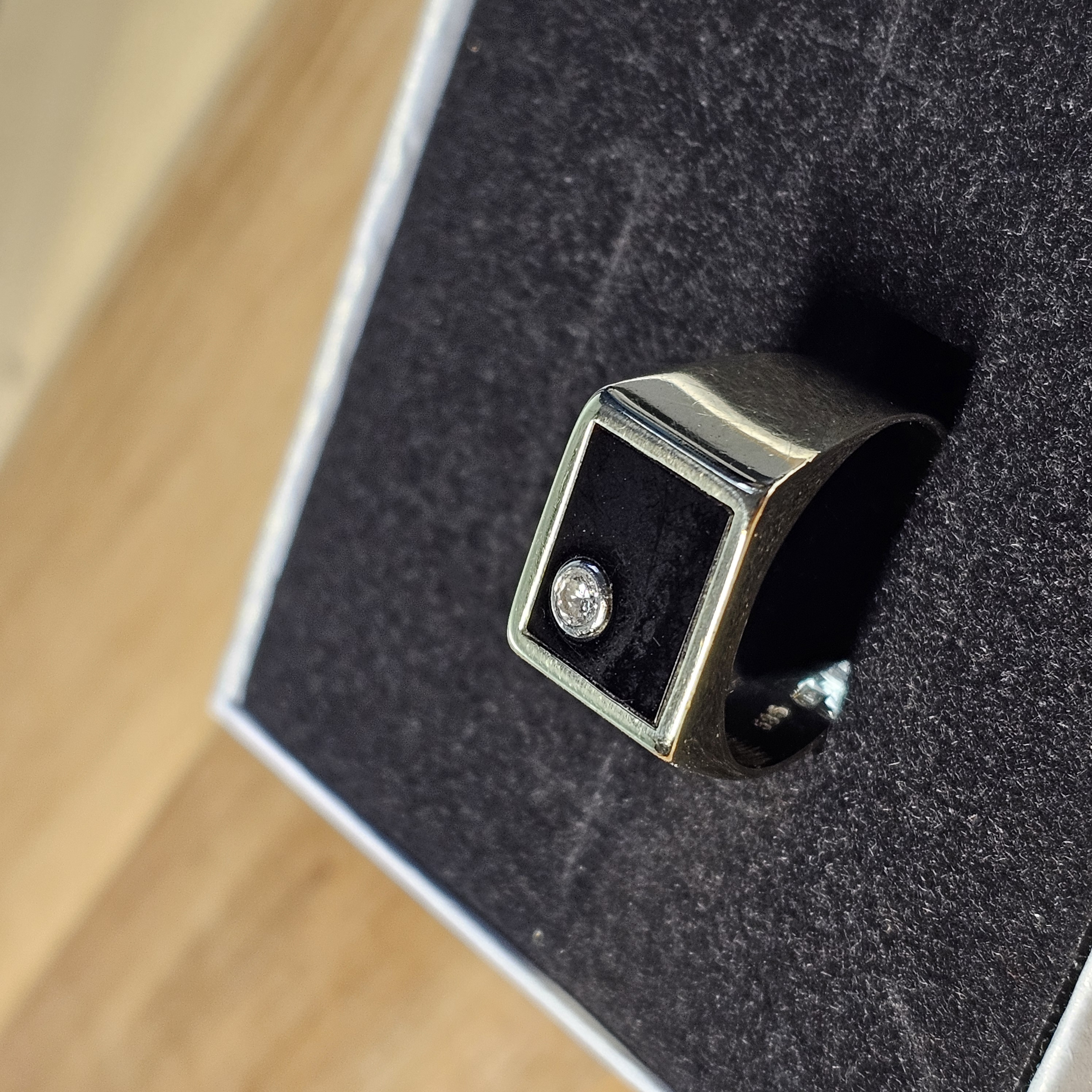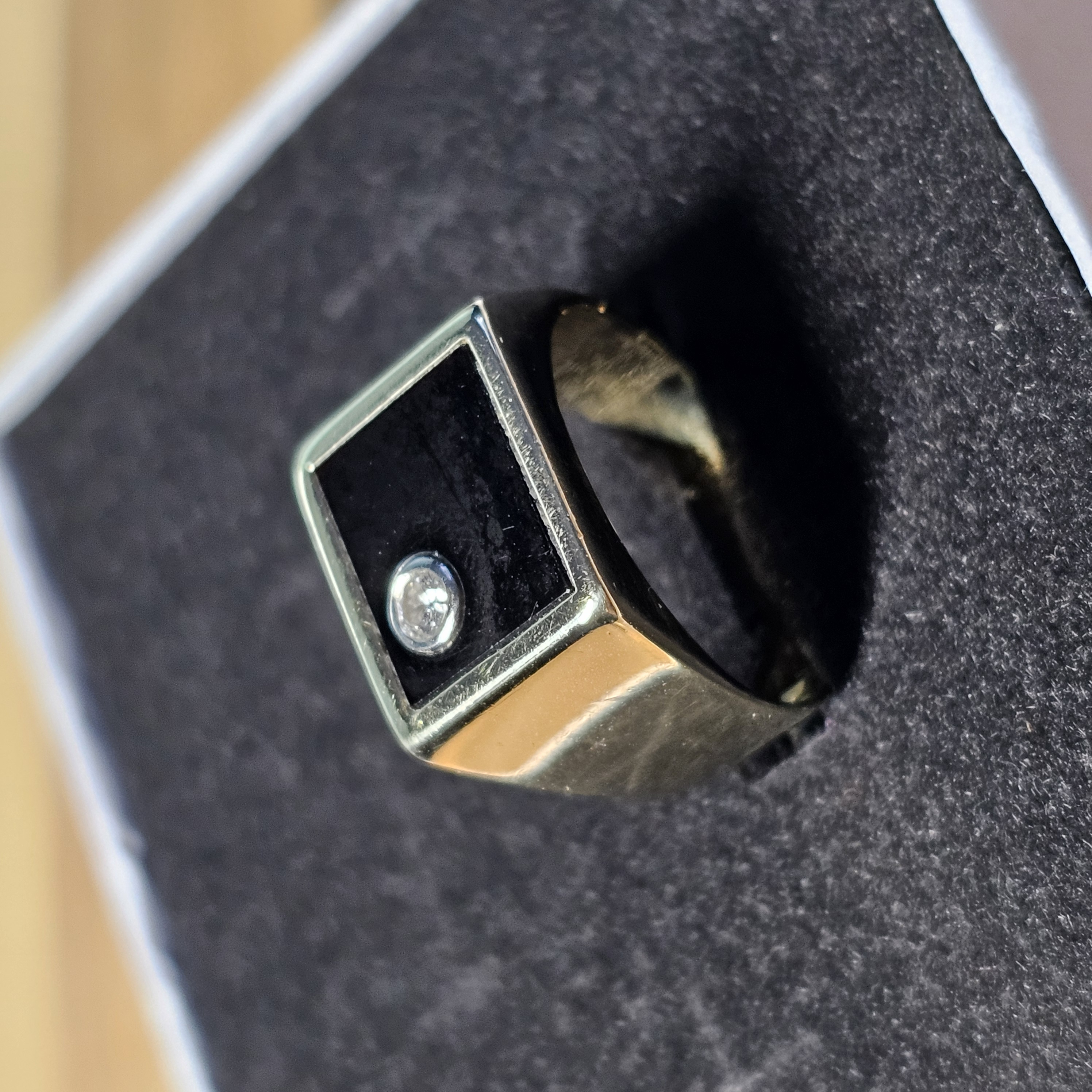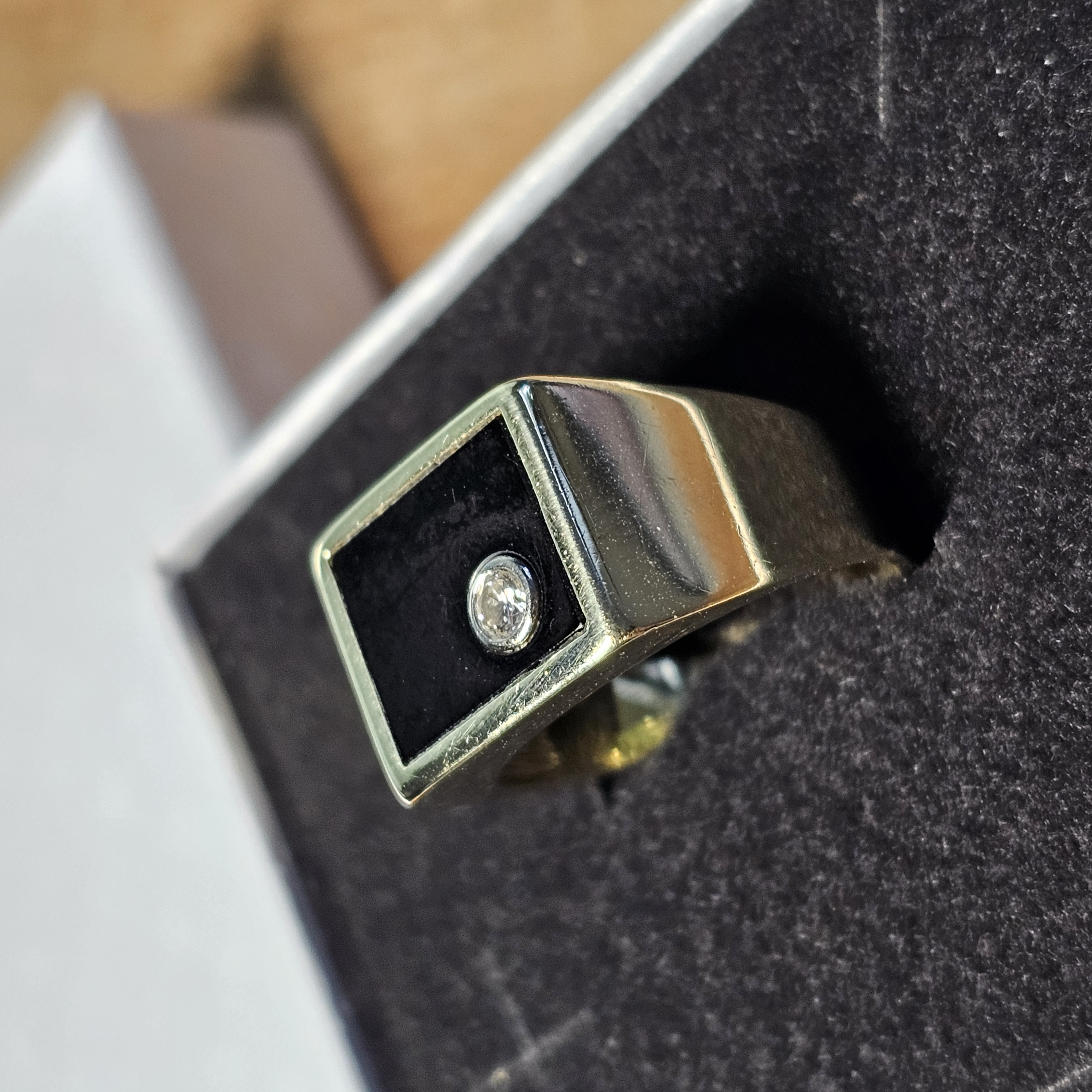 Eleganter Siegelring / Vintage Ring aus Gold 585 mit einer schwarzen Onyx-Platte. Besetzt ist die Ringplatte mit einem kleinen Diamantsteinchen.