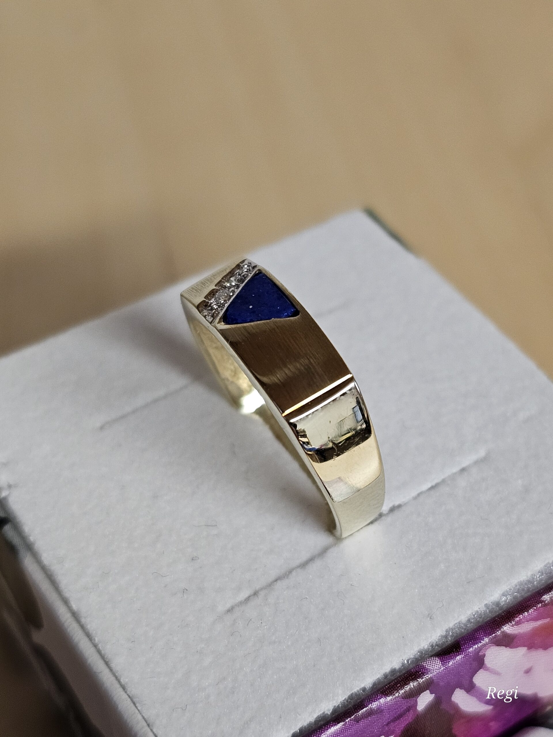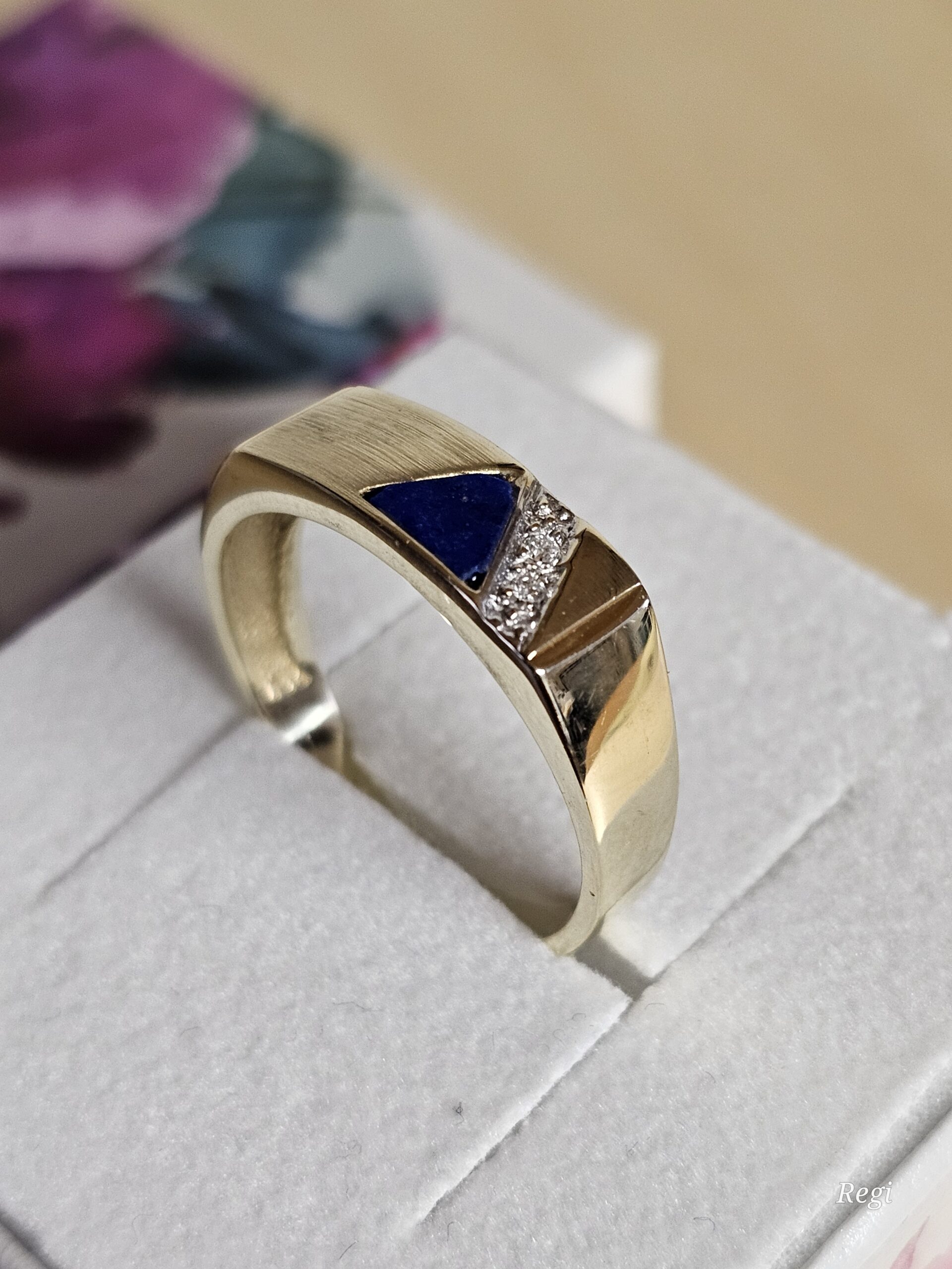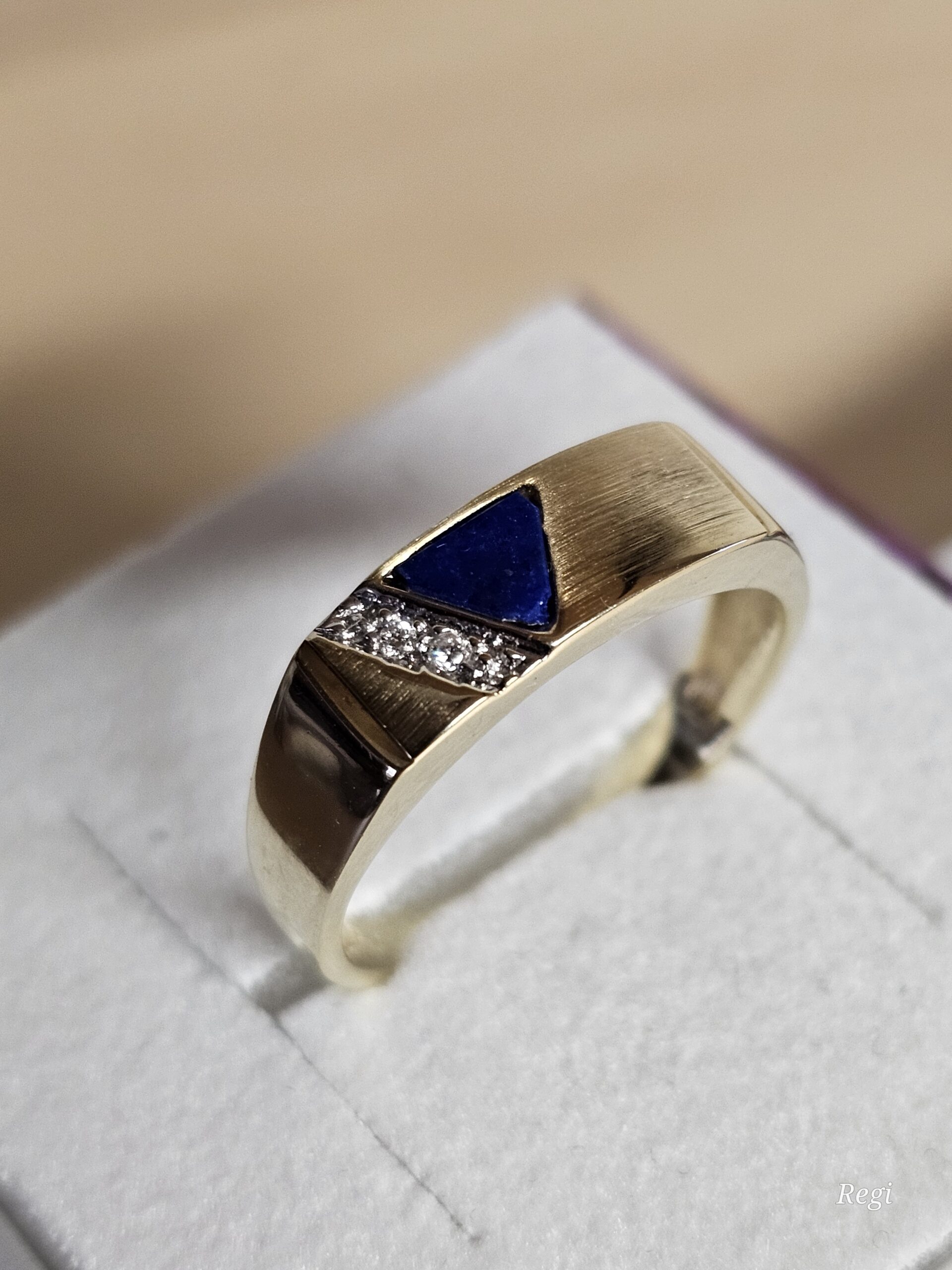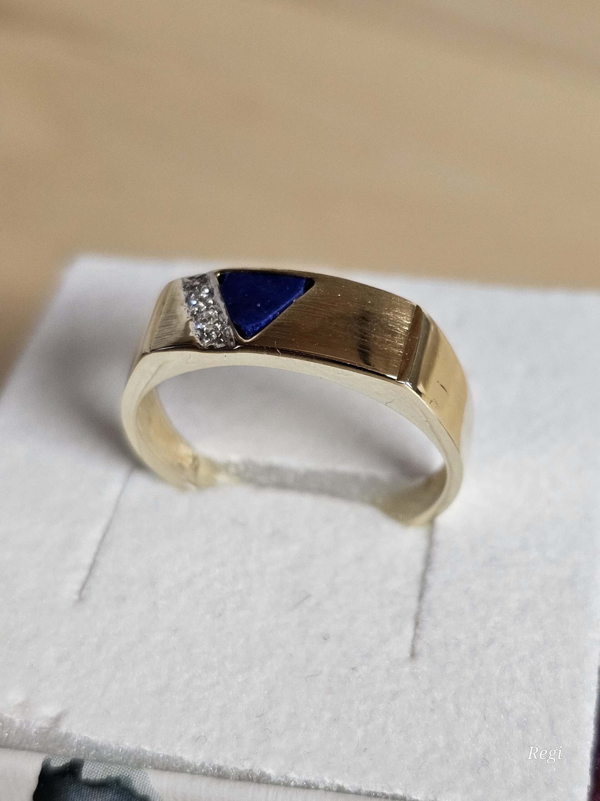 Nostalgischer Ring / Siegelring aus Gold 585 mit einem Lapislazuli Lagenstein als Dreieck natürlich mit Ecken und Kanten besetzt. Auf teilplatiniertem Untergrund sitzen zwei kleine Diamantsteinchen.