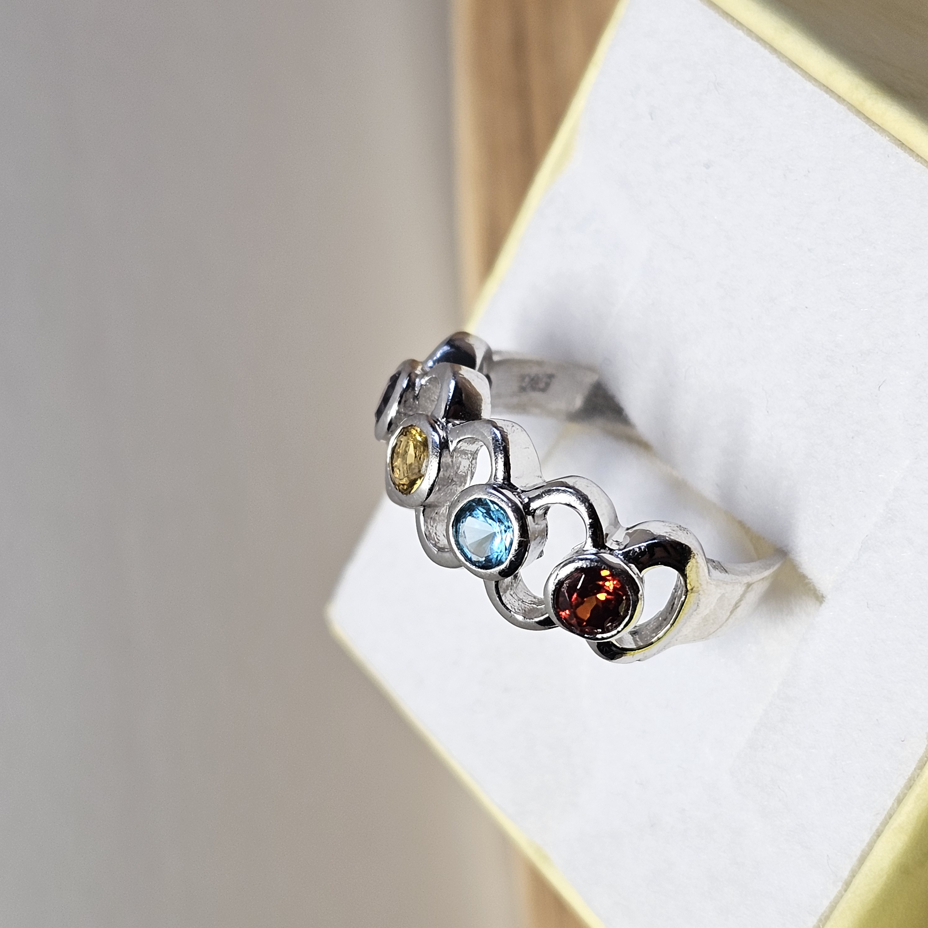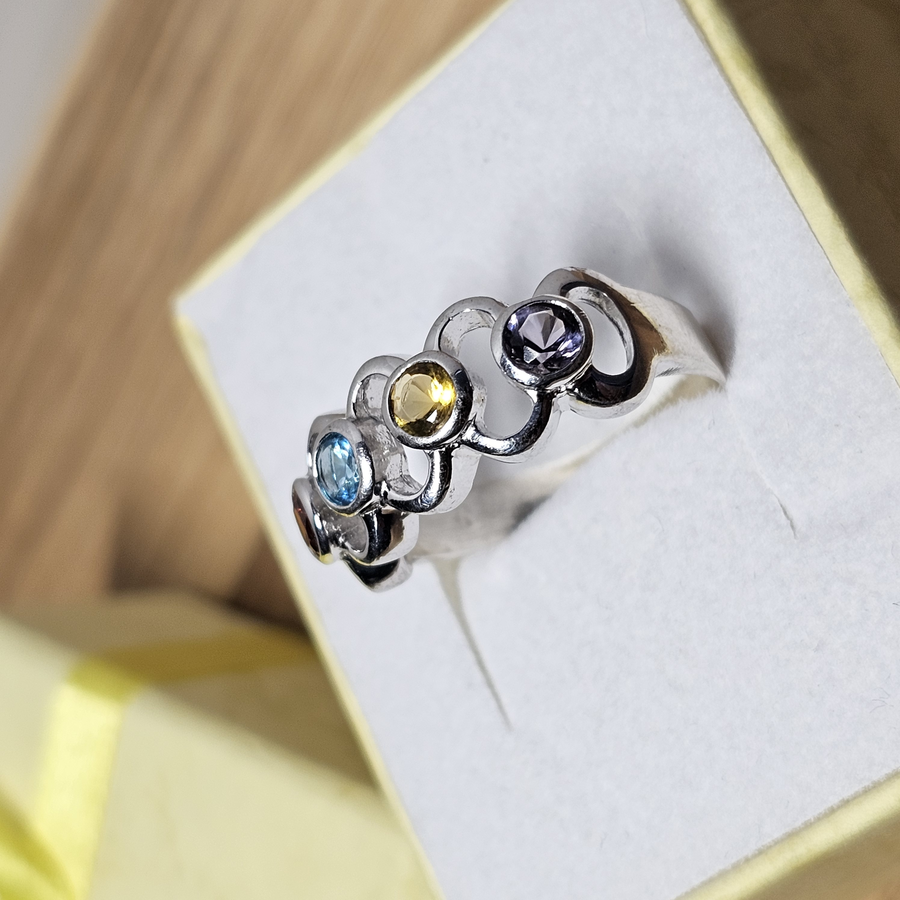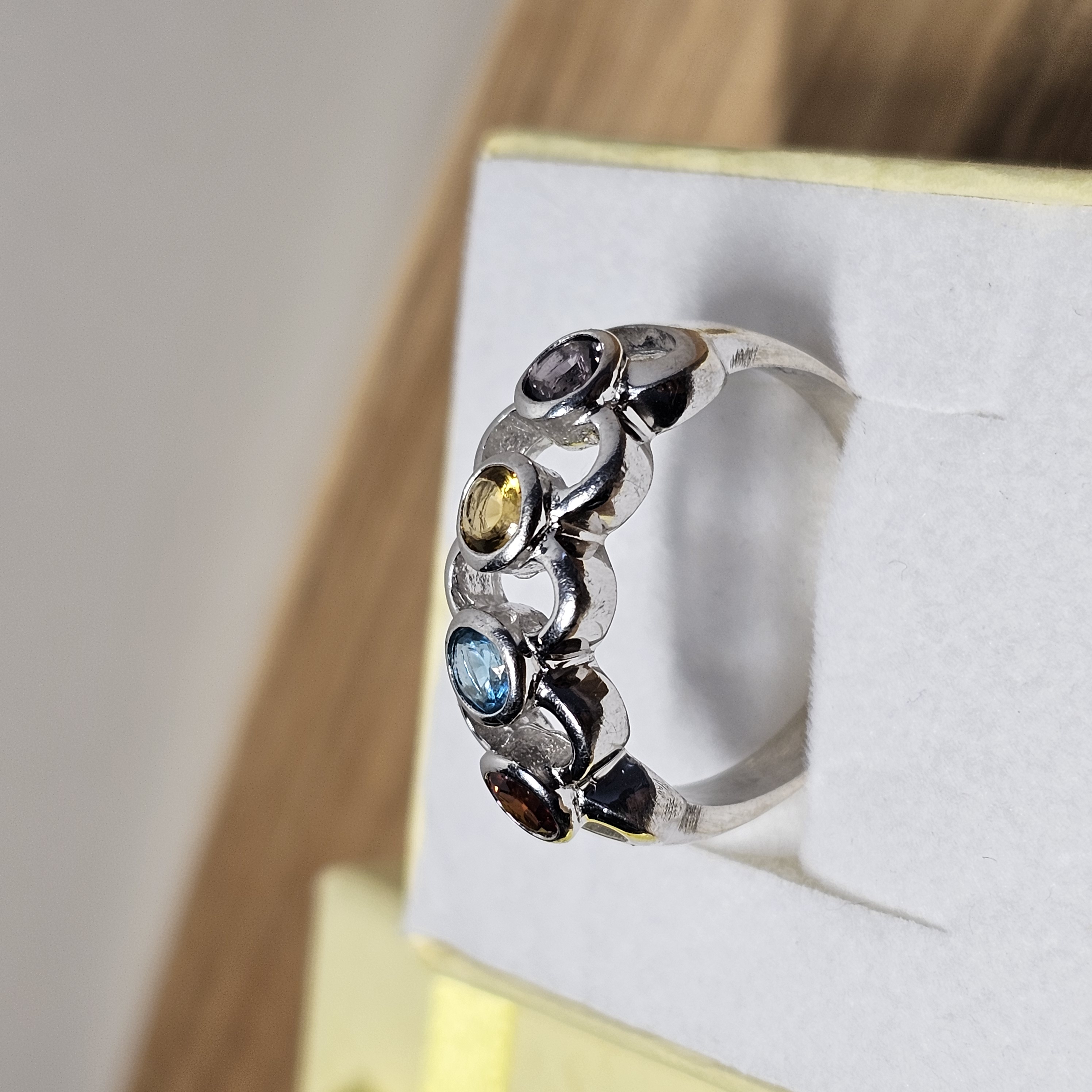 Ein schöner Silberring Silber 925, besetzt mit je einem Kristallsteinchen in den Farben Lila, Gelb, Hellblau, dunkles Orange. Ein wunderschönes Schmuckstück! Tolles Design!