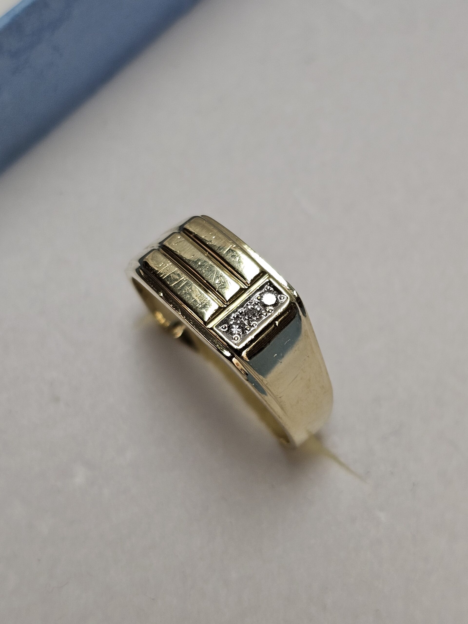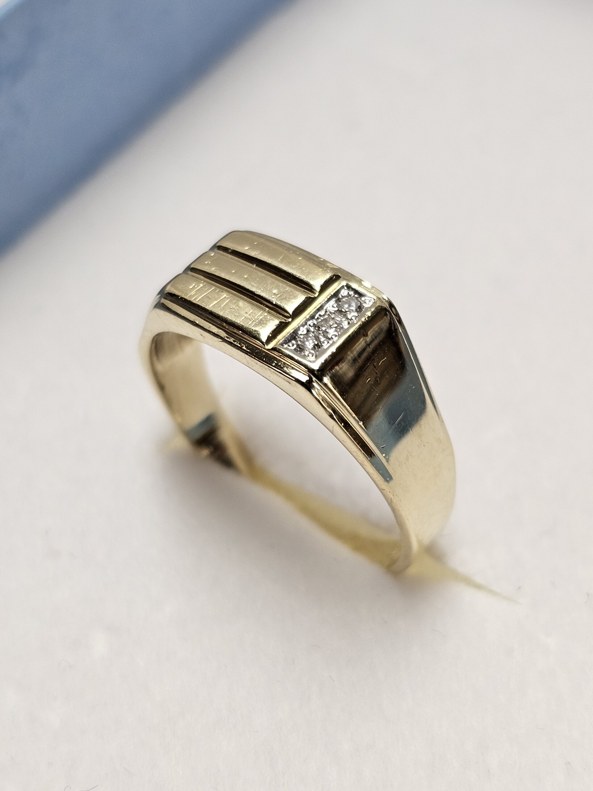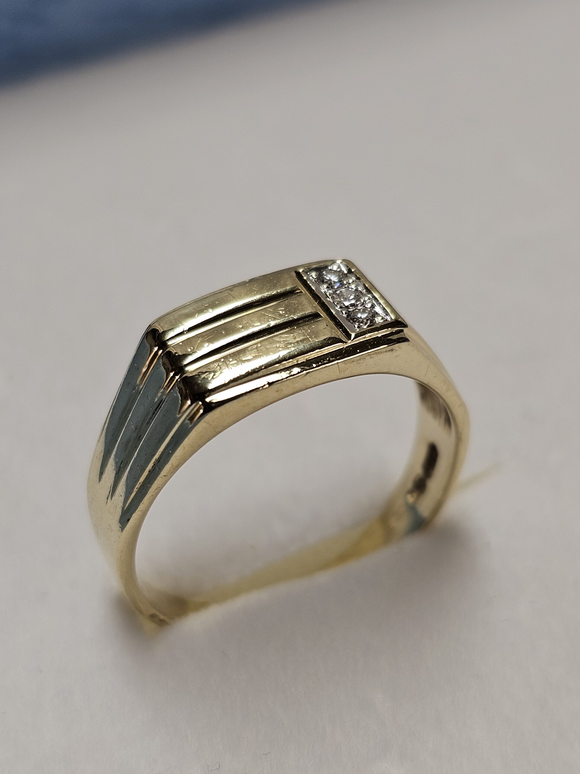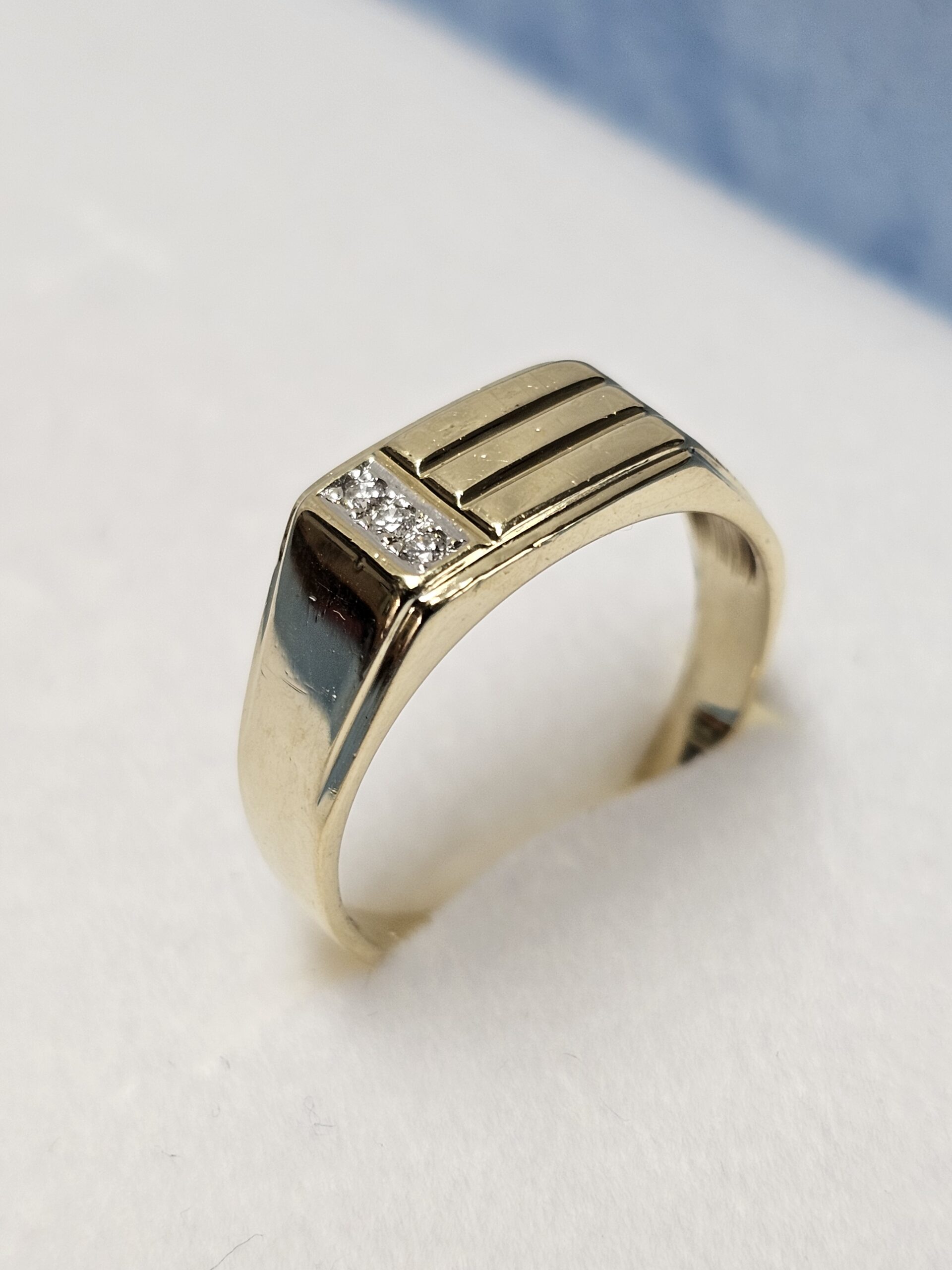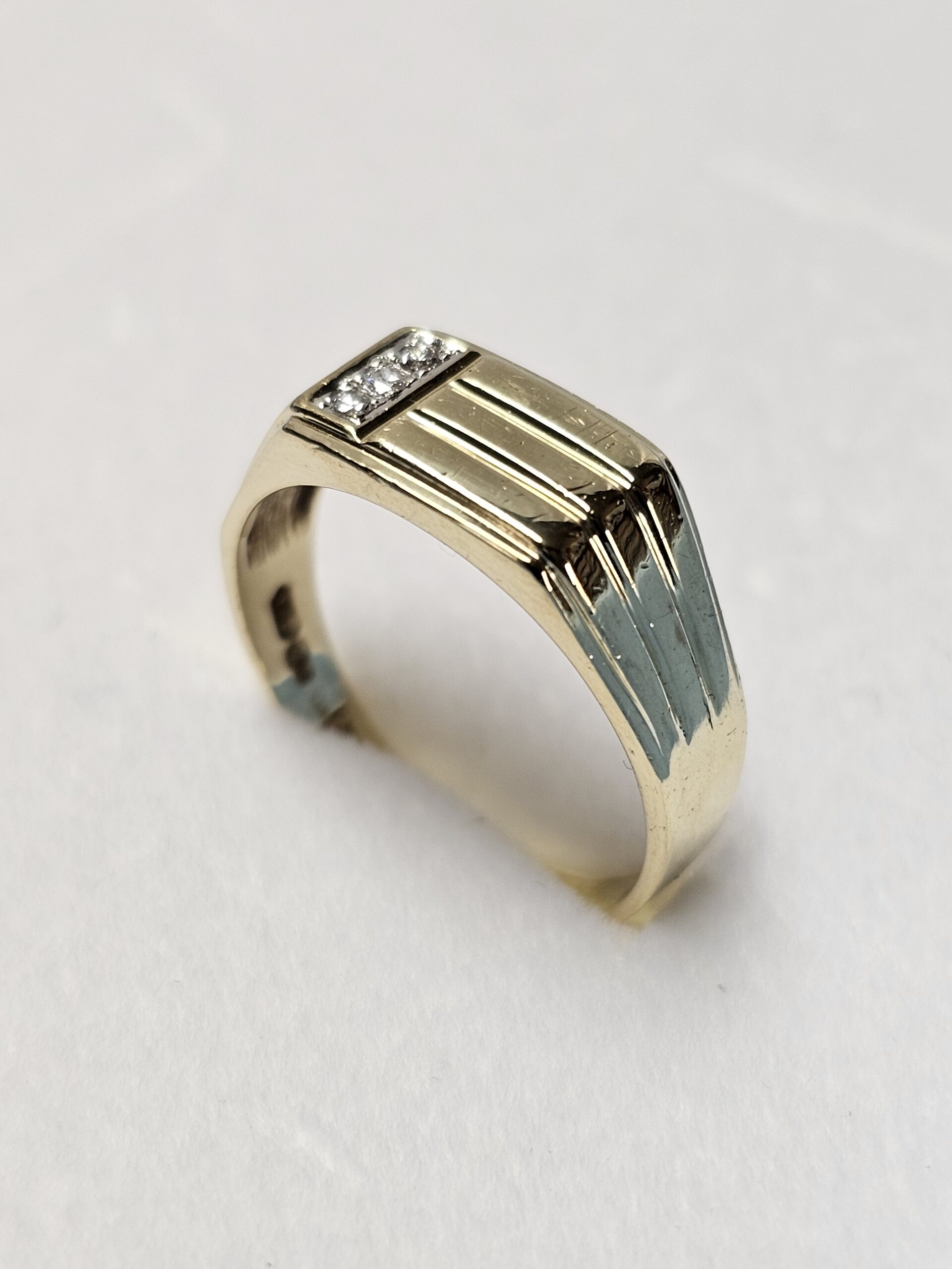Edler Siegelring aus Gold 585 mit einem Querstreifendesign auf der Ringplatte, welches auf einer Seite in das Ringband verläuft. Geschmückt ist er mit einem 3 Stck. kleinen Diamantsteinchen.