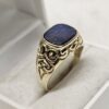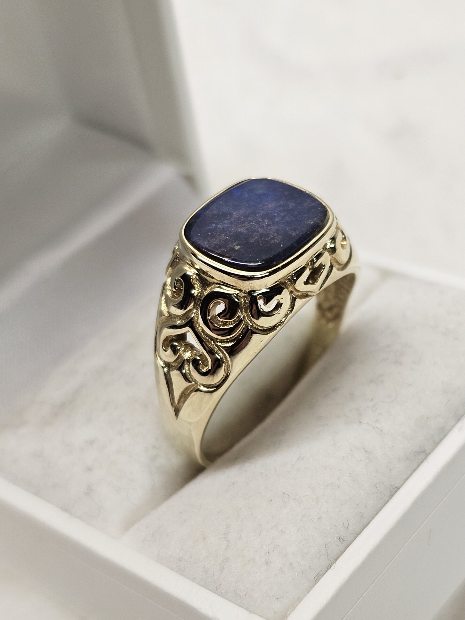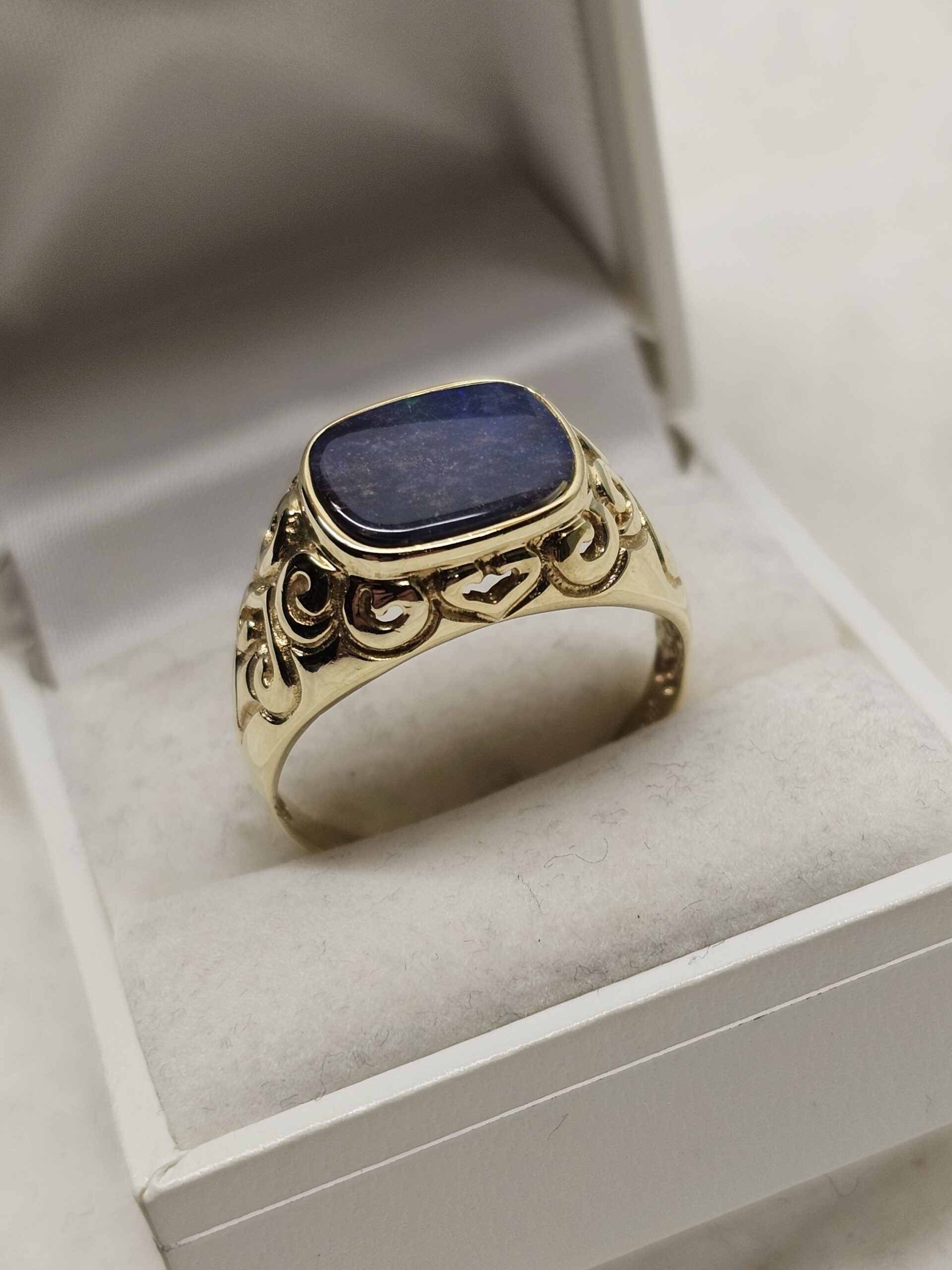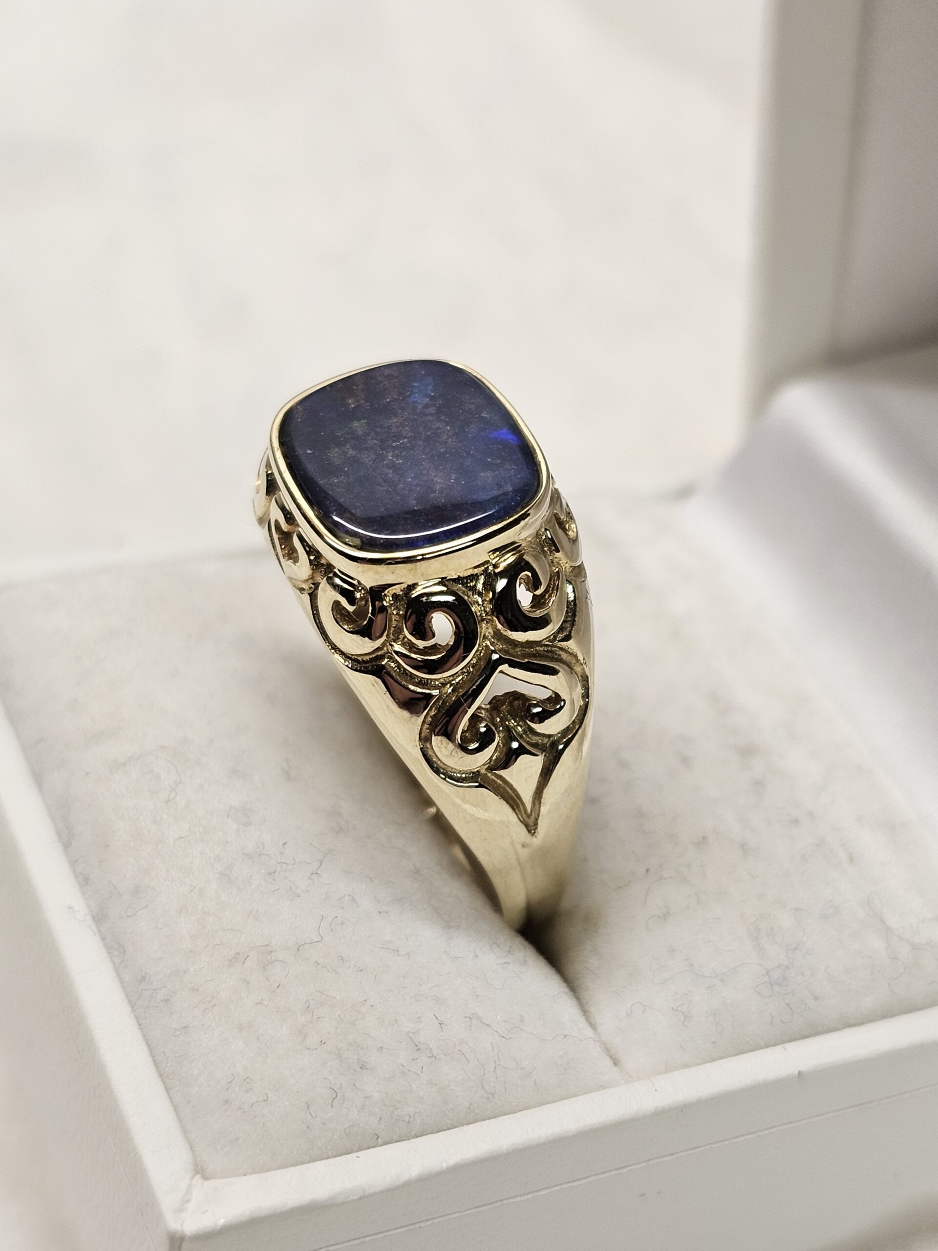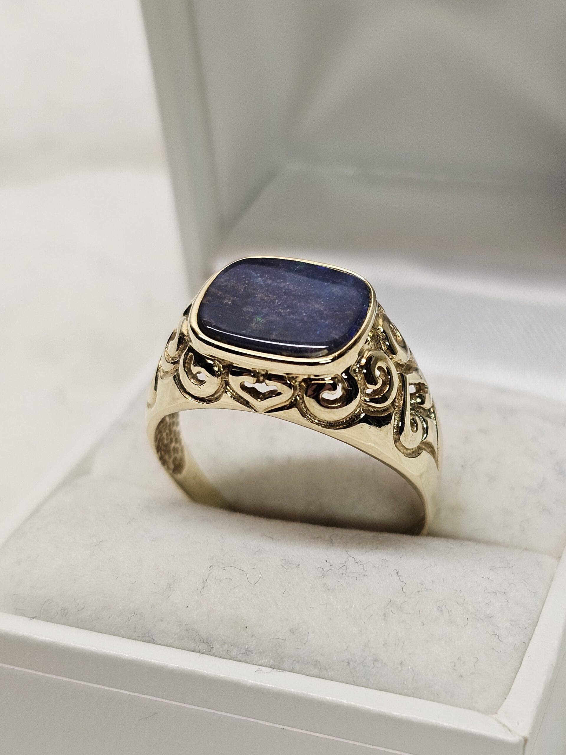 Bezaubernd schöner und besonderer Ring Gold 585, besetzt mit einem blauen Regenbogenopal. Der Opal wurde auf der Unterseite des Ringkopfes mit einem Schutz unterlegt. Die Ringkopfgestaltung ist Nostalgie pur!