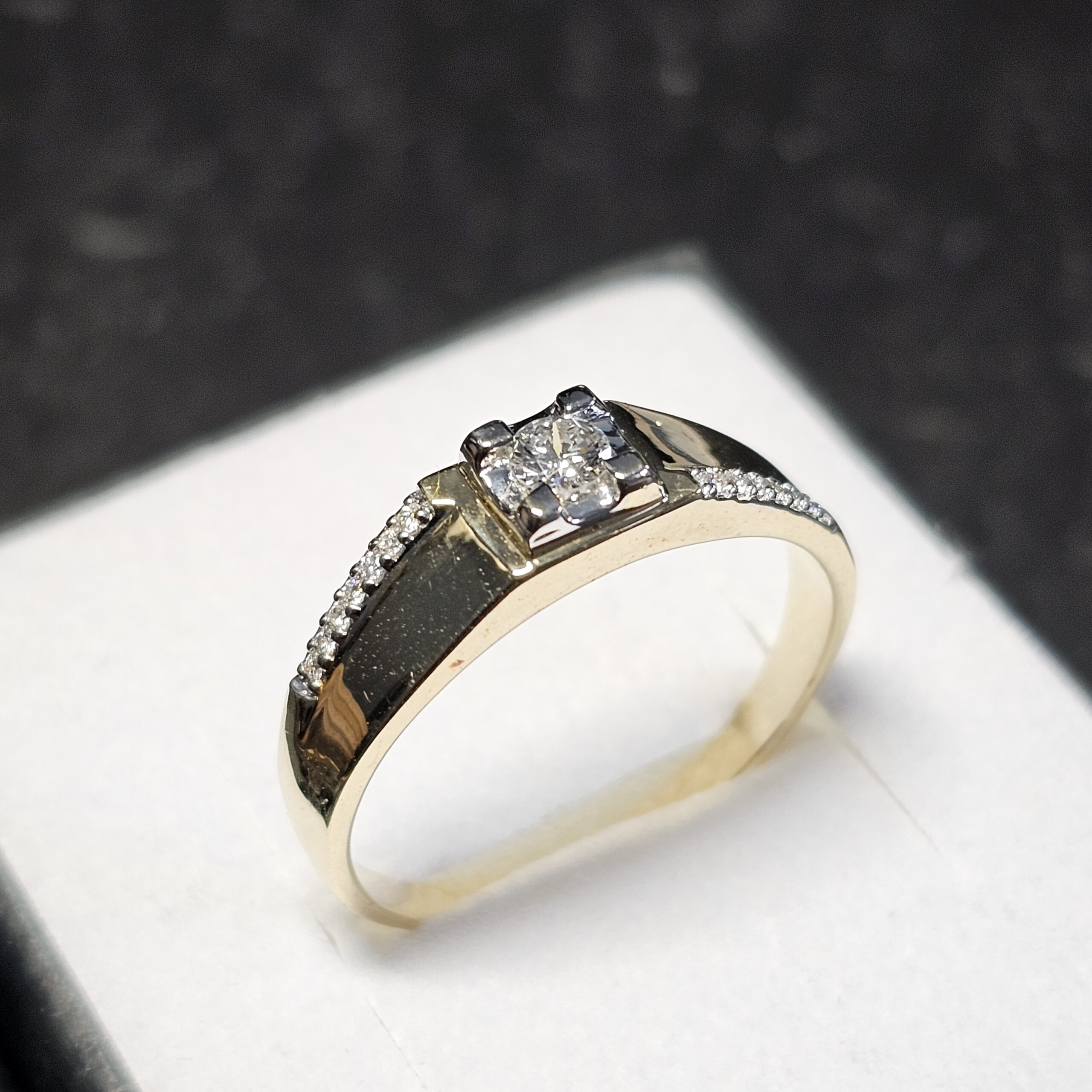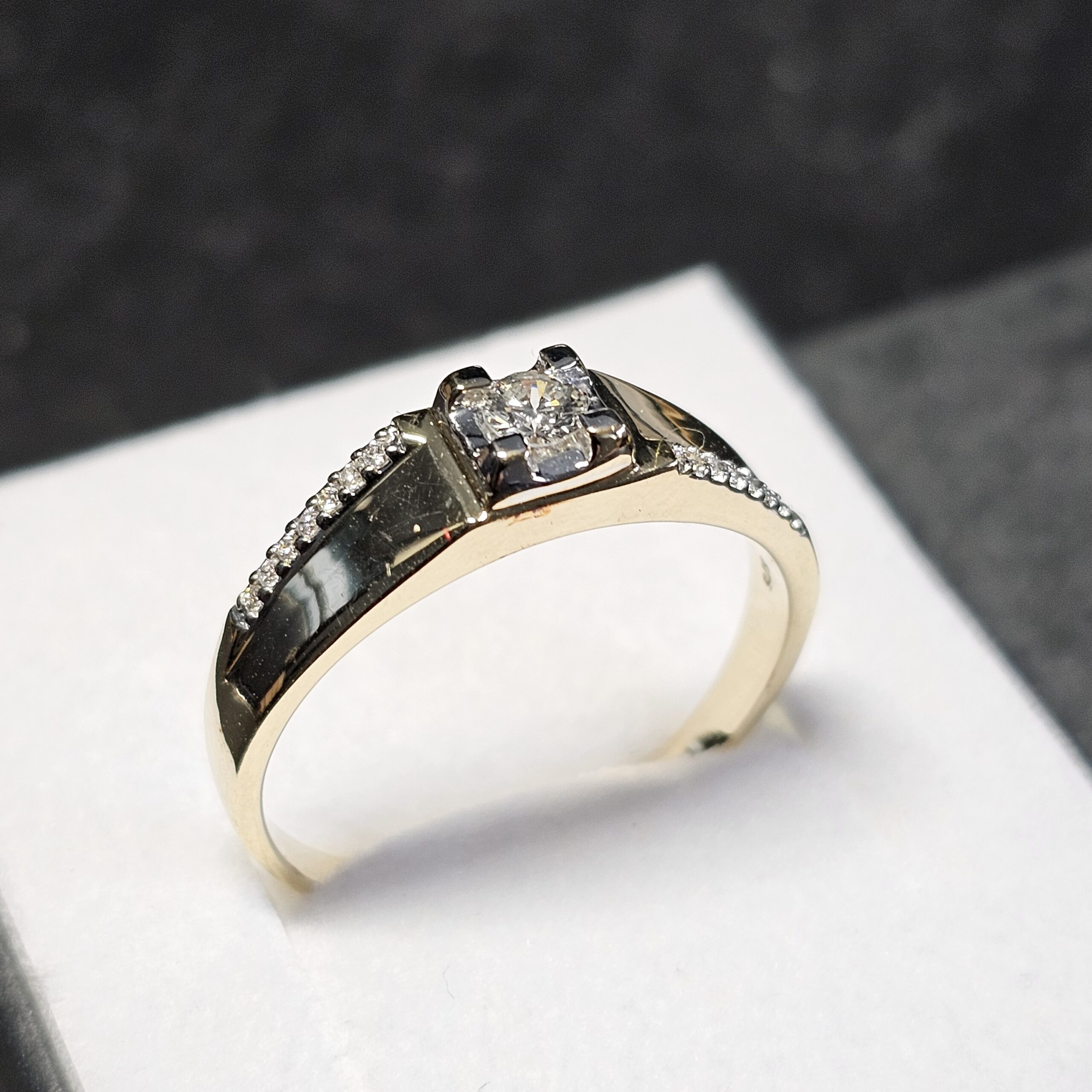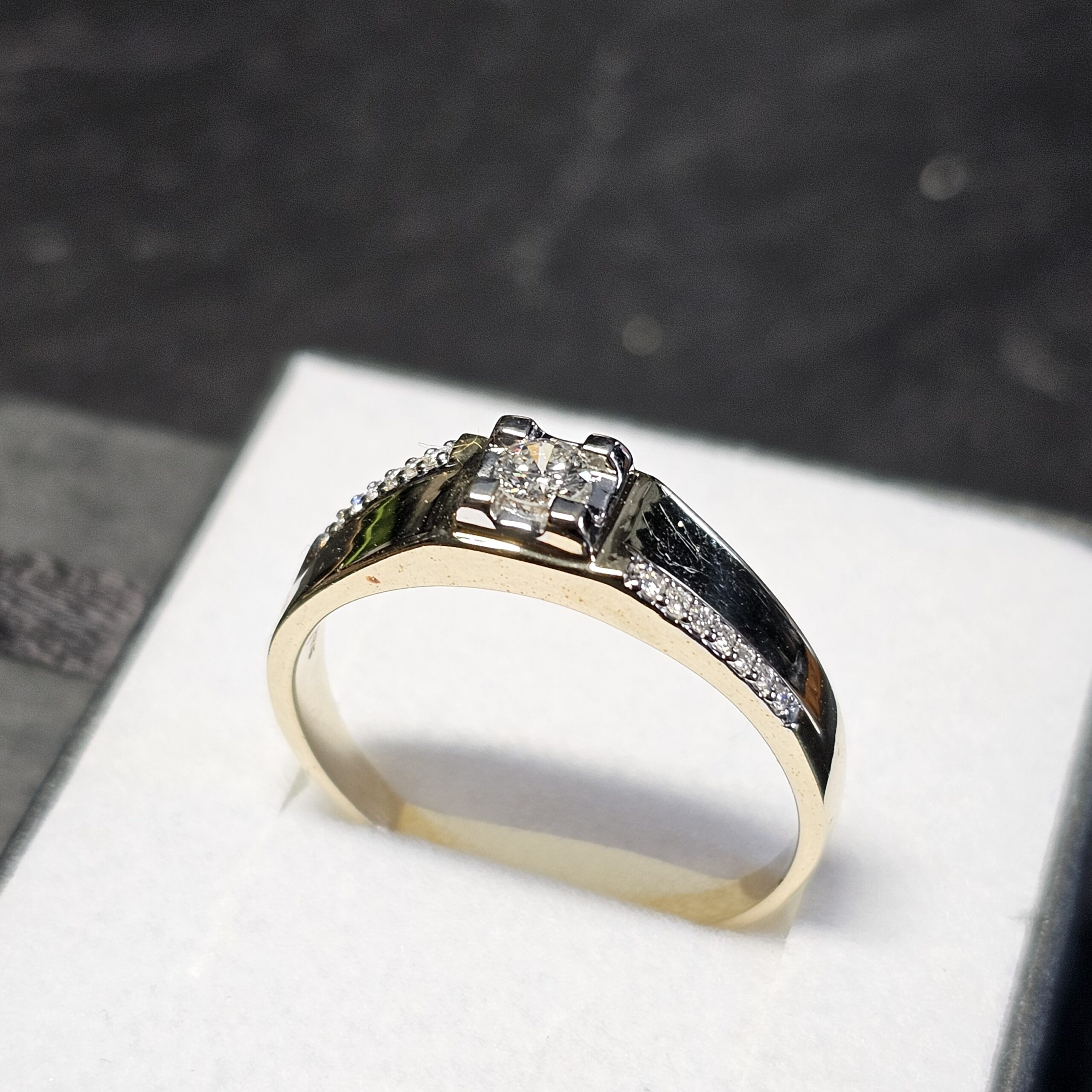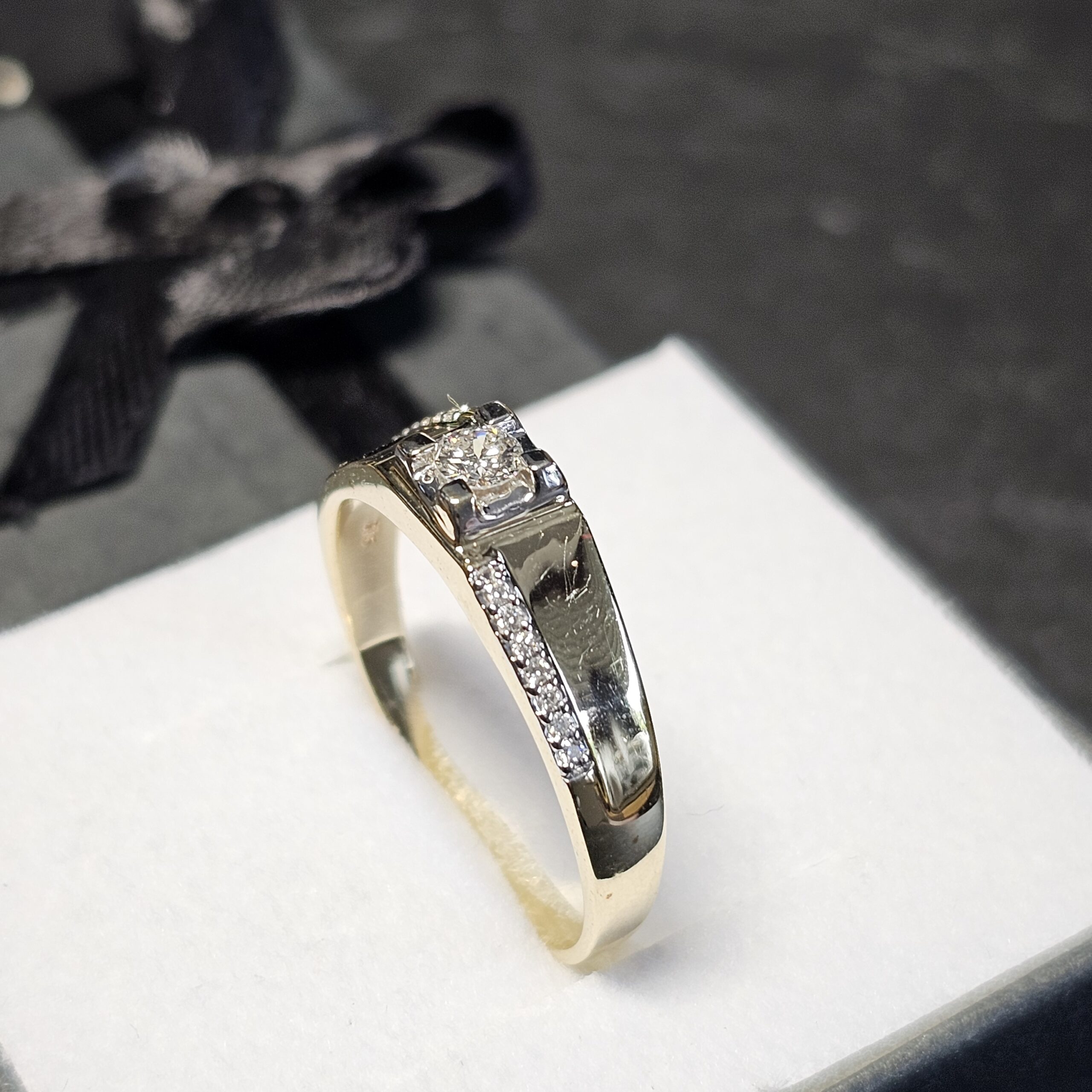 Goldring aus Gold 375. Edle Gestaltung, auf dem Ringkopf sitzt auf platiniertem Untergrund ein Diamantsteinchen. Kleinste Diamantsteinchen sind in einer Reihe rechts und links daneben die Ringschiene runter verlaufend angebracht.