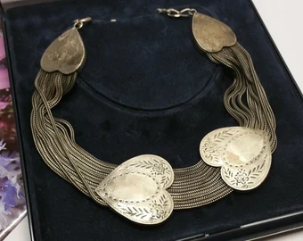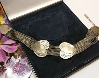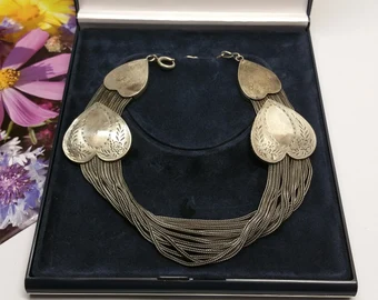 Eine sehr schöne Trachten Silberkette mit Herzen – wunderbare Silberschmiedearbeit -. Die hübschen in floralem Design gestalteten Herzen sind mit 13 Silberketten verbunden. Ein wunderschönes Unikat.