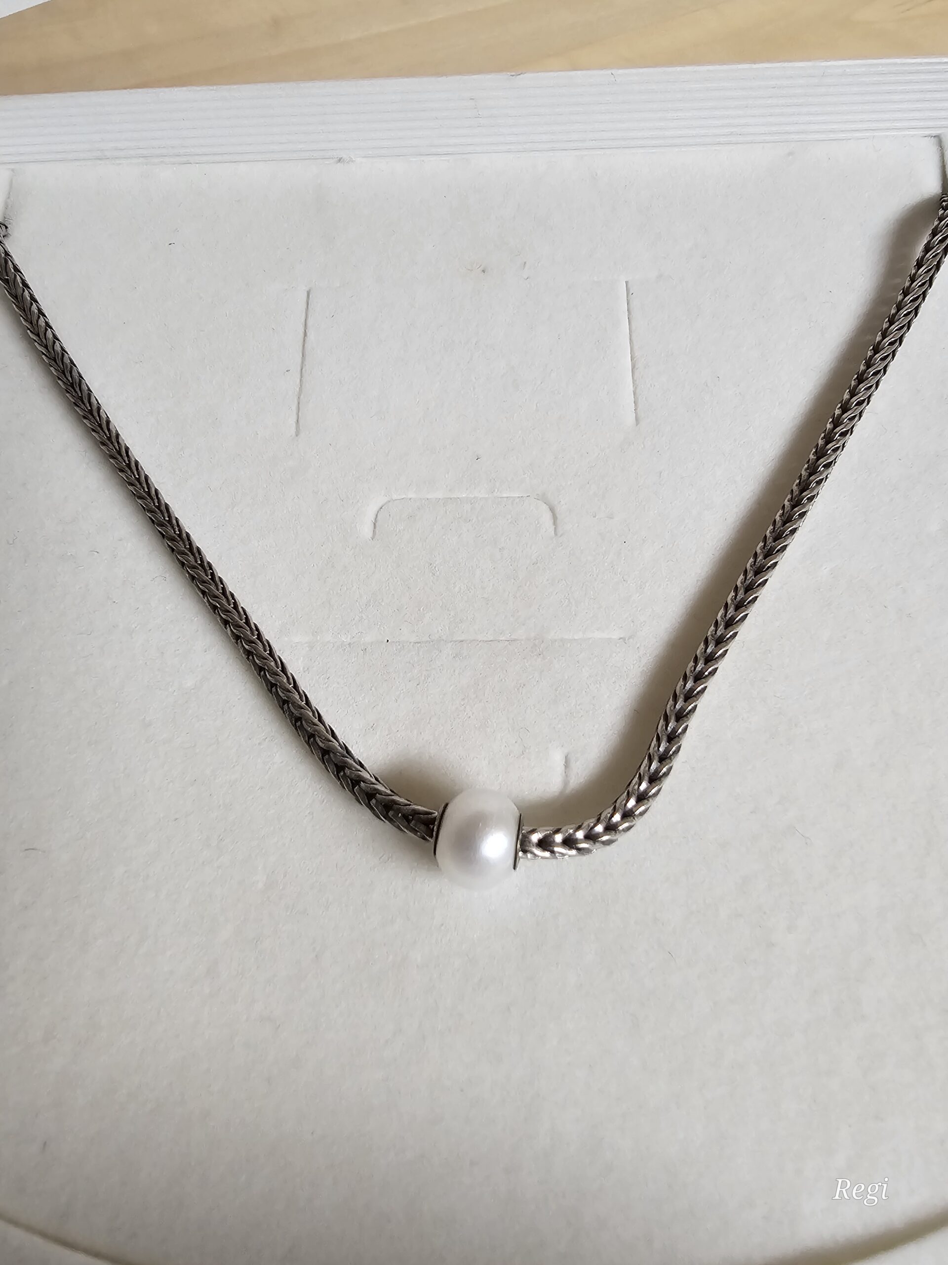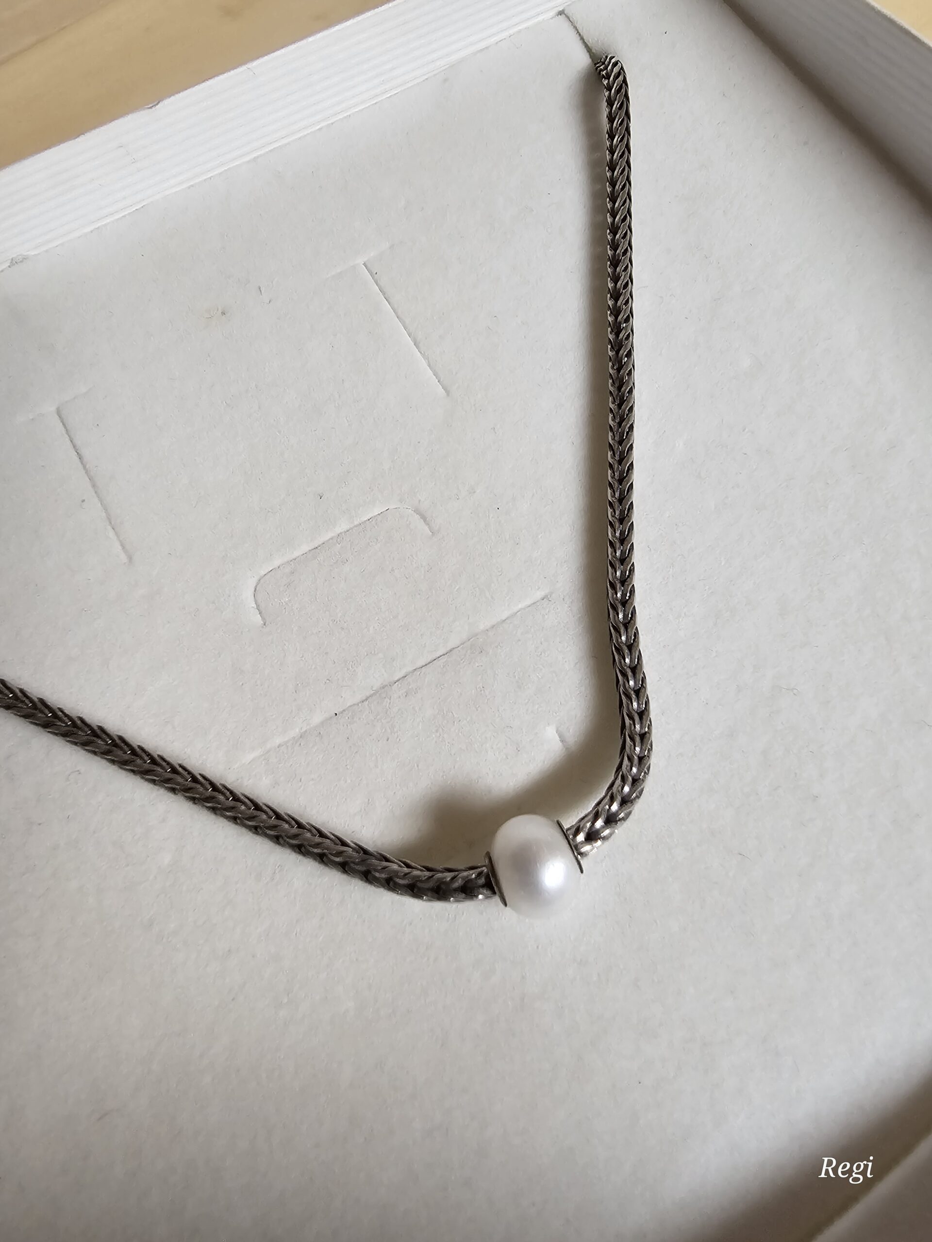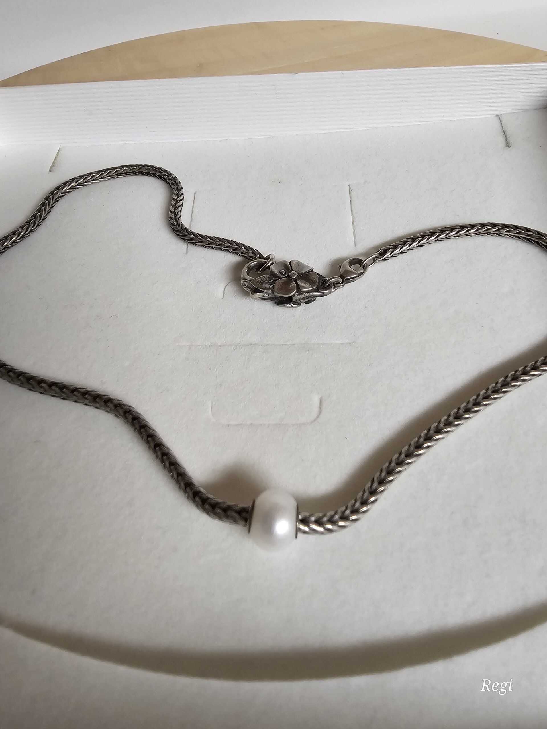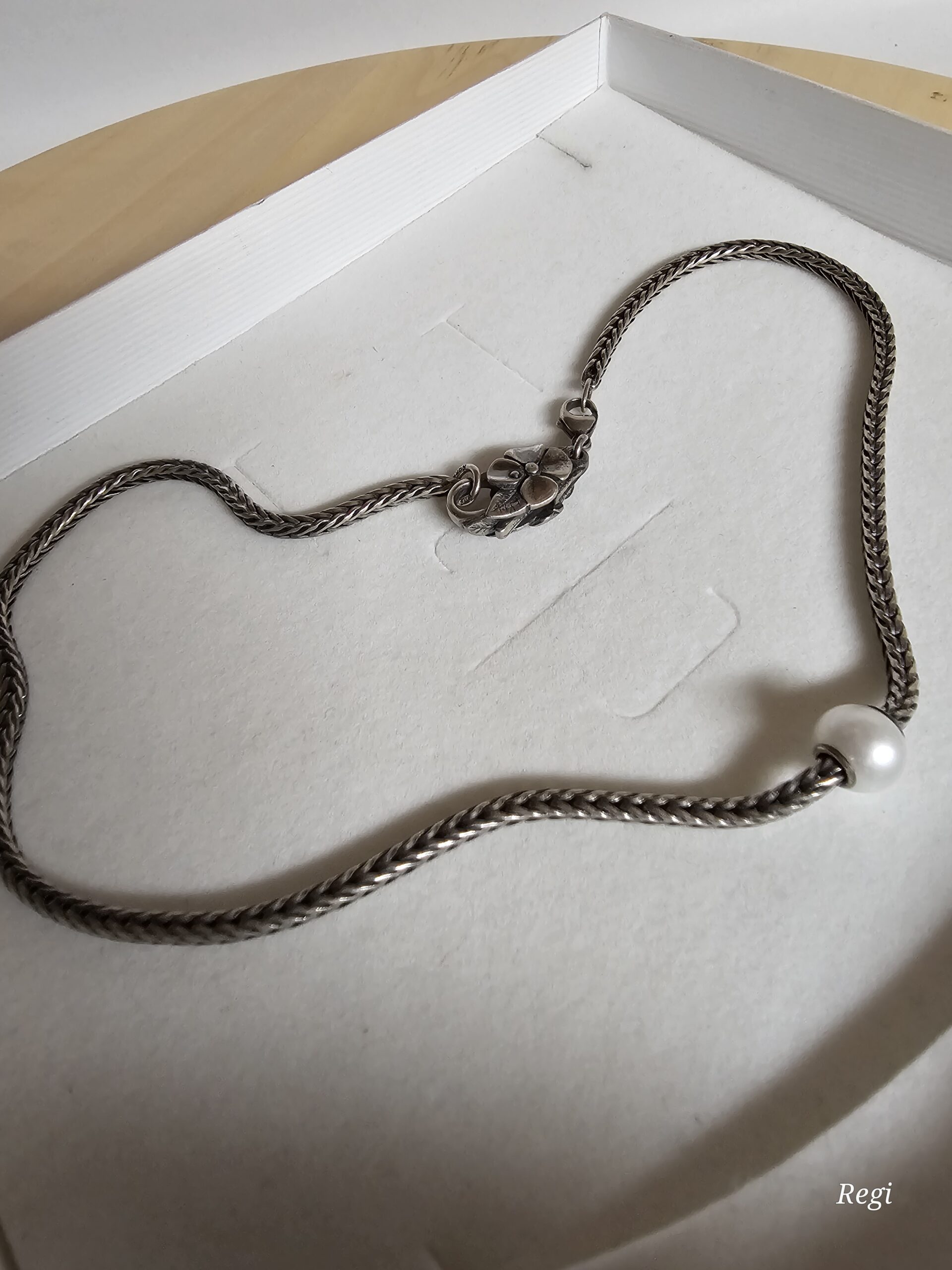 Elegante Fuchsschwanzkette gefertigt aus Silber 925. Ein großer Blumenverschuss ist angebracht und verziert ist das schöne Stück mit einem Perlenbead.