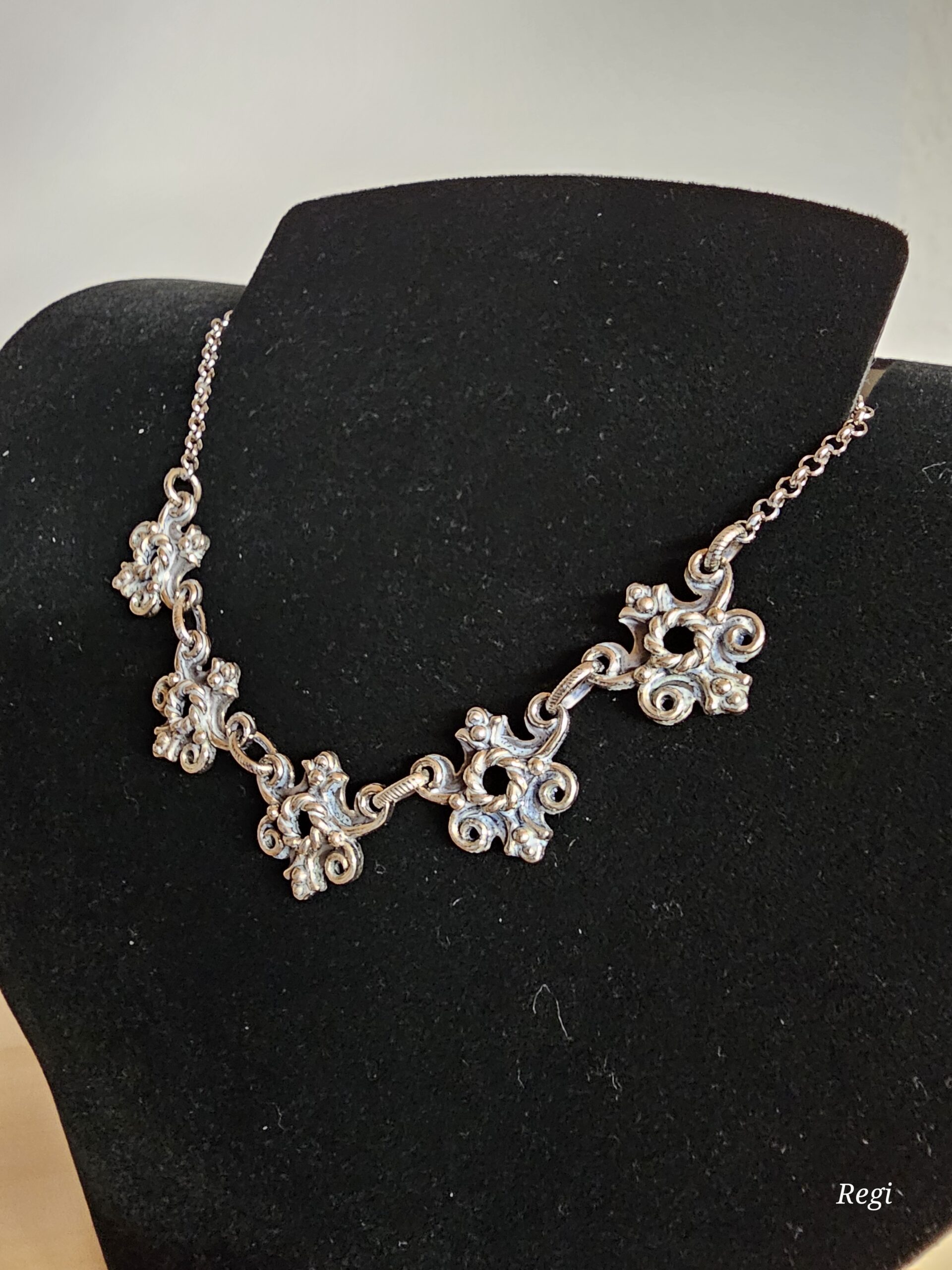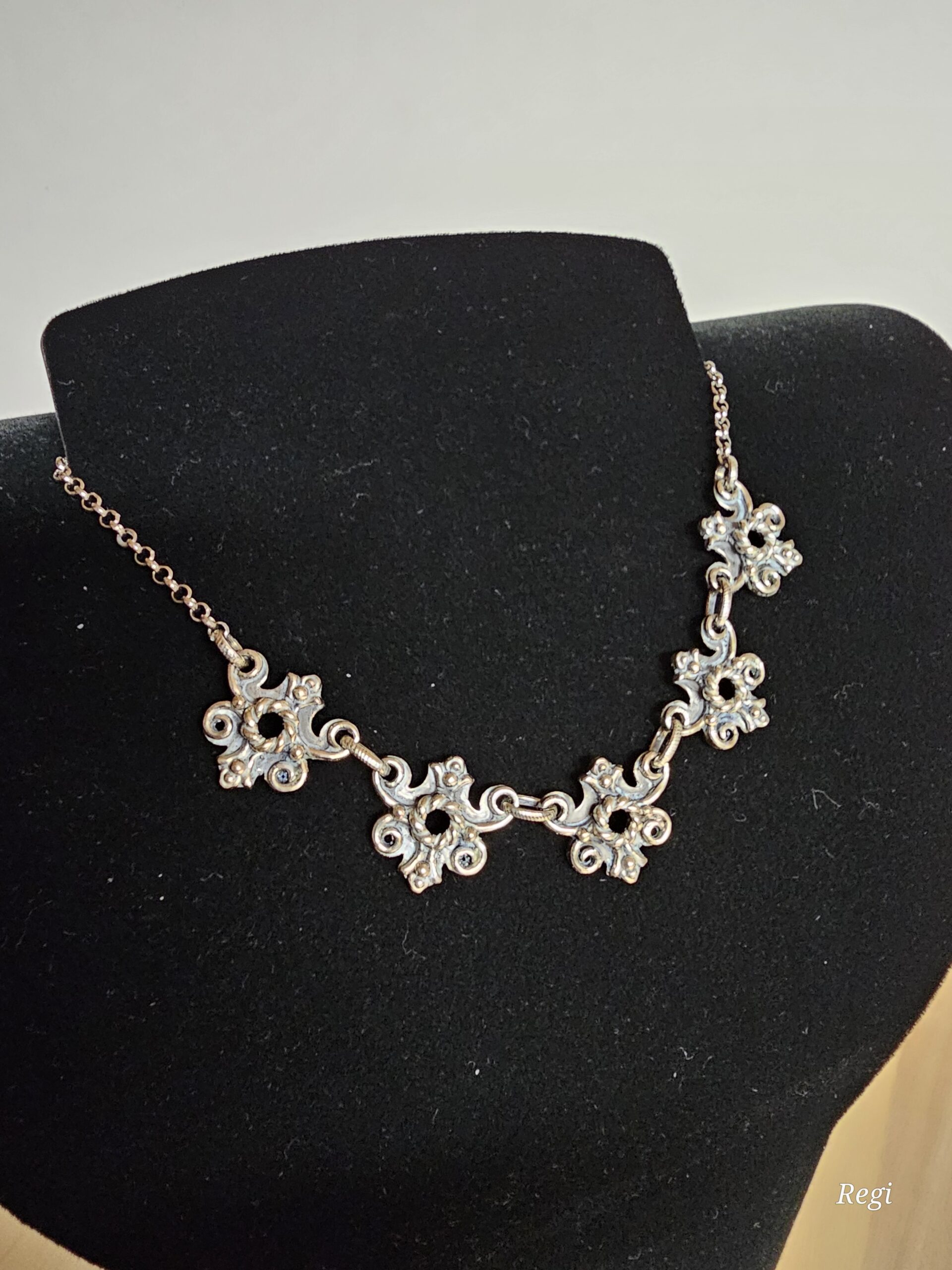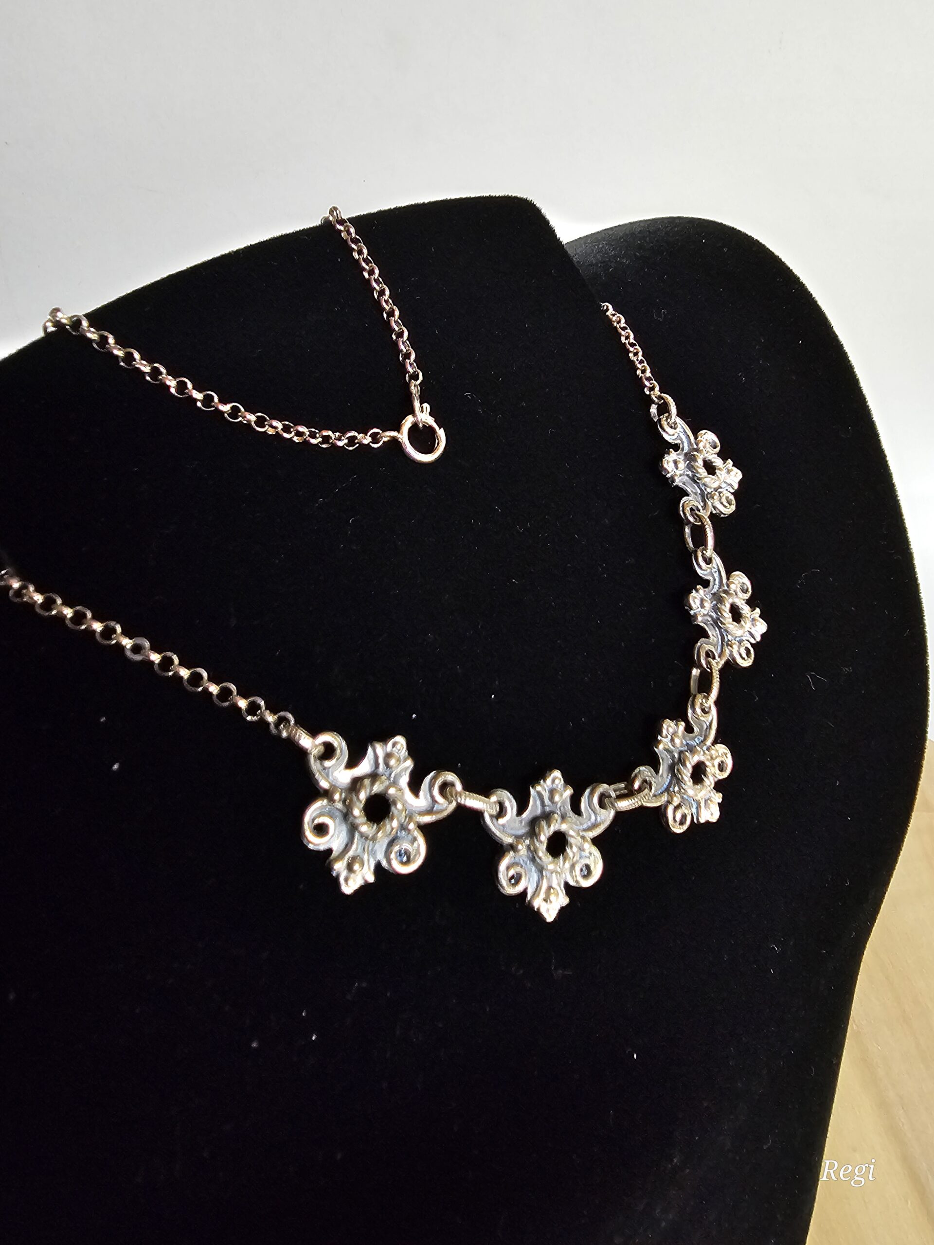 Die insgesamt 5 Stück hübsch gestalteten Glieder sind als nostalgische Ornamente ausgearbeitet. Sie sitzen als Mittelstücke an der Kette.