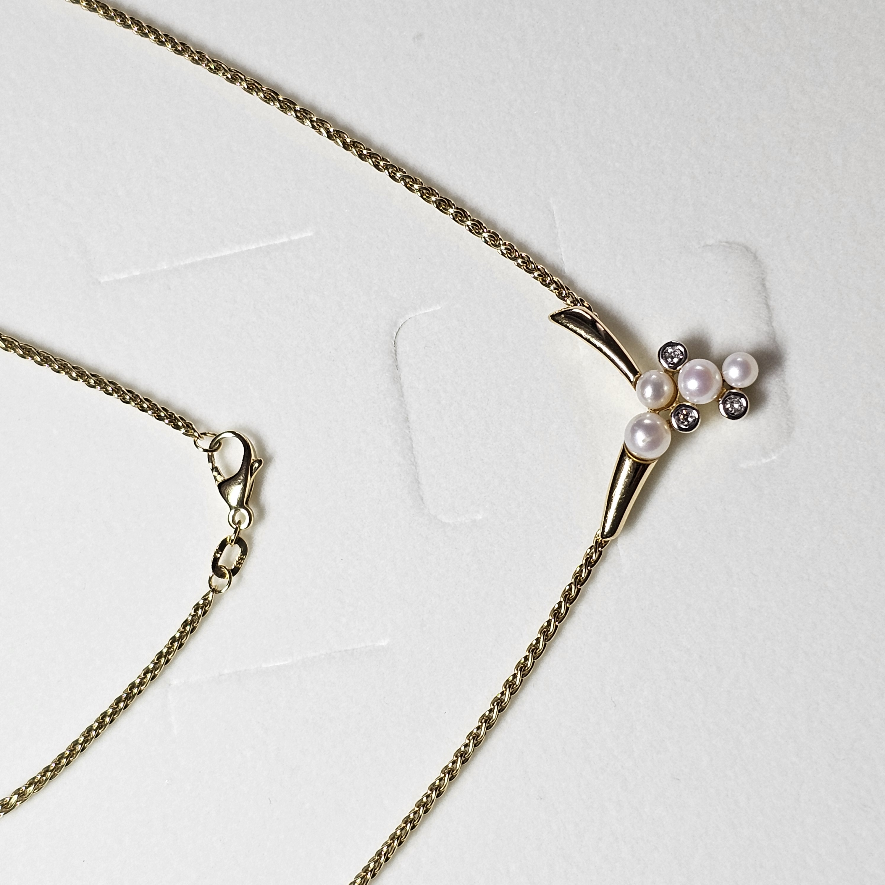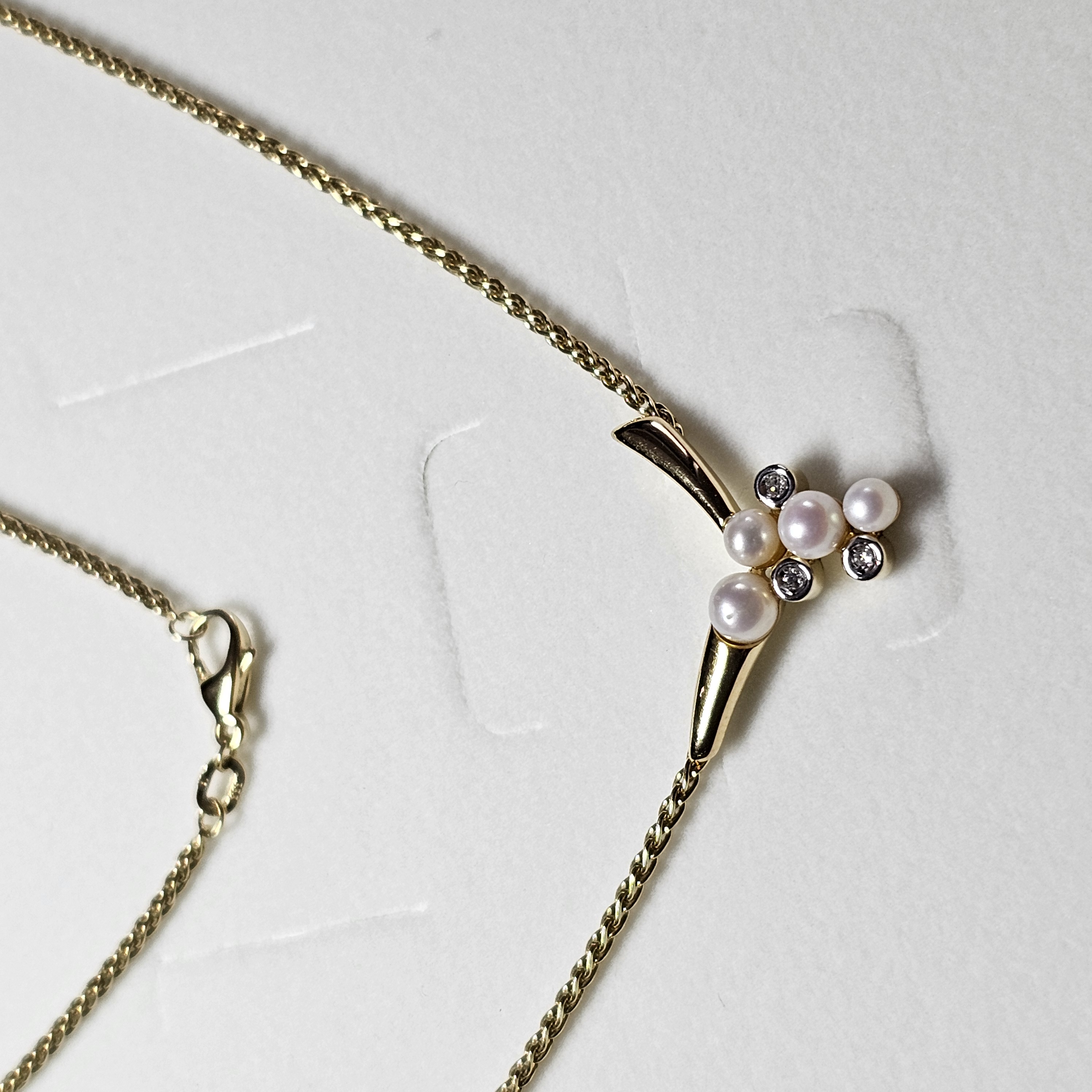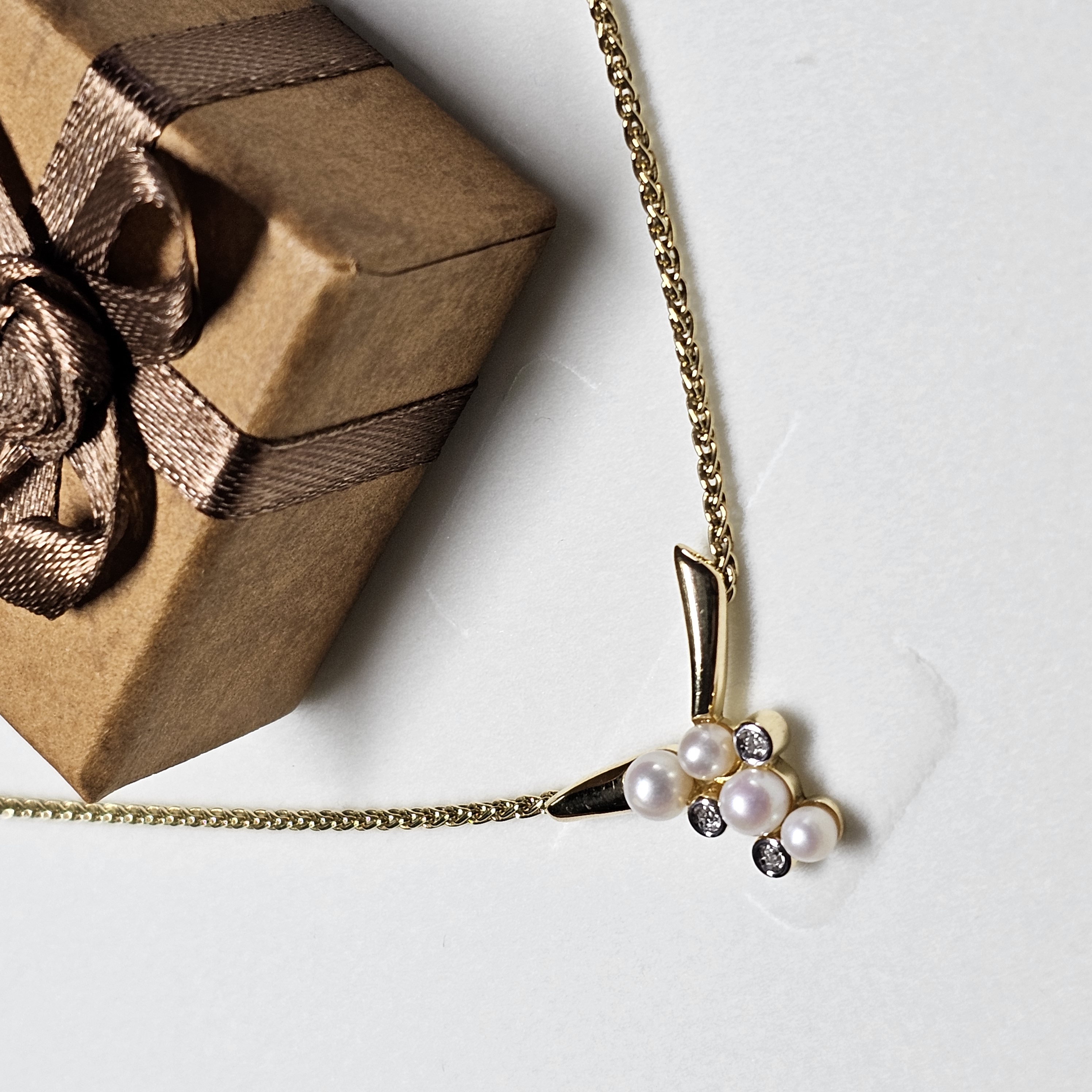 Halskette / Collier aus Gold 333. Hübsches Kordelketten-Design. Der Anhänger ist elegant gestaltet und mit 3 Stck. Moissanitsteinchen und 4 Stck. Perlen geschmückt.