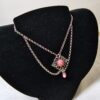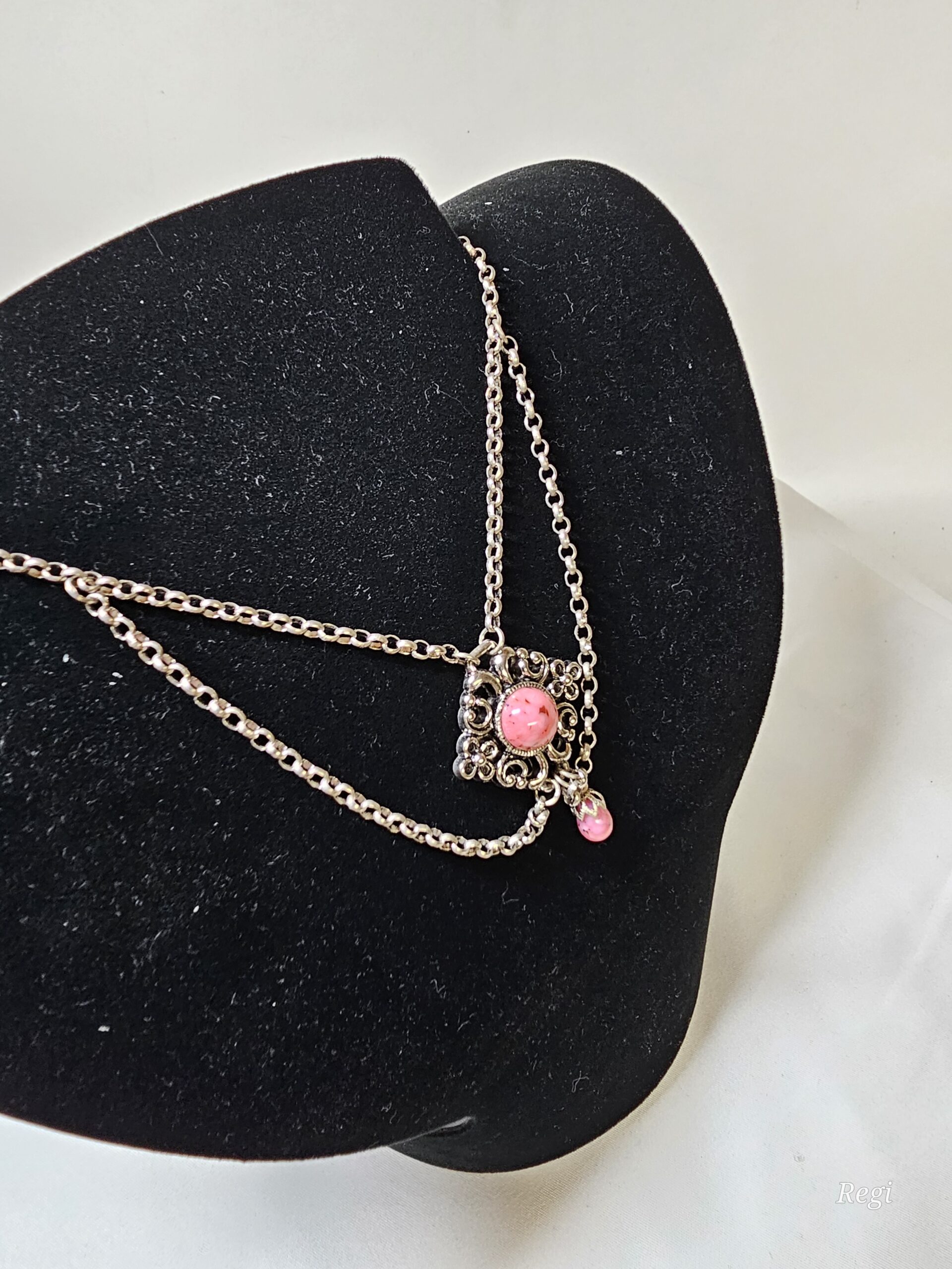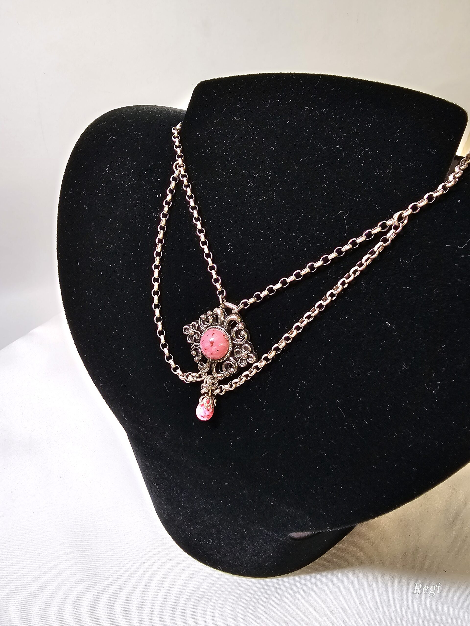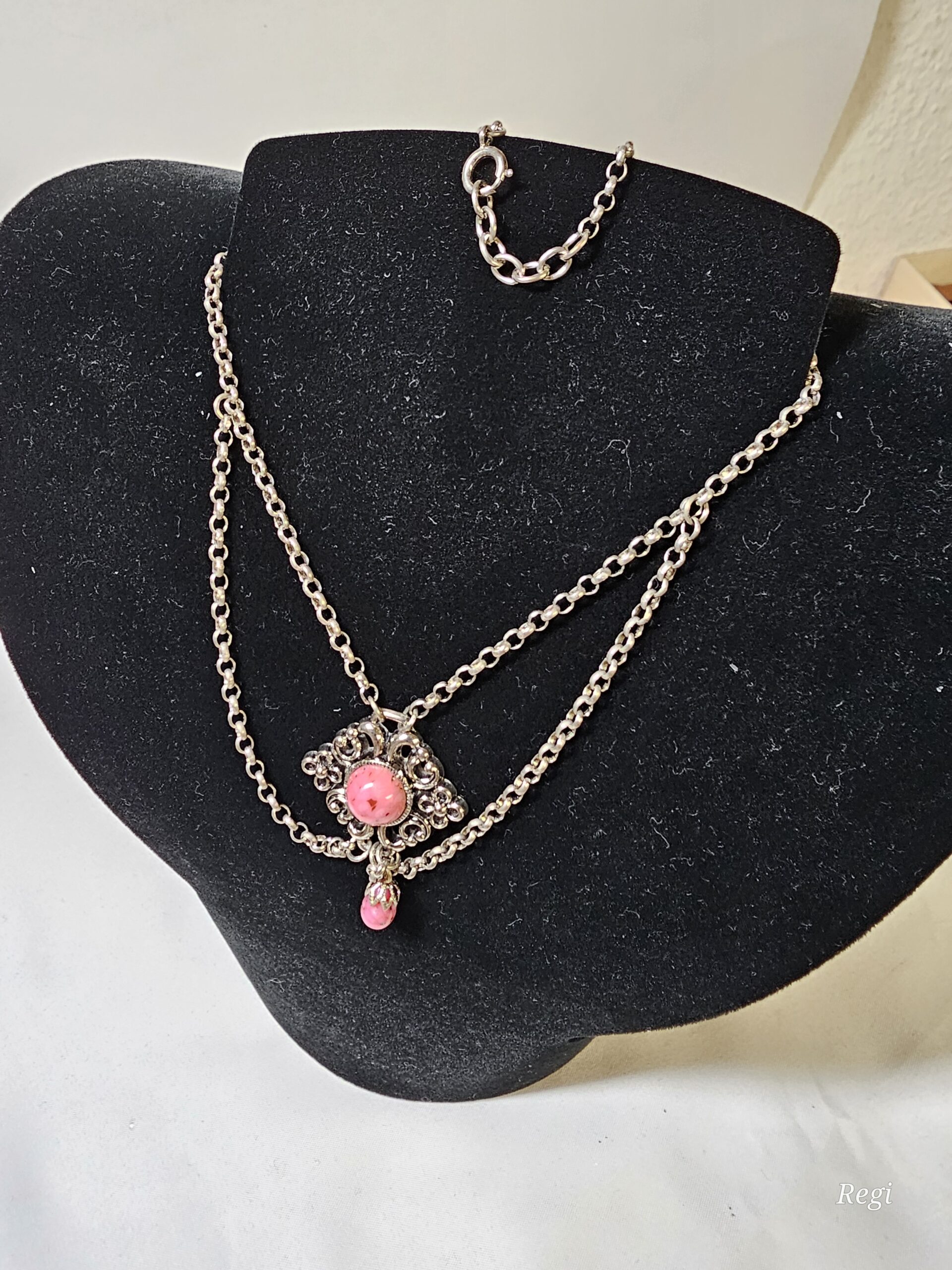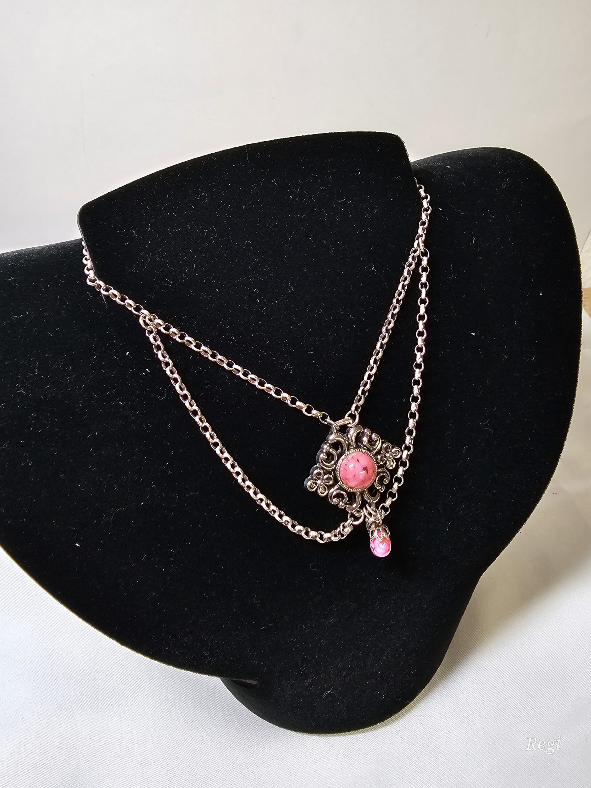 Nostalgische Halskette/Collier mit einem wunderschön ausgearbeiteten Anhängermittelstück. Der Anhängerteil ist mit Rhodonit-Steinen geschmückt.
