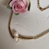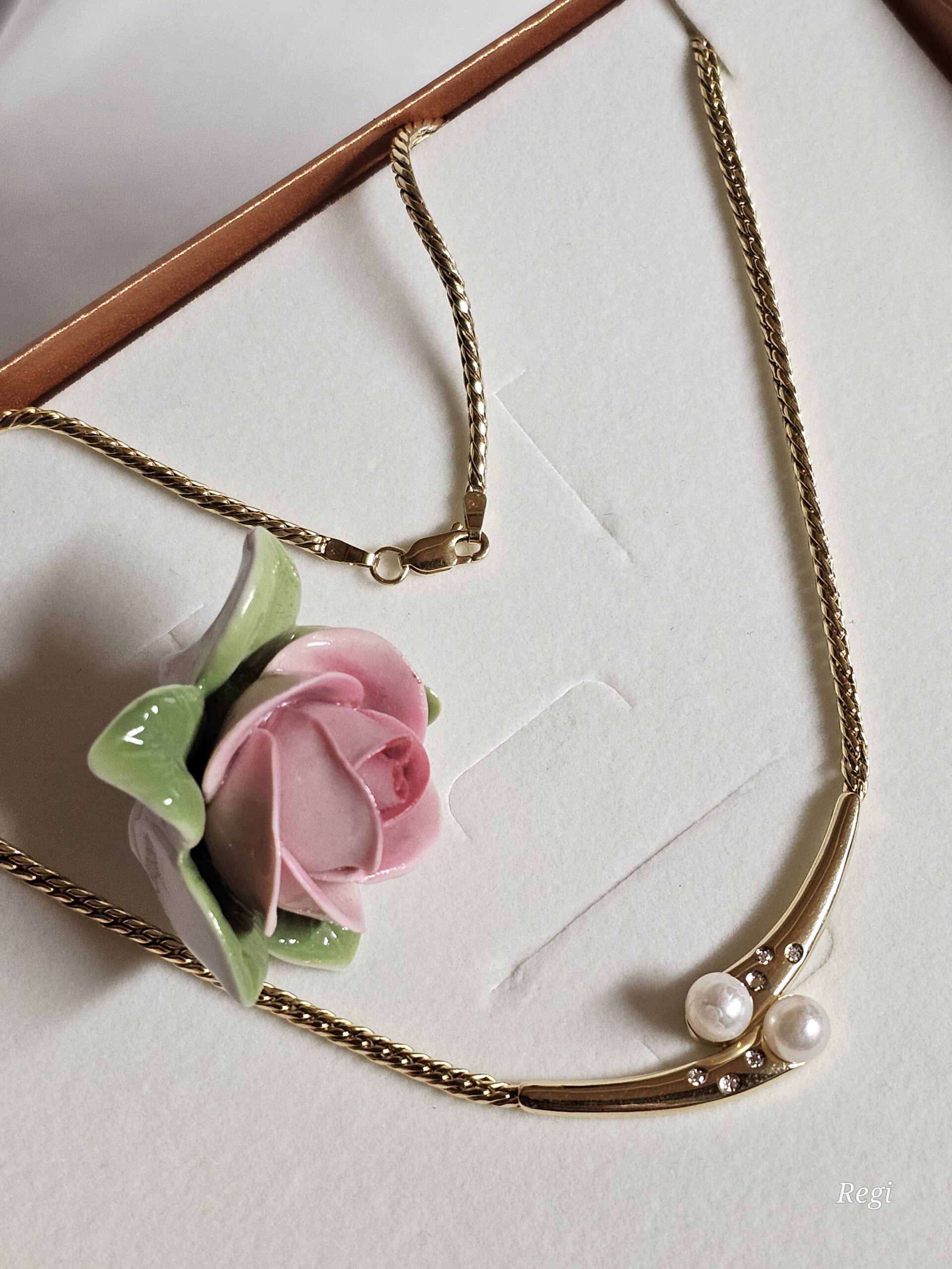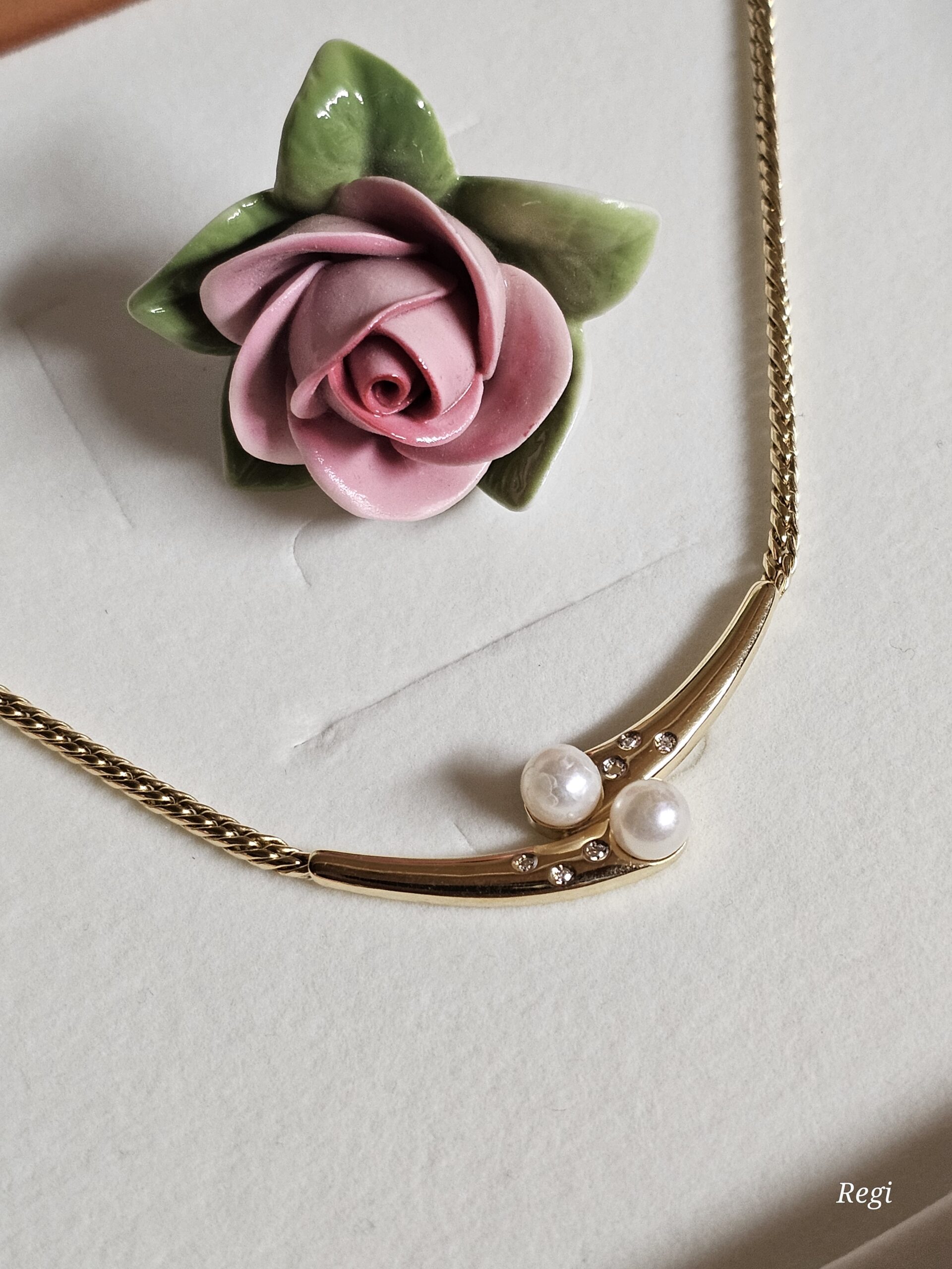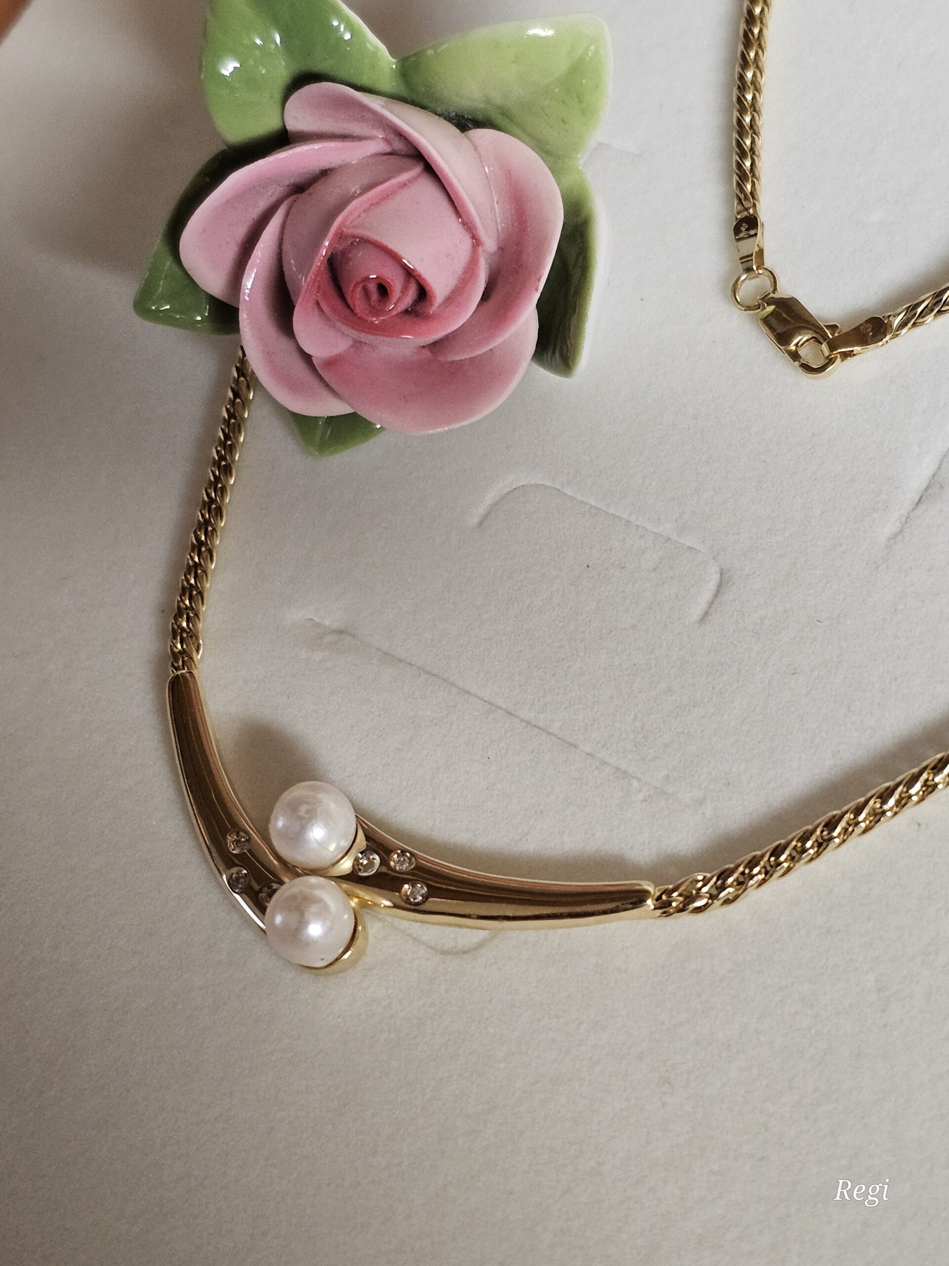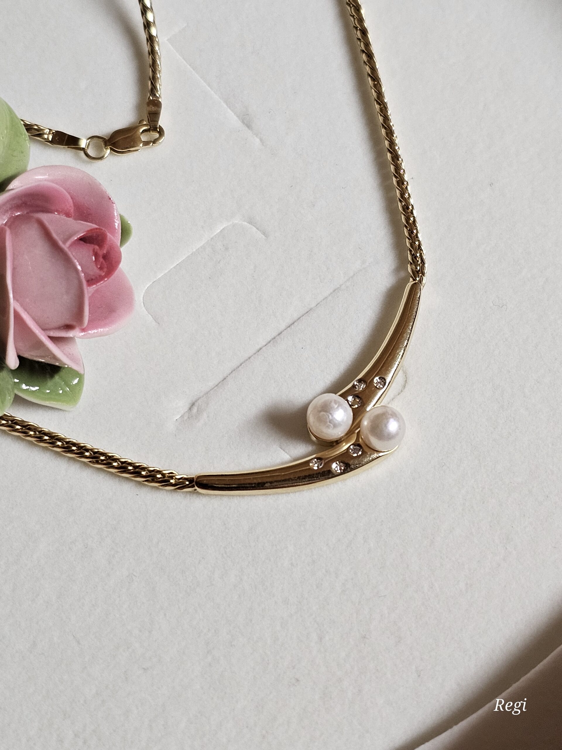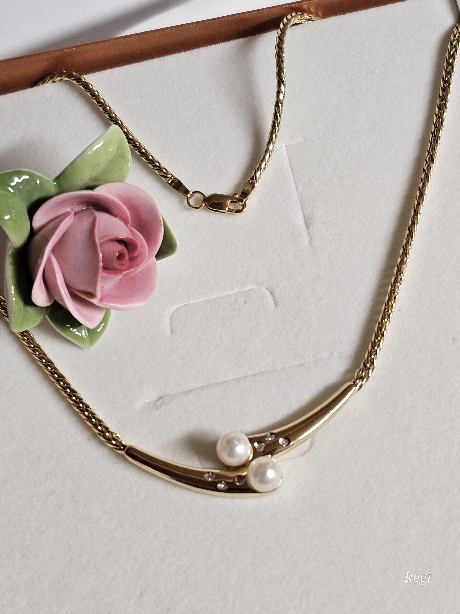 Elegante Gliederkette/ Halskette mit einem kunstvoll gestalteten Anhängerteil aus Gold 585. Mittig verläuft das Mittelstück elegant zusammen, ist geschmückt mit 2 Perlen und auf jedem Anhängerteil sitzen je 3 Stck. kleine Diamantsteinchen.