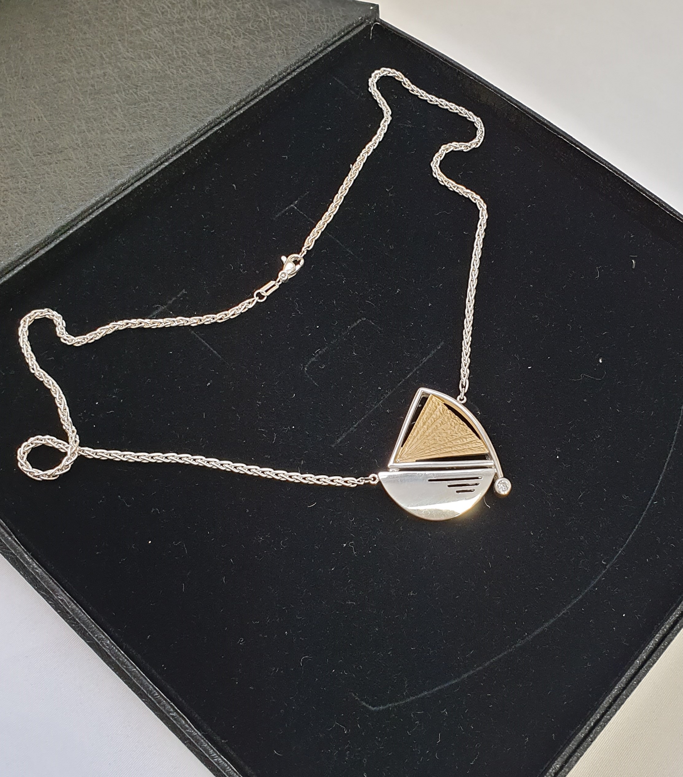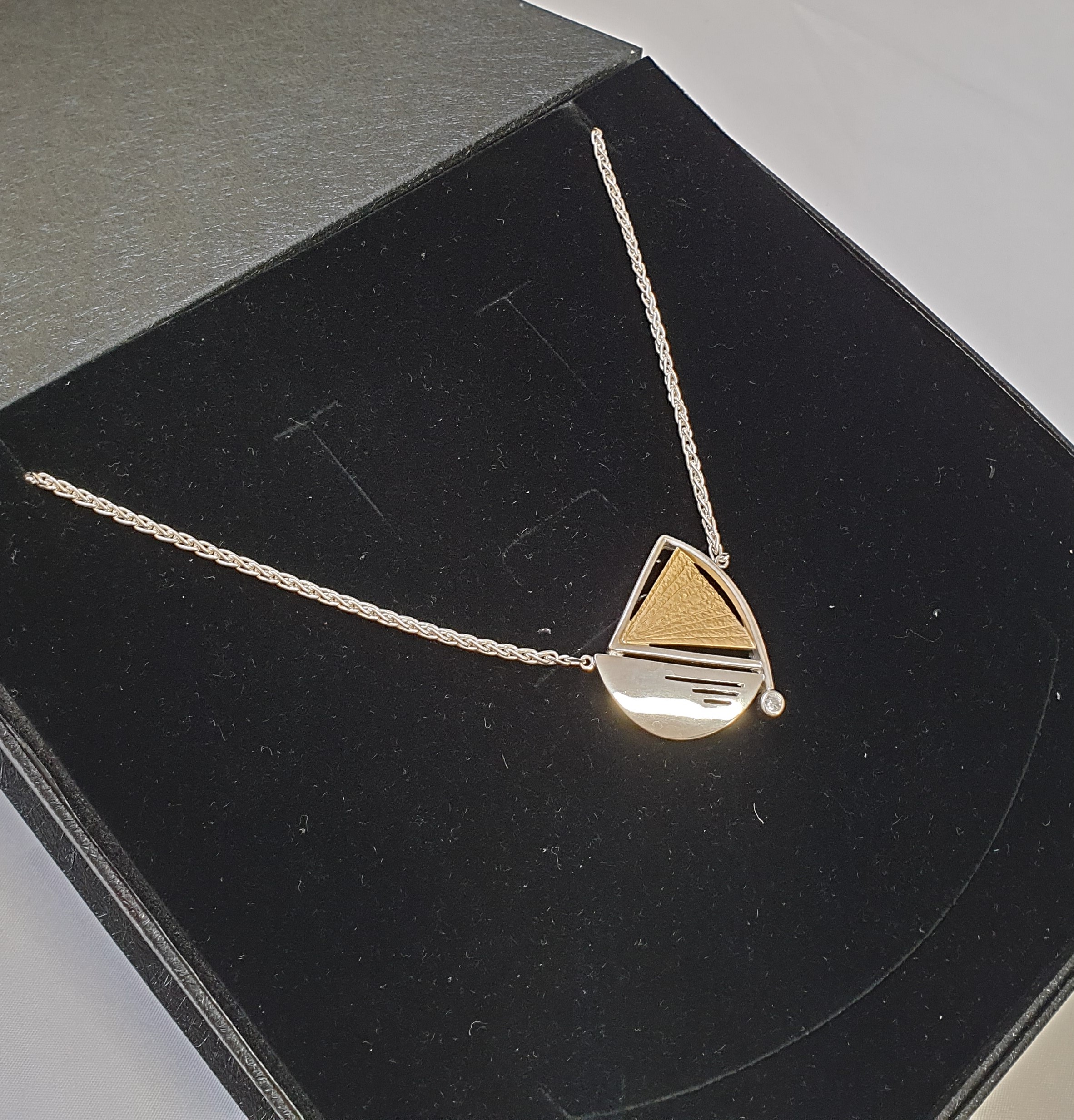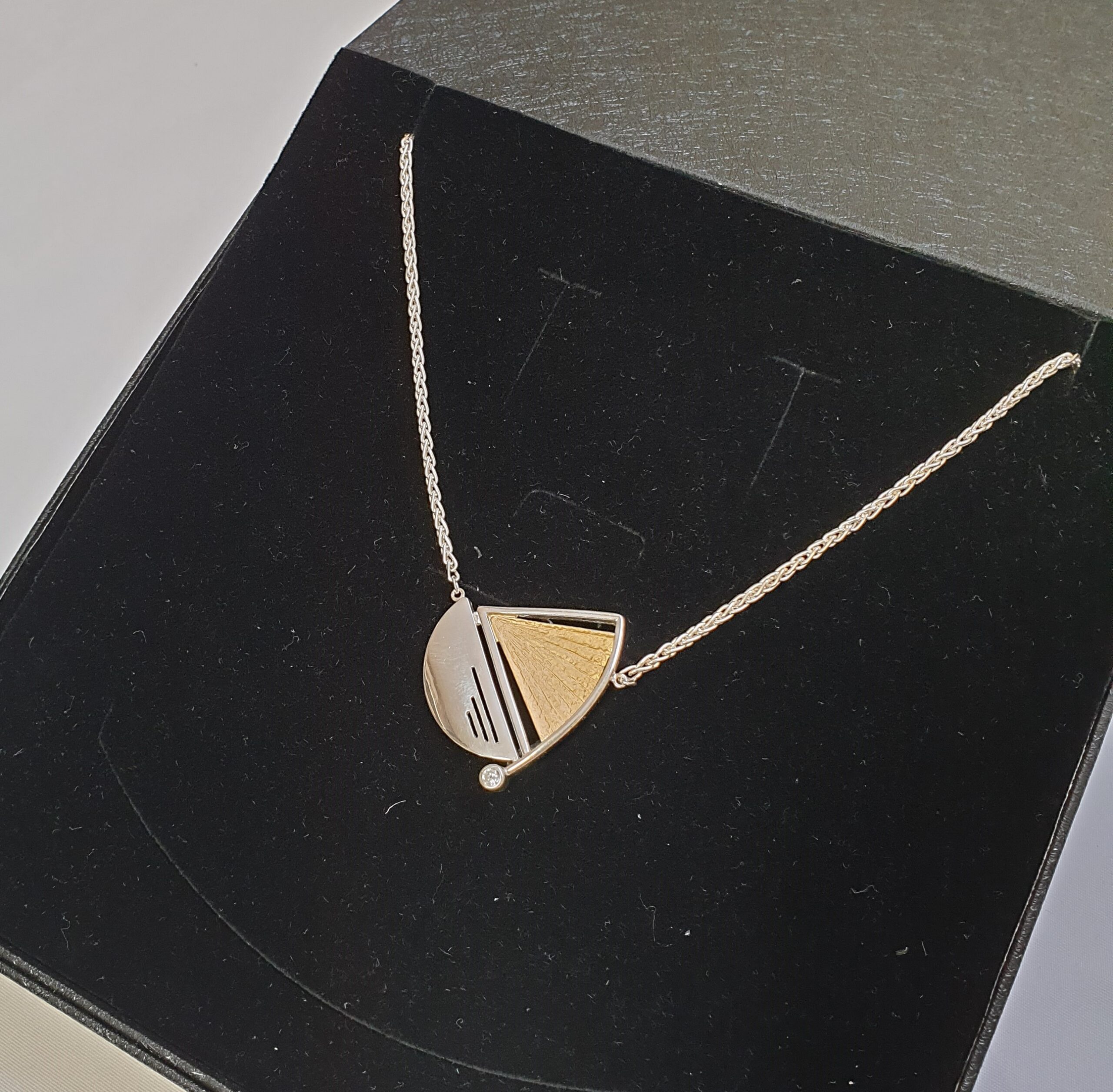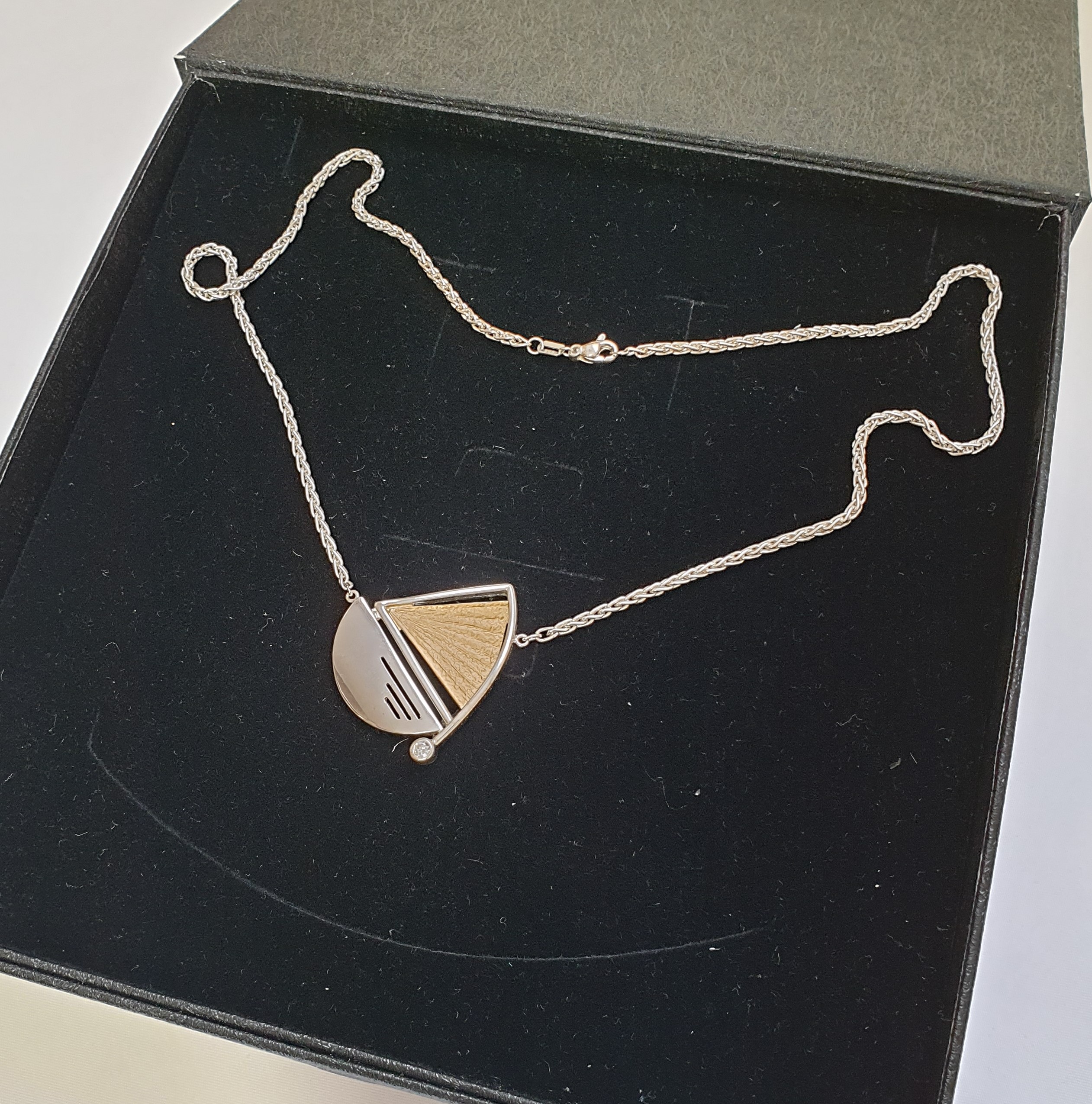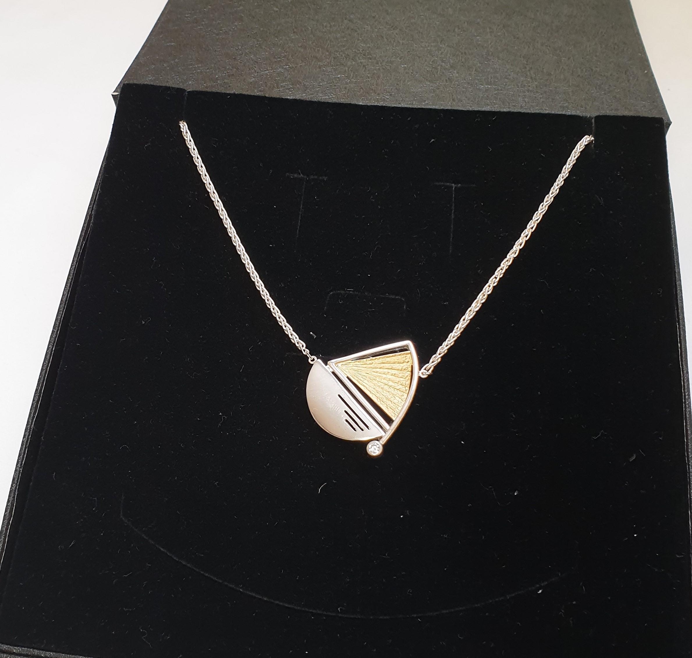 Die Kette und der Anhänger sind aus Silber 925 und teilvergoldet, zusätzlich mit einem Kristallsteinchen verziert.