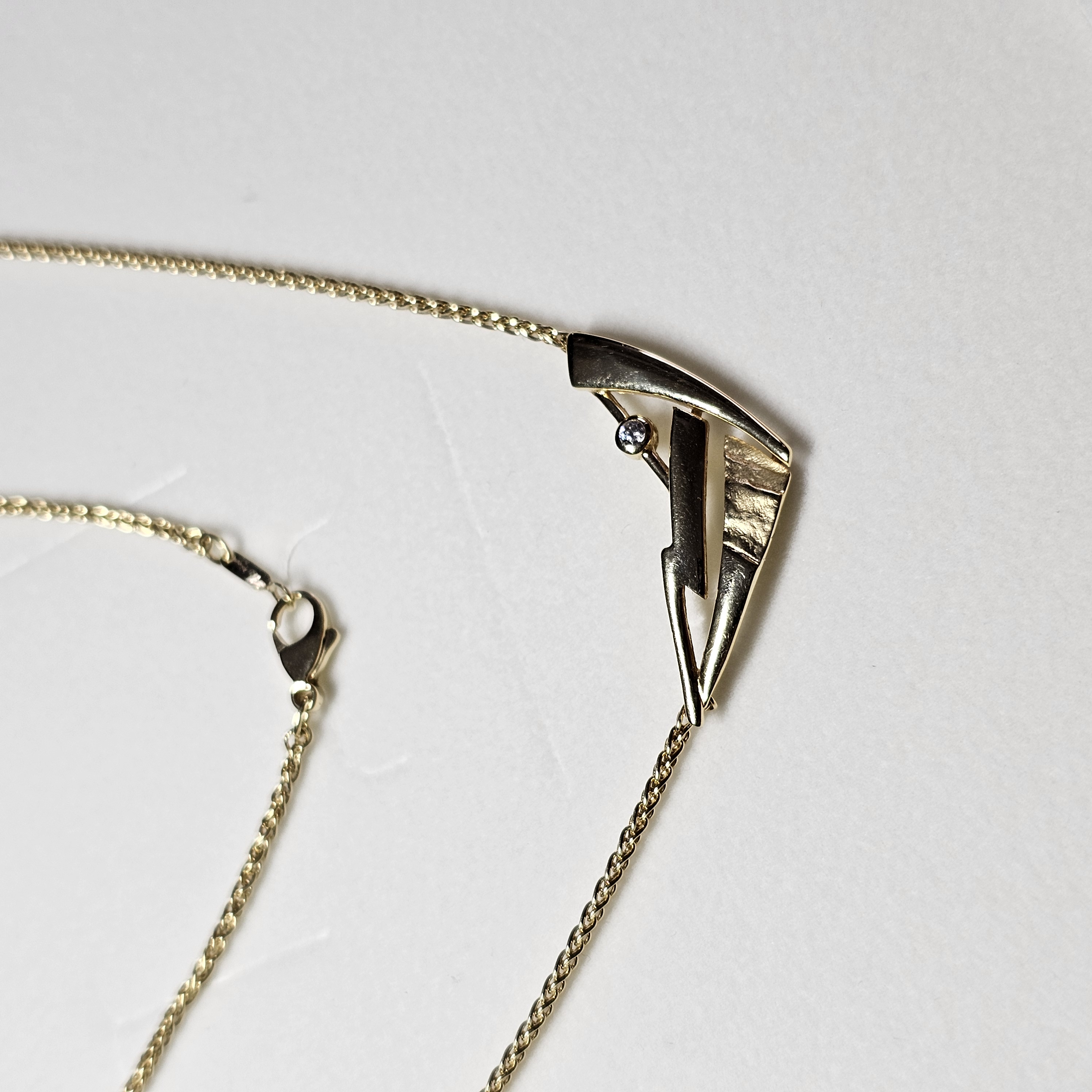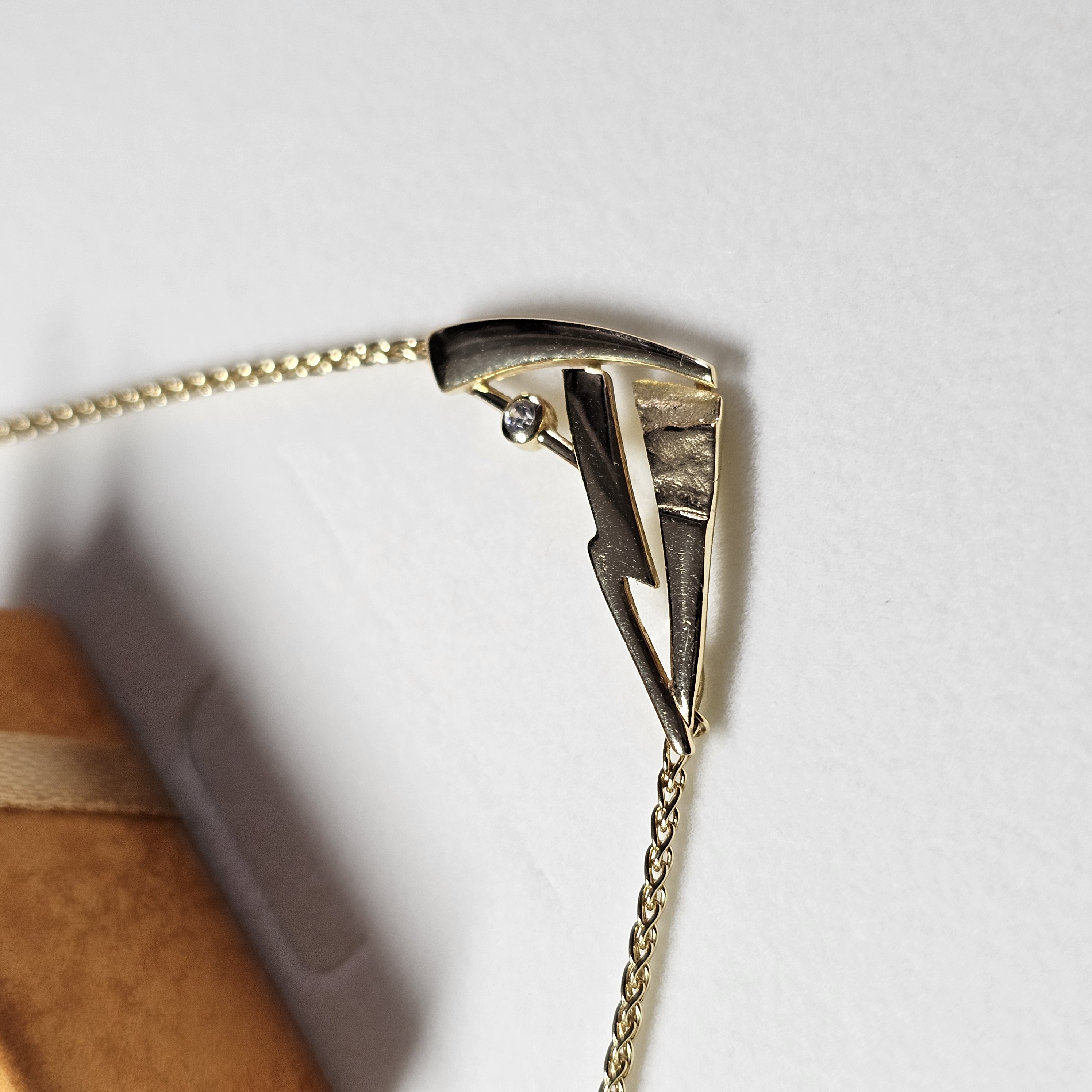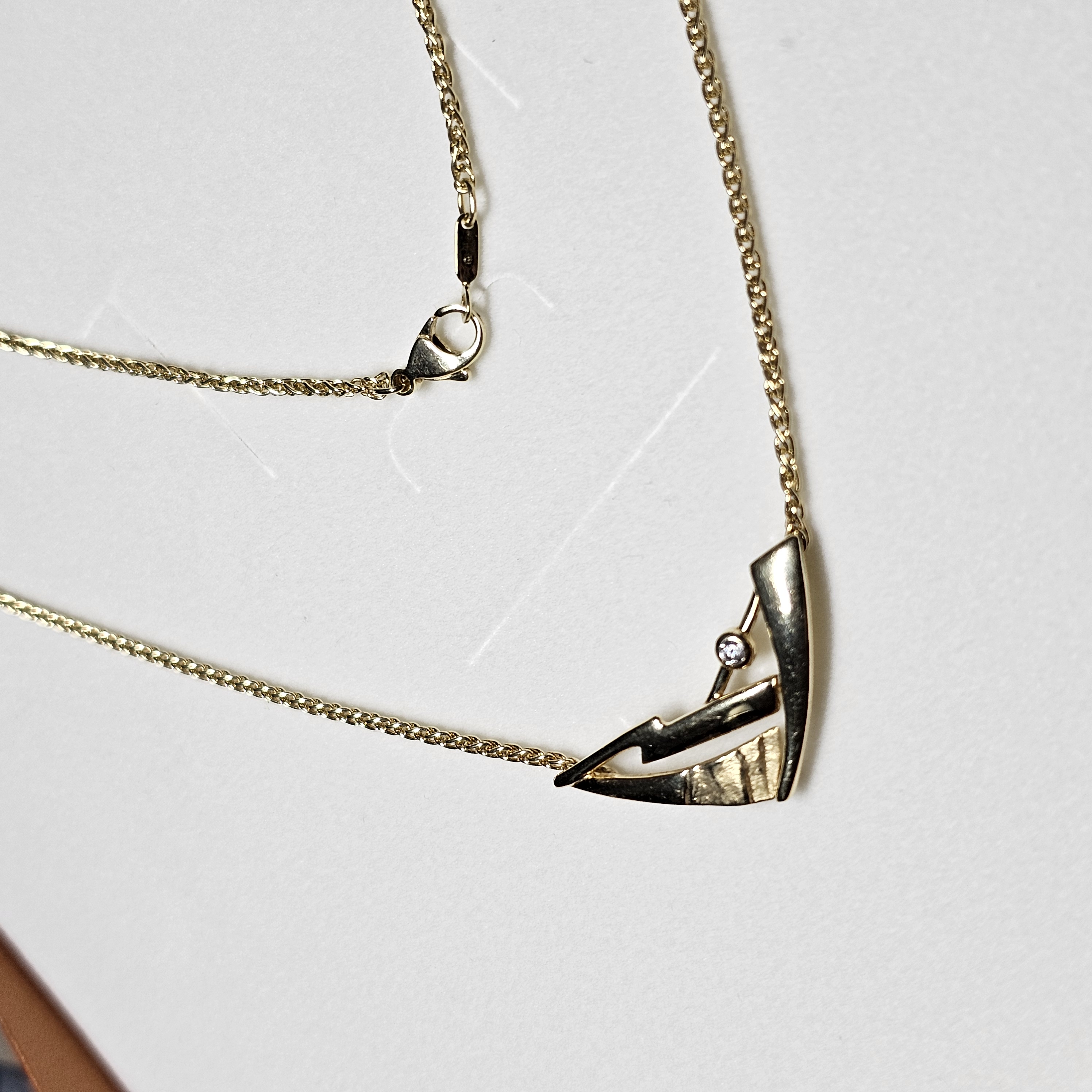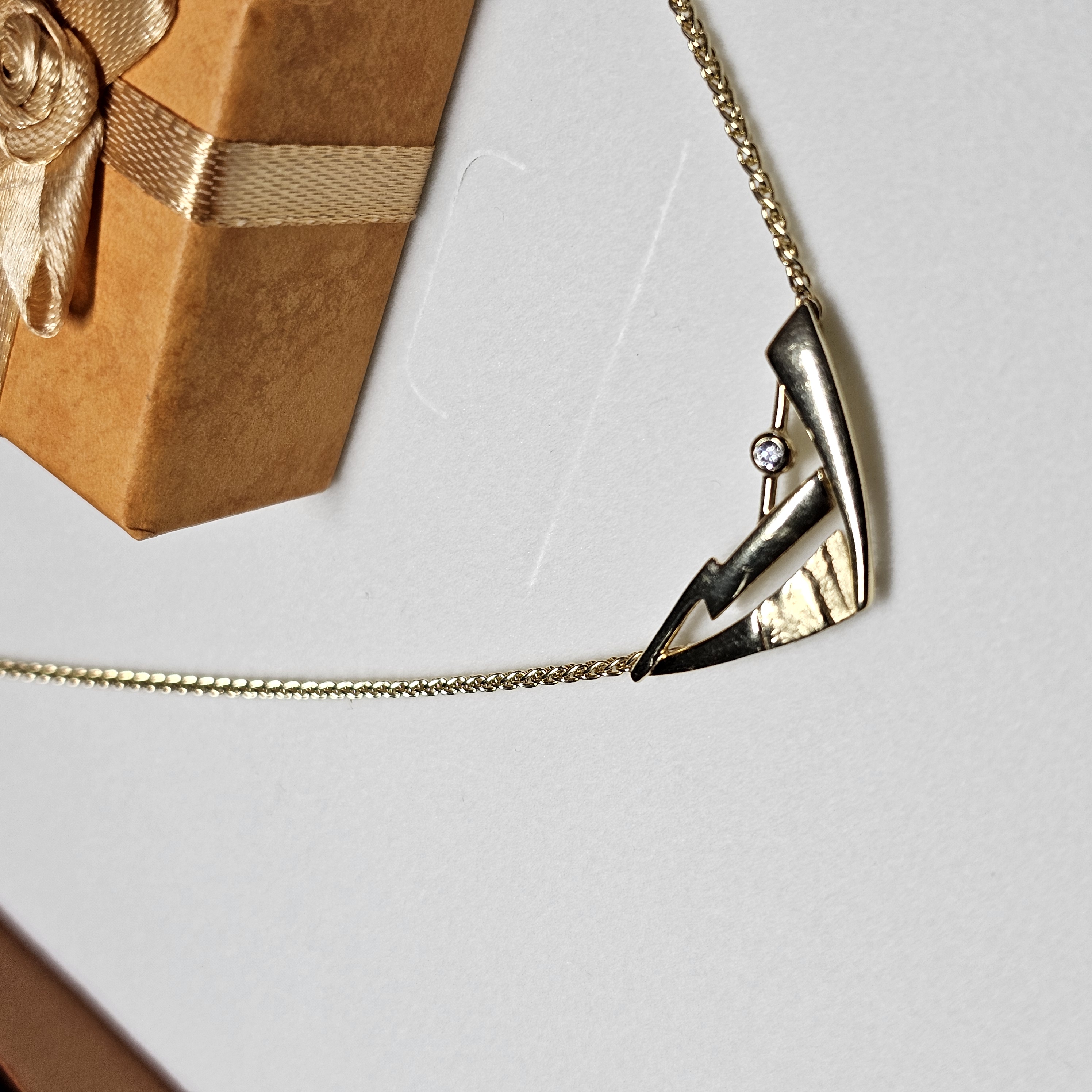 Tolle Kette / Halskette Gold 375, der eingearbeitete Anhängerteil ist elegant gestaltet. Schönes, teils durchbrochenes Design und mit einem kleinen klaren Kristallsteinchen verziert.