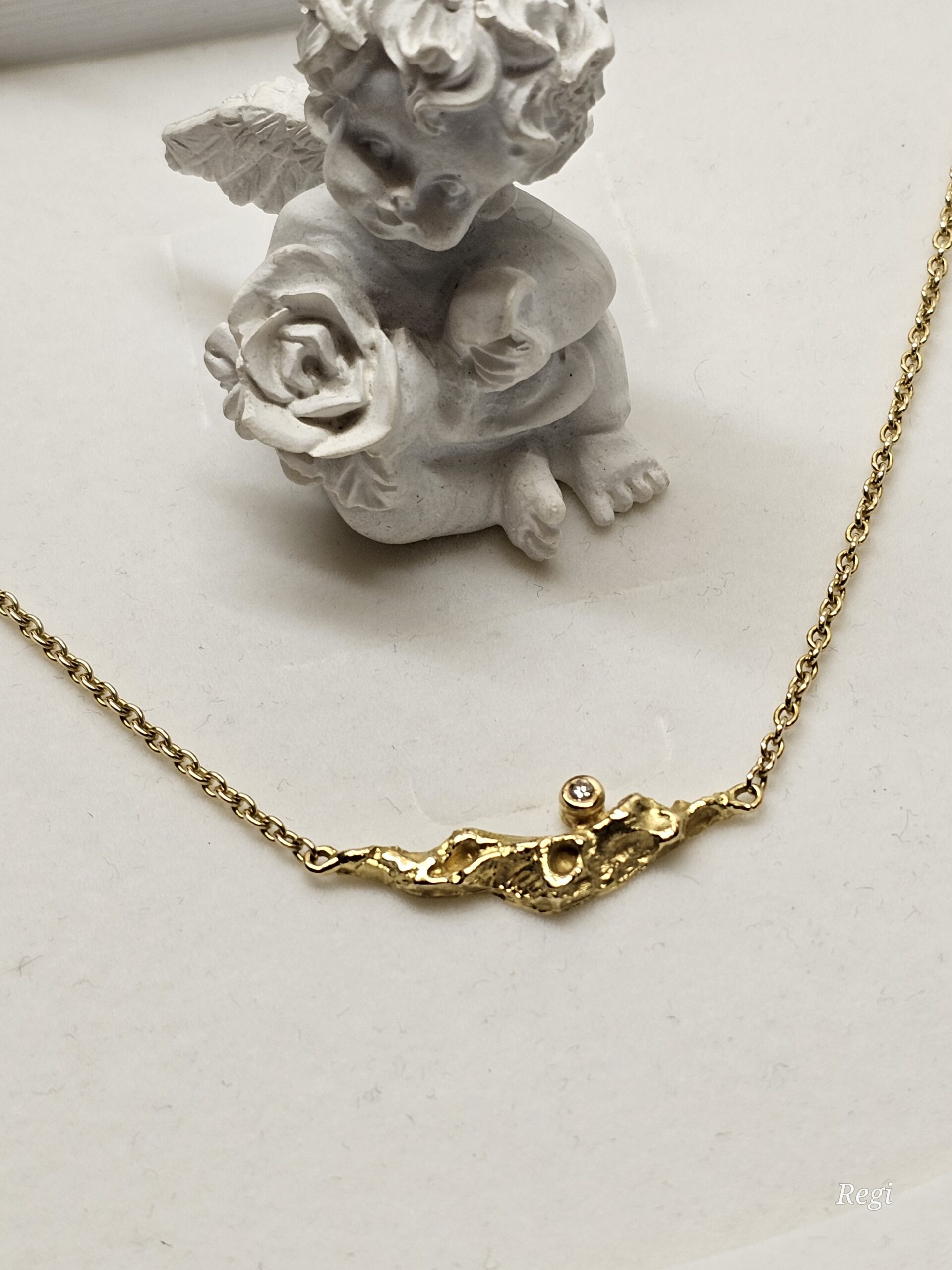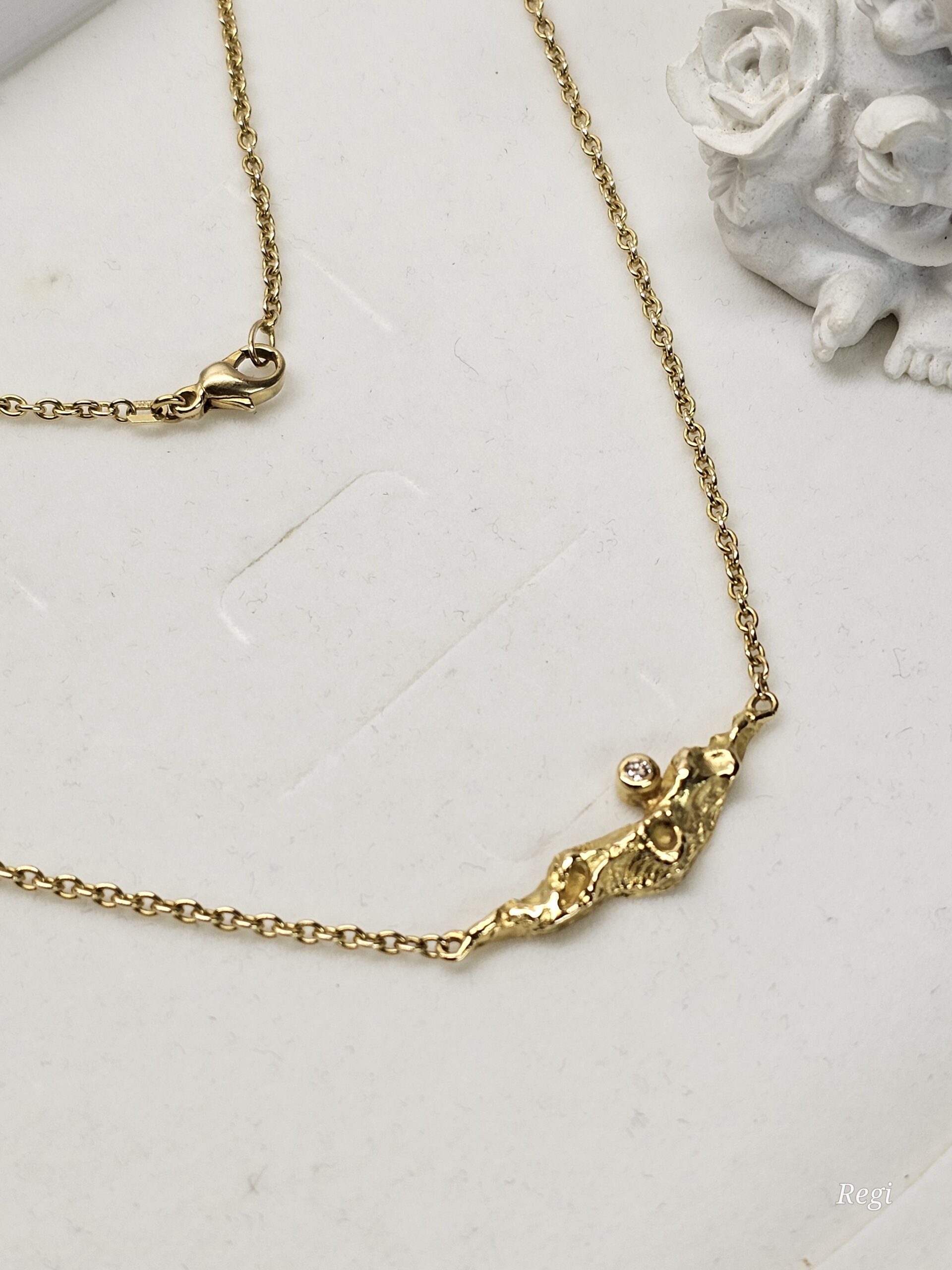 Elegante Ankerkette / Halskette mit einem kunstvoll gestalteten Anhängerteil. Mittig ist das Mittelstück mit einem kleinen Diamantsteinchen geschmückt.