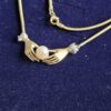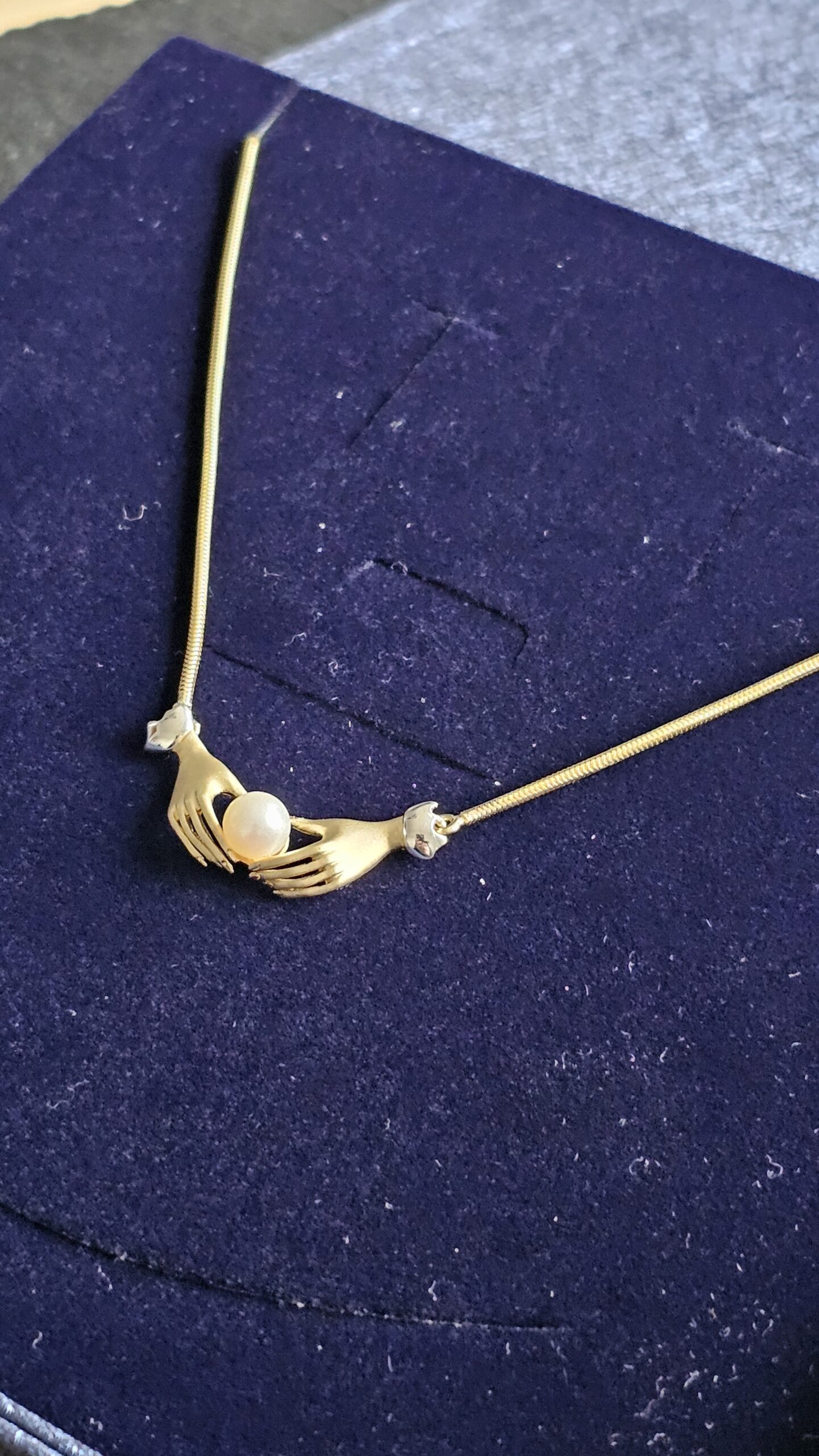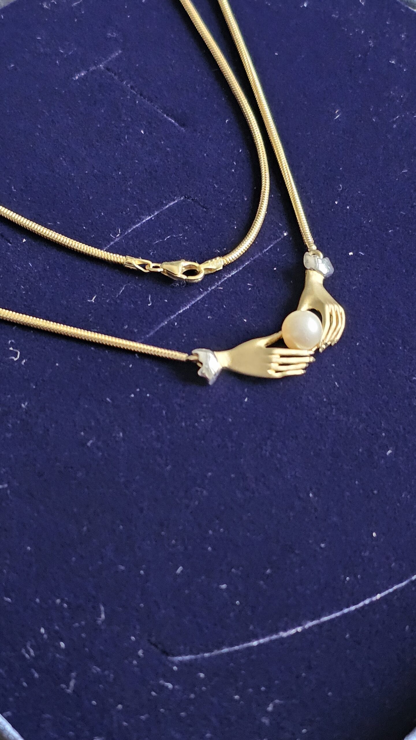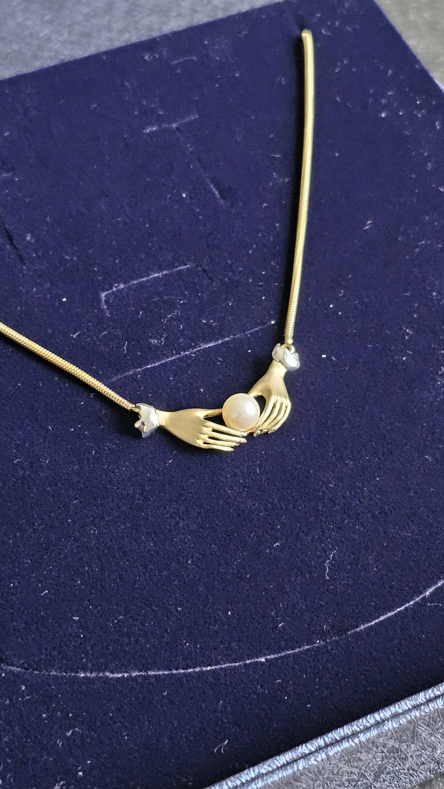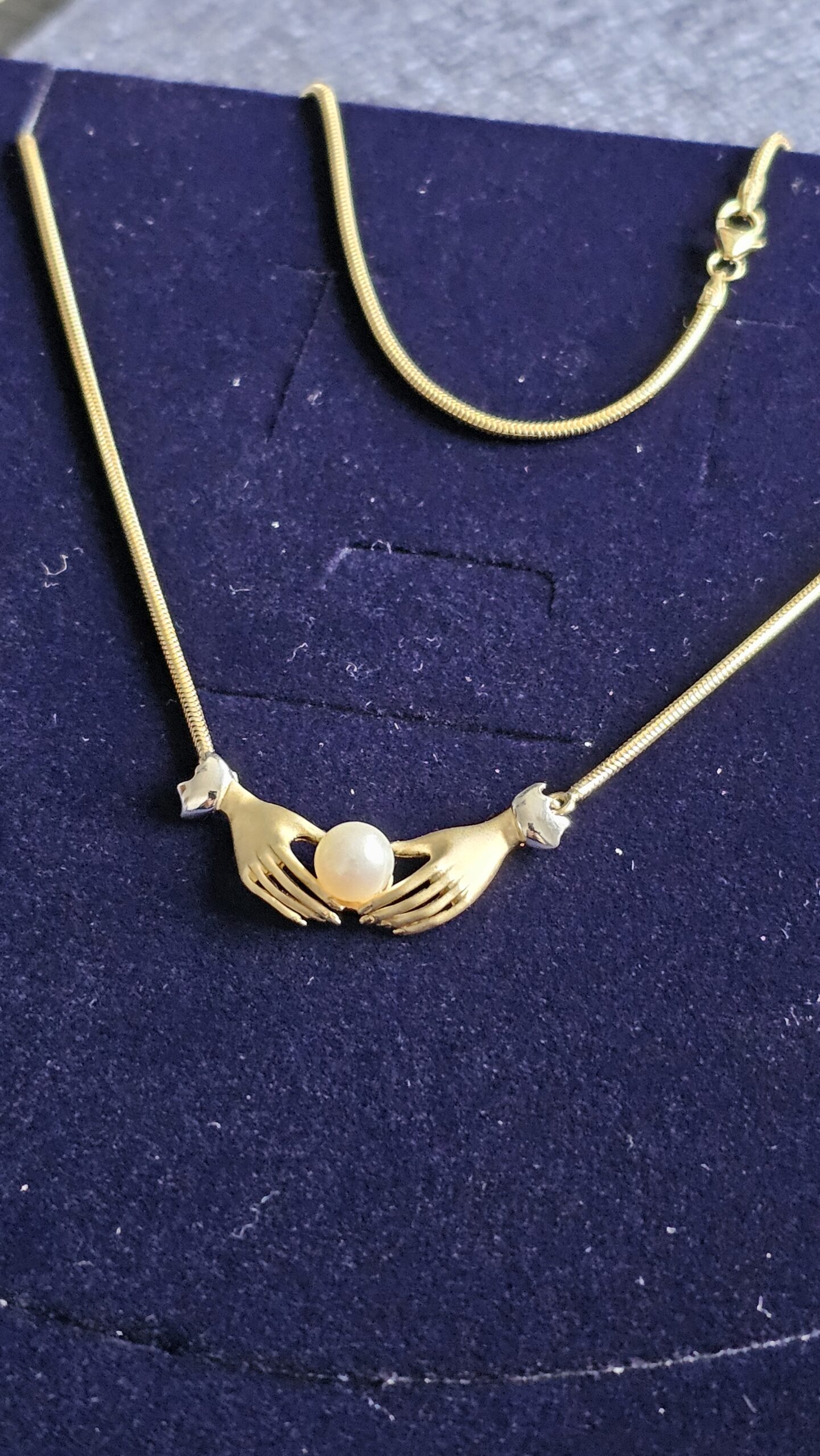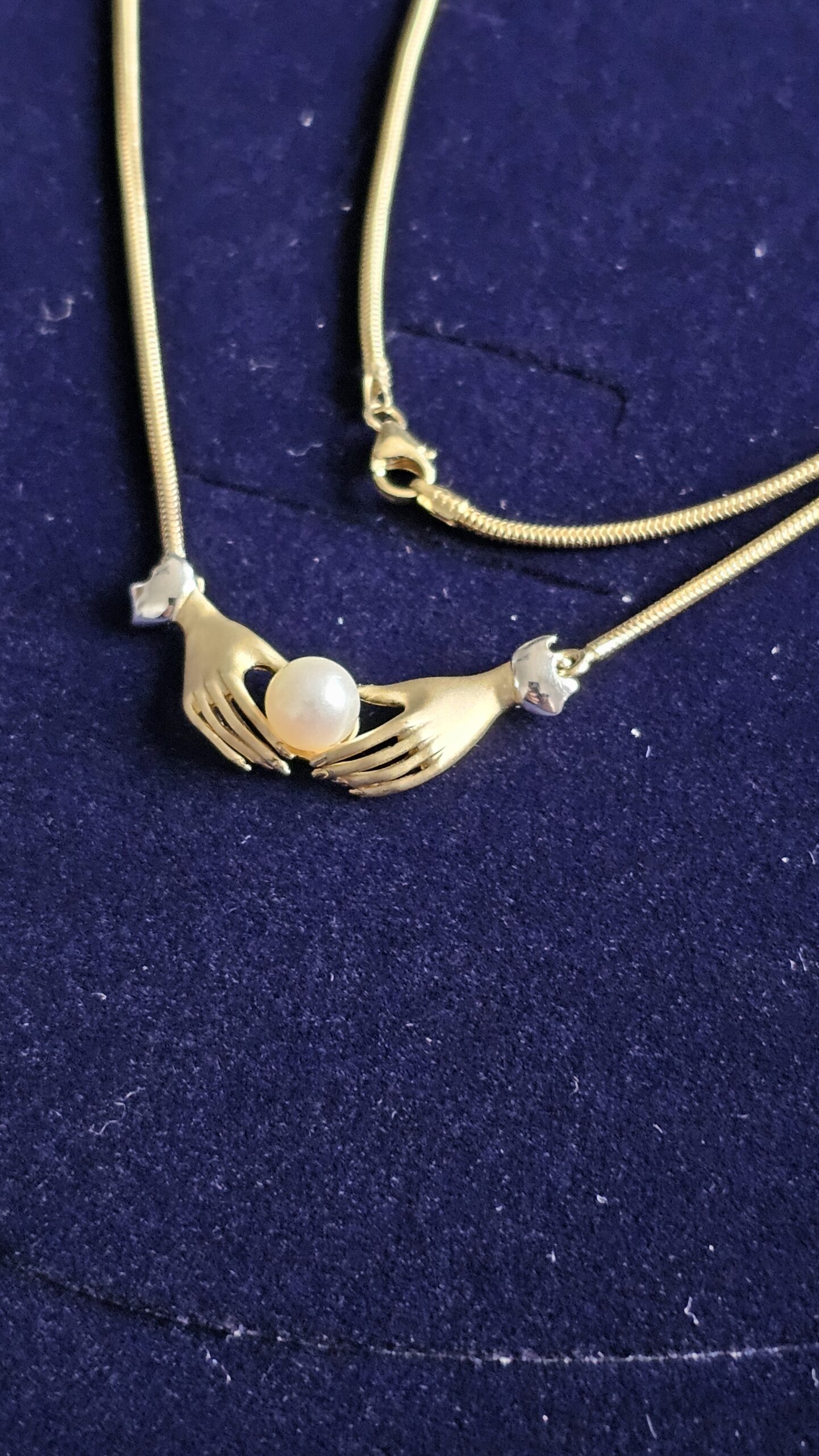 Tolle Halskette / Collier aus Gold 333. Der schöne Anhängerteil ist an den Handgelenken teilplatiniert trägt mittig eine Perle.