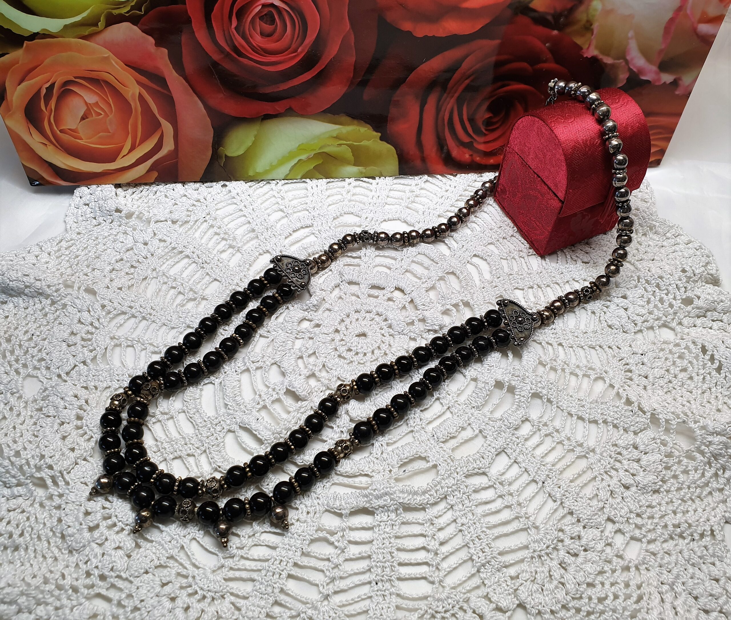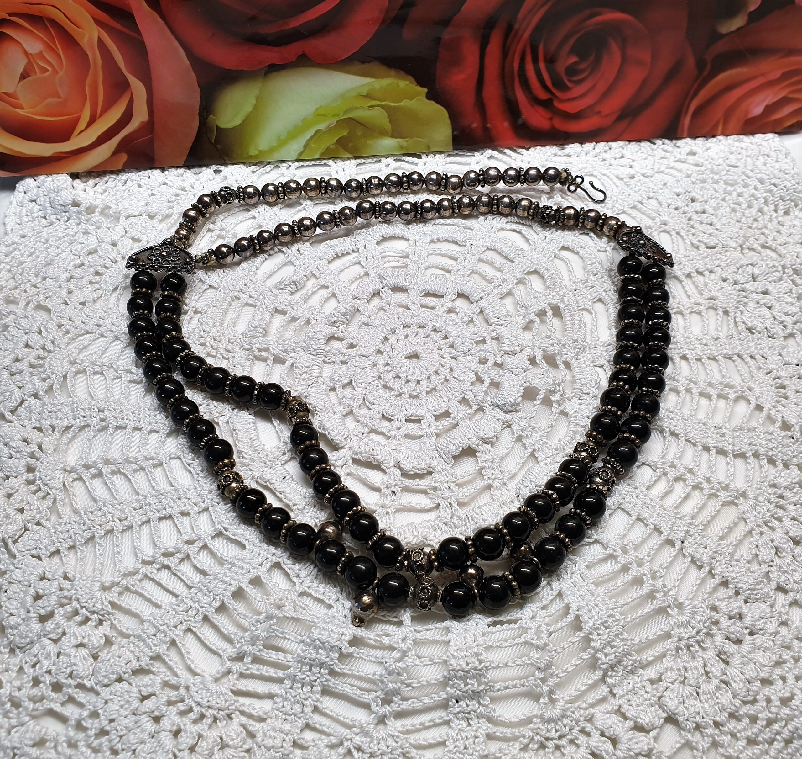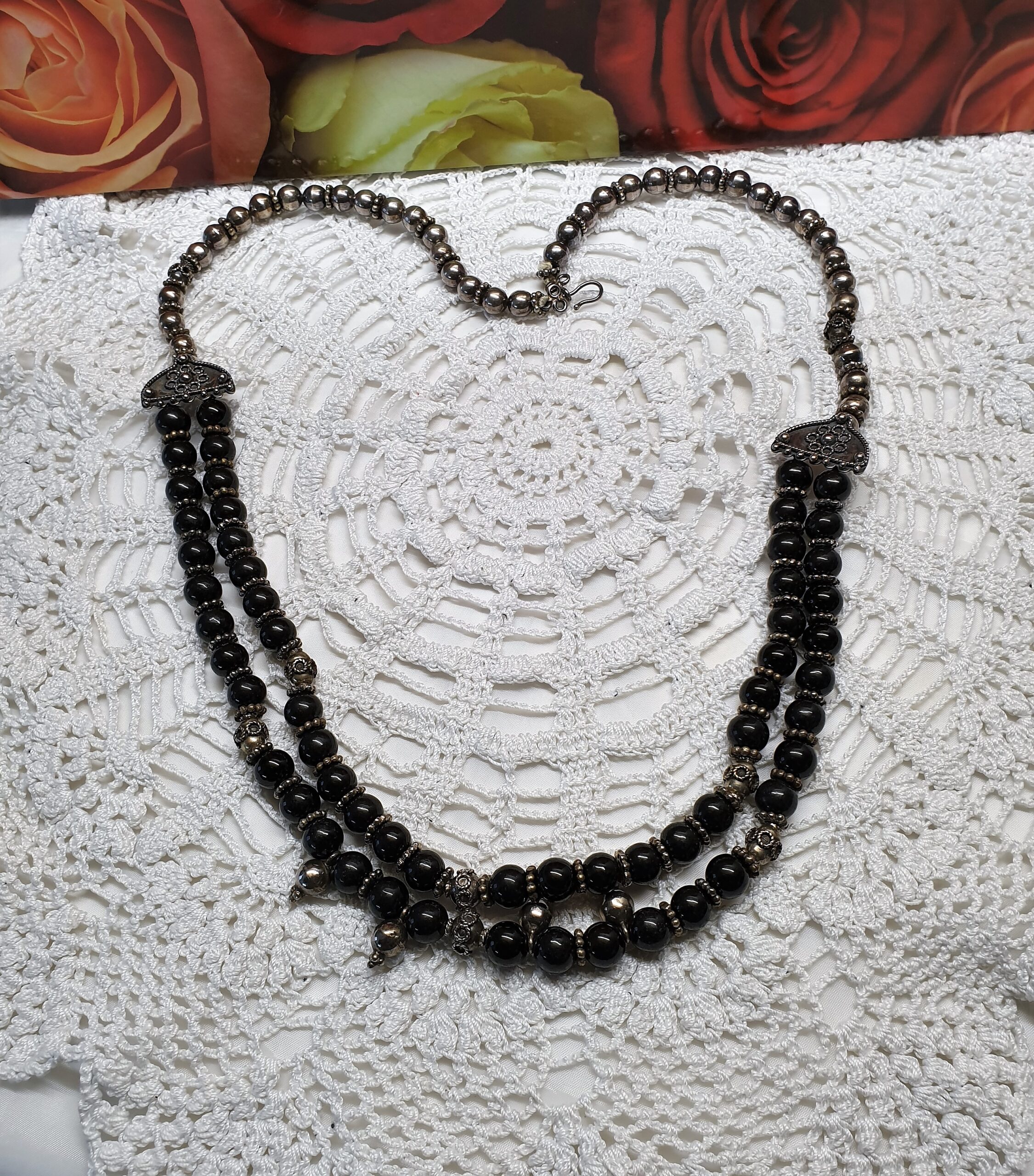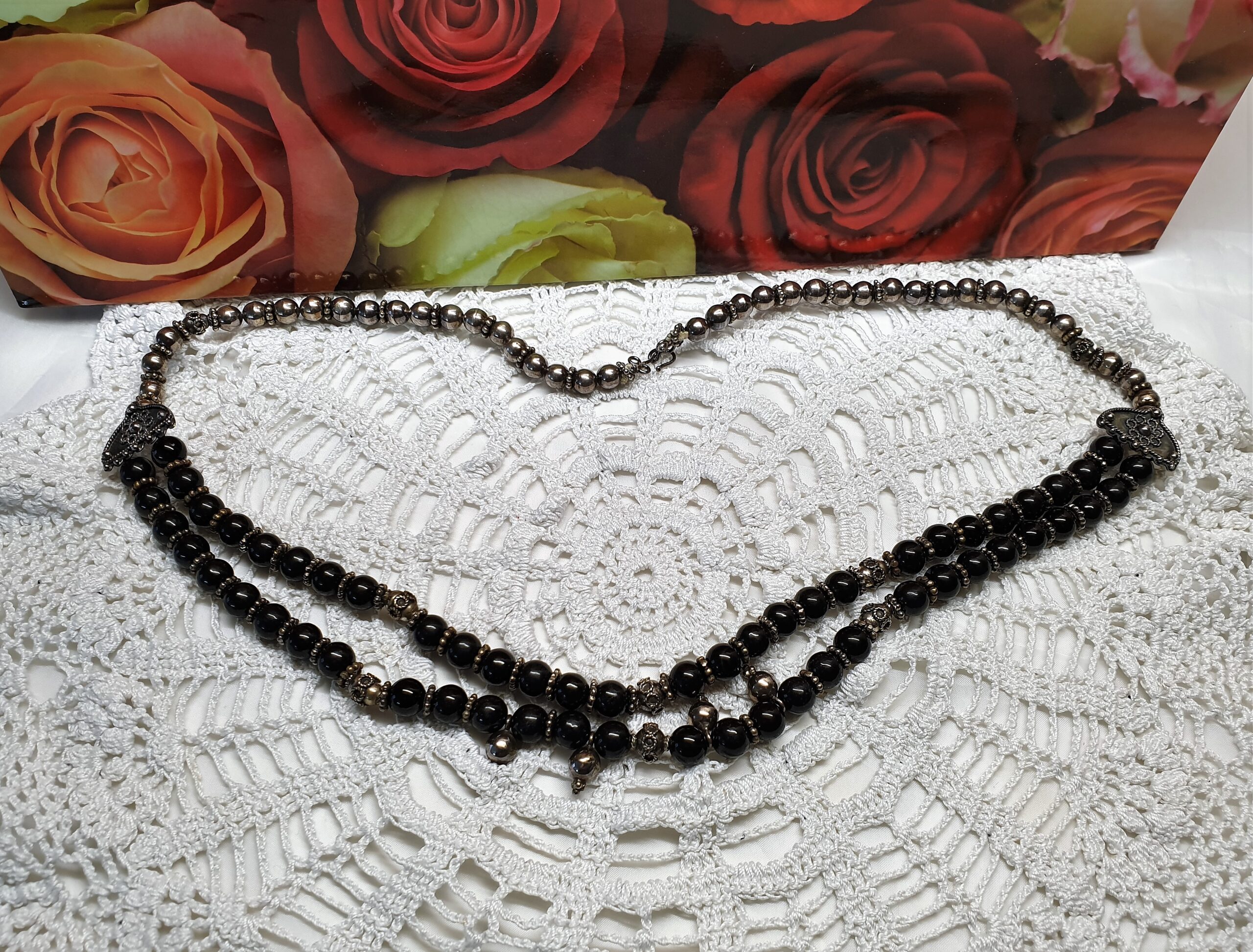 Sehr schöne Halskette mit schwarzen Achat und silbernen Perlen und silbernen Zwischenstücken.