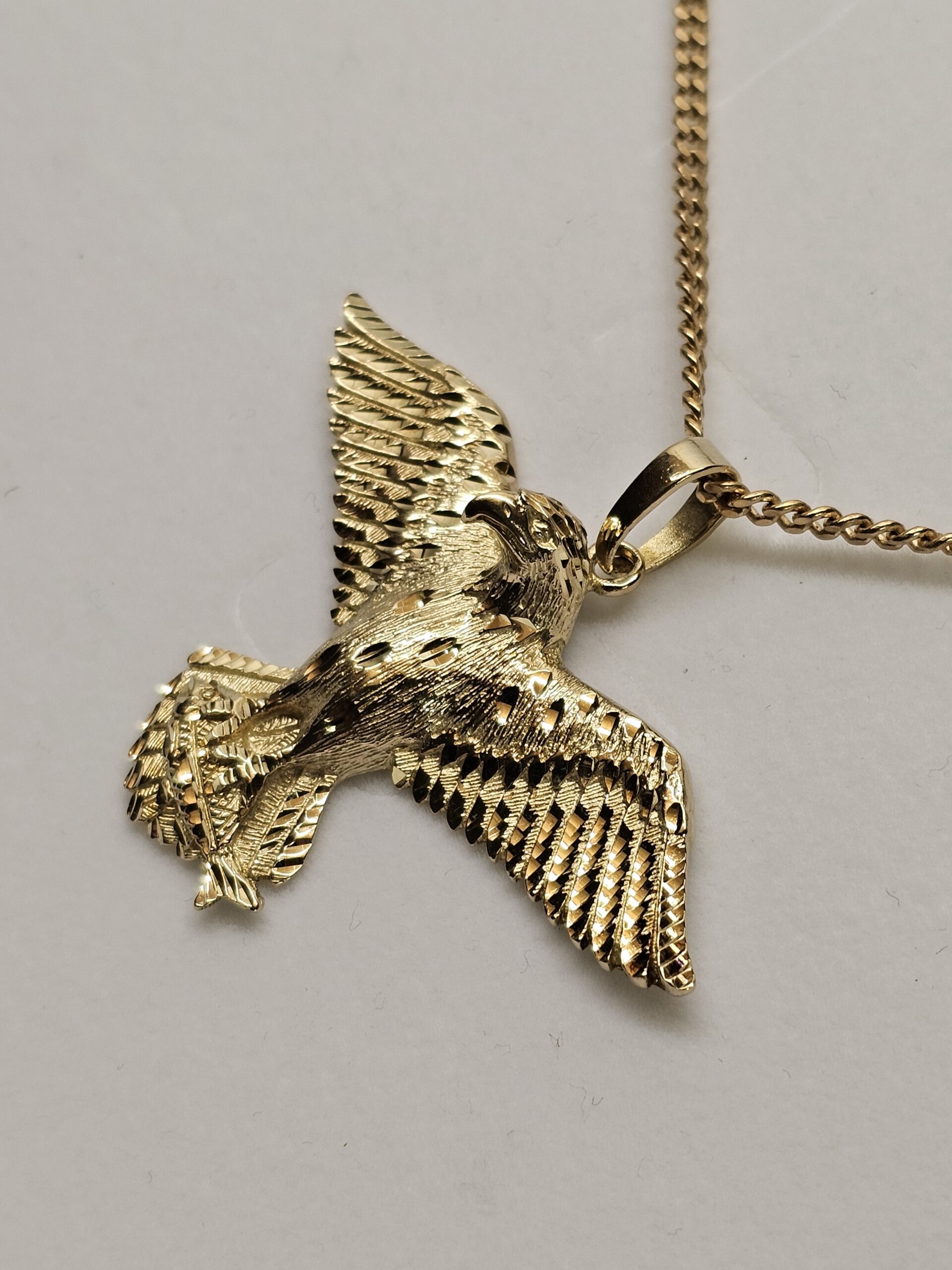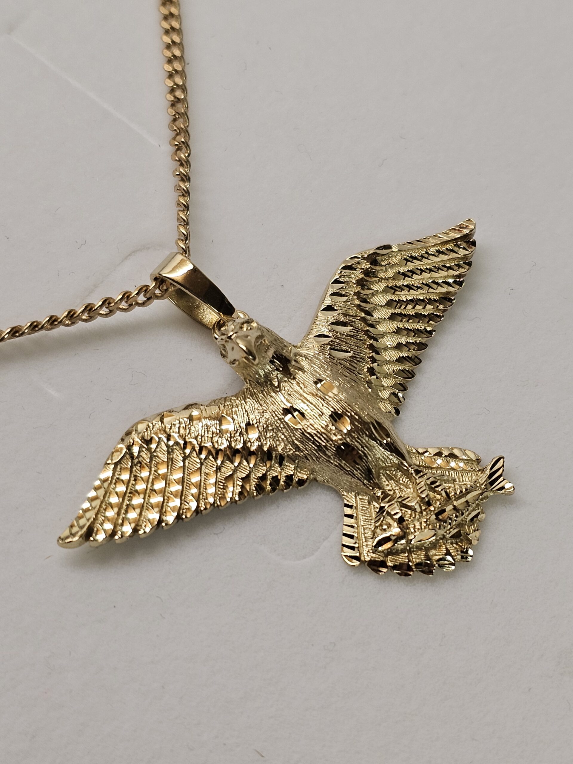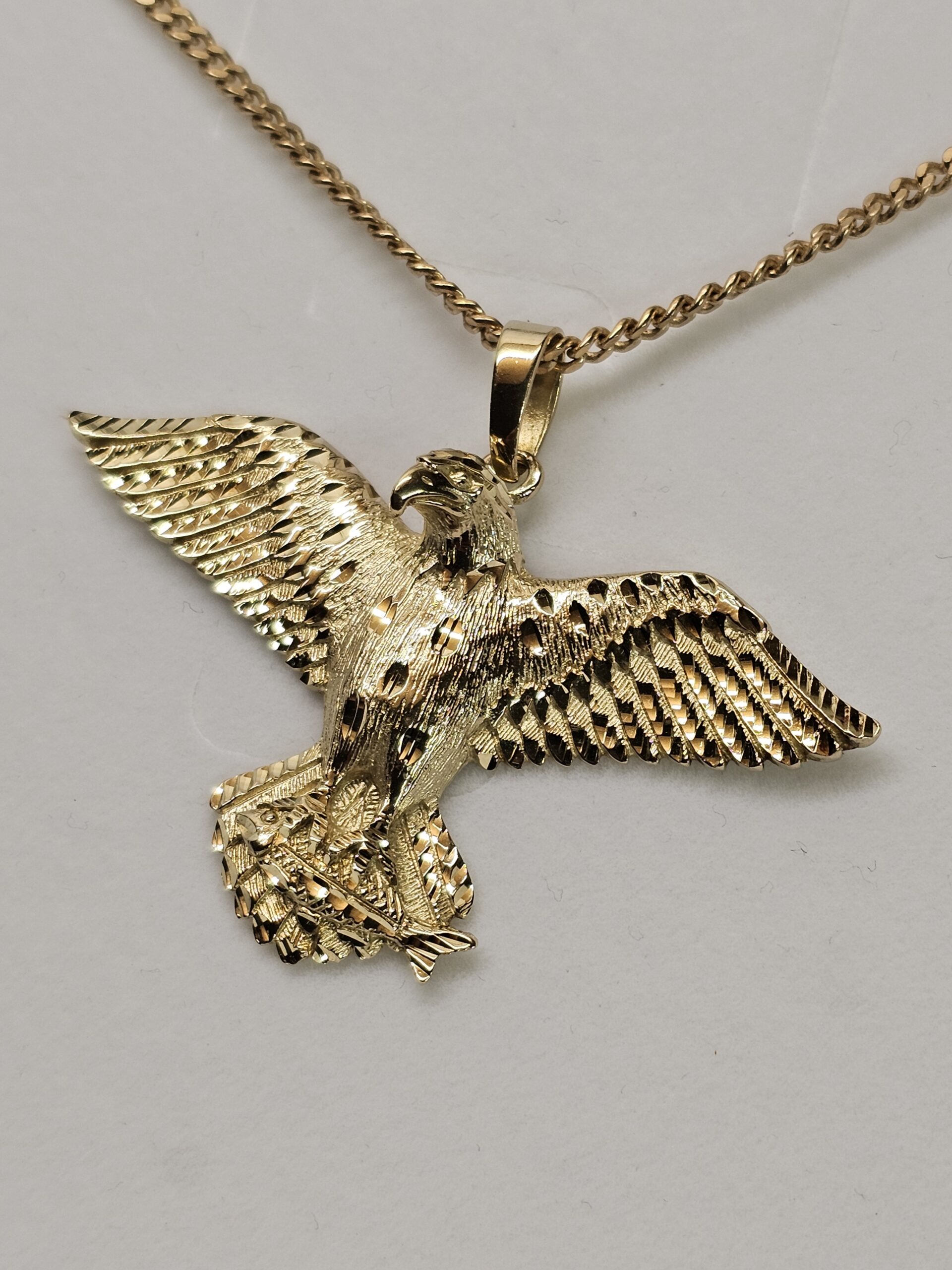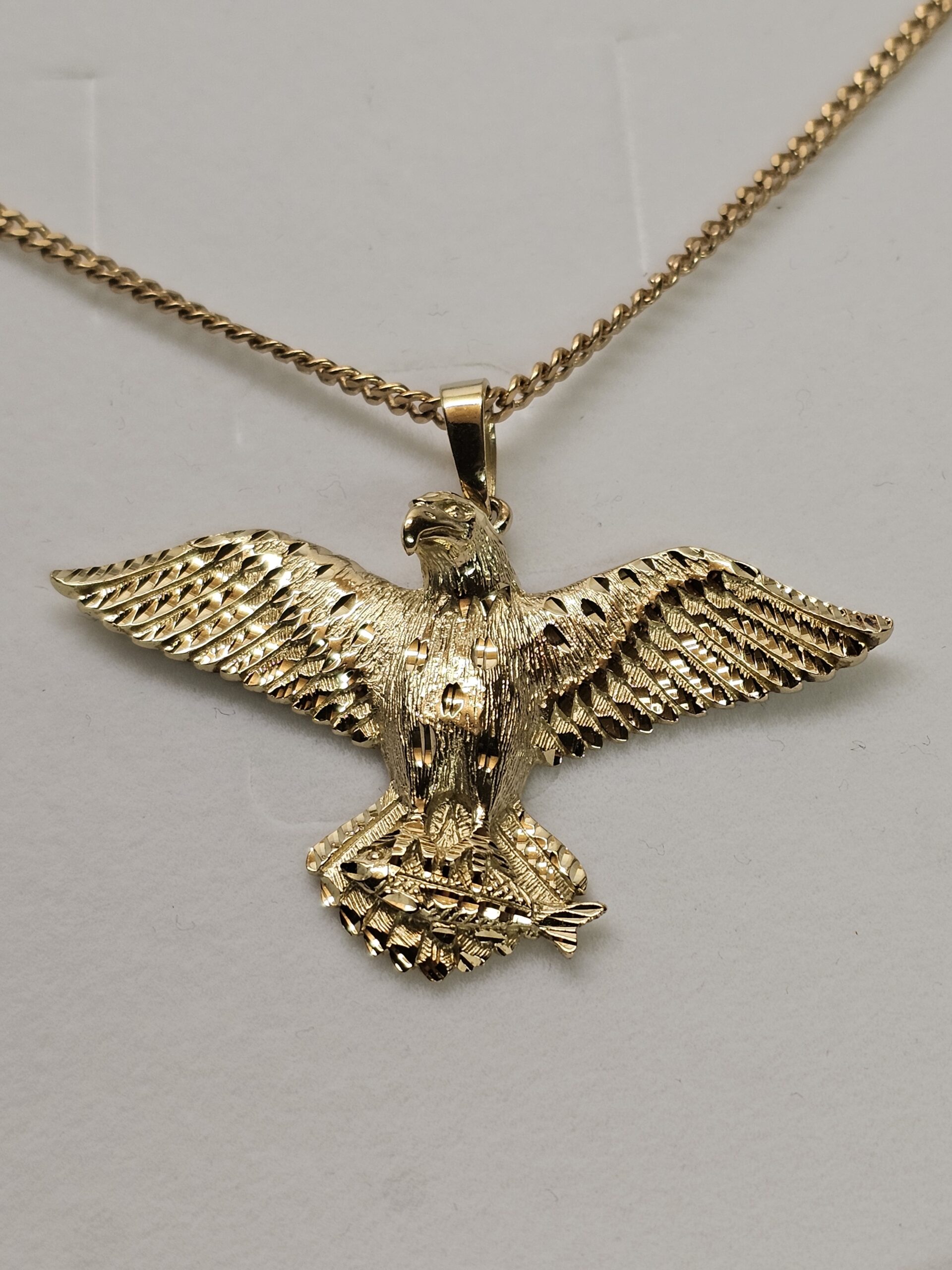 Toller Goldanhänger Adler / Seeadler mit Fisch. Gefertigt ist das schöne Schmuckstück aus Gold 333. Im Vorderteil ist die detailgetreue Gestaltung mit teils diamantiertem Schliff geschmückt, was dem Schmuckstück einen tollen Effekt verleiht. Der Anhänger ist einseitig mit Motiv tragbar.