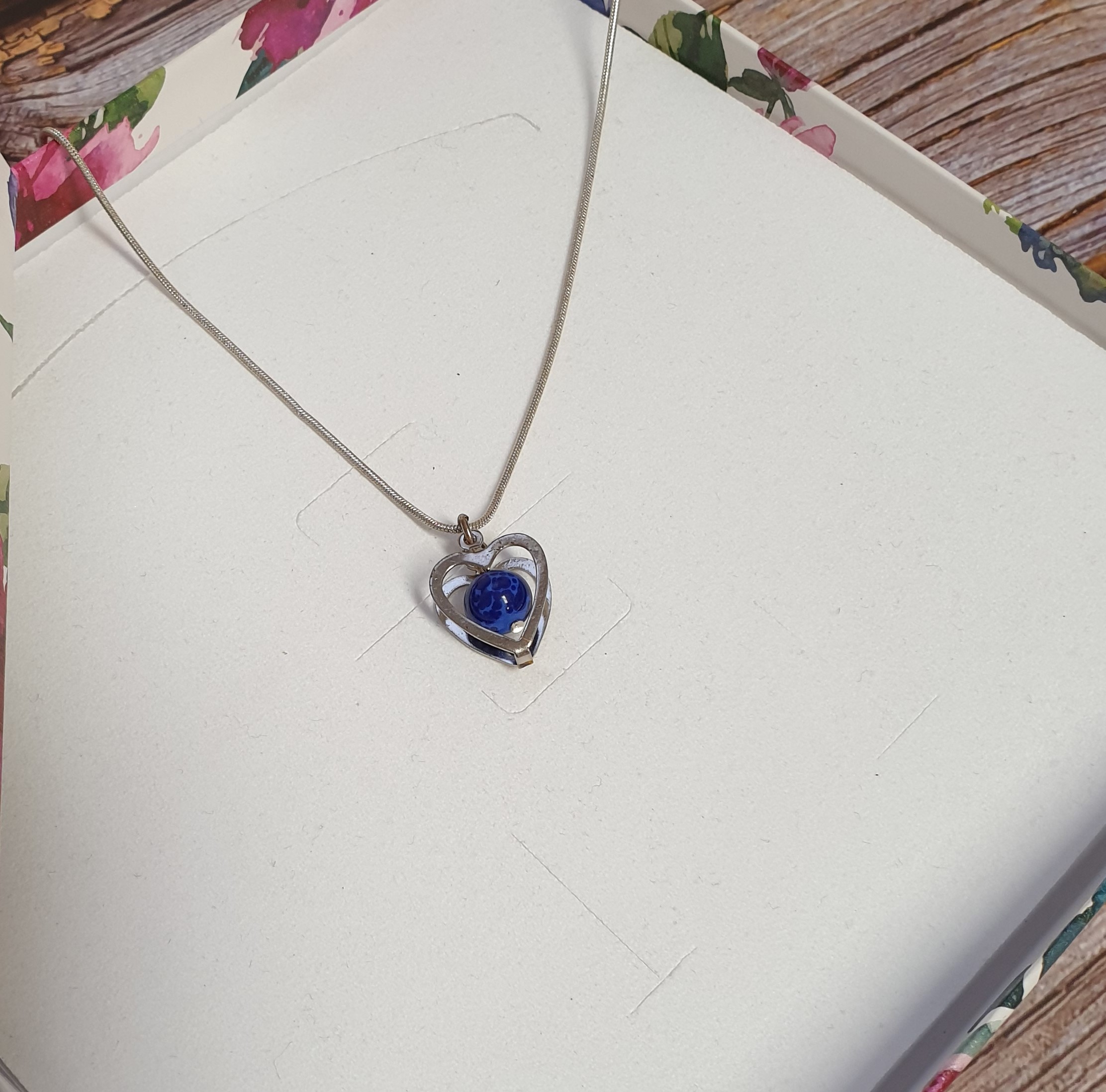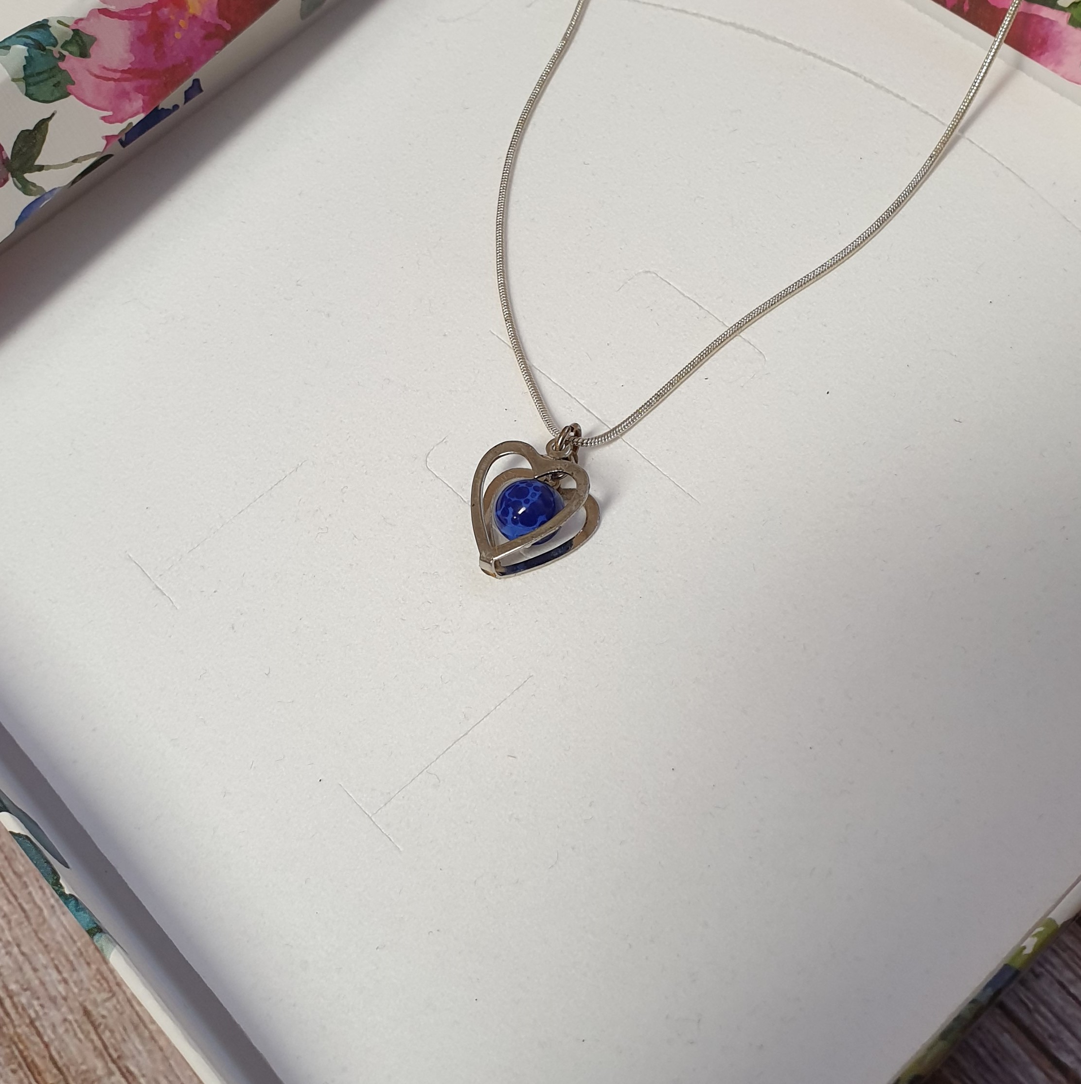 Ein toll designtes Schmuckstück ist dieser Herzchen Anhänger mit einer hellblau/dunkelblau gesprenkelten Kugel mittig.