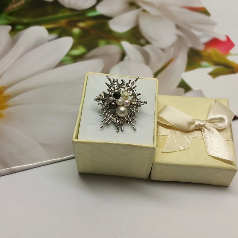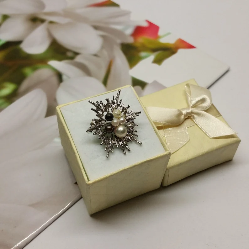 Schöner Shabby-Vintage-Kettenschieber aus Silber 835. Verziert ist er mit 2 grauen und 4 weißen Perlen.