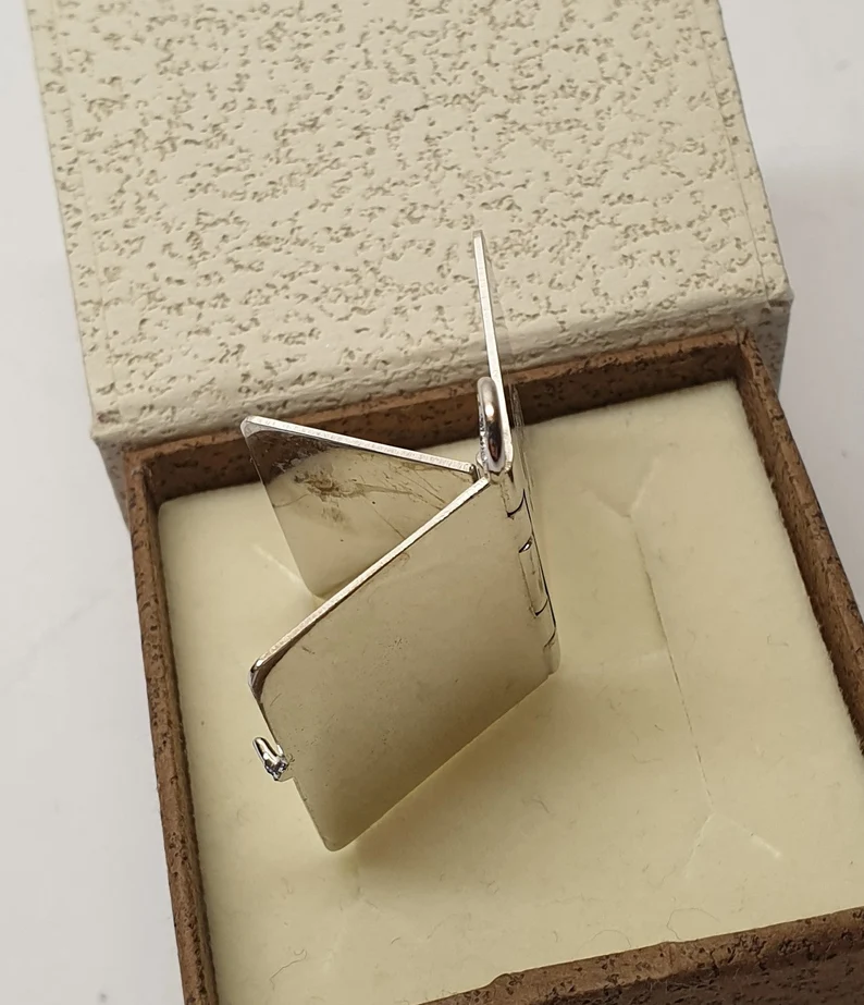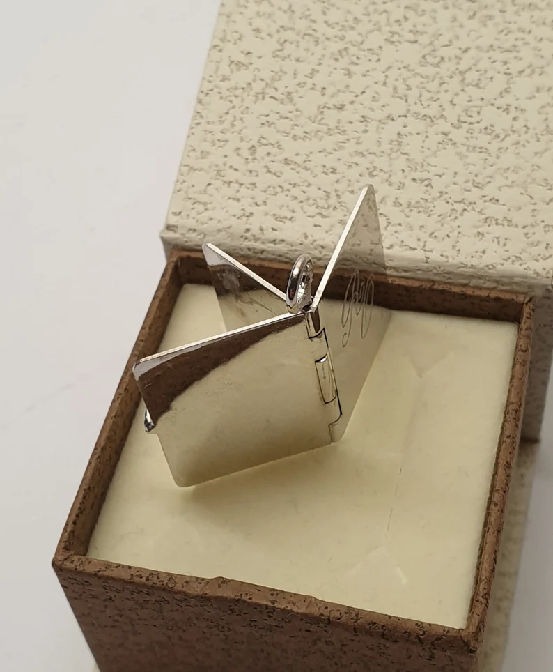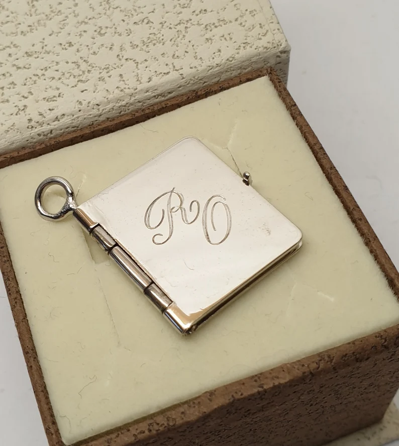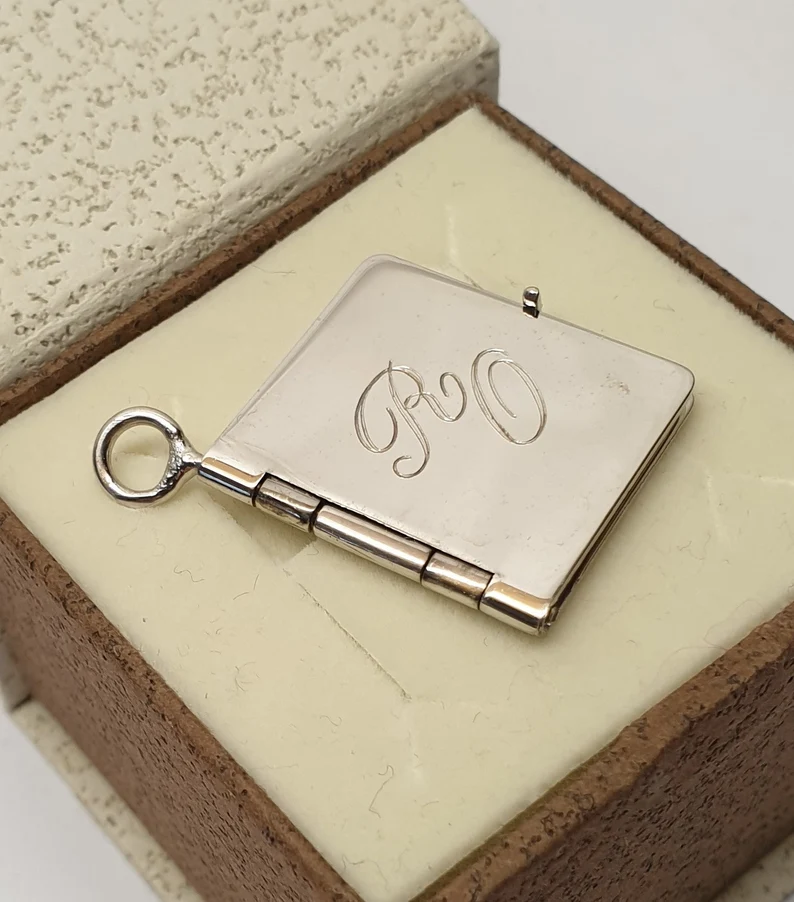 Hübsches Medaillon in Form eines Buches, mit den Buchstaben / Initialen „RO“ auf der Vorderseite.
