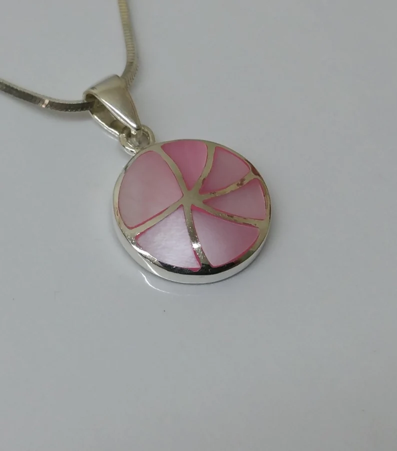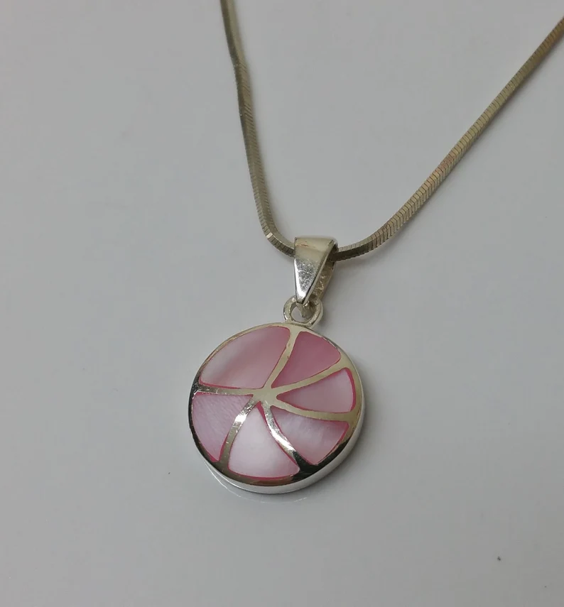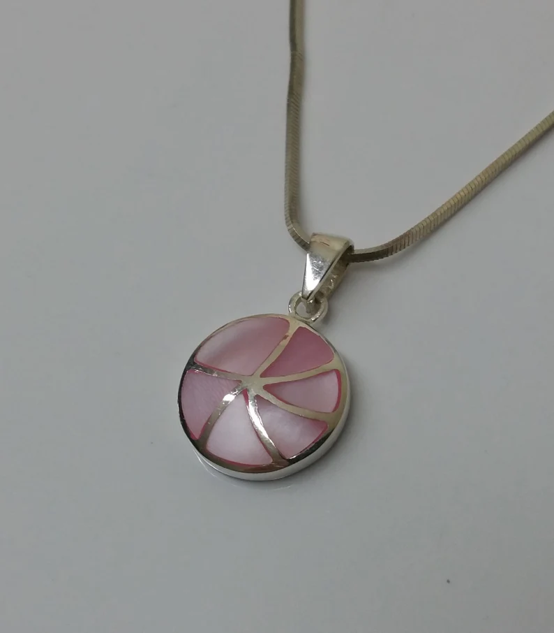 Schöner Anhänger mit rosa Perlmutt-Einlage in Form einer Spirale.