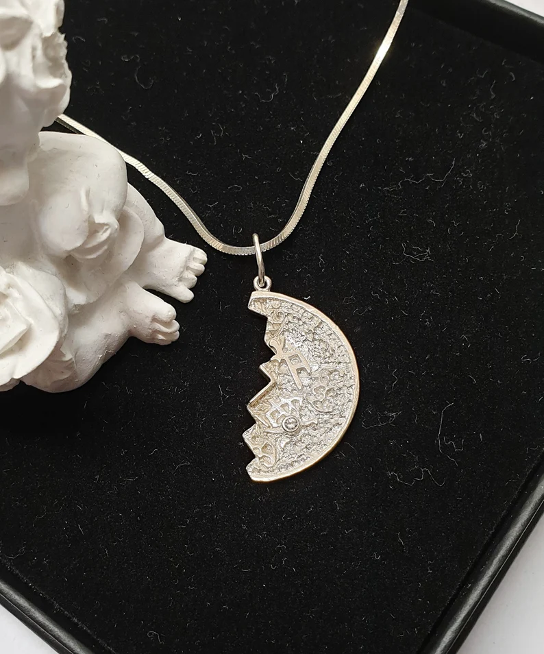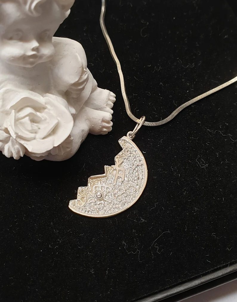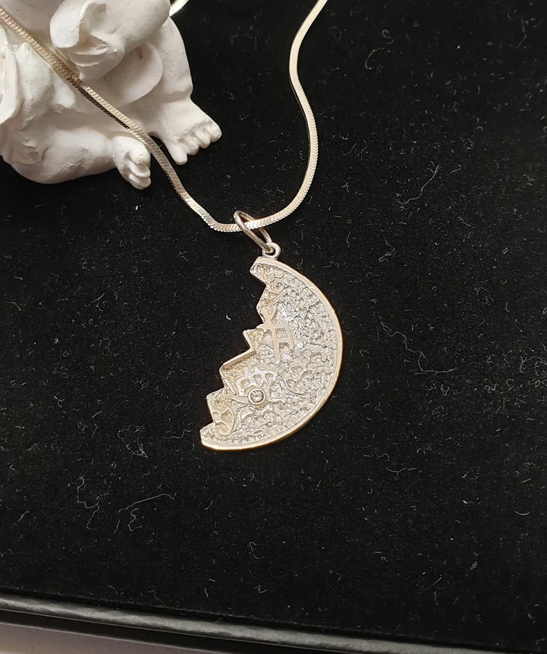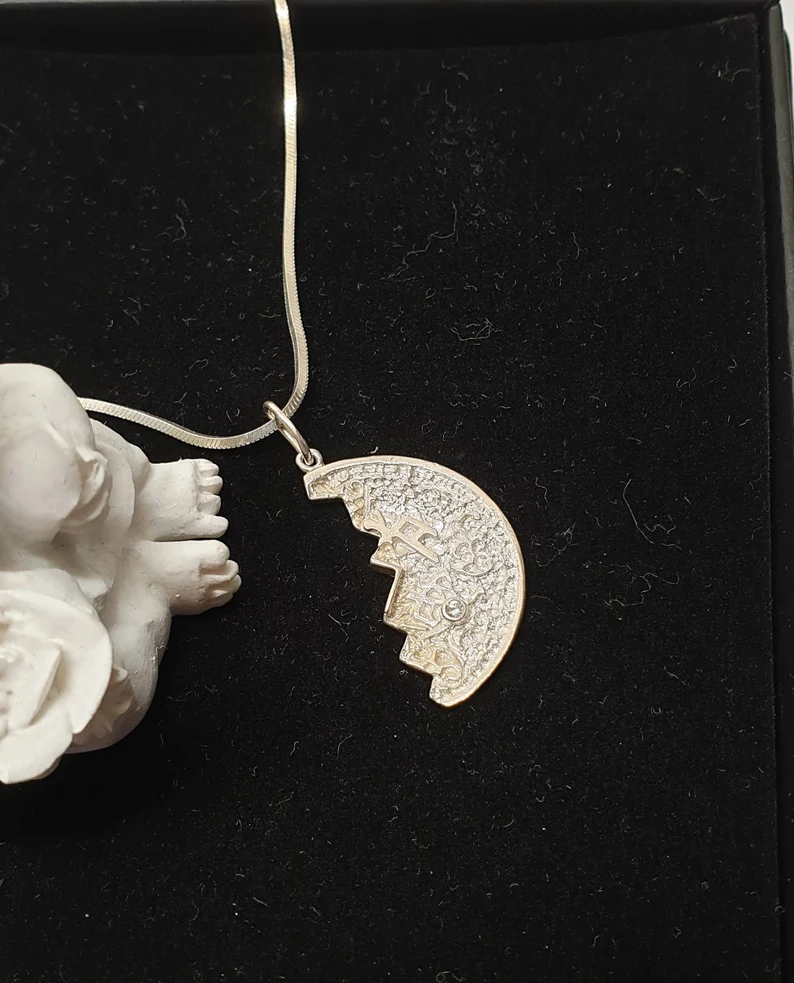 Schöner Anhänger Halbkreis mit ausgefranstem Rand. Das schöne Stück ist aus Silber 925 gefertigt und ist mit einem kleinen Kristallsteinchen geschmückt.