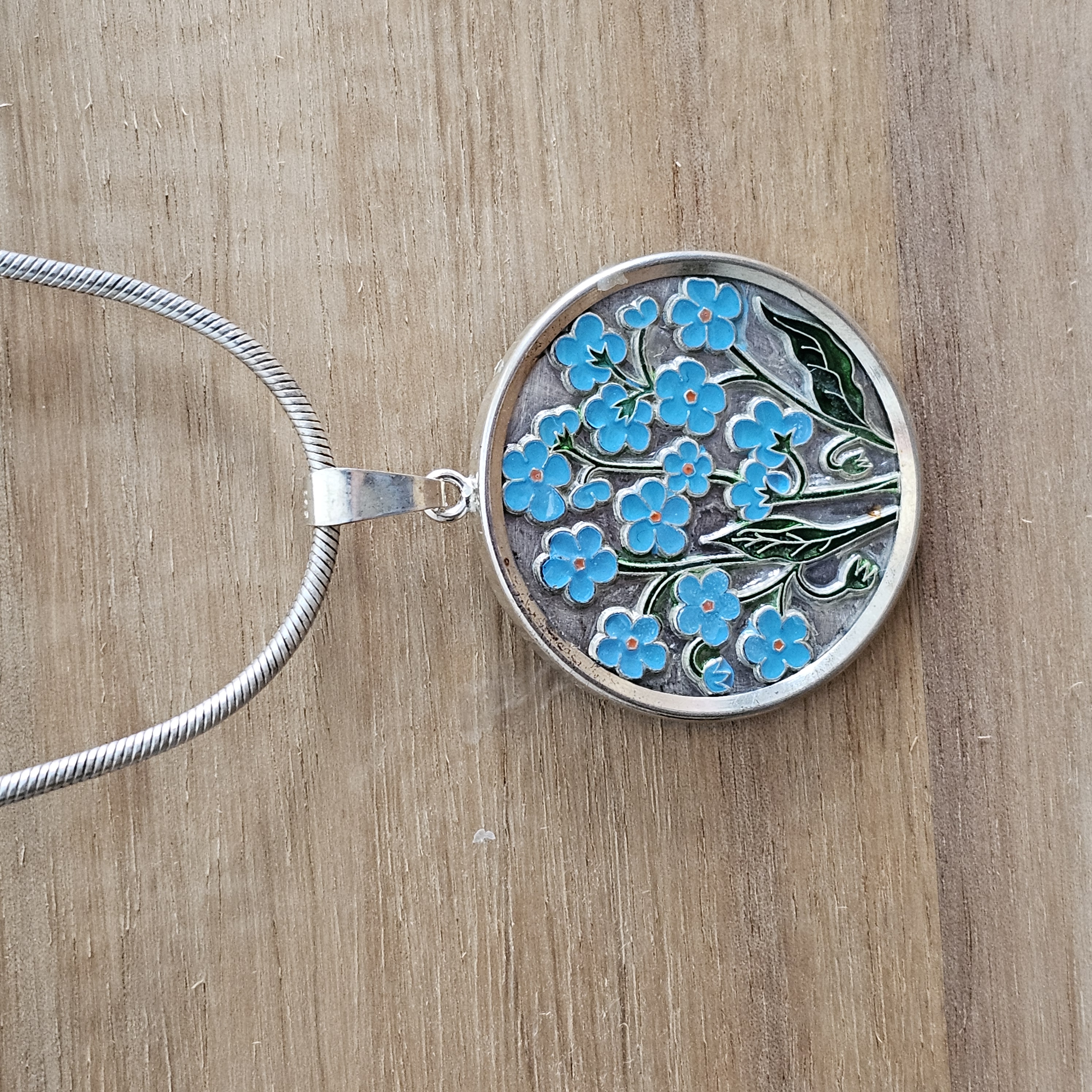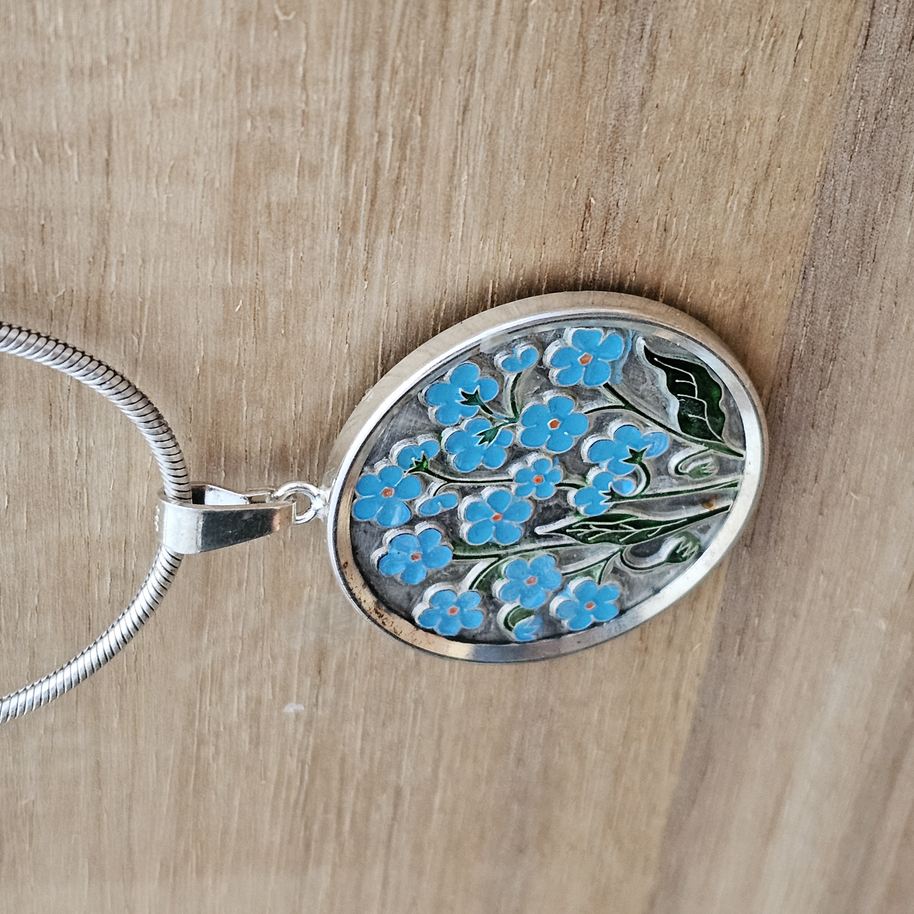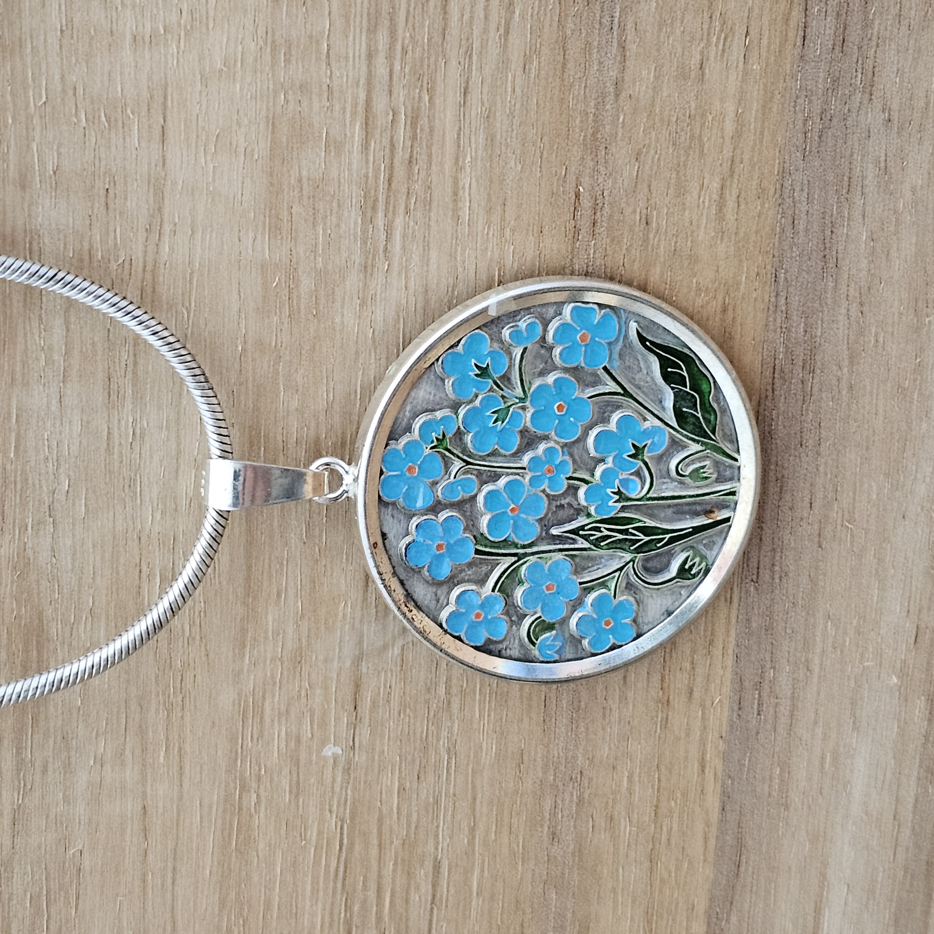 Vintage-Anhänger aus Silber 925. Hübsche Vergissmeinnicht aus Emaille schmücken dieses einzigartige Schmuckstück. Massive Verarbeitung.