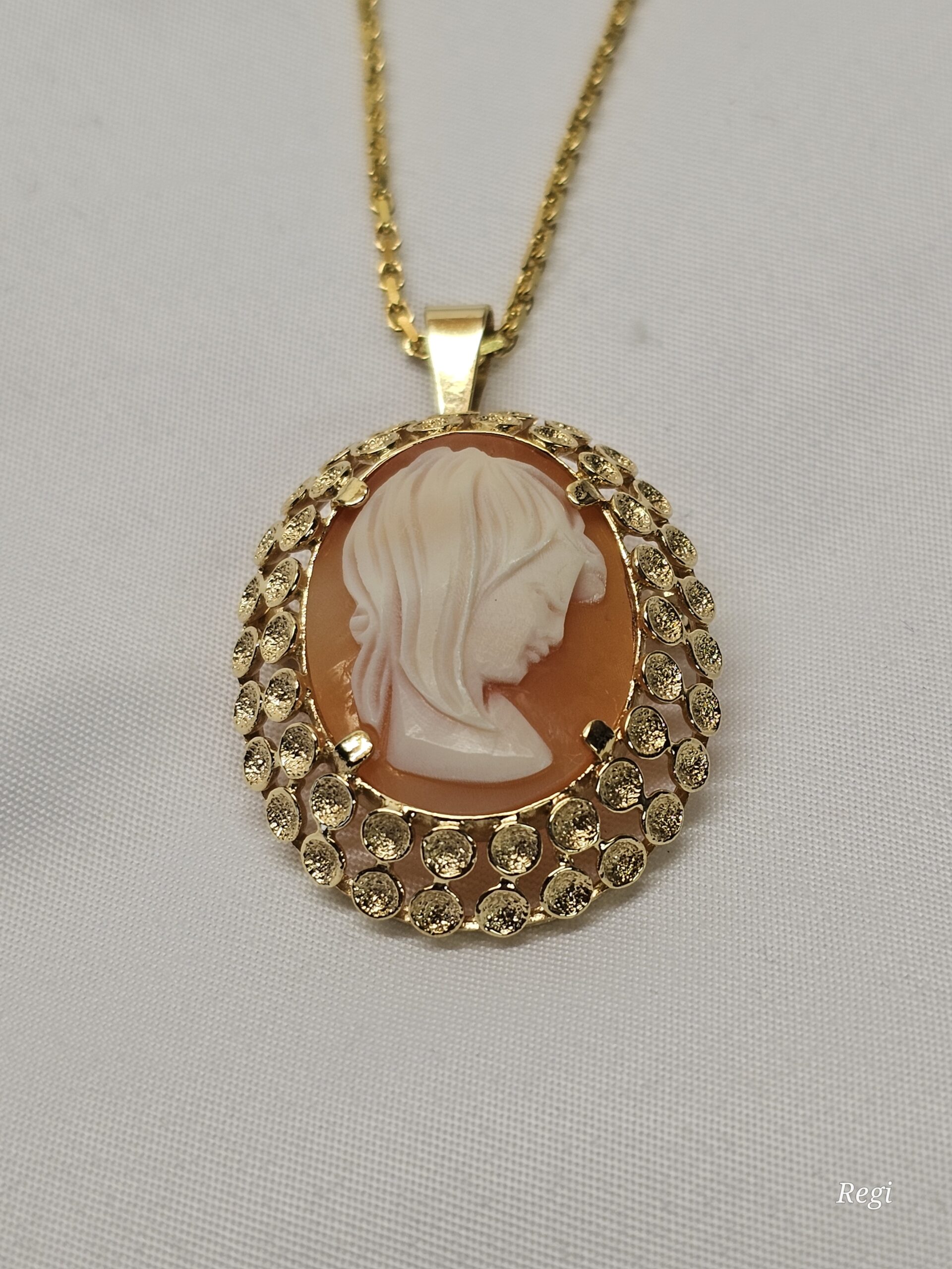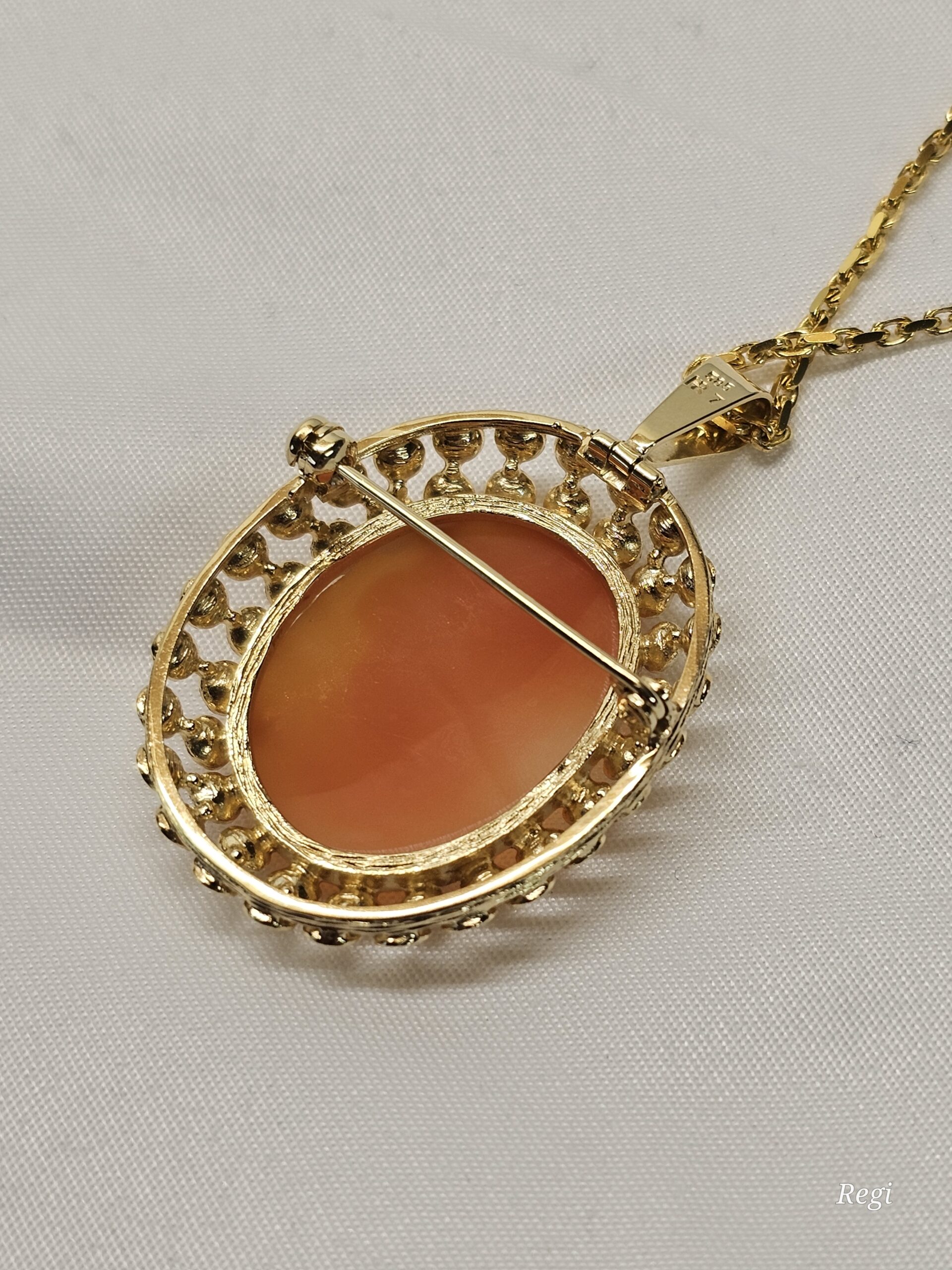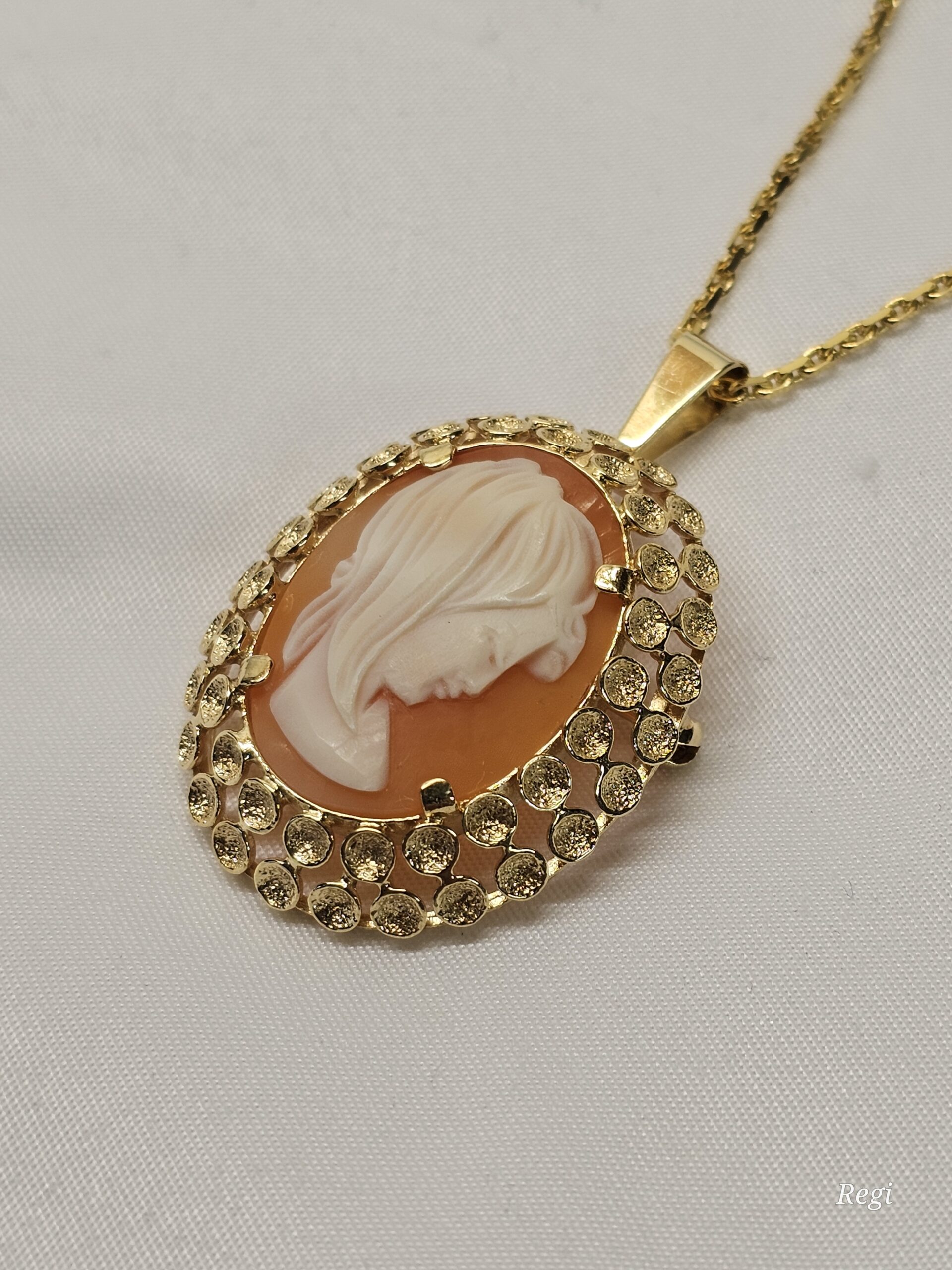 Ein bezaubernd schönes Vintageschmuckstück. Nostalgische Brosche / Anstecknadel Gold 585 mit einer wunderschönen Kammee / Gemme Frauenkopf / Frauenbüste. Das schöne Stück kann sowohl als Anhänger als auch als Brosche getragen werden. Durch die rückseitig angebrachte Nadel liegt das Schmuckstück beim Tragen als Anhänger wunderbar an.