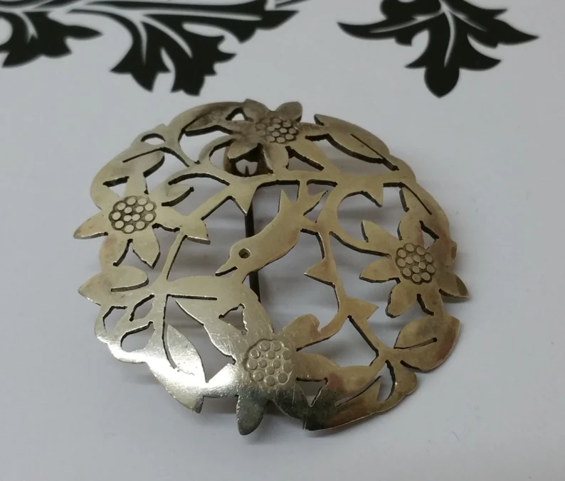 Sehr schöne, bezaubernde Shabby-Vintage-Brosche mit einem Vogel und Blumen.