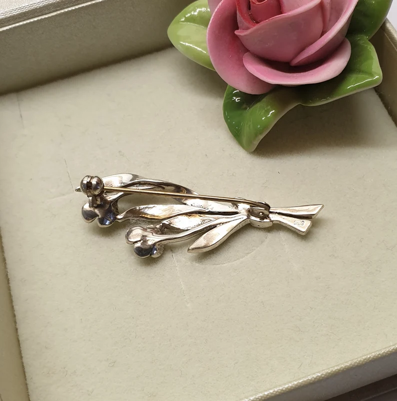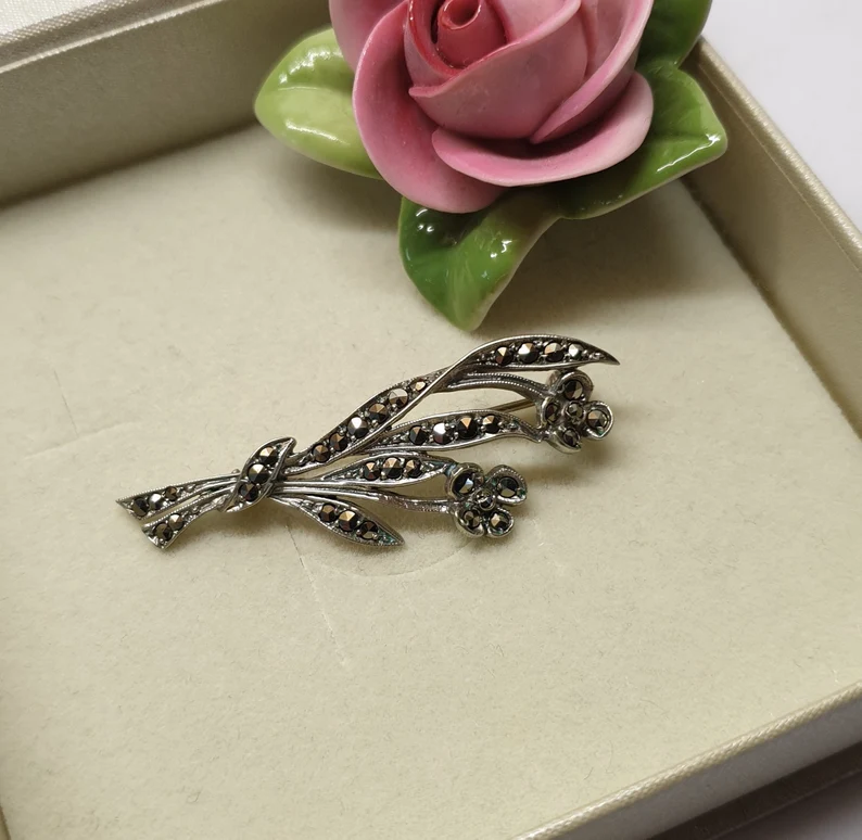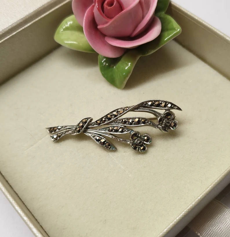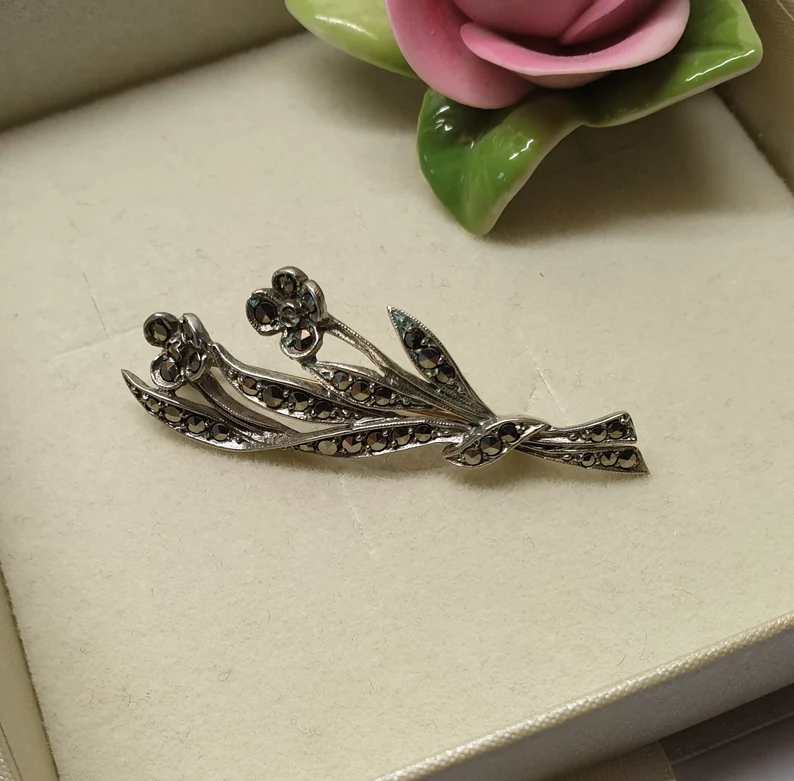 Eine wunderschöne Brosche / Anstecknadel in Form eines Zweiges. Diese filigran gearbeitete Silberbrosche ist mit Markasiten verziert.