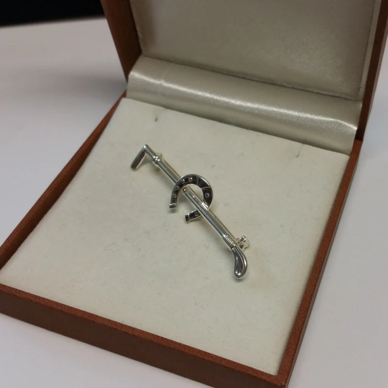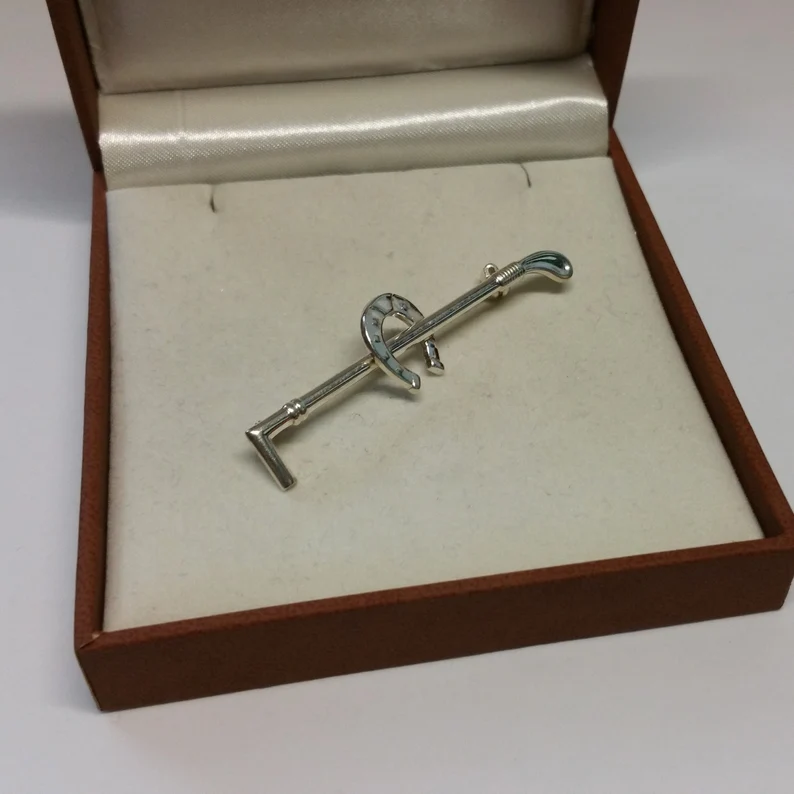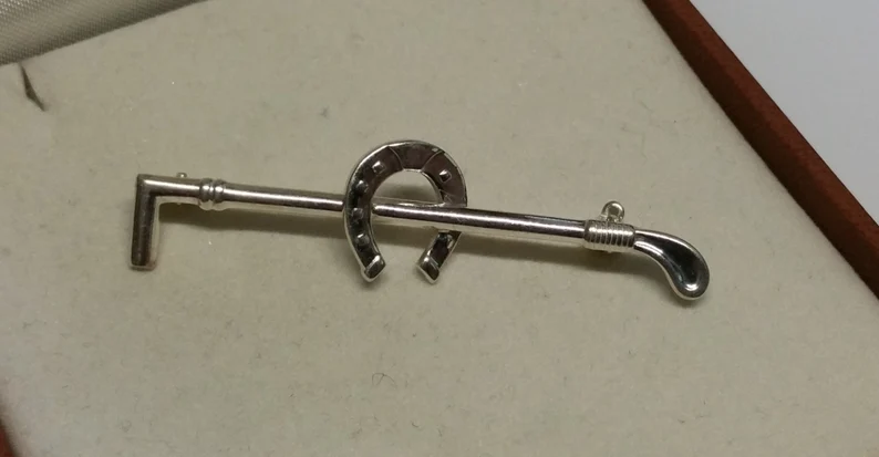 Brosche Anstecknadel Hufeisen Gerte Reitgerte Pferdesport Glückbringer Silber 925 Vintage elegant SB143